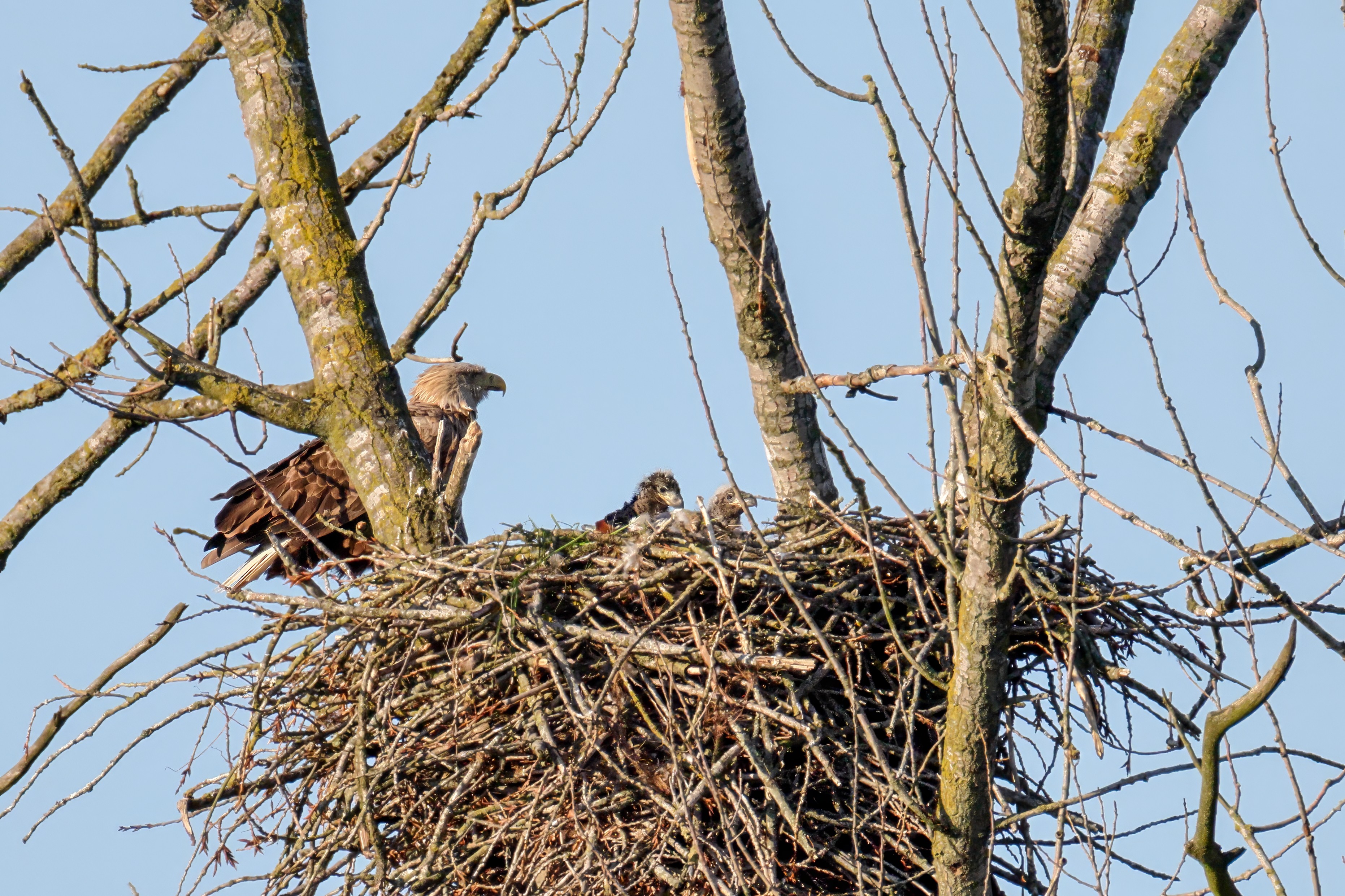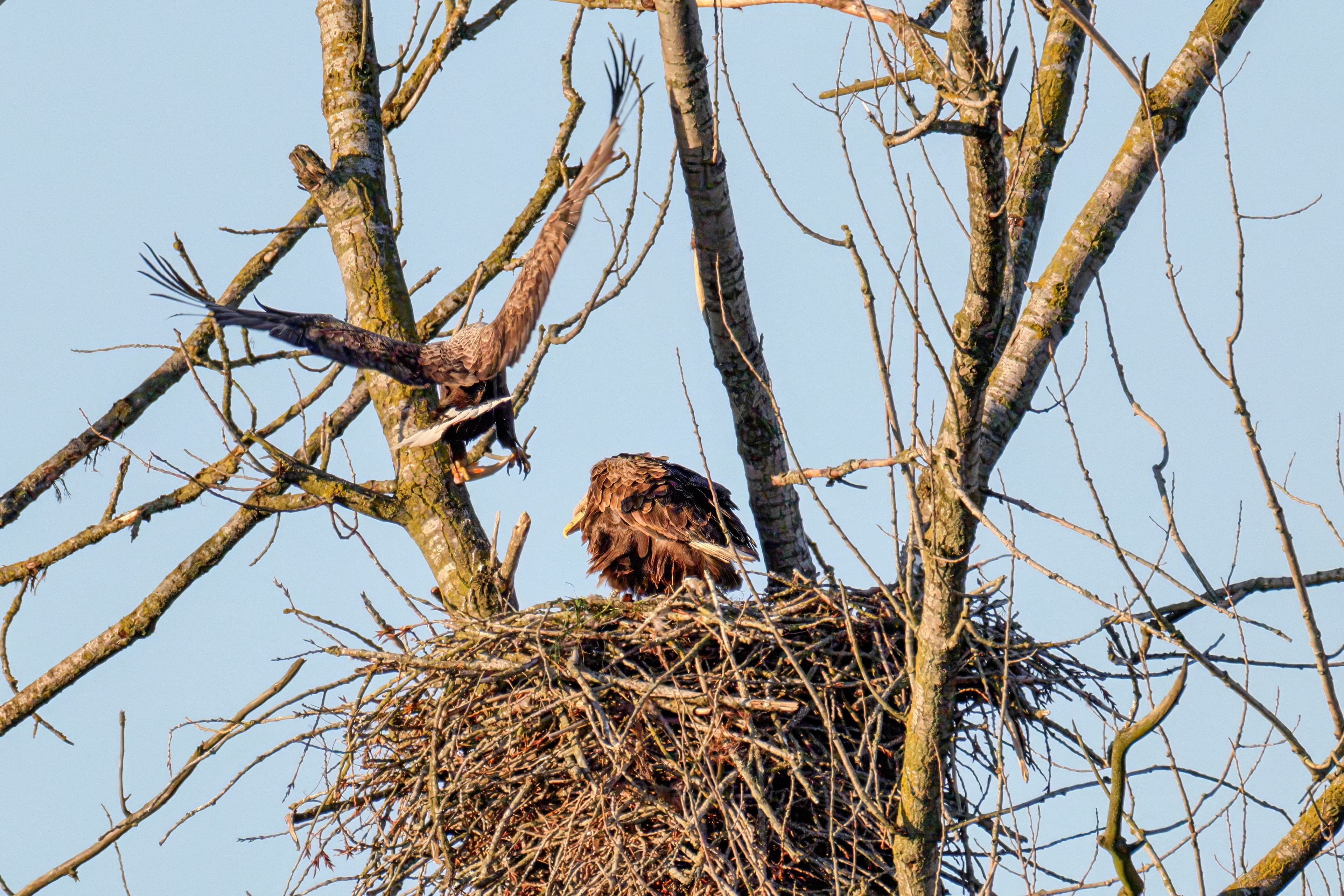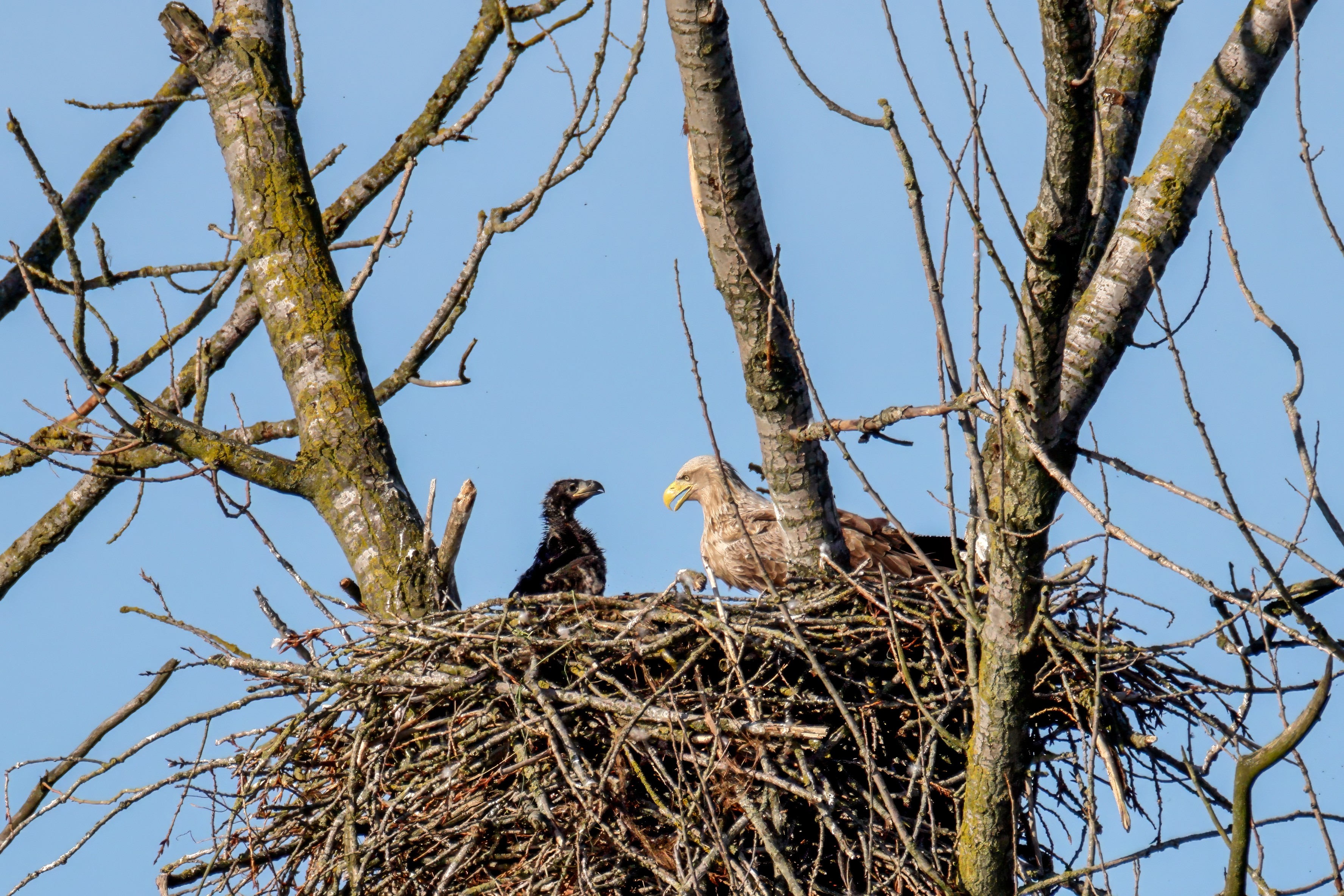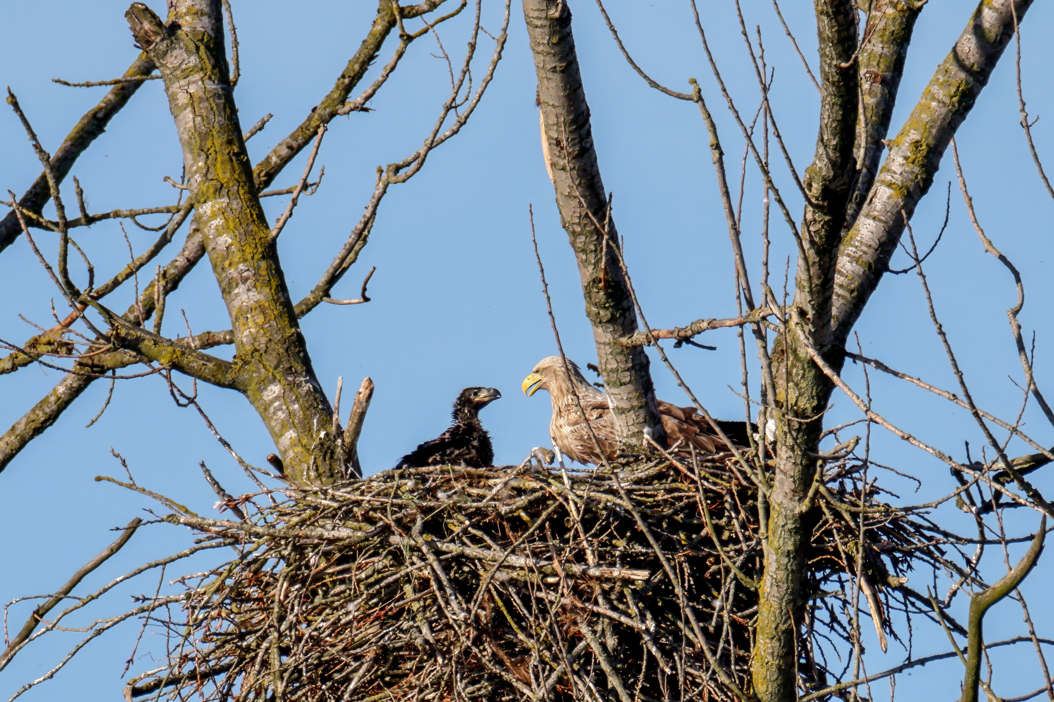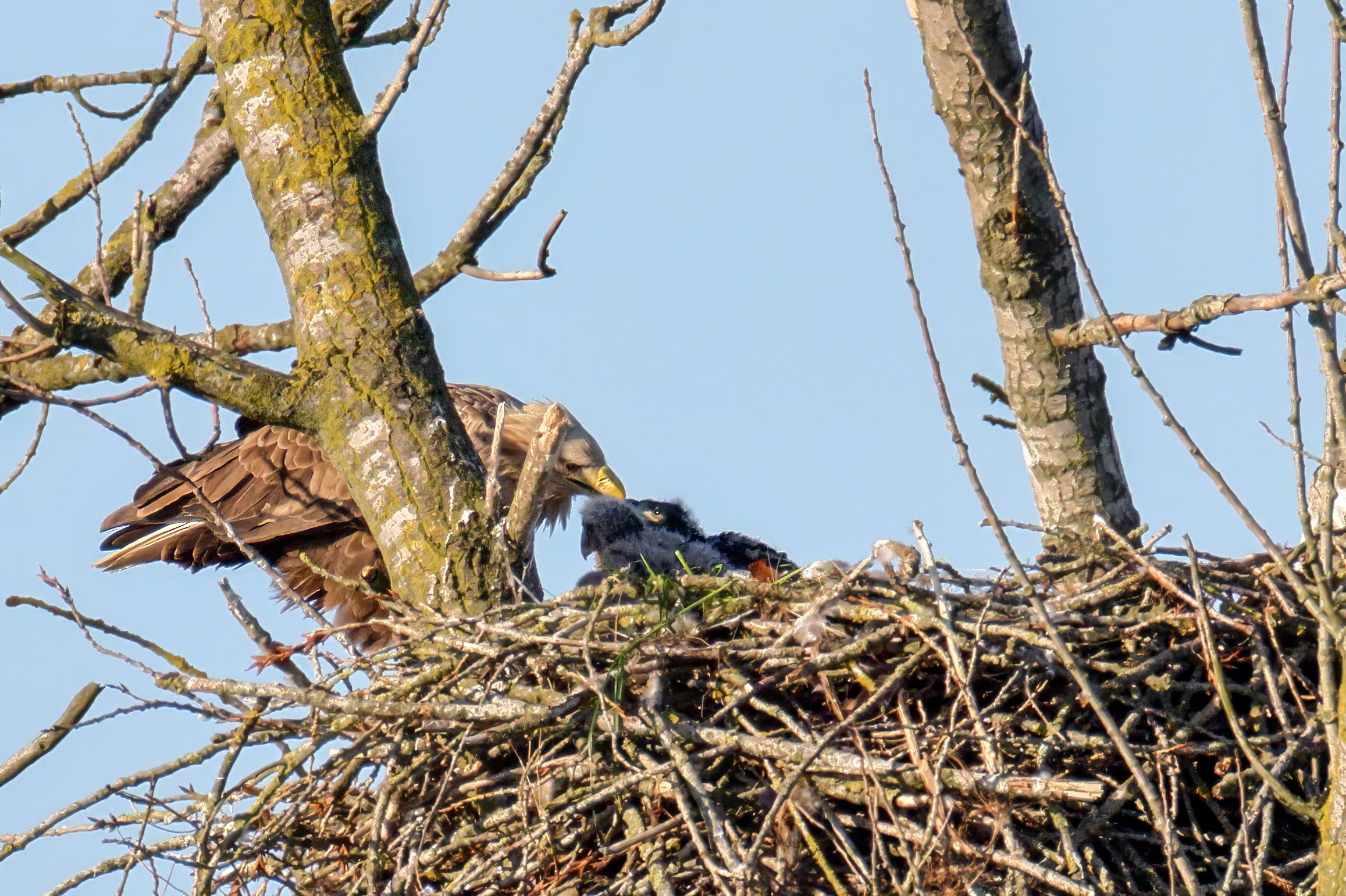 Die kleinen Nestlinge haben sich prächtig entwickelt. Die ständige Anwesenheit der Seeadler im Horst ist nun nicht mehr durchgehend erforderlich. Neben Aufmerksamkeit, Schutz und der Versorgung des Nachwuchses bleibt dem Seeadlerpaar jetzt auch etwas Zeit für sich. Häufig zeigen sie sich gemeinsam in der Nähe des Horstes und lassen dabei ihre enge Verbundenheit und den Stolz als Eltern erkennen.