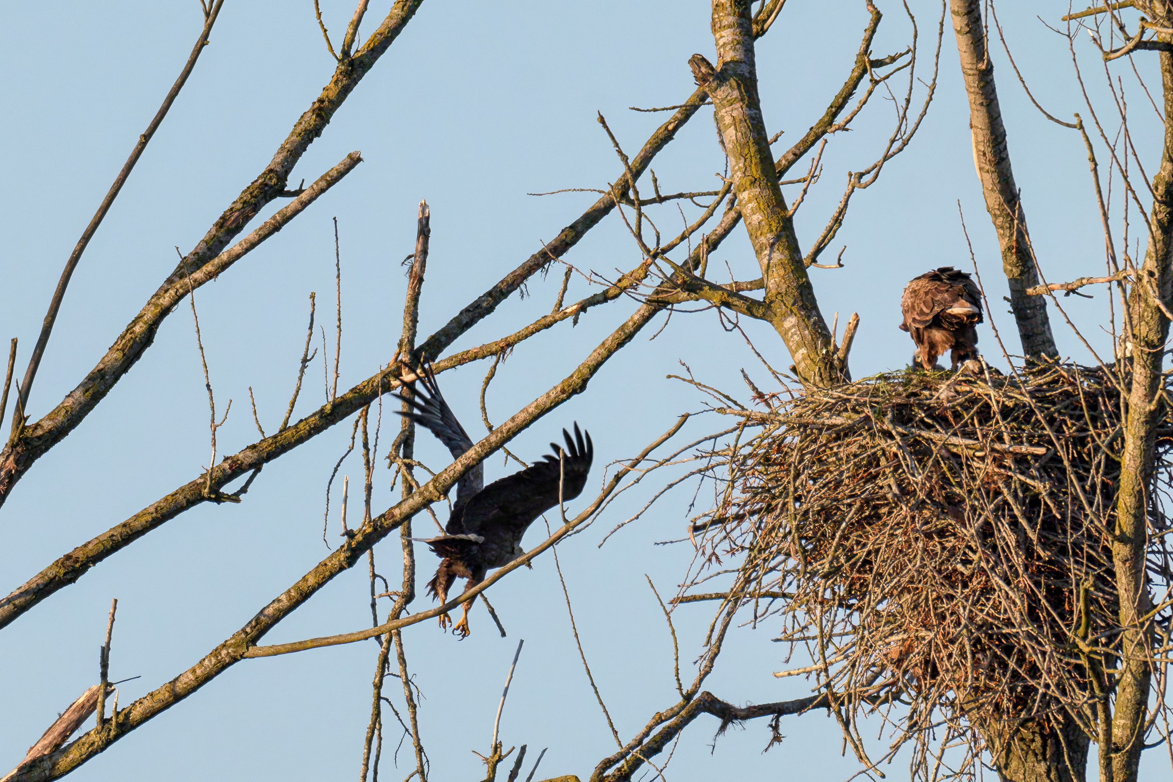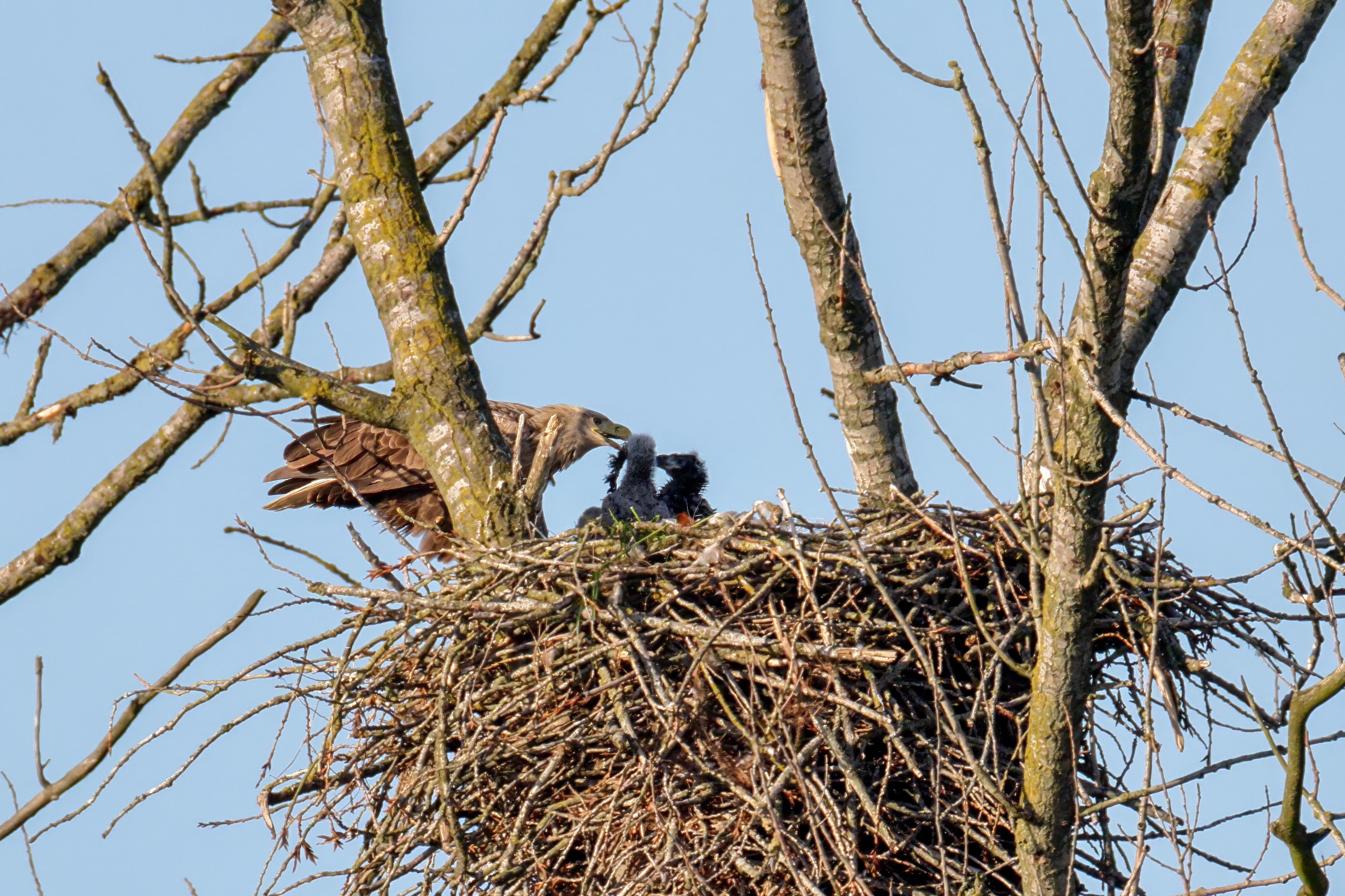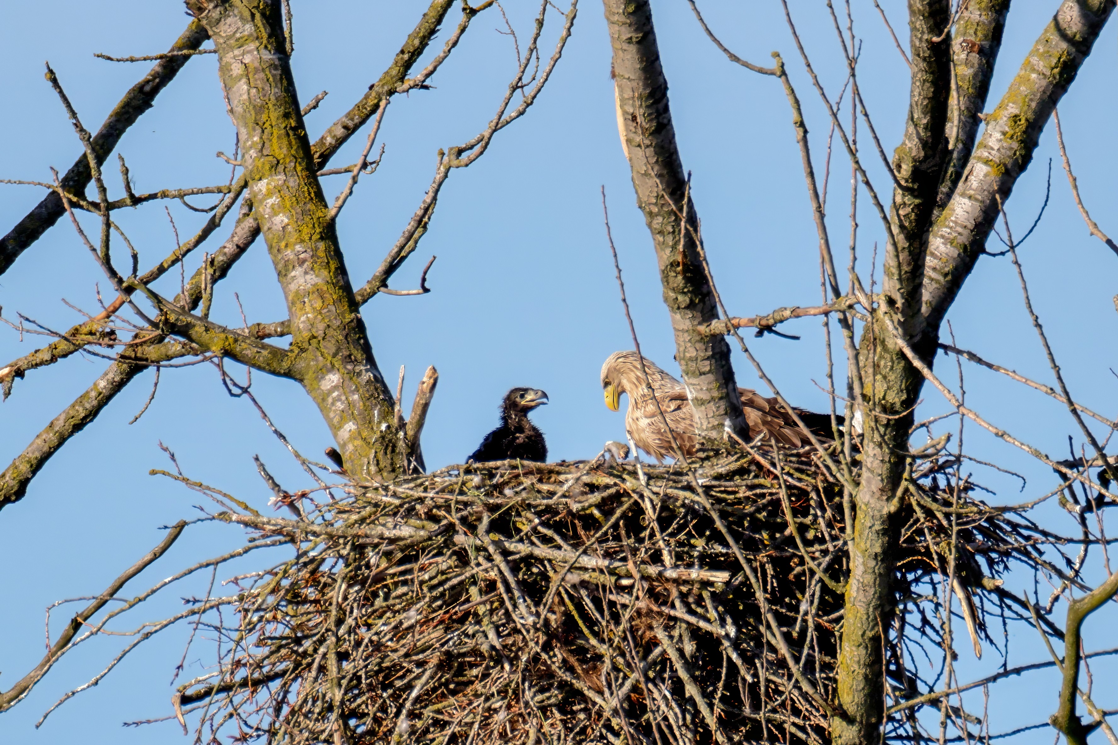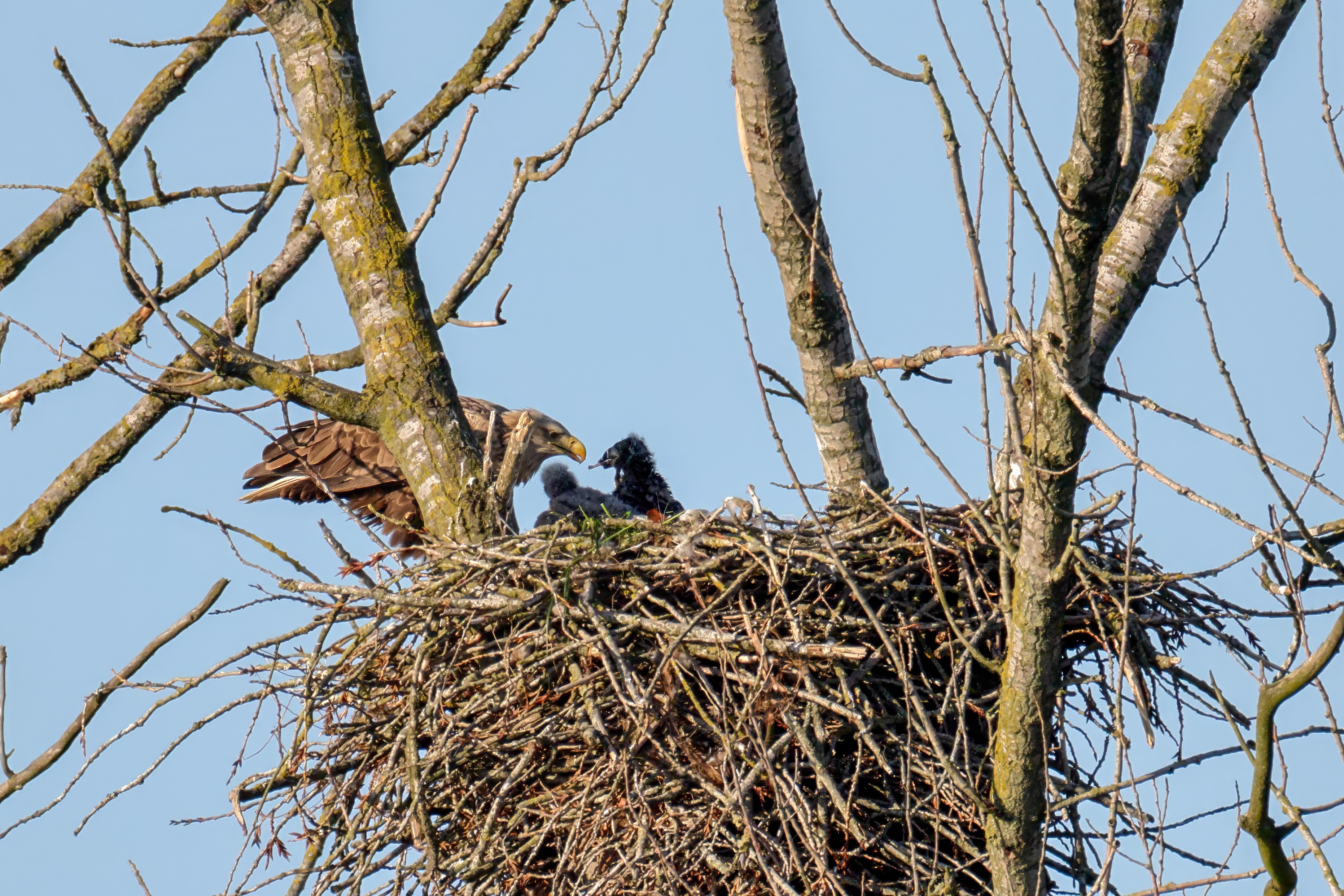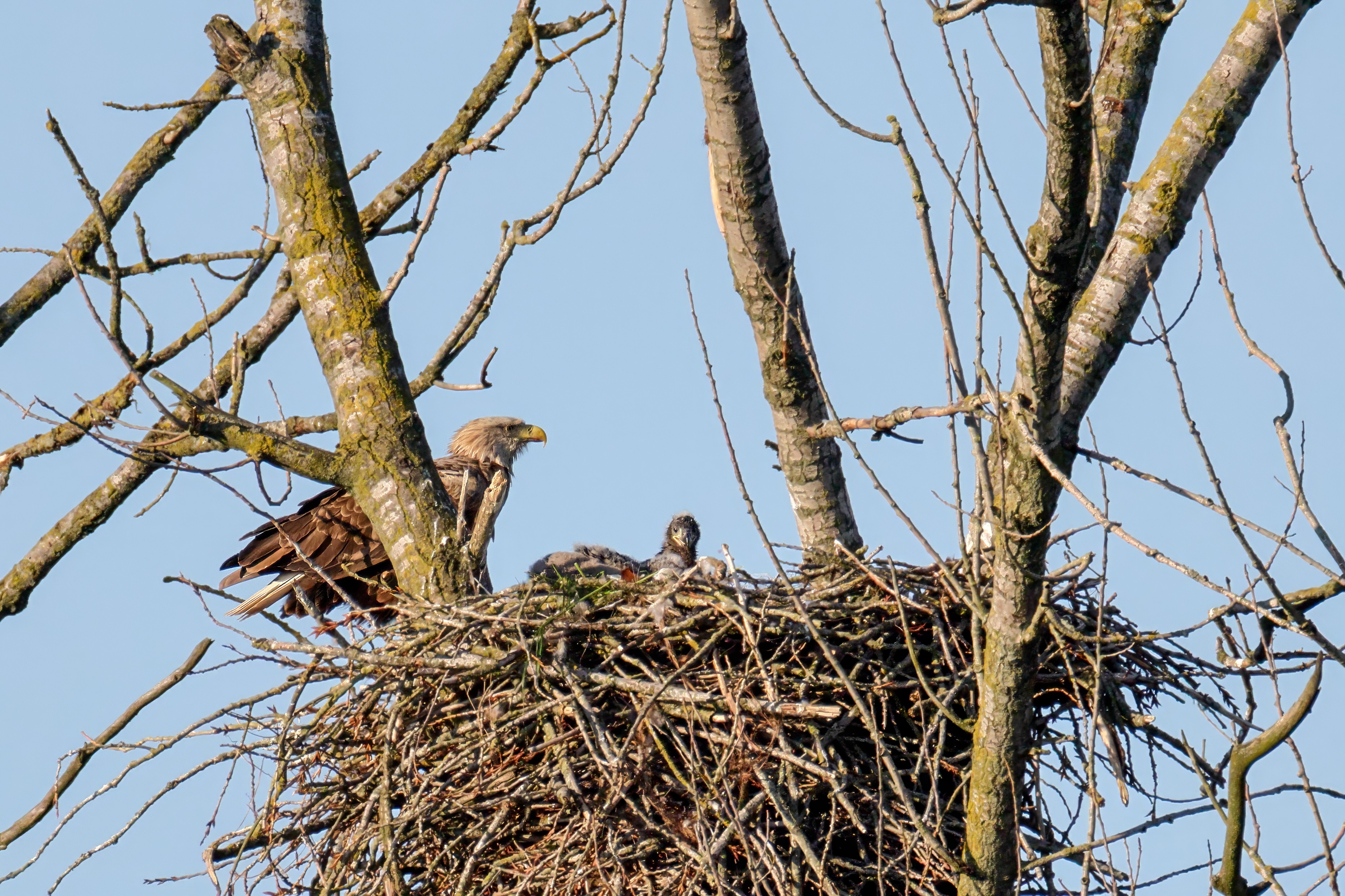 Die kleinen Nestlinge haben sich prächtig entwickelt. Die ständige Anwesenheit der Seeadler im Horst ist nun nicht mehr durchgehend erforderlich. Neben Aufmerksamkeit, Schutz und der Versorgung des Nachwuchses bleibt dem Seeadlerpaar jetzt auch etwas Zeit für sich. Häufig zeigen sie sich gemeinsam in der Nähe des Horstes und lassen dabei ihre enge Verbundenheit und den Stolz als Eltern erkennen.