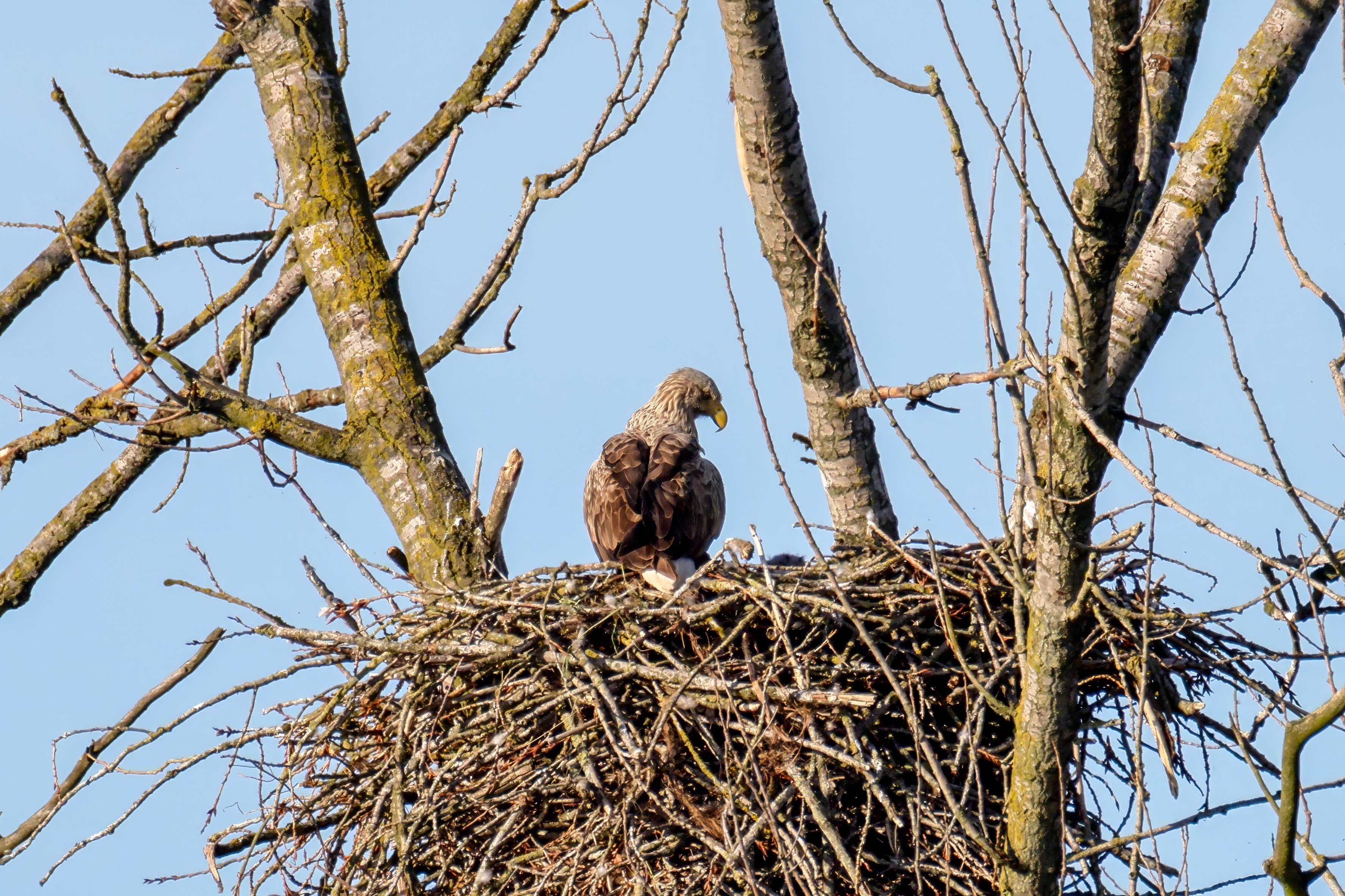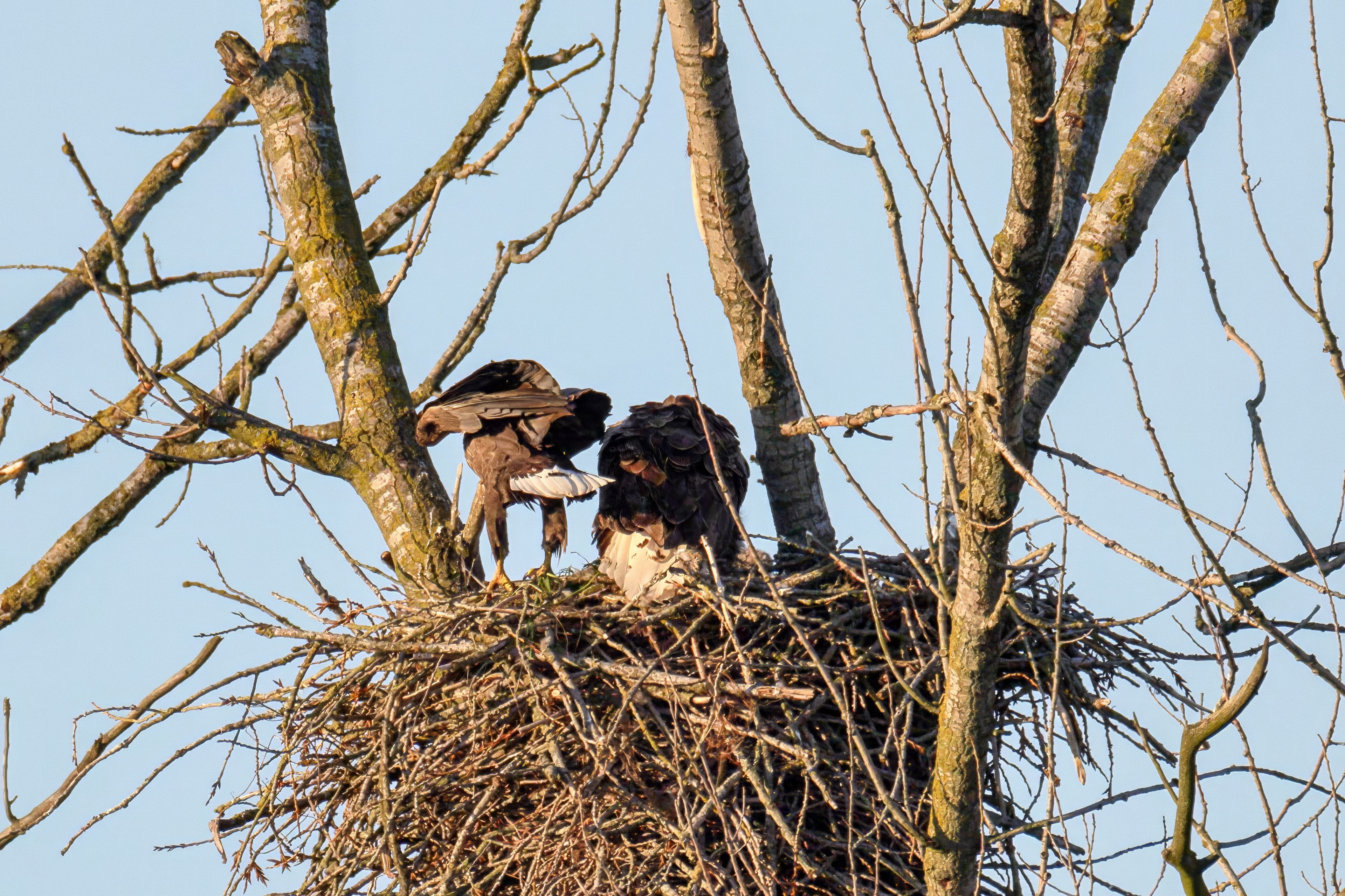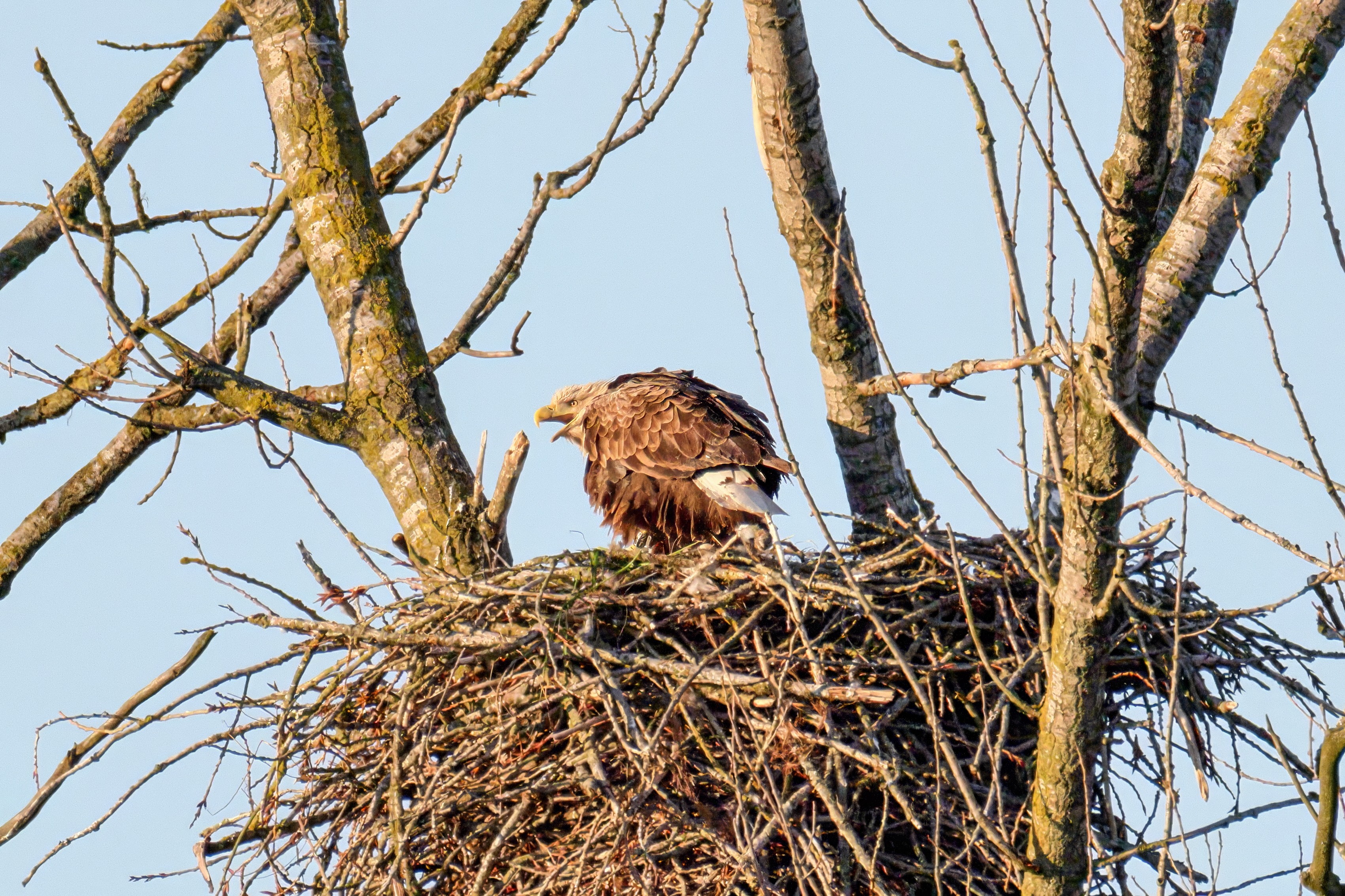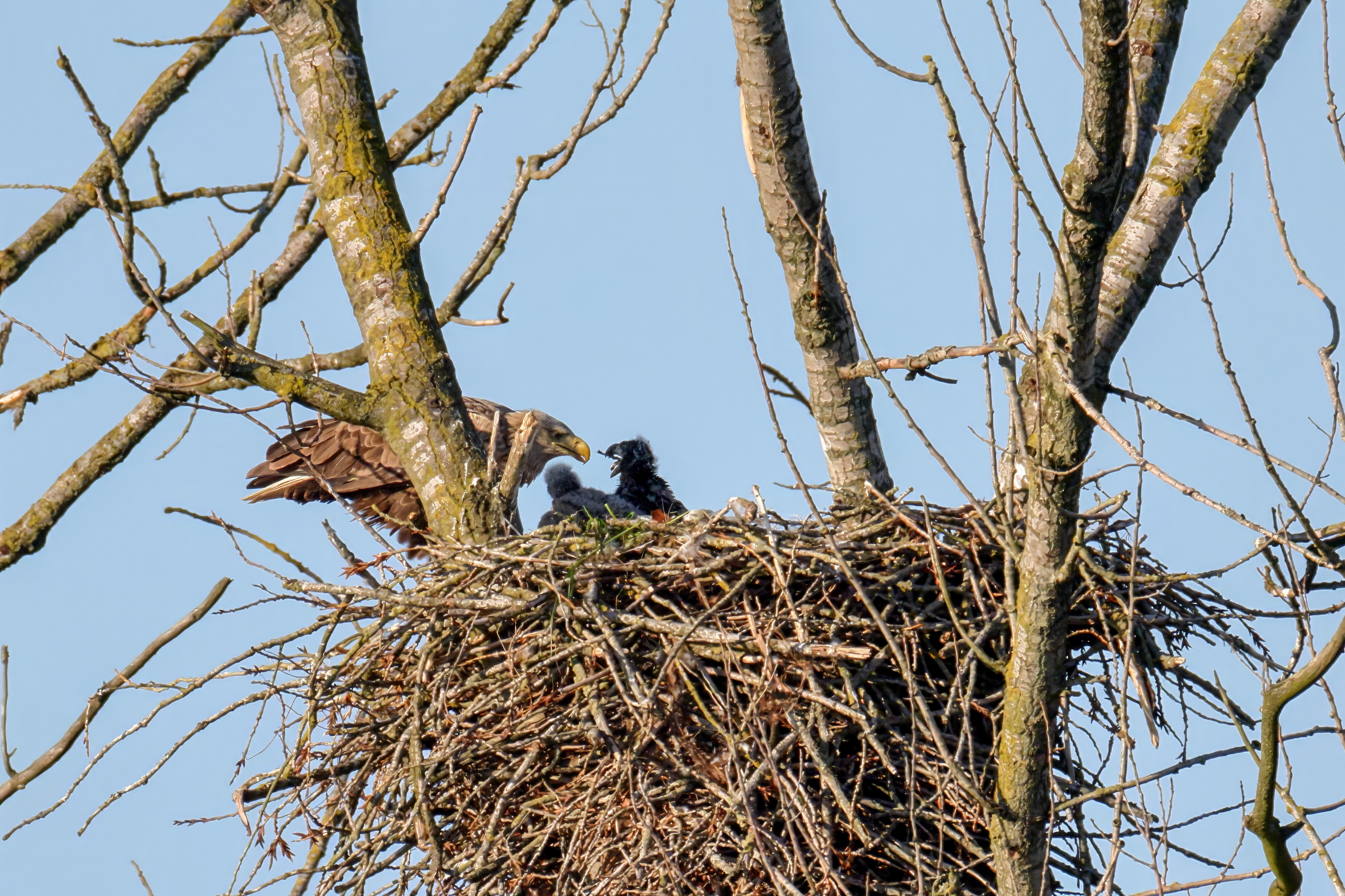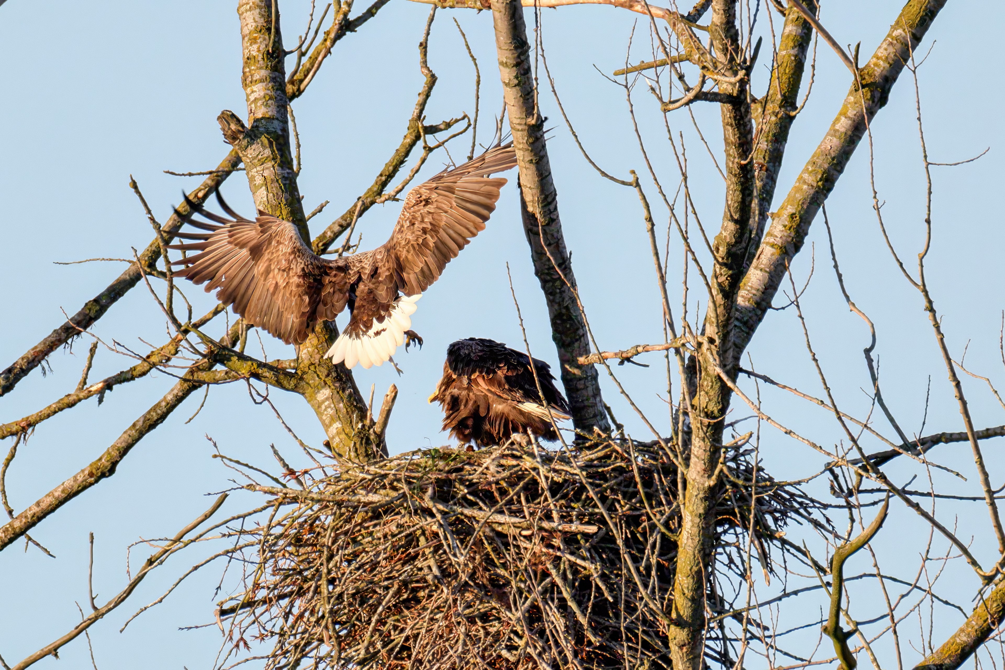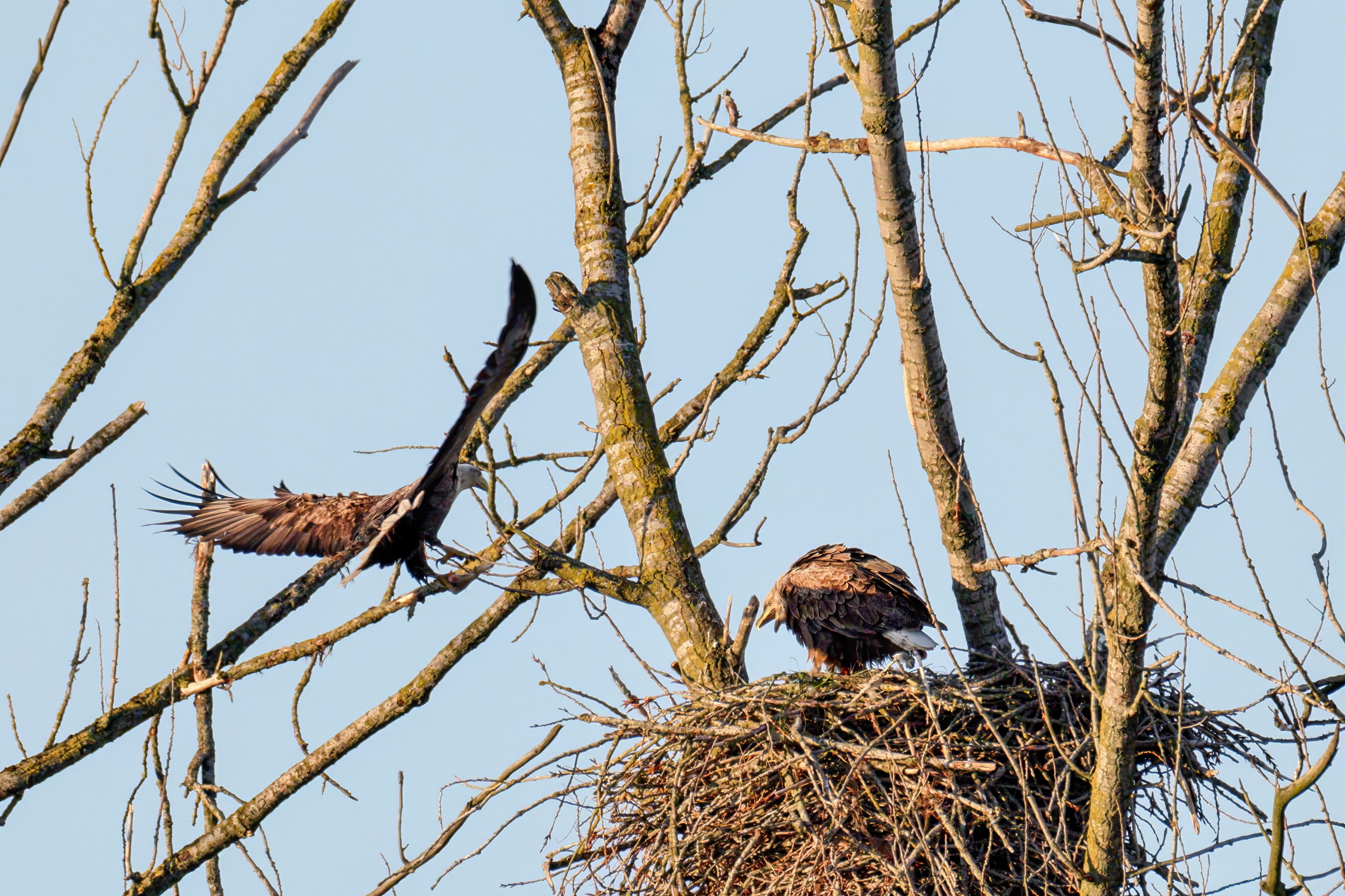 Die kleinen Nestlinge haben sich prächtig entwickelt. Die ständige Anwesenheit der Seeadler im Horst ist nun nicht mehr durchgehend erforderlich. Neben Aufmerksamkeit, Schutz und der Versorgung des Nachwuchses bleibt dem Seeadlerpaar jetzt auch etwas Zeit für sich. Häufig zeigen sie sich gemeinsam in der Nähe des Horstes und lassen dabei ihre enge Verbundenheit und den Stolz als Eltern erkennen.