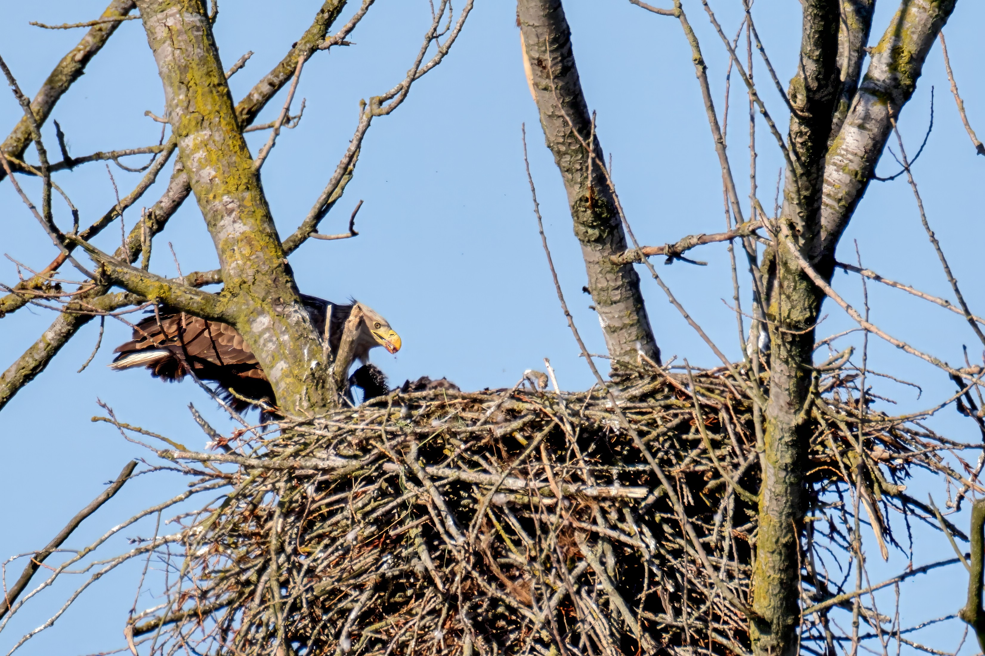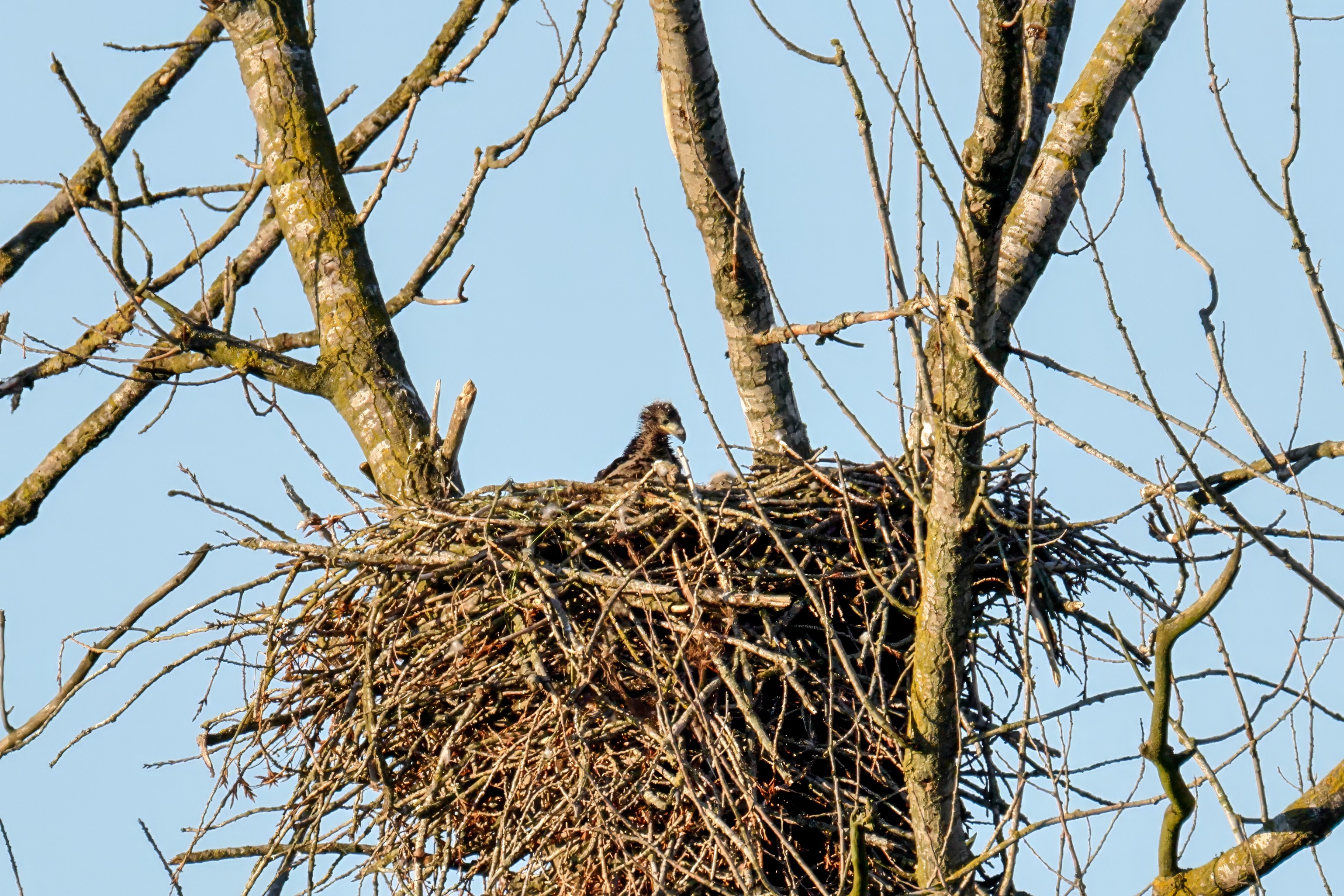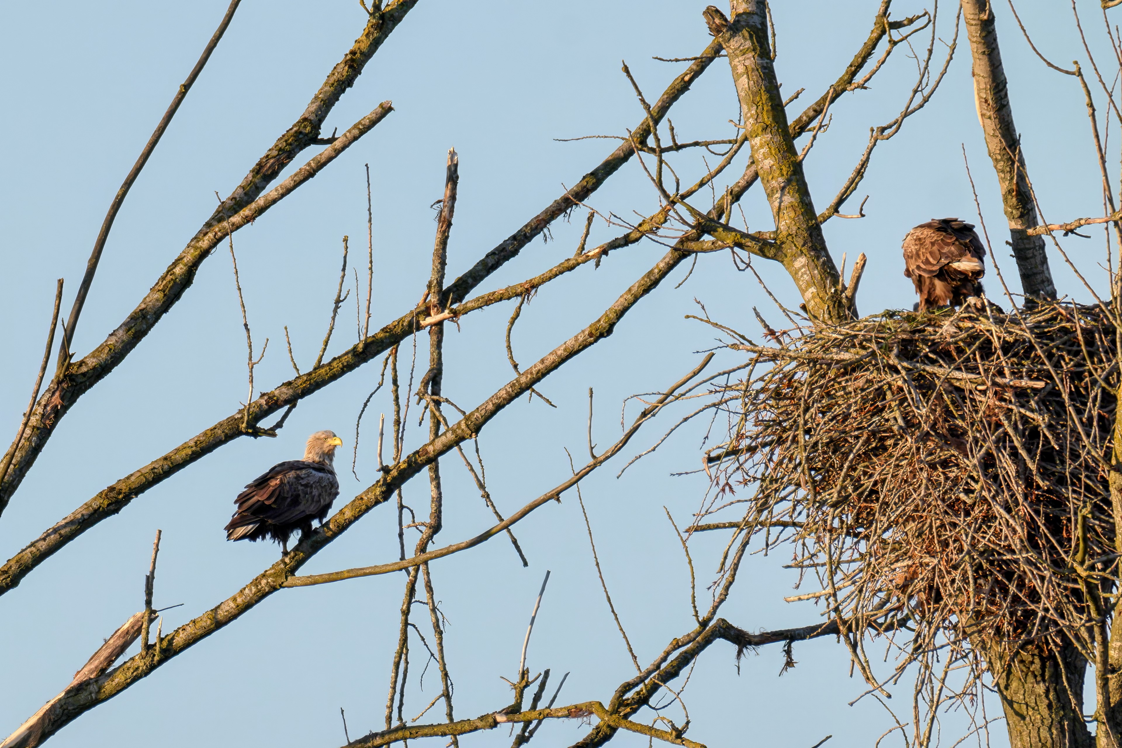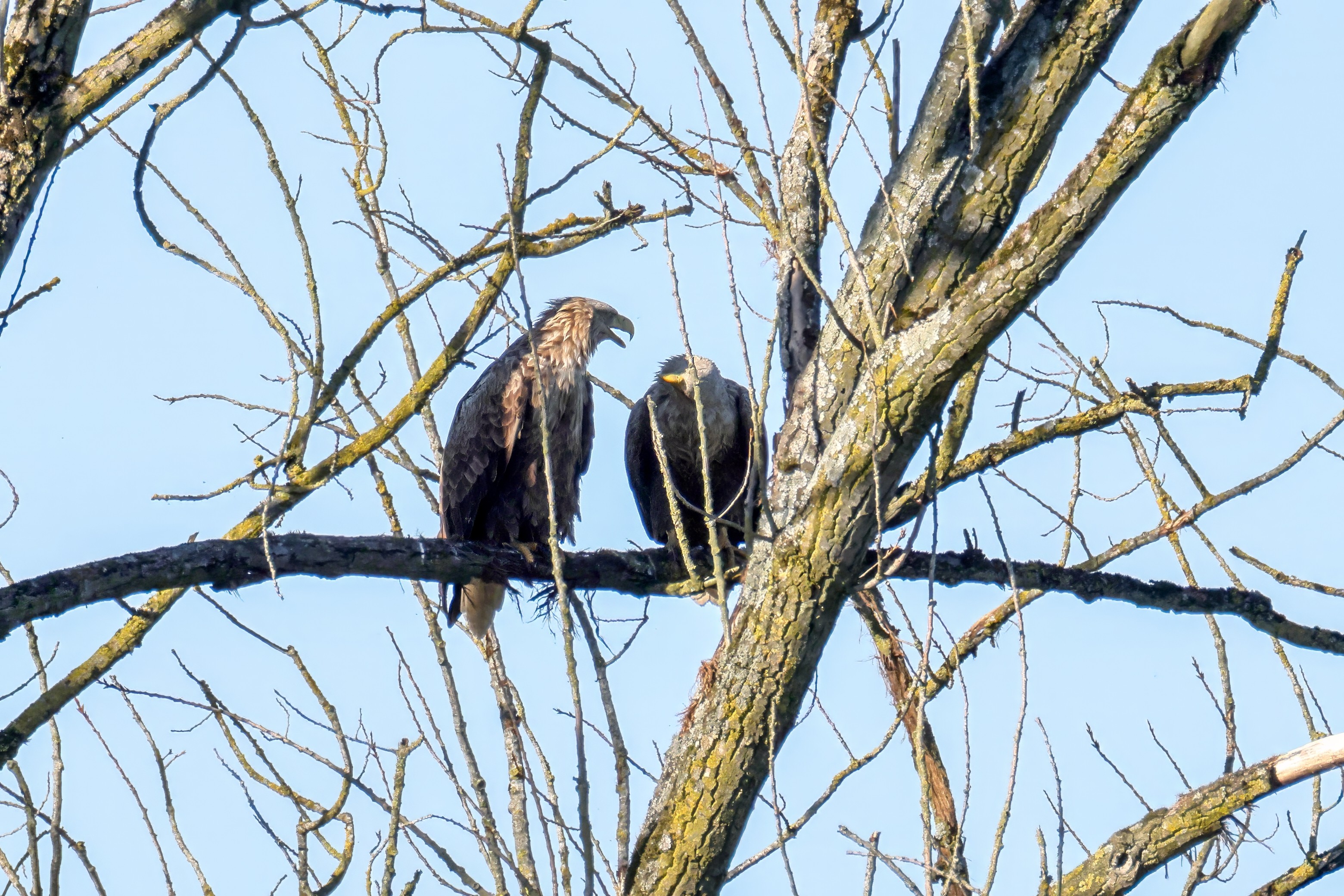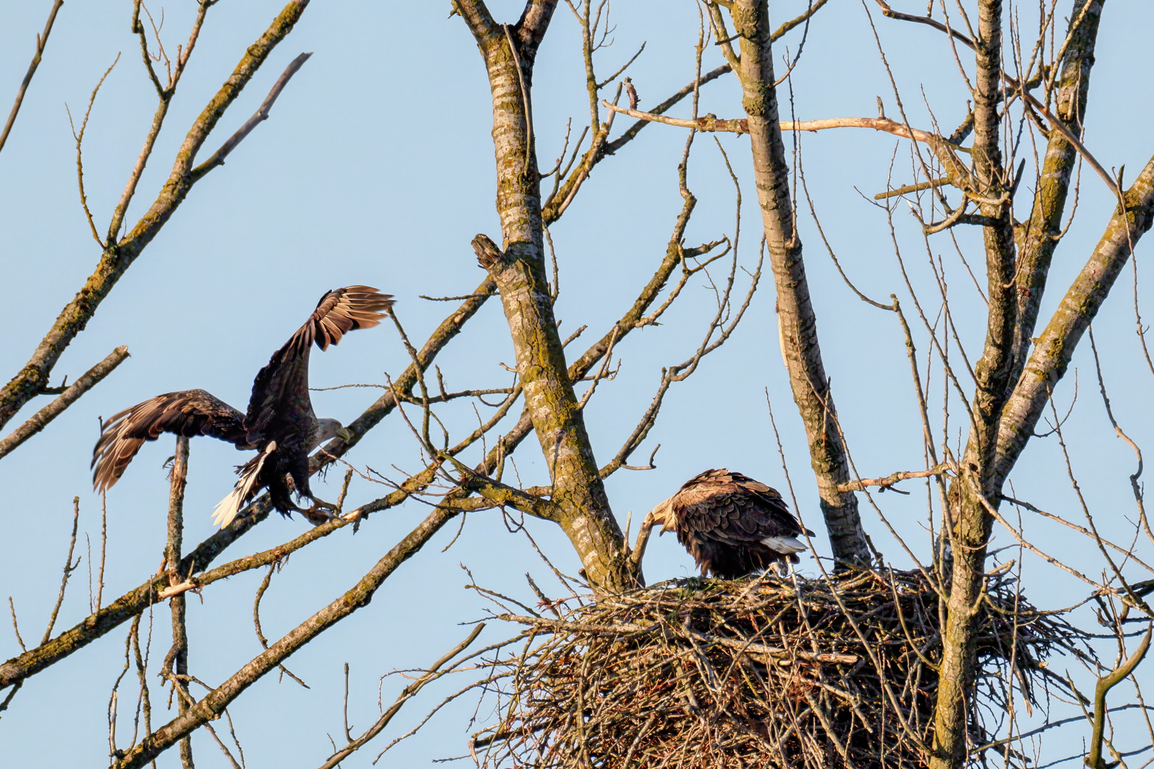 Die kleinen Nestlinge haben sich prächtig entwickelt. Die ständige Anwesenheit der Seeadler im Horst ist nun nicht mehr durchgehend erforderlich. Neben Aufmerksamkeit, Schutz und der Versorgung des Nachwuchses bleibt dem Seeadlerpaar jetzt auch etwas Zeit für sich. Häufig zeigen sie sich gemeinsam in der Nähe des Horstes und lassen dabei ihre enge Verbundenheit und den Stolz als Eltern erkennen.