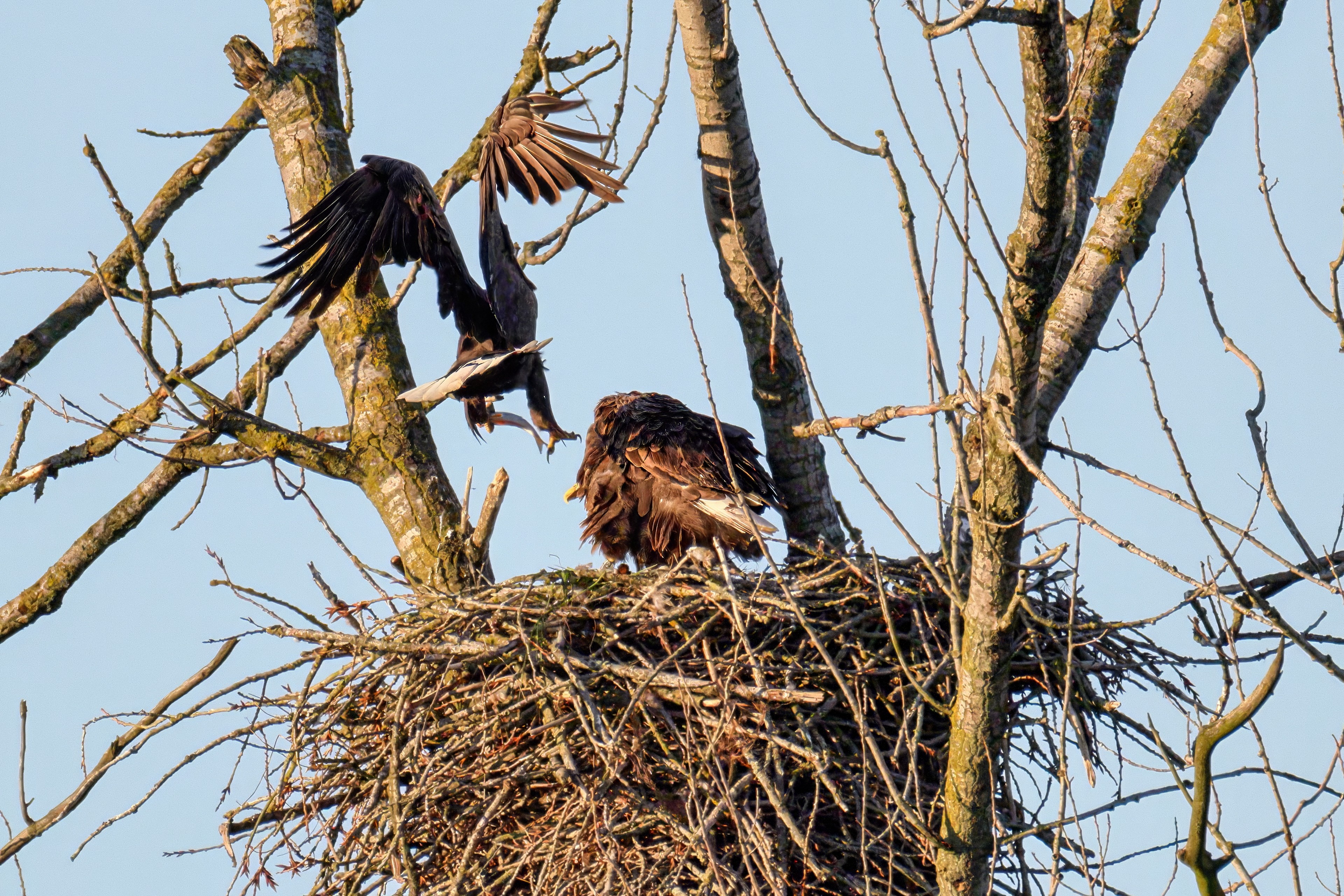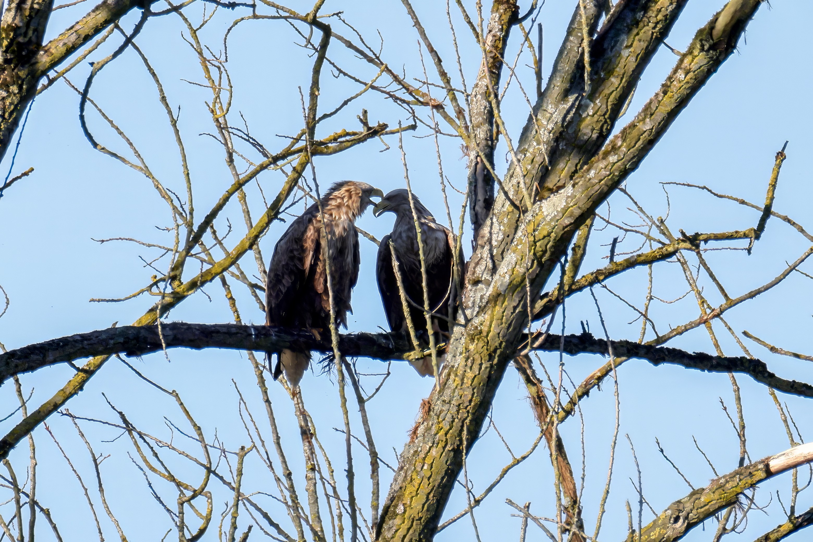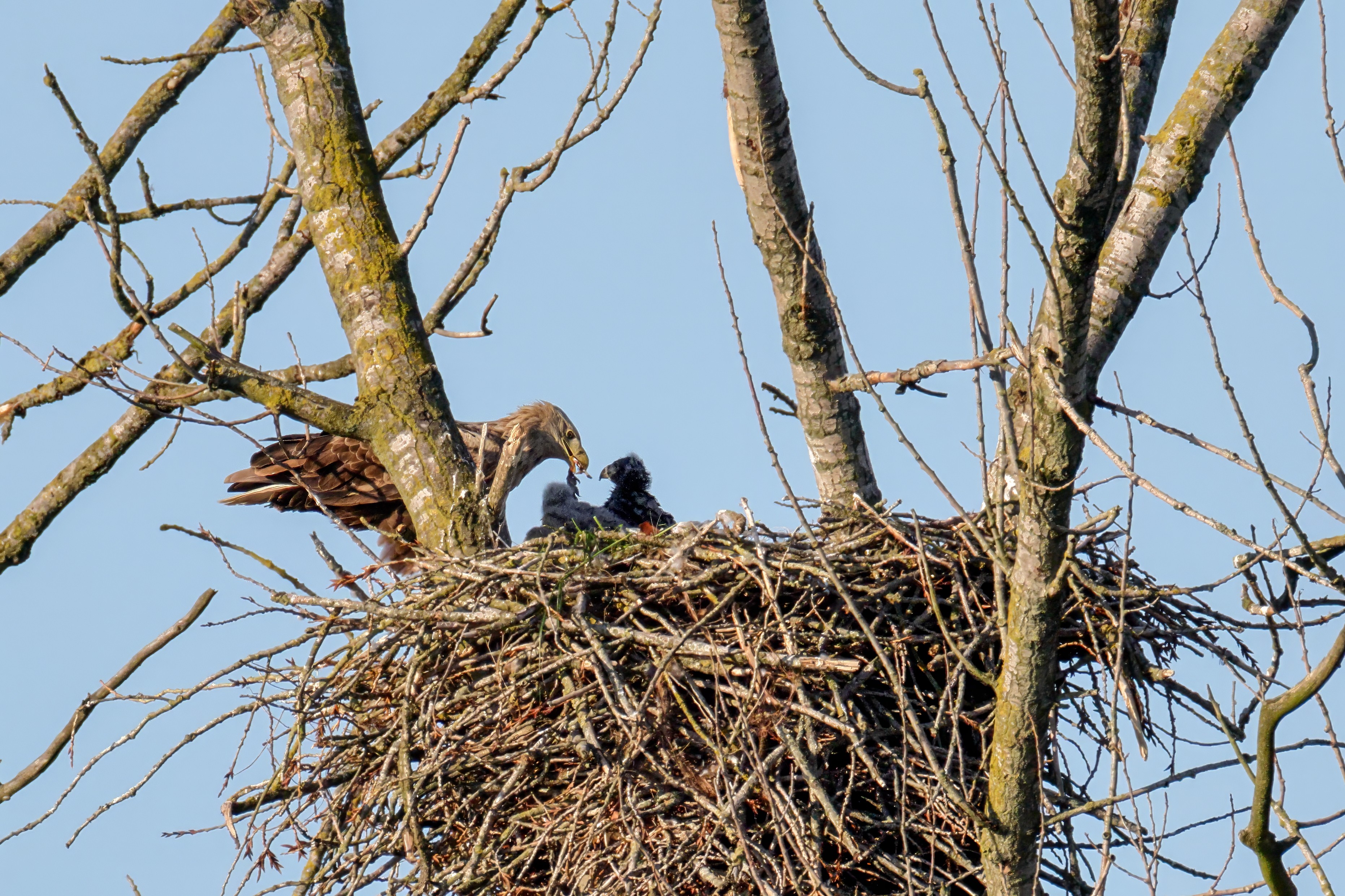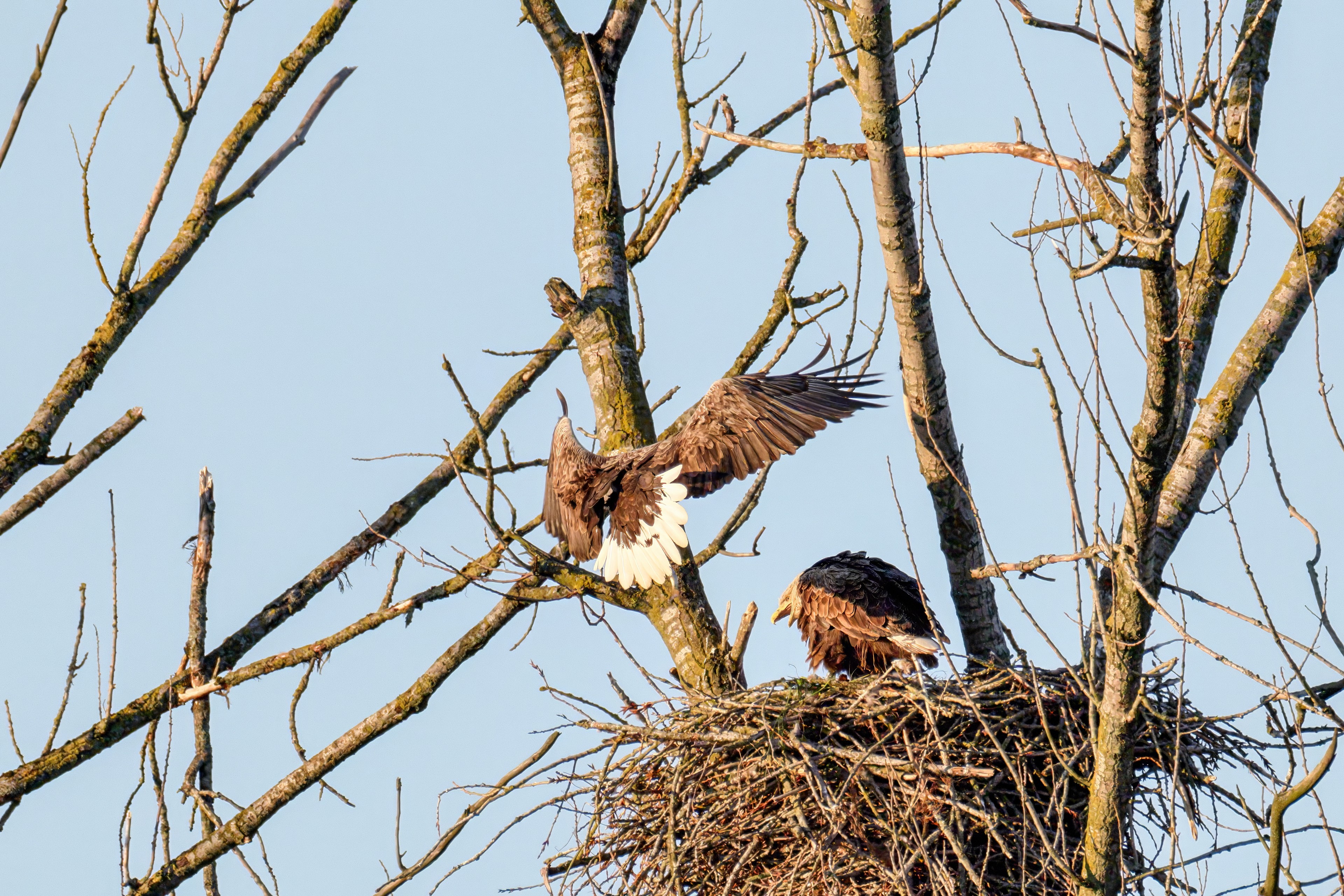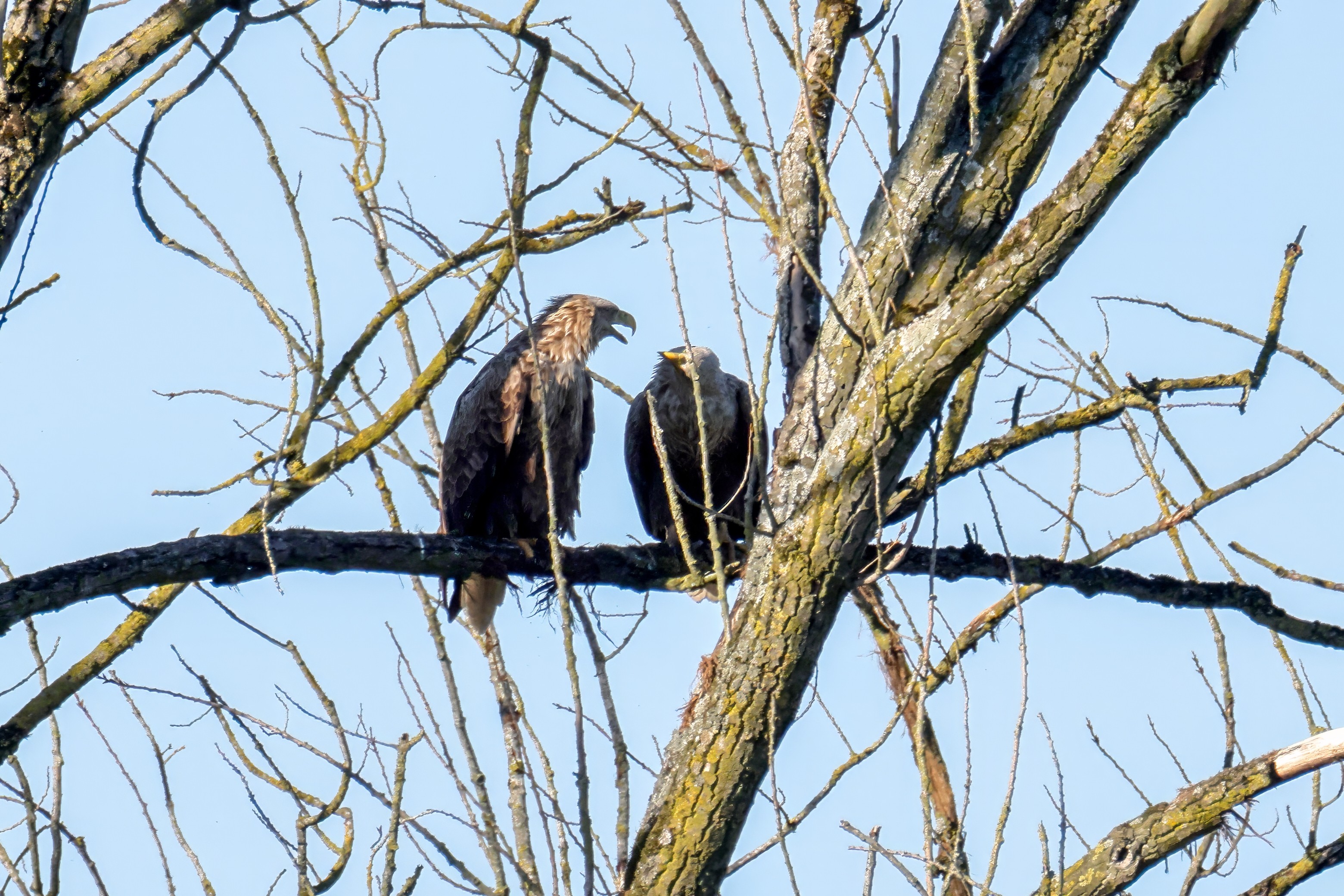 Die kleinen Nestlinge haben sich prächtig entwickelt. Die ständige Anwesenheit der Seeadler im Horst ist nun nicht mehr durchgehend erforderlich. Neben Aufmerksamkeit, Schutz und der Versorgung des Nachwuchses bleibt dem Seeadlerpaar jetzt auch etwas Zeit für sich. Häufig zeigen sie sich gemeinsam in der Nähe des Horstes und lassen dabei ihre enge Verbundenheit und den Stolz als Eltern erkennen.