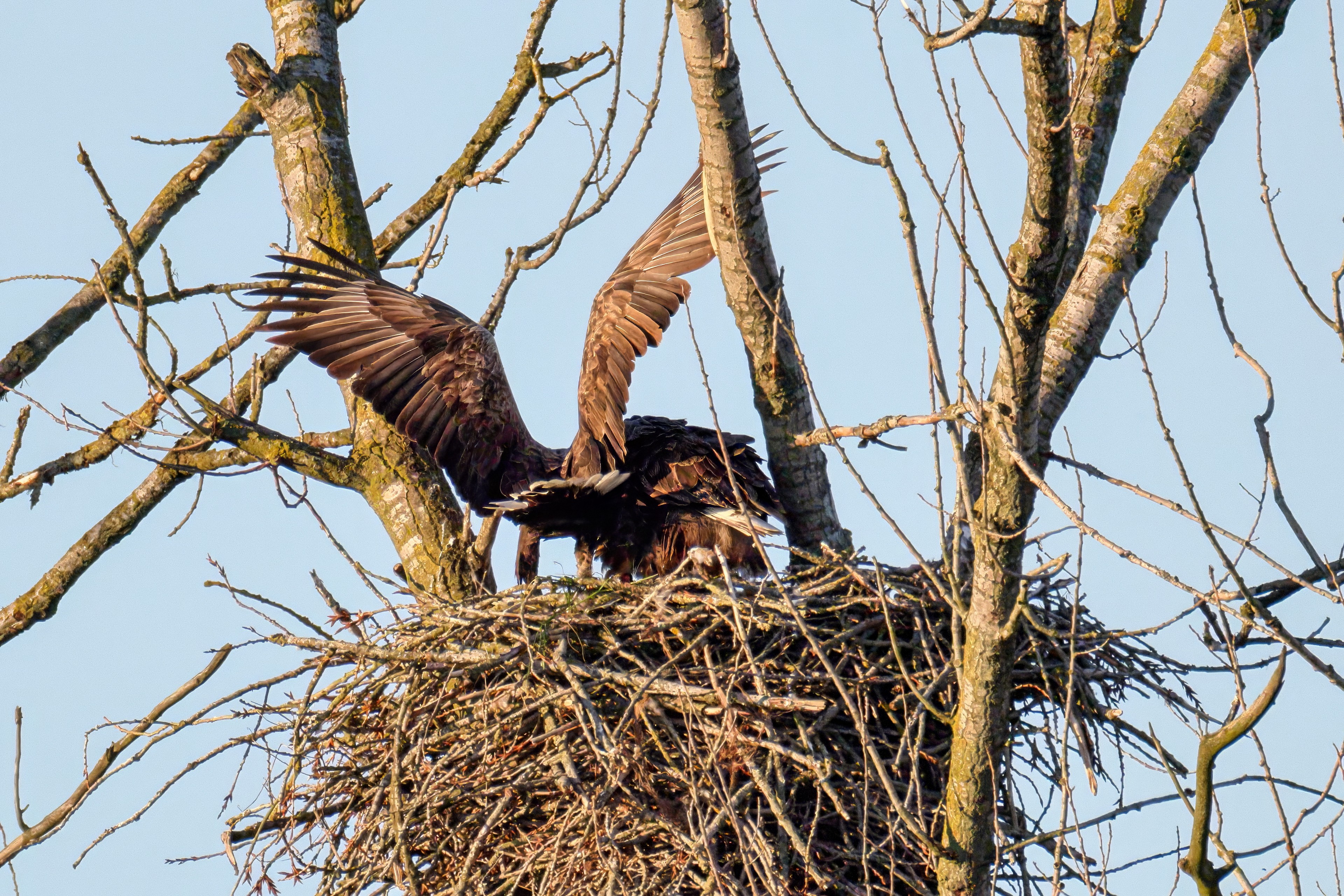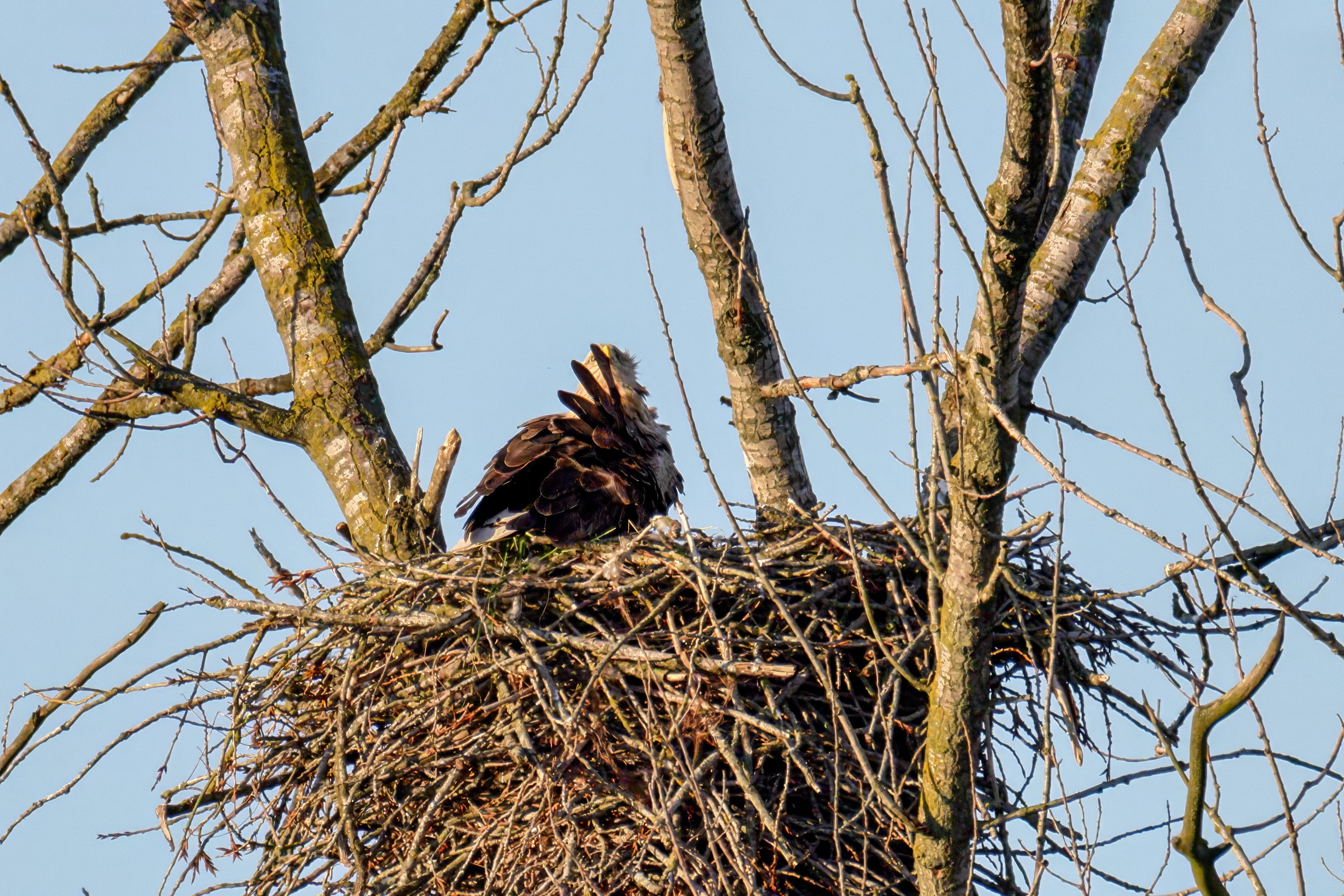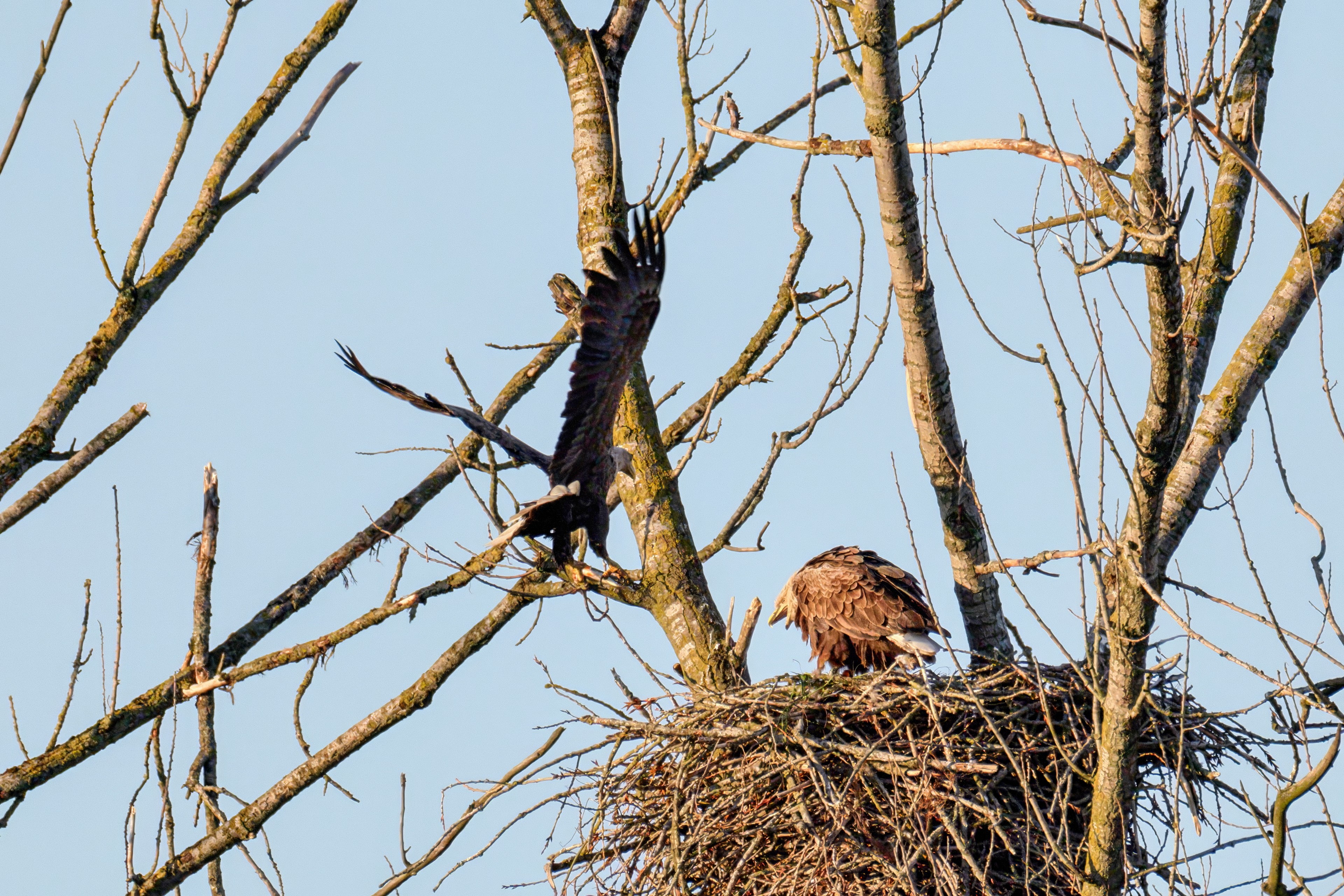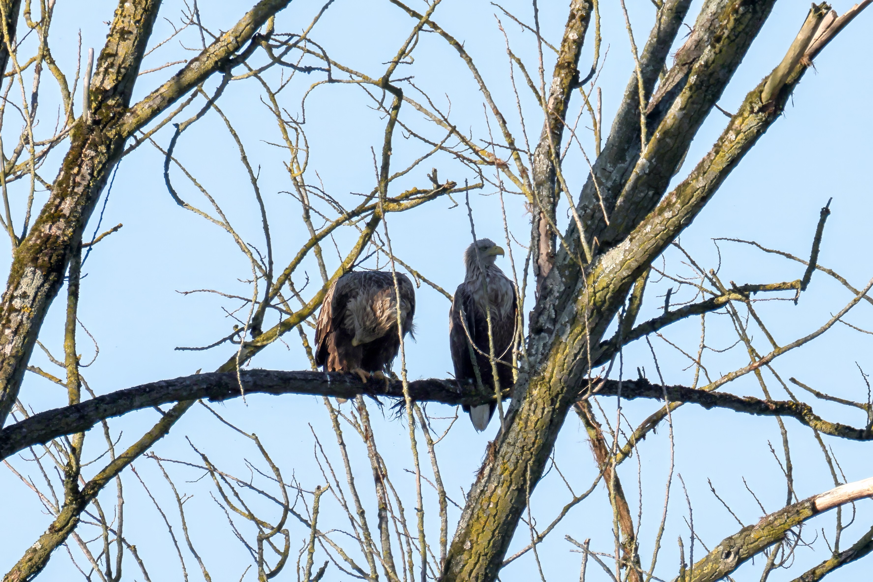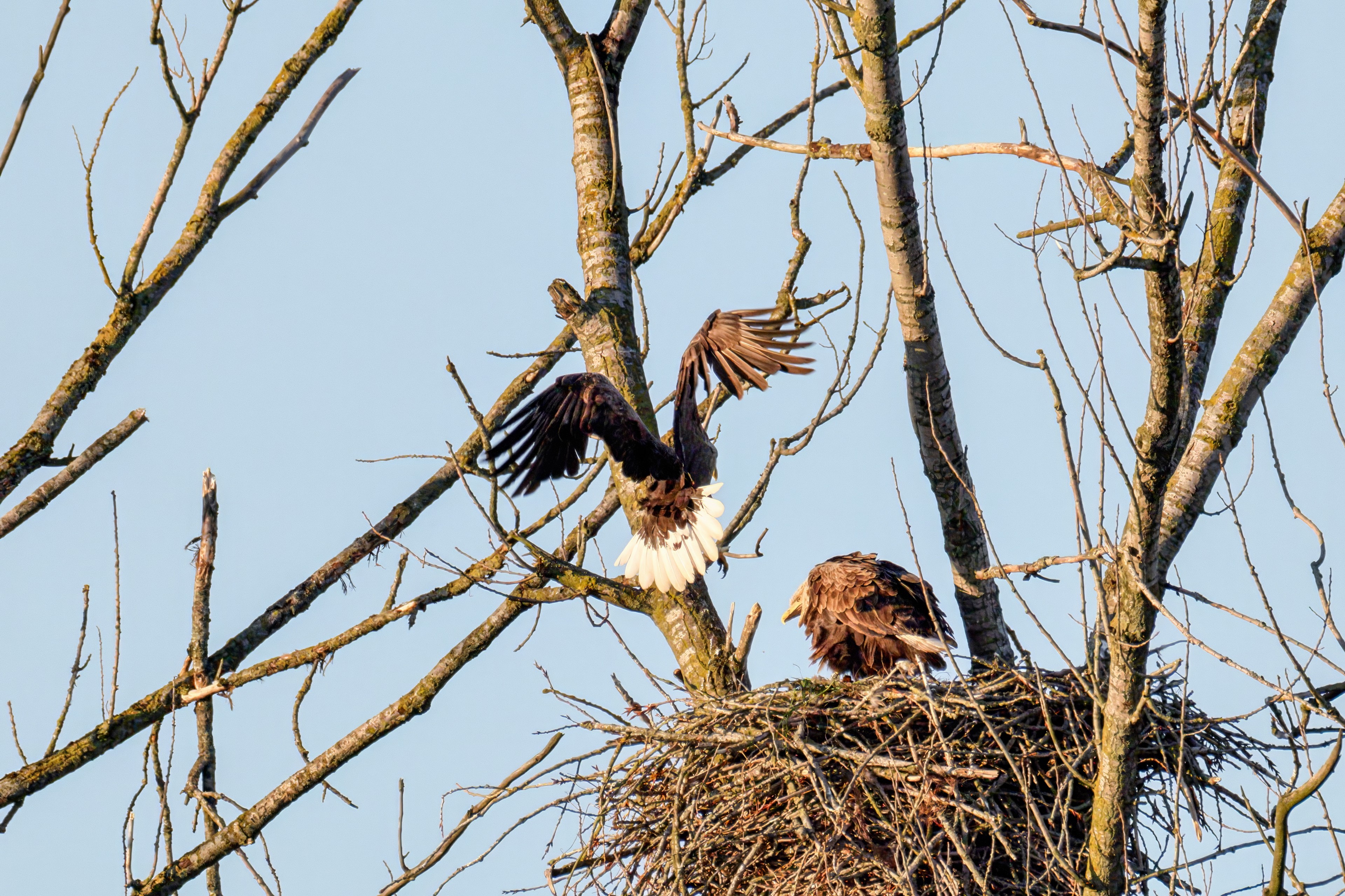 Die kleinen Nestlinge haben sich prächtig entwickelt. Die ständige Anwesenheit der Seeadler im Horst ist nun nicht mehr durchgehend erforderlich. Neben Aufmerksamkeit, Schutz und der Versorgung des Nachwuchses bleibt dem Seeadlerpaar jetzt auch etwas Zeit für sich. Häufig zeigen sie sich gemeinsam in der Nähe des Horstes und lassen dabei ihre enge Verbundenheit und den Stolz als Eltern erkennen.