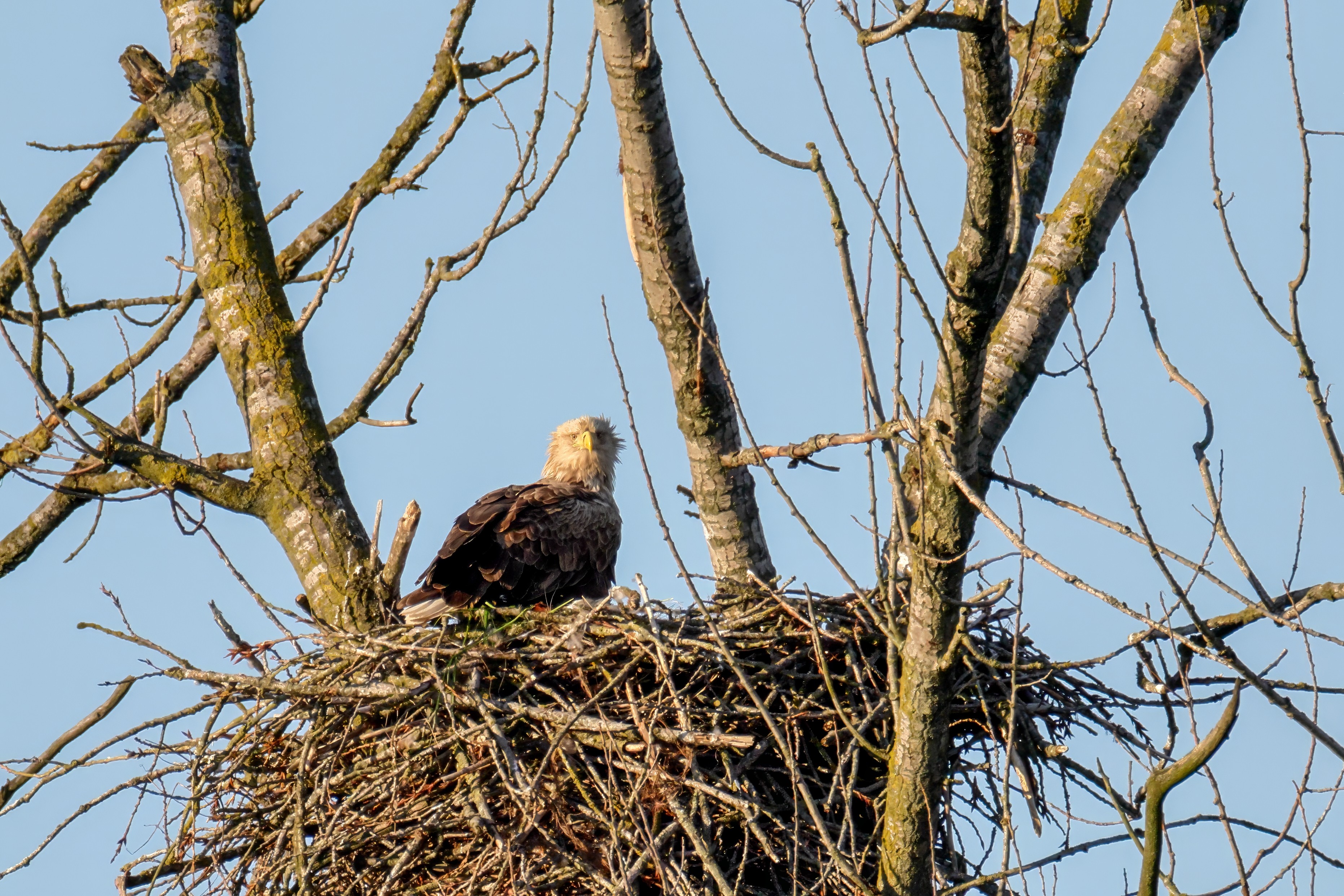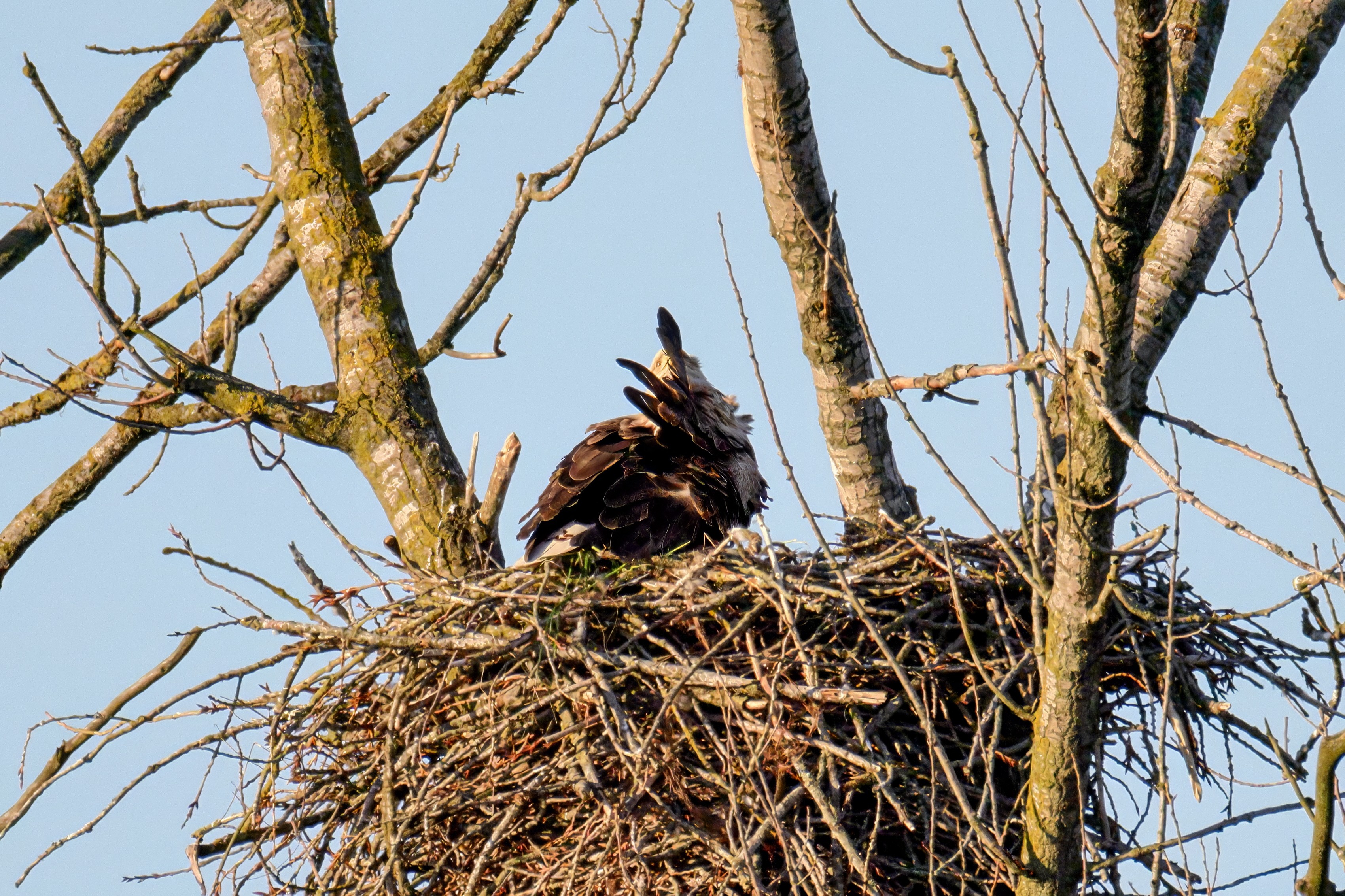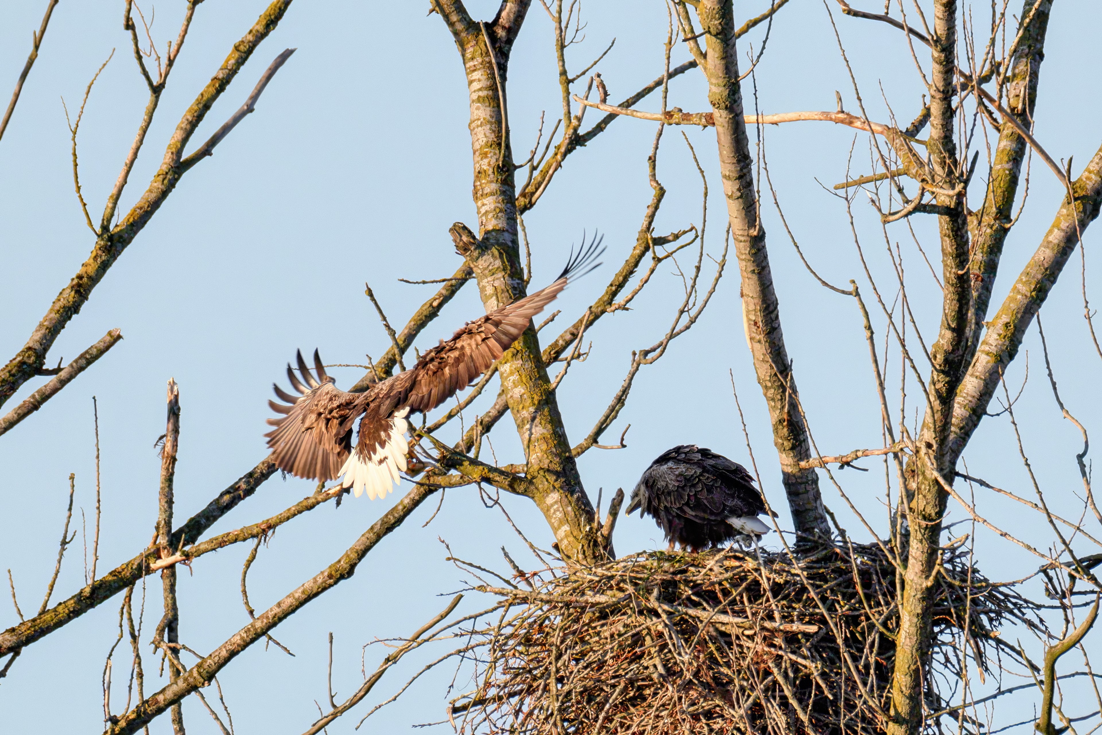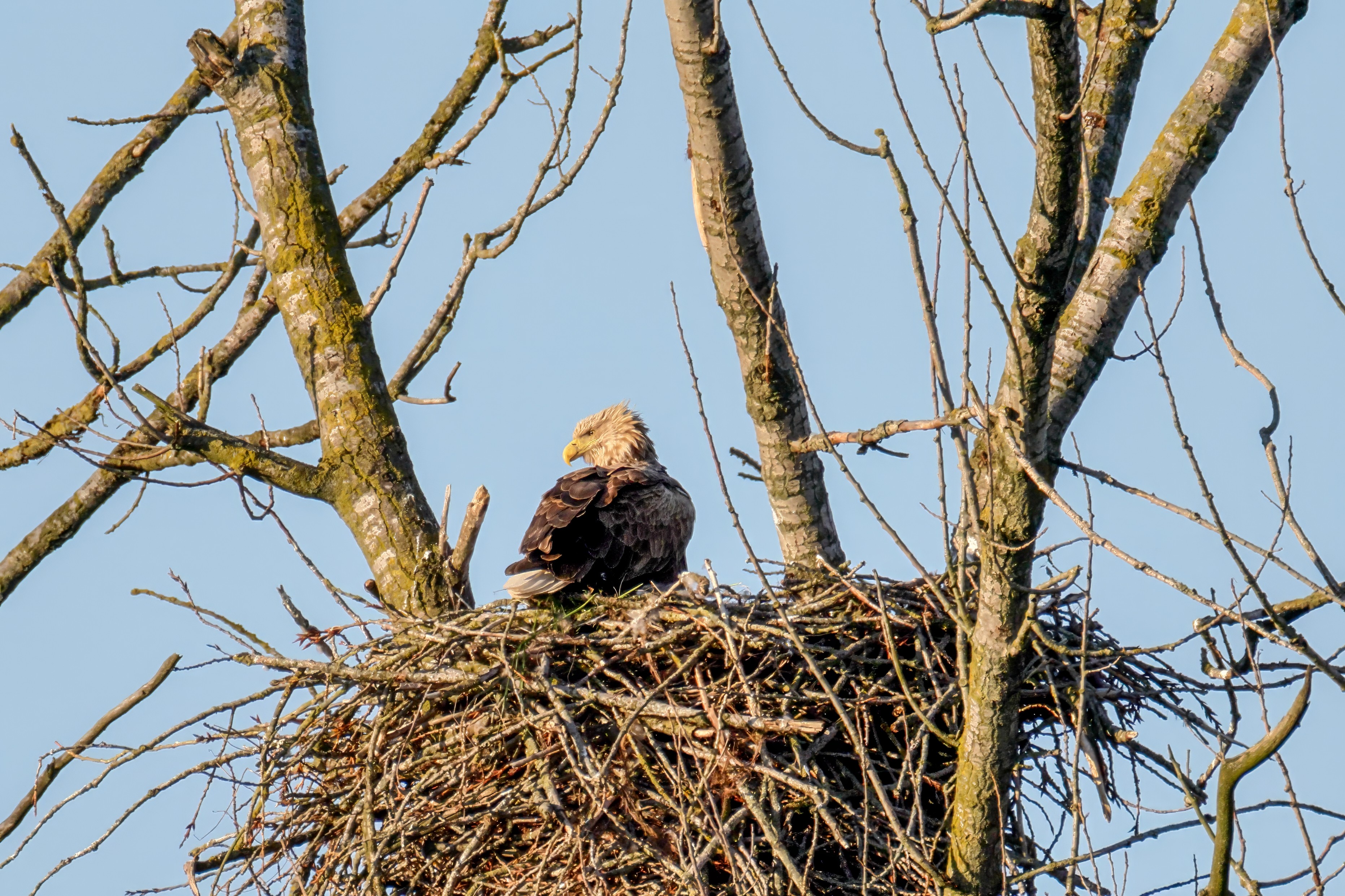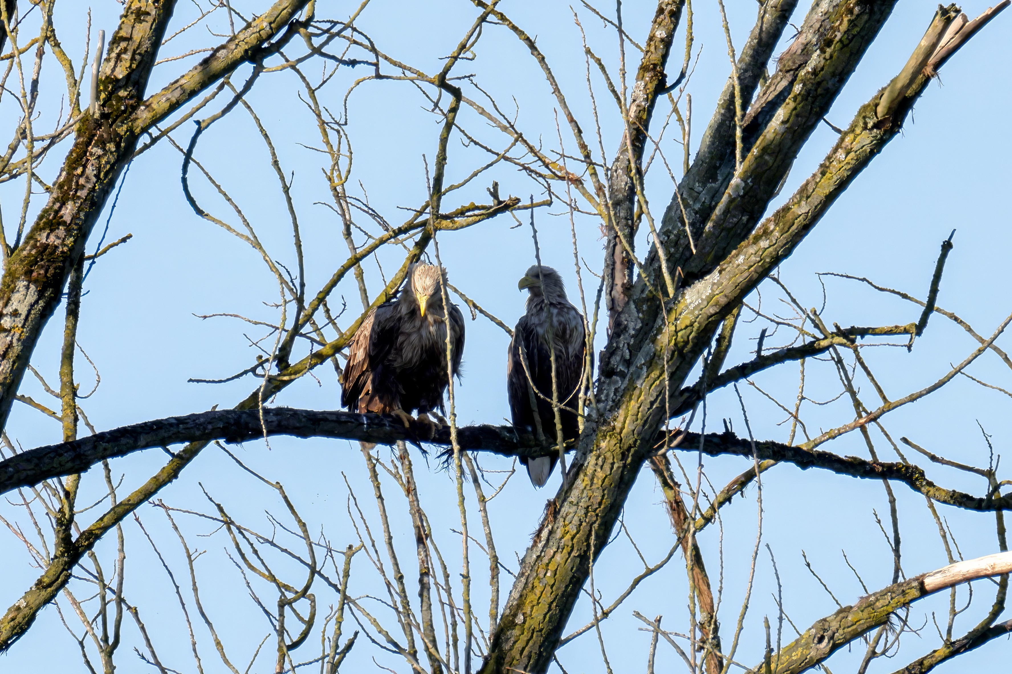 Die kleinen Nestlinge haben sich prächtig entwickelt. Die ständige Anwesenheit der Seeadler im Horst ist nun nicht mehr durchgehend erforderlich. Neben Aufmerksamkeit, Schutz und der Versorgung des Nachwuchses bleibt dem Seeadlerpaar jetzt auch etwas Zeit für sich. Häufig zeigen sie sich gemeinsam in der Nähe des Horstes und lassen dabei ihre enge Verbundenheit und den Stolz als Eltern erkennen.