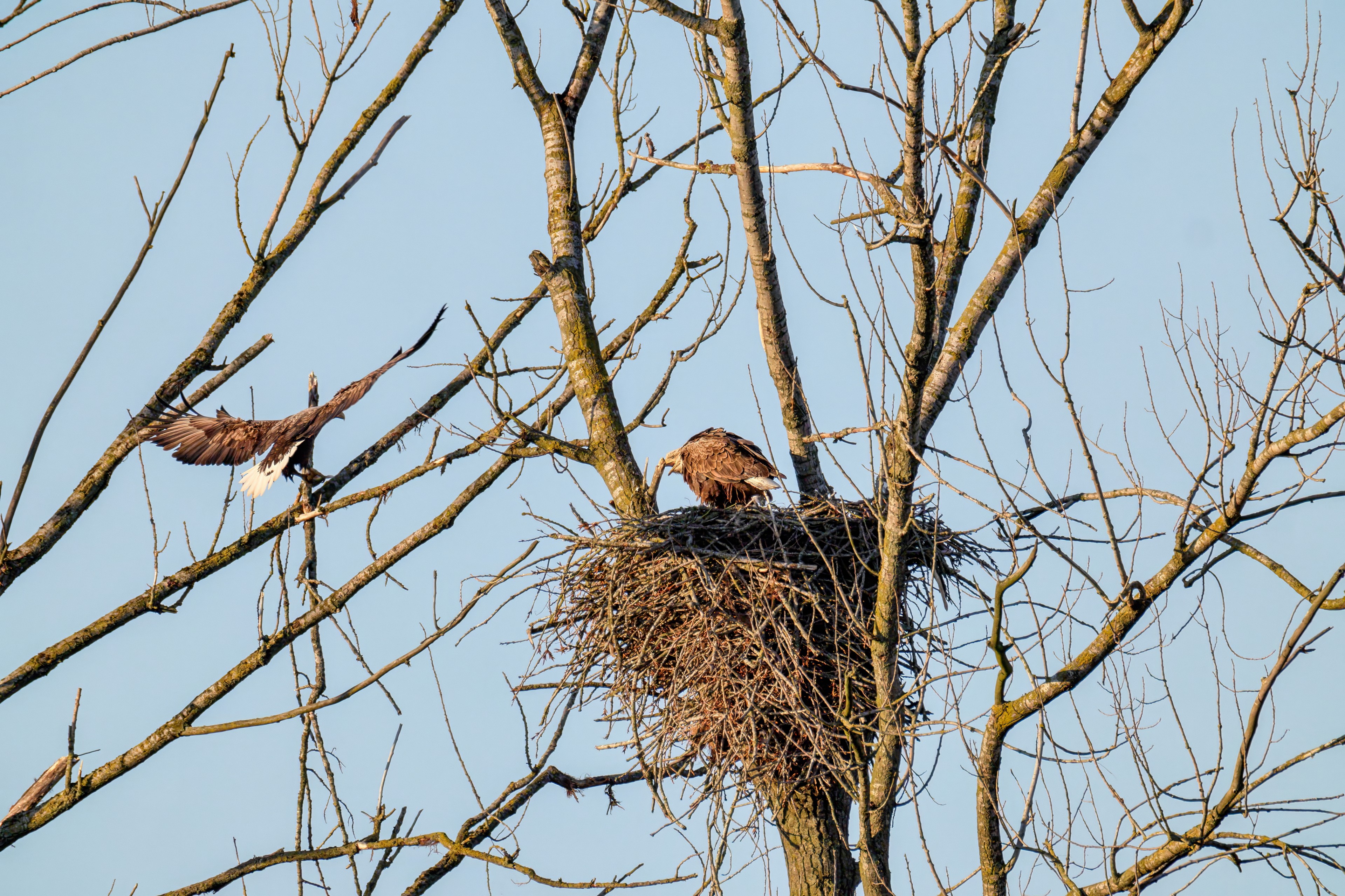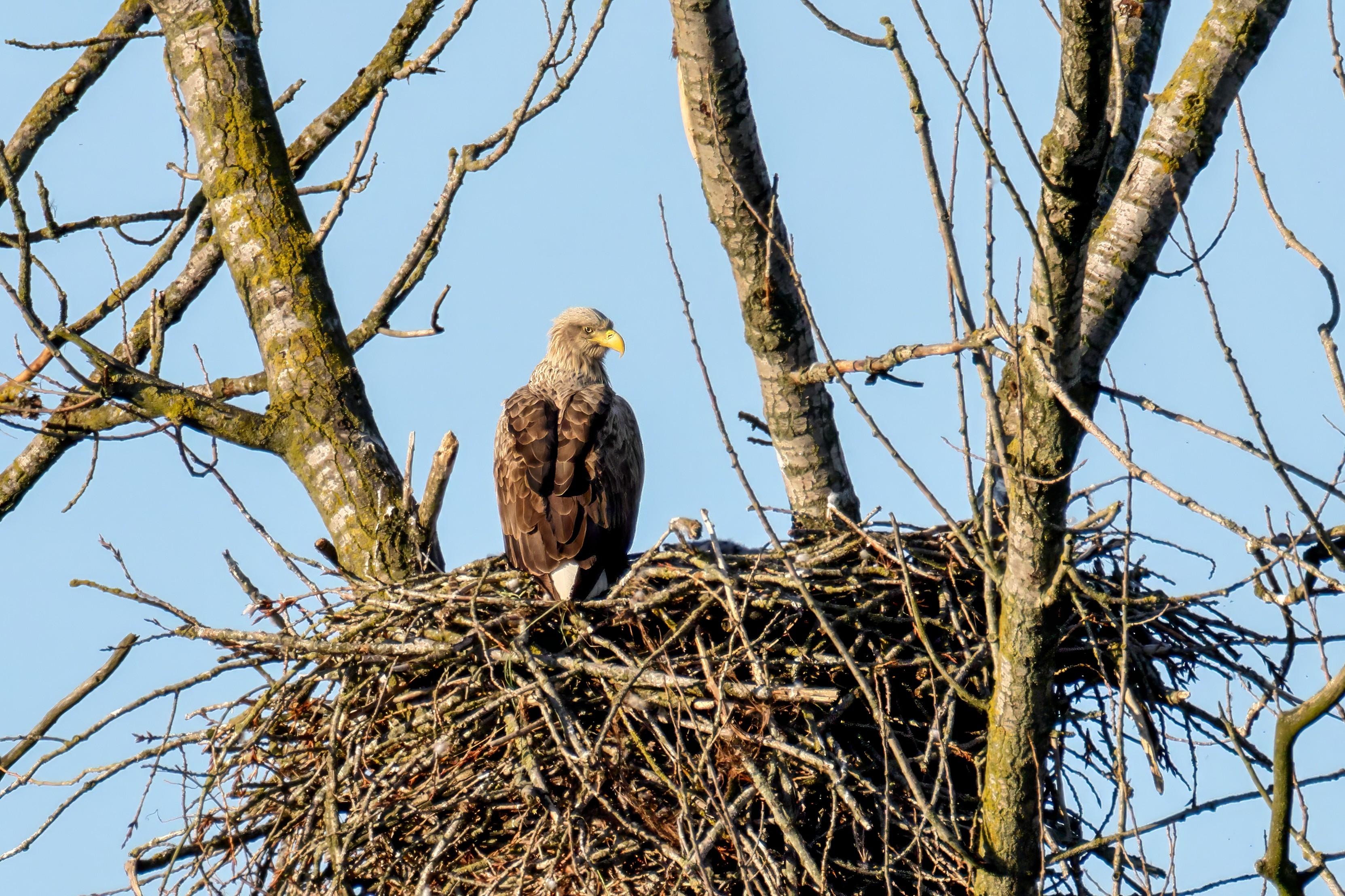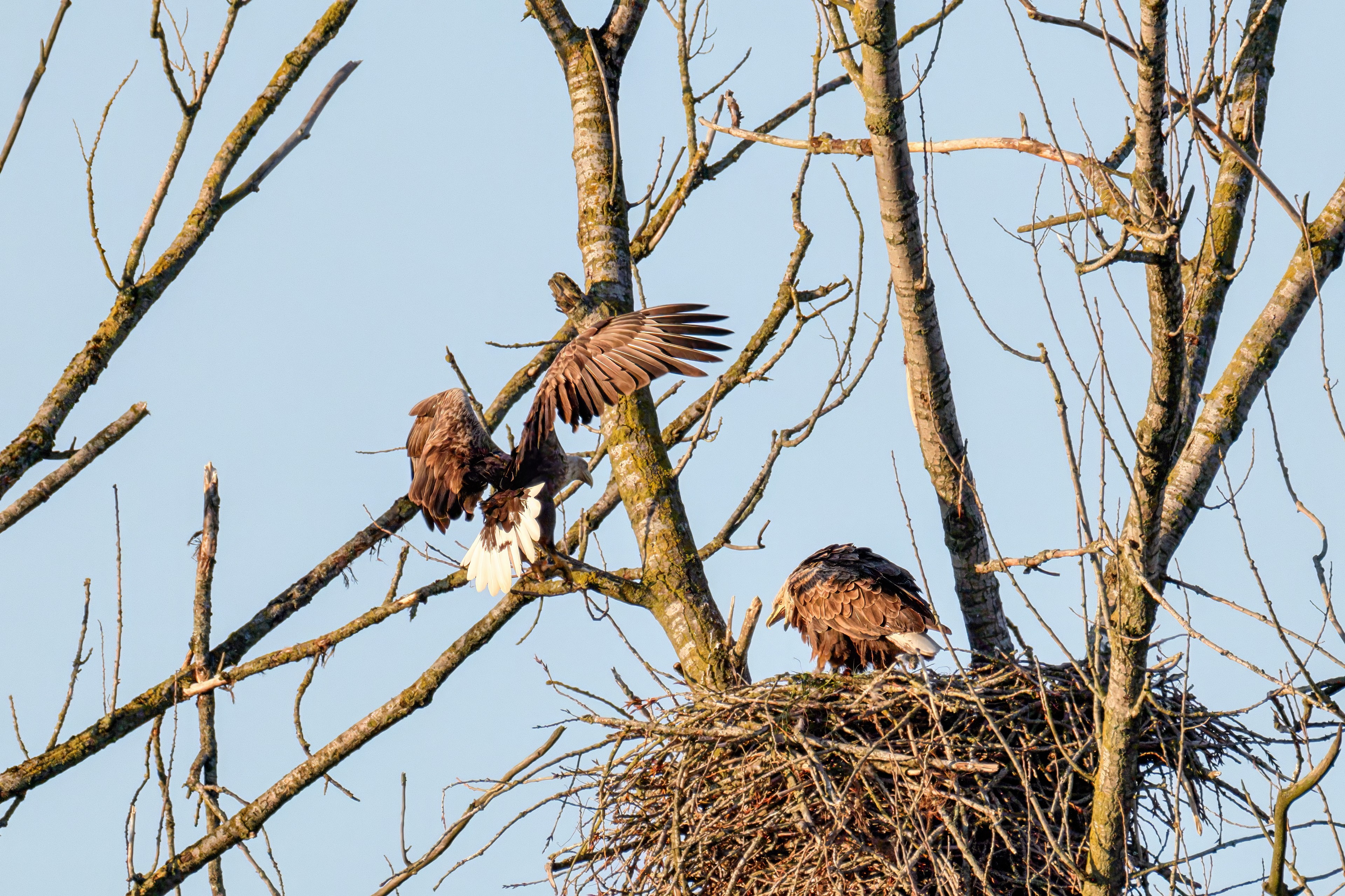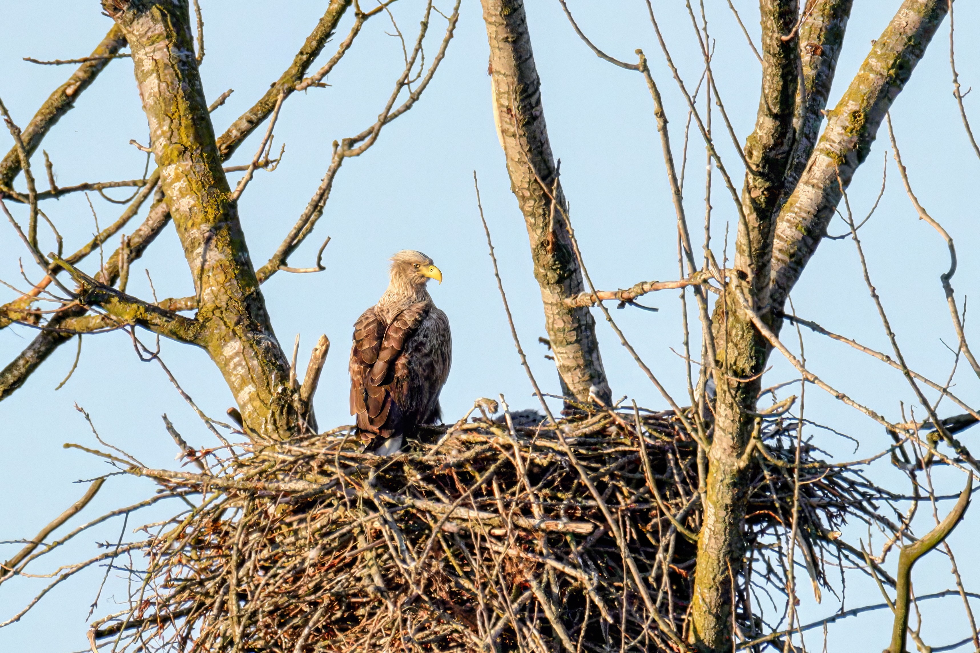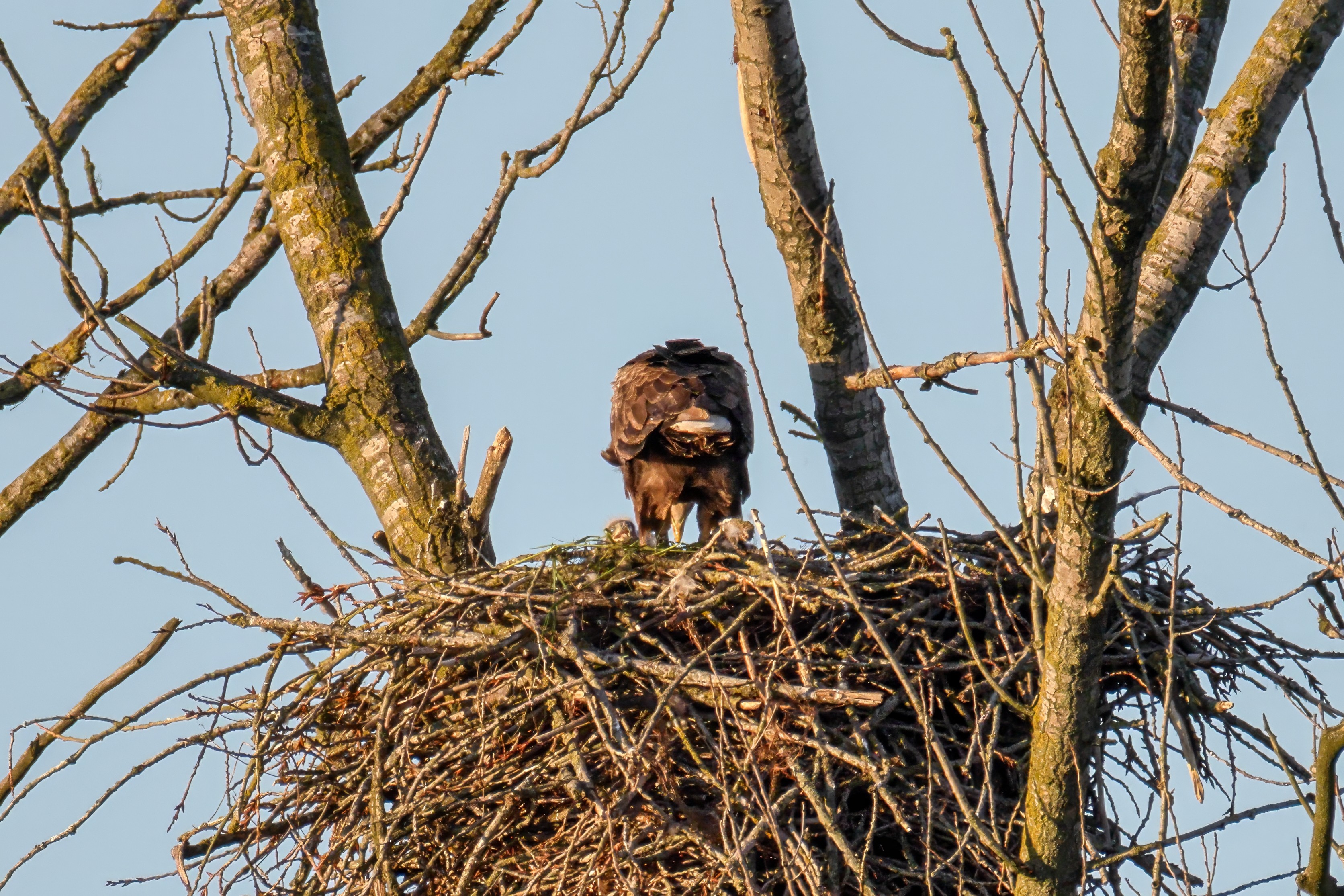 Die kleinen Nestlinge haben sich prächtig entwickelt. Die ständige Anwesenheit der Seeadler im Horst ist nun nicht mehr durchgehend erforderlich. Neben Aufmerksamkeit, Schutz und der Versorgung des Nachwuchses bleibt dem Seeadlerpaar jetzt auch etwas Zeit für sich. Häufig zeigen sie sich gemeinsam in der Nähe des Horstes und lassen dabei ihre enge Verbundenheit und den Stolz als Eltern erkennen.