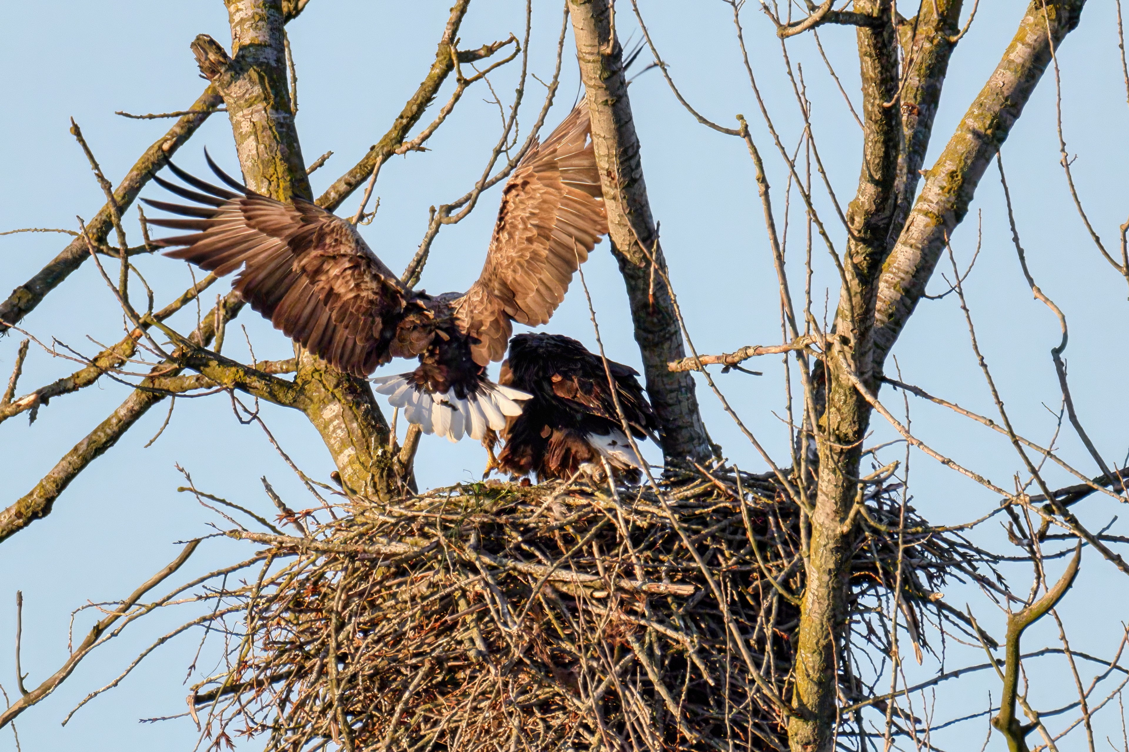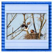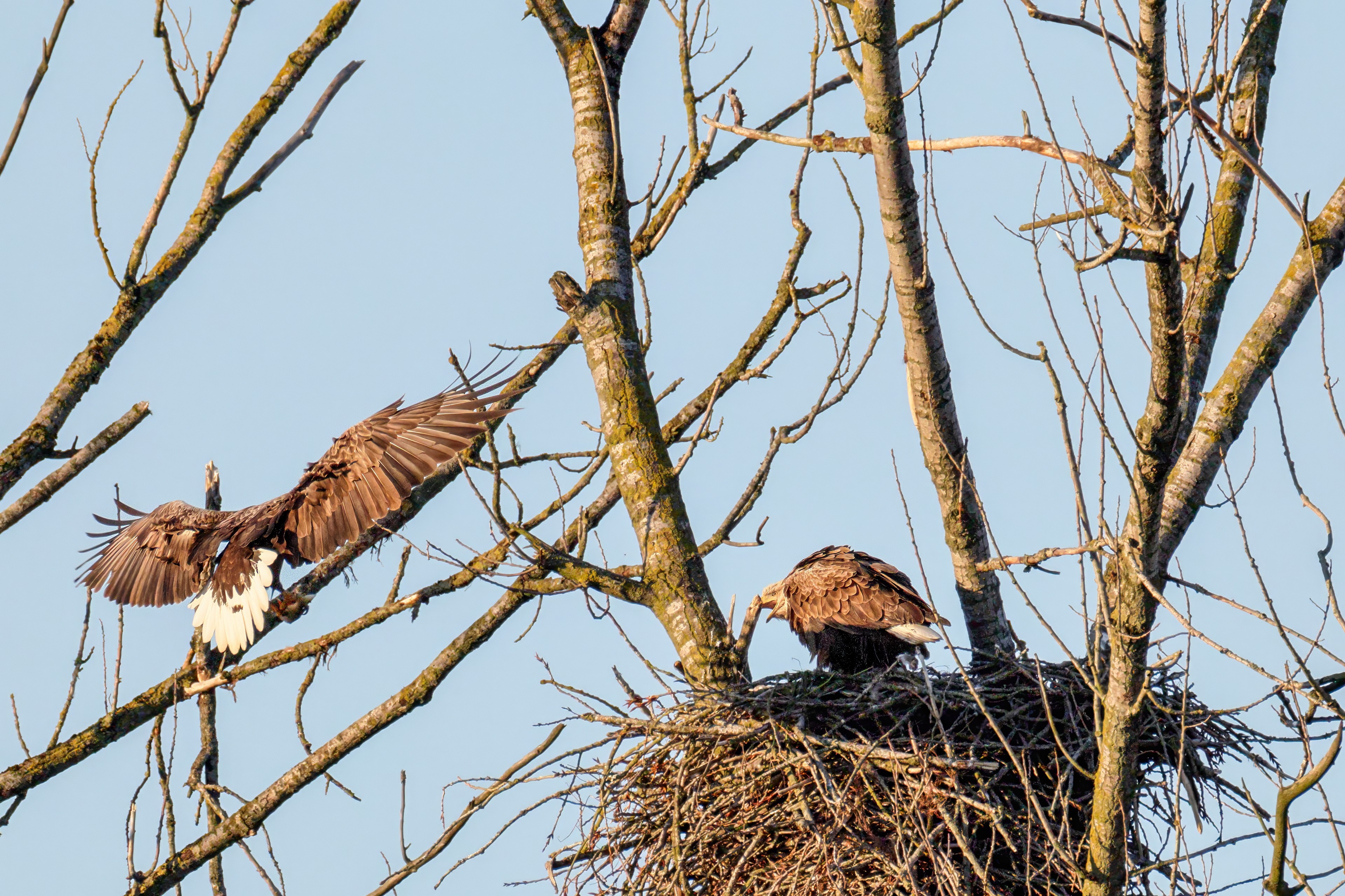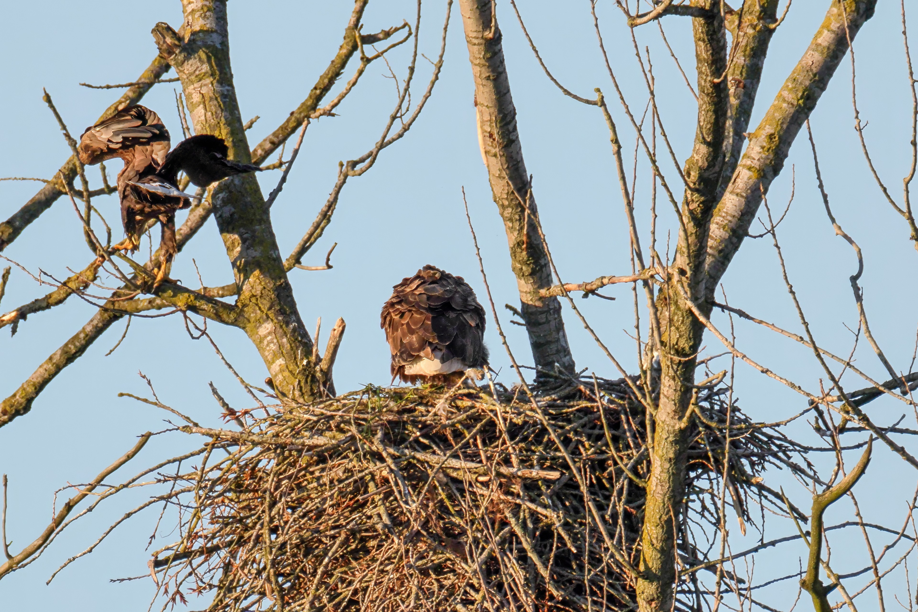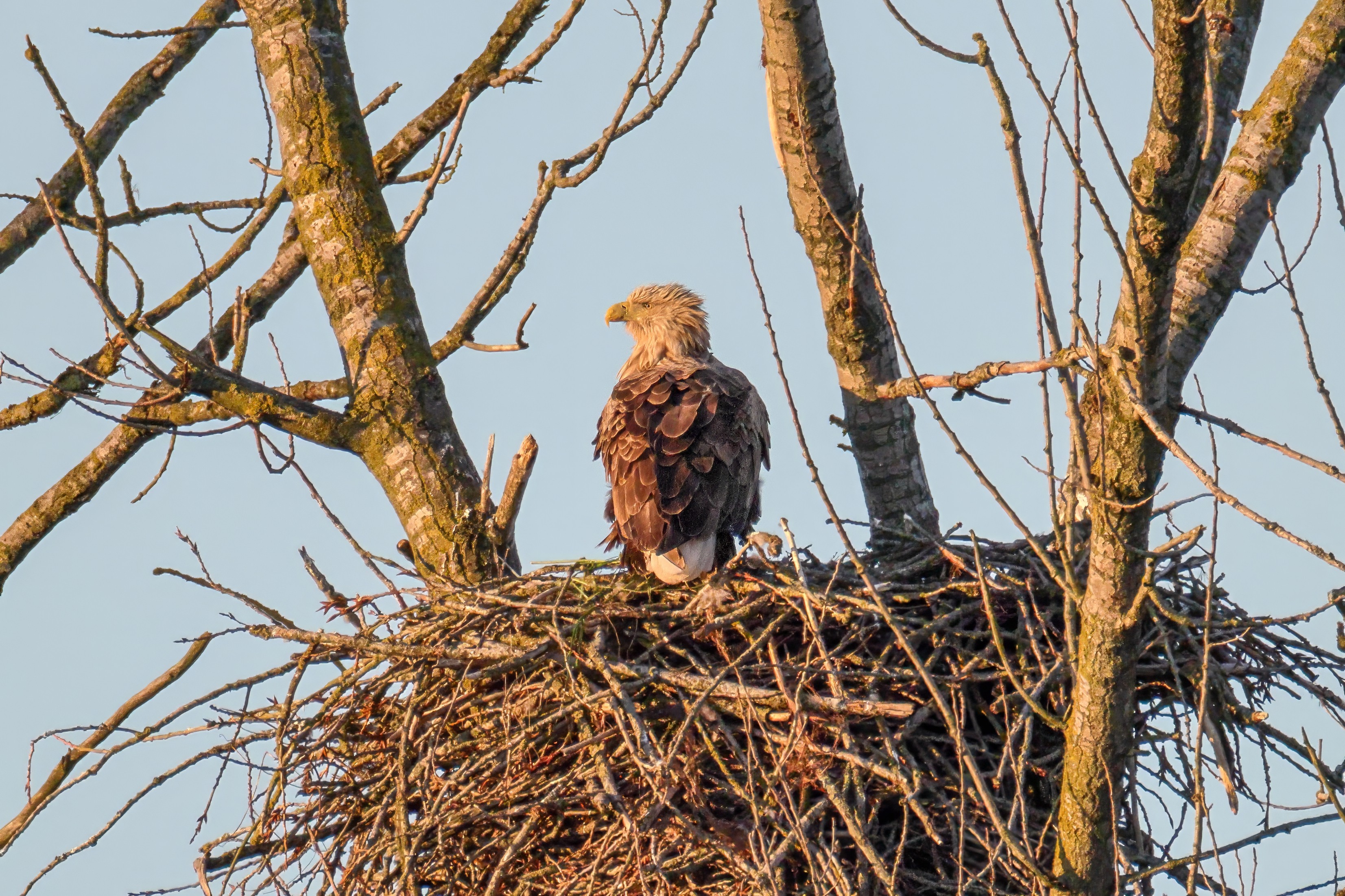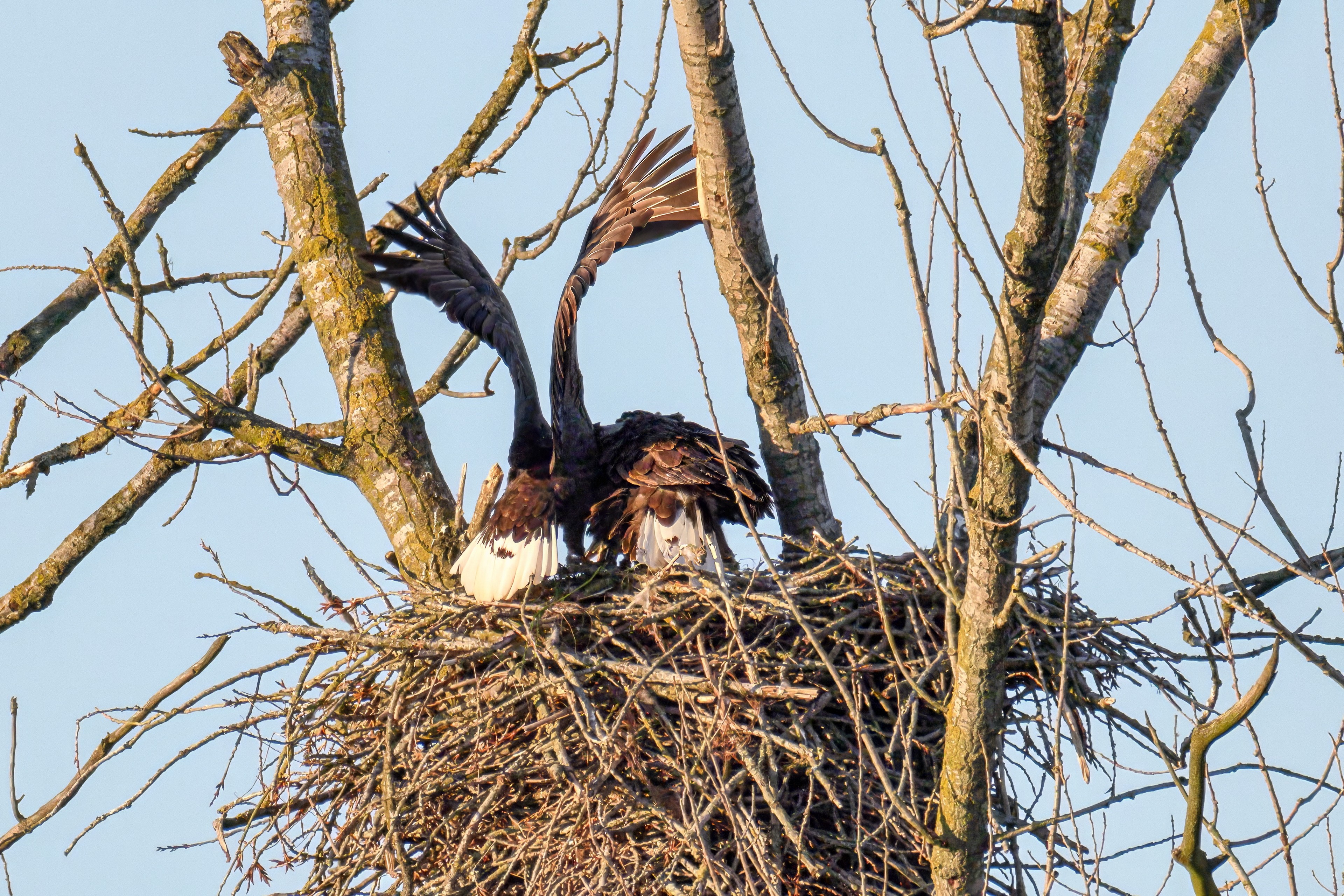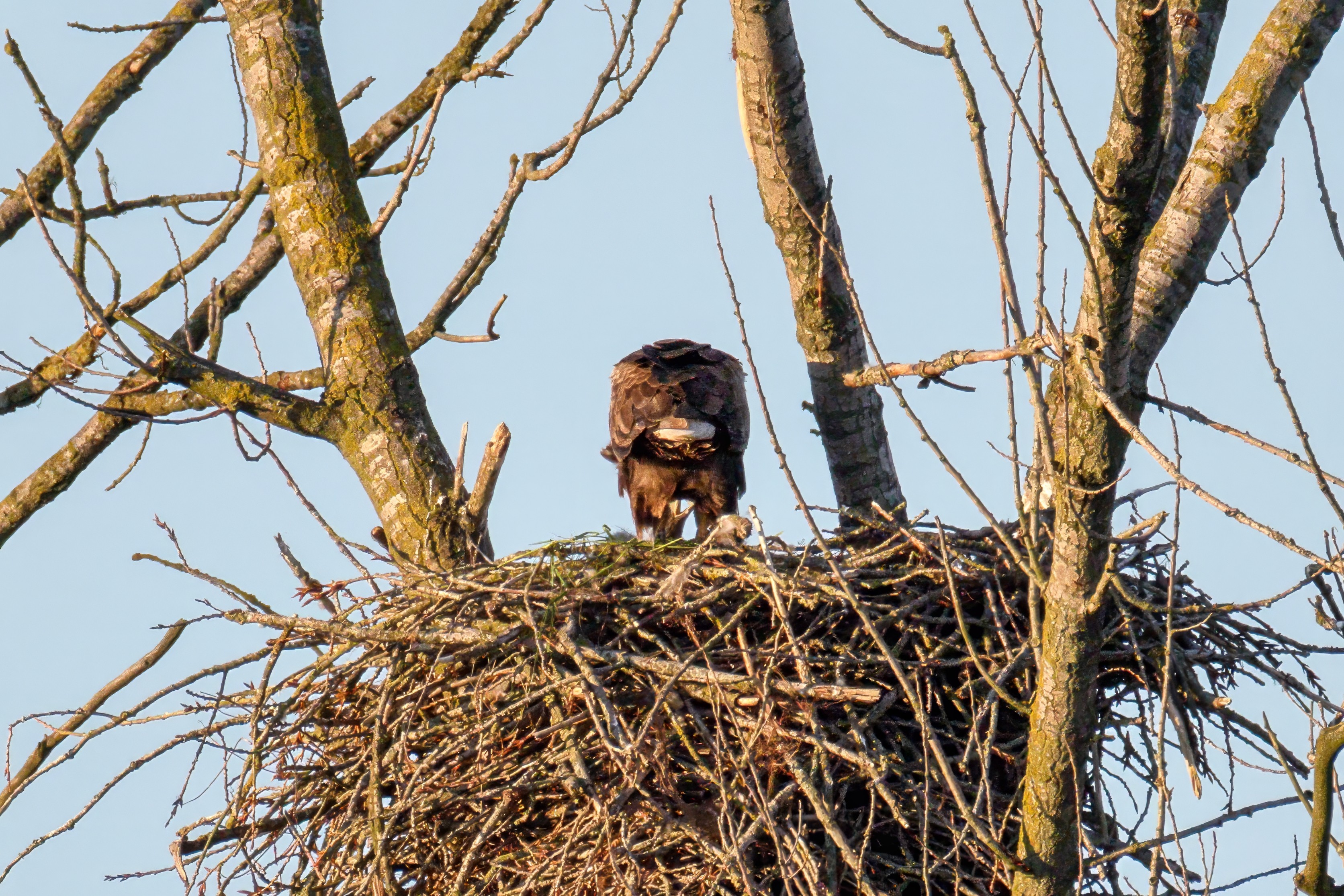 Die kleinen Nestlinge haben sich prächtig entwickelt. Die ständige Anwesenheit der Seeadler im Horst ist nun nicht mehr durchgehend erforderlich. Neben Aufmerksamkeit, Schutz und der Versorgung des Nachwuchses bleibt dem Seeadlerpaar jetzt auch etwas Zeit für sich. Häufig zeigen sie sich gemeinsam in der Nähe des Horstes und lassen dabei ihre enge Verbundenheit und den Stolz als Eltern erkennen.