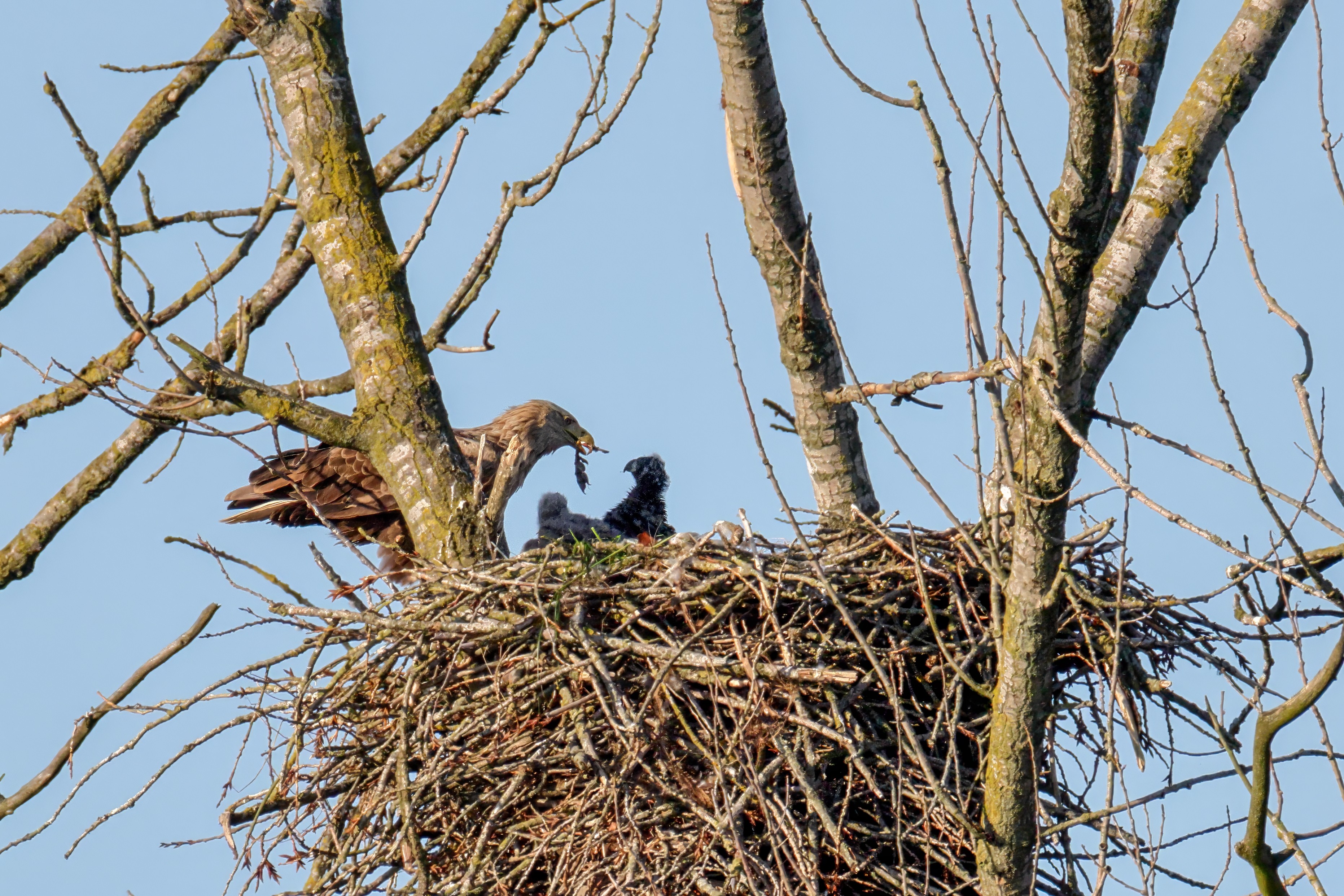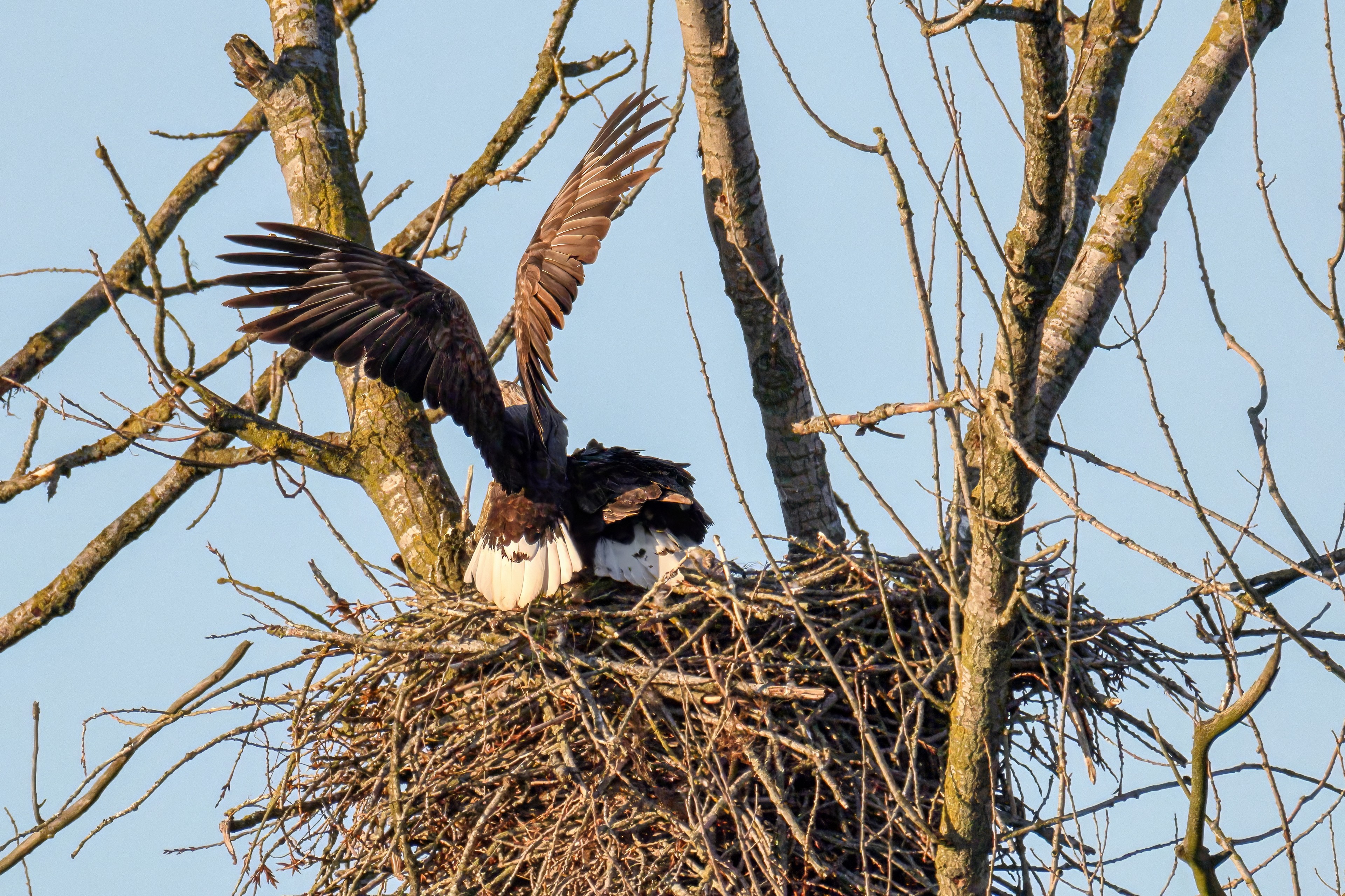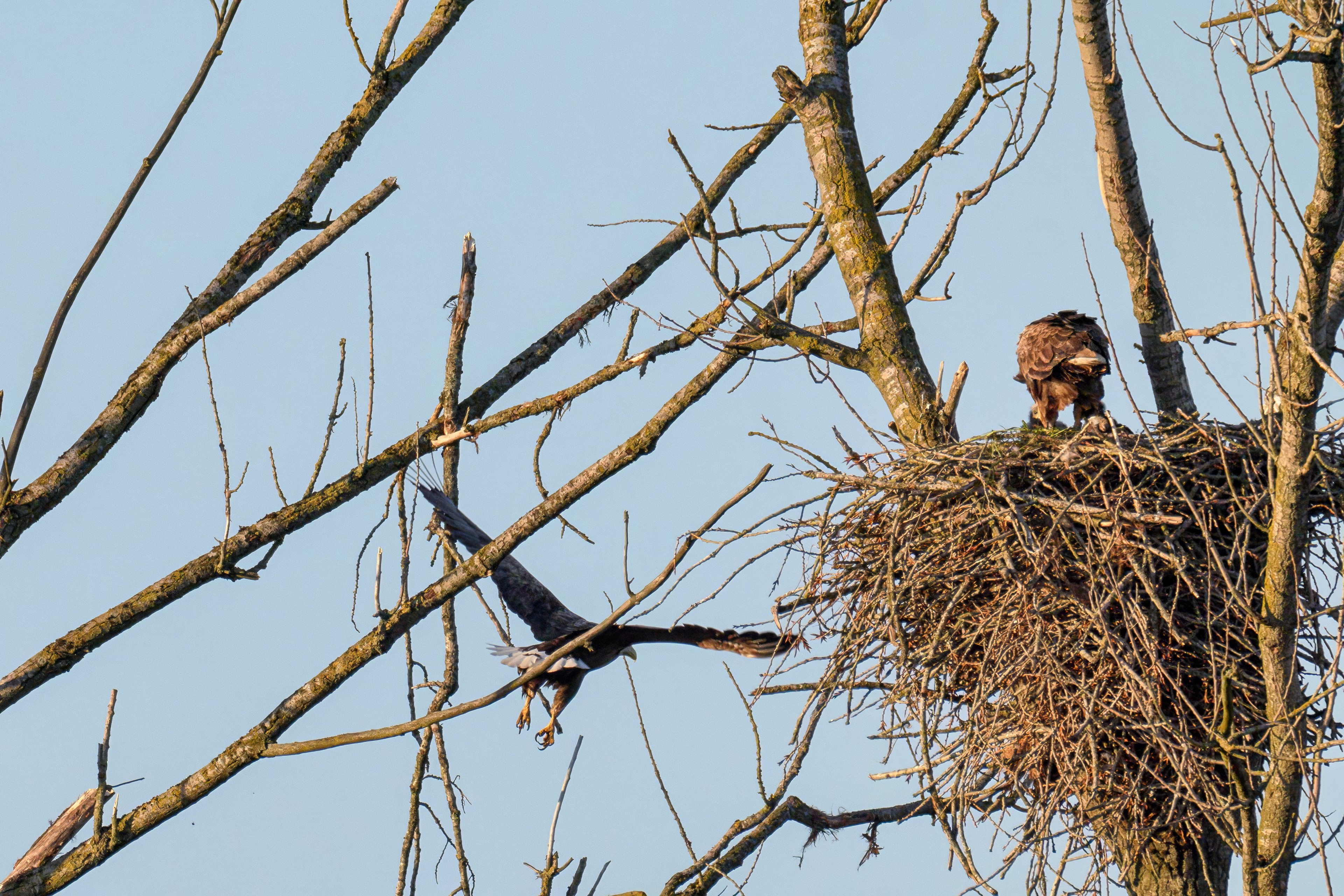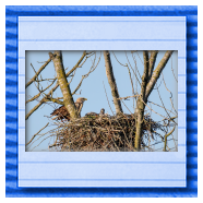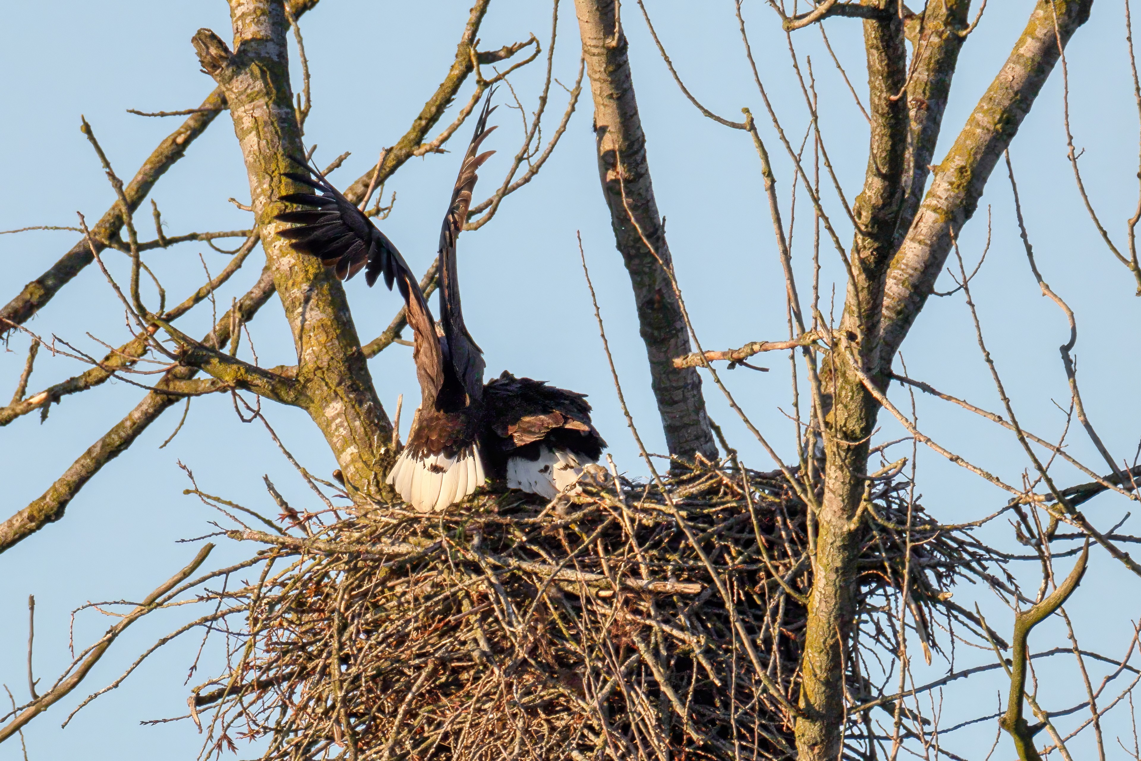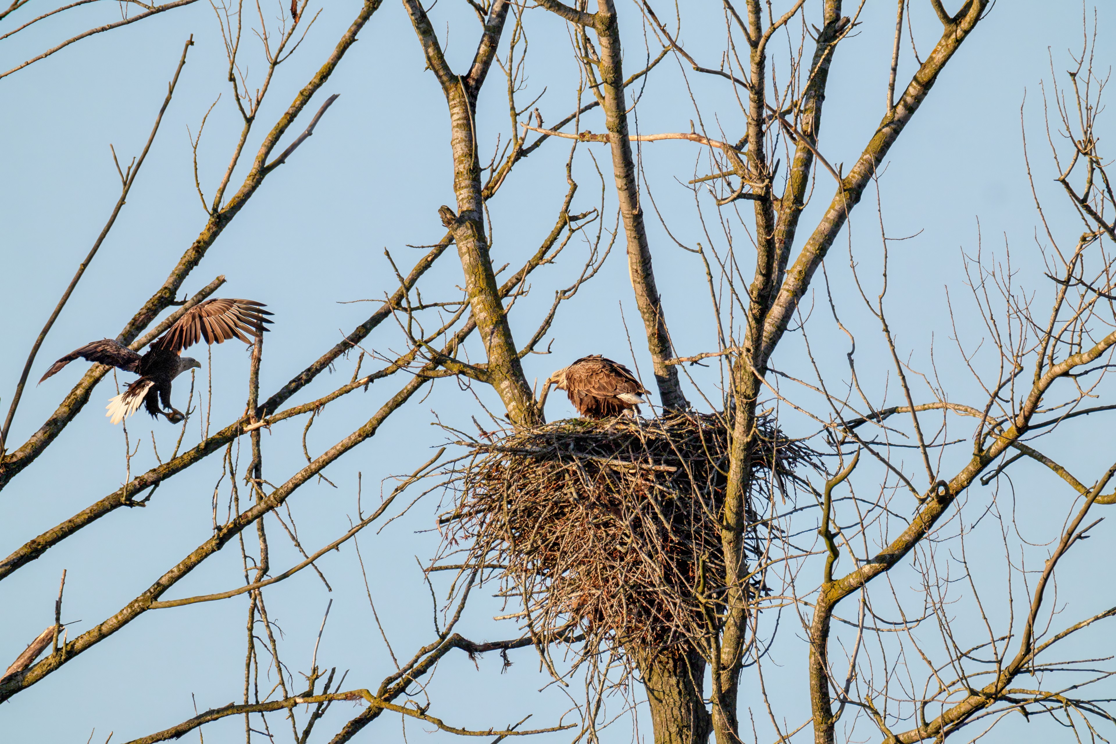 Die kleinen Nestlinge haben sich prächtig entwickelt. Die ständige Anwesenheit der Seeadler im Horst ist nun nicht mehr durchgehend erforderlich. Neben Aufmerksamkeit, Schutz und der Versorgung des Nachwuchses bleibt dem Seeadlerpaar jetzt auch etwas Zeit für sich. Häufig zeigen sie sich gemeinsam in der Nähe des Horstes und lassen dabei ihre enge Verbundenheit und den Stolz als Eltern erkennen.