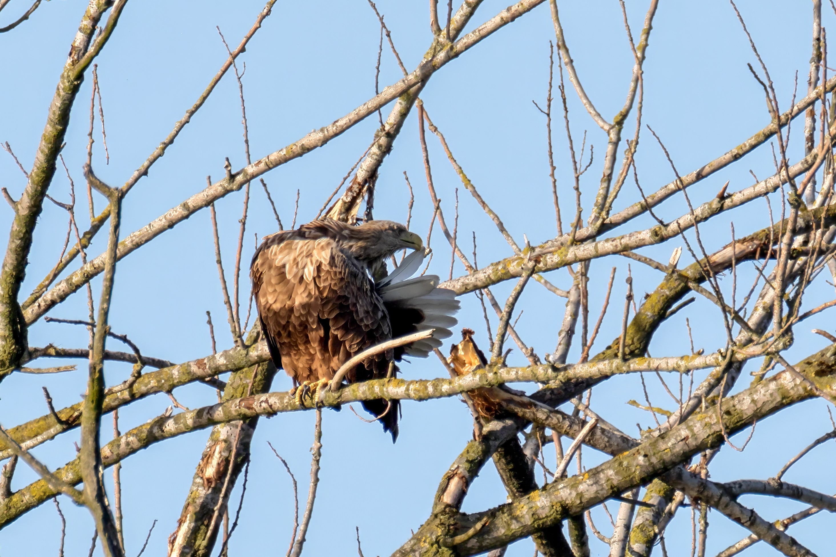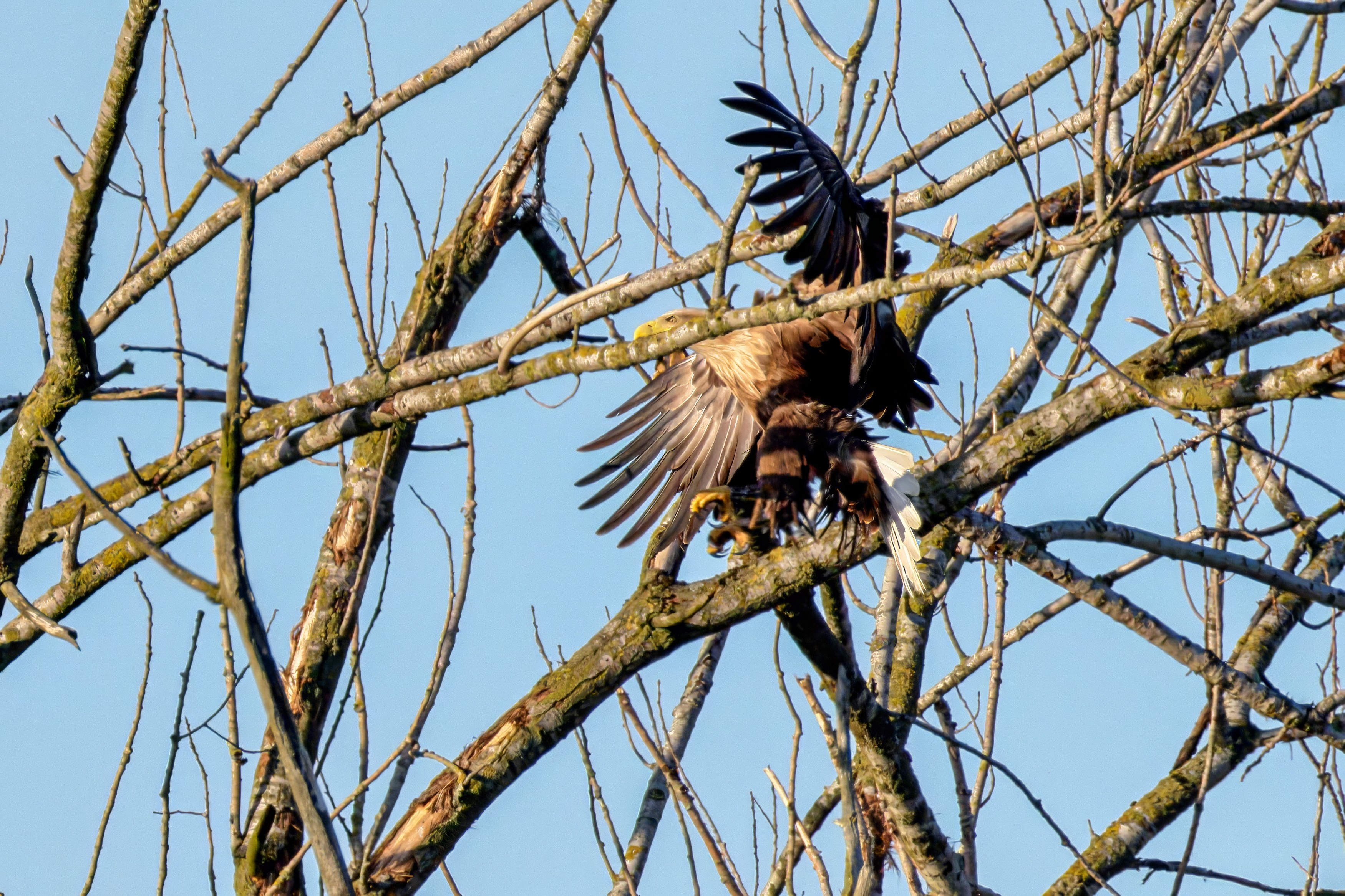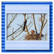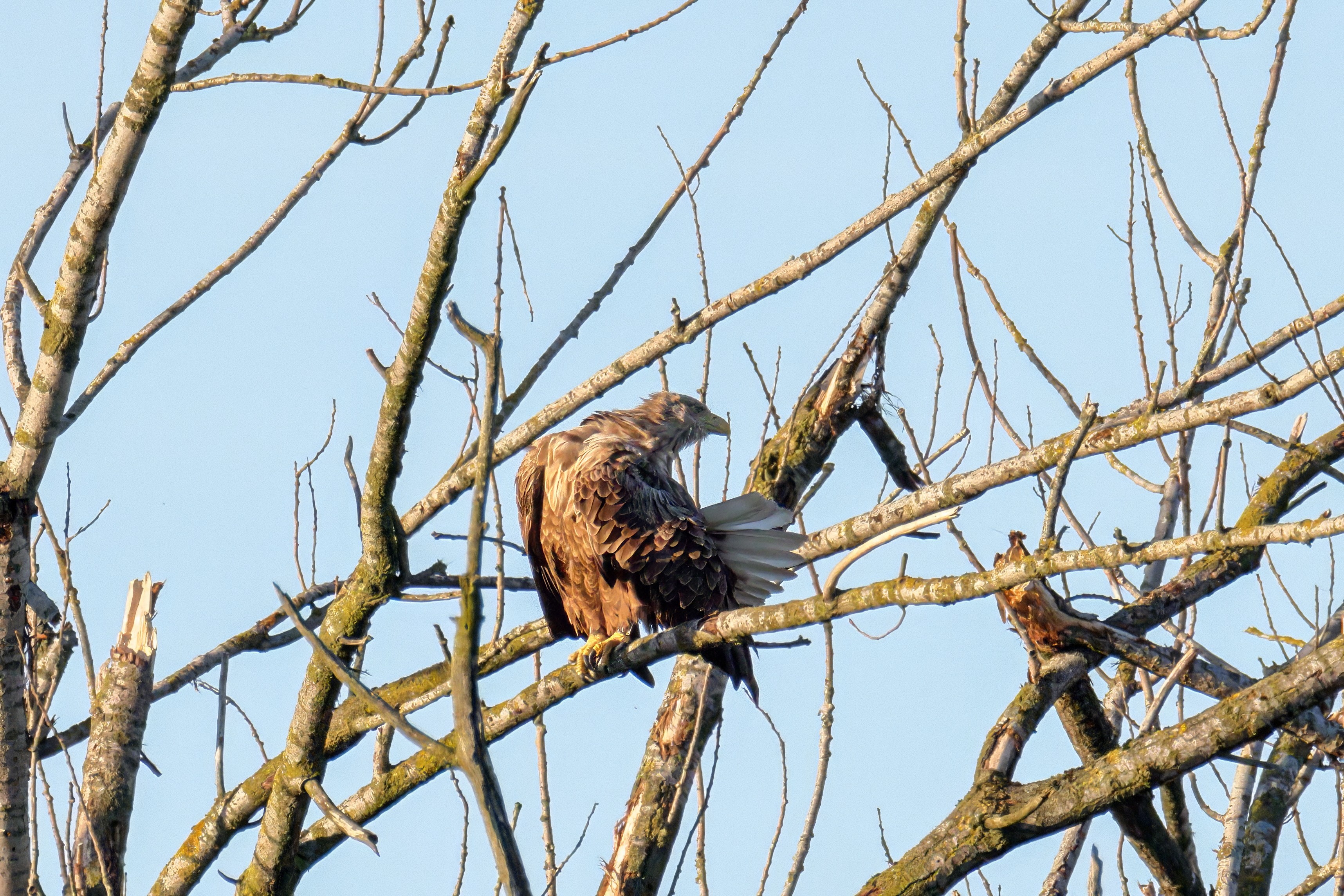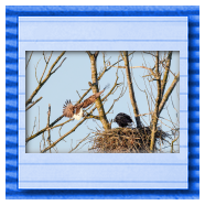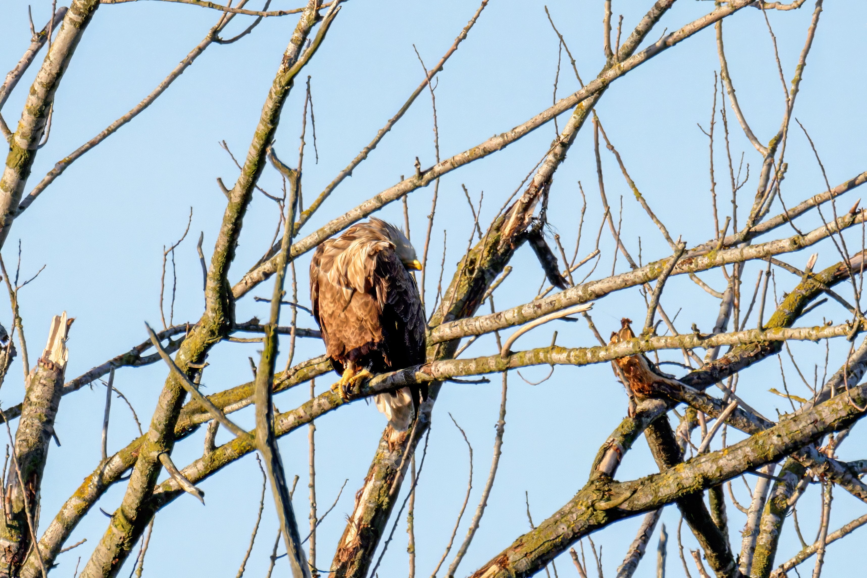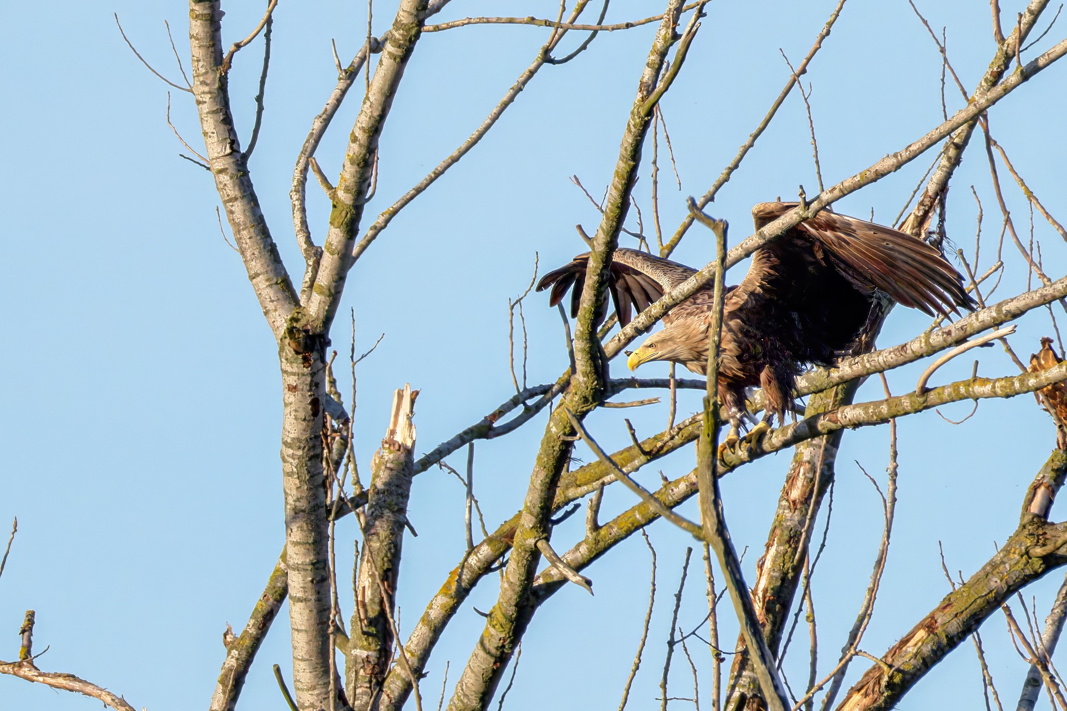 Die kleinen Nestlinge haben sich prächtig entwickelt. Die ständige Anwesenheit der Seeadler im Horst ist nun nicht mehr durchgehend erforderlich. Neben Aufmerksamkeit, Schutz und der Versorgung des Nachwuchses bleibt dem Seeadlerpaar jetzt auch etwas Zeit für sich. Häufig zeigen sie sich gemeinsam in der Nähe des Horstes und lassen dabei ihre enge Verbundenheit und den Stolz als Eltern erkennen.