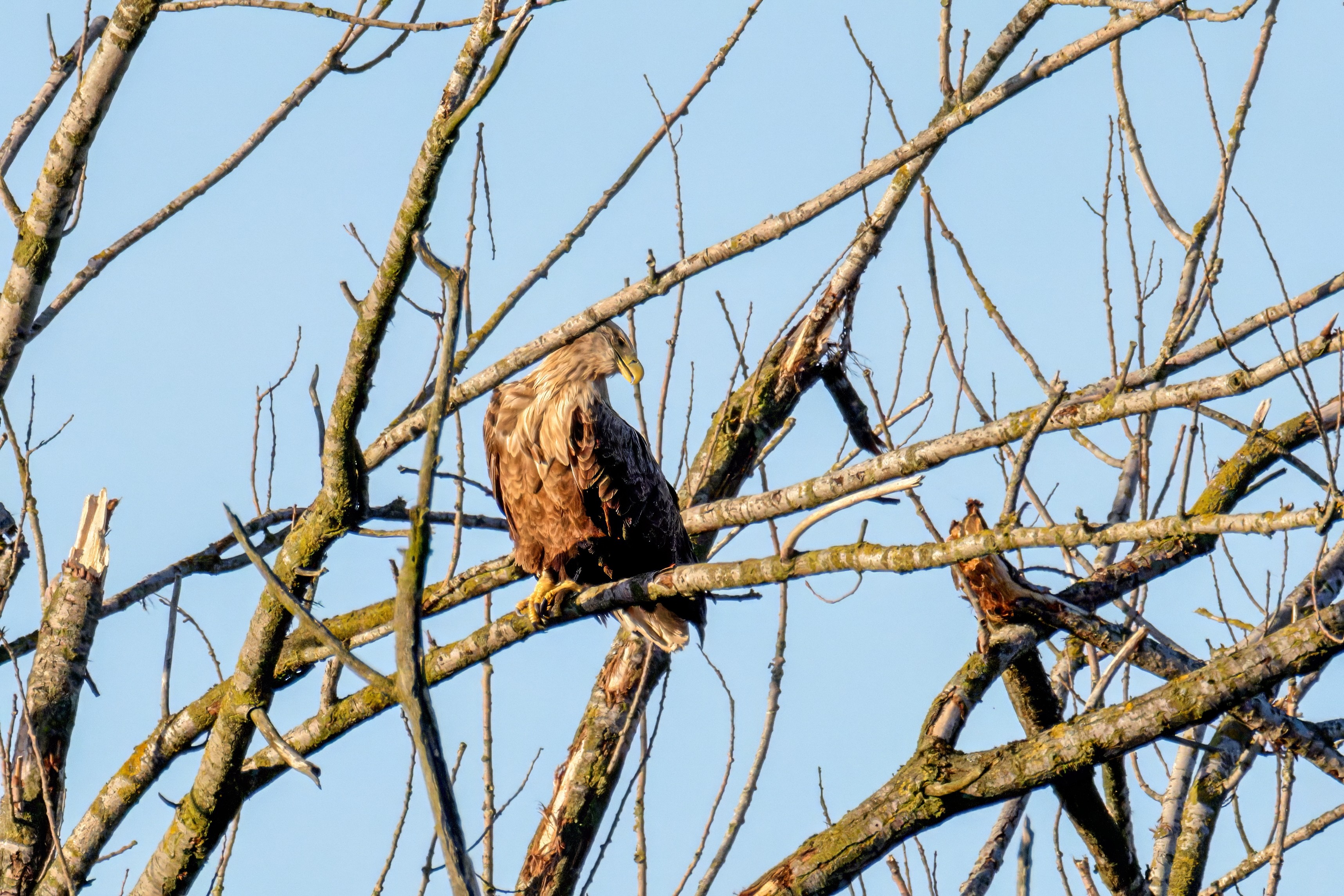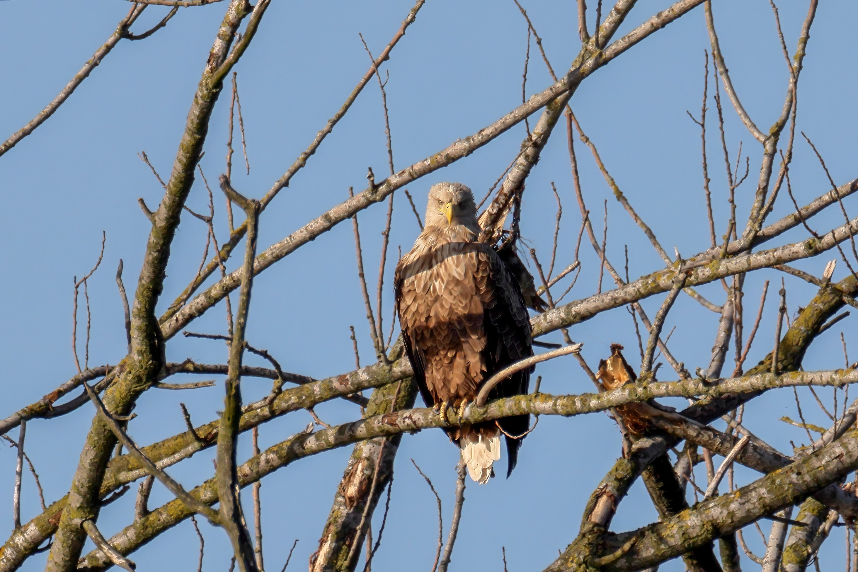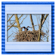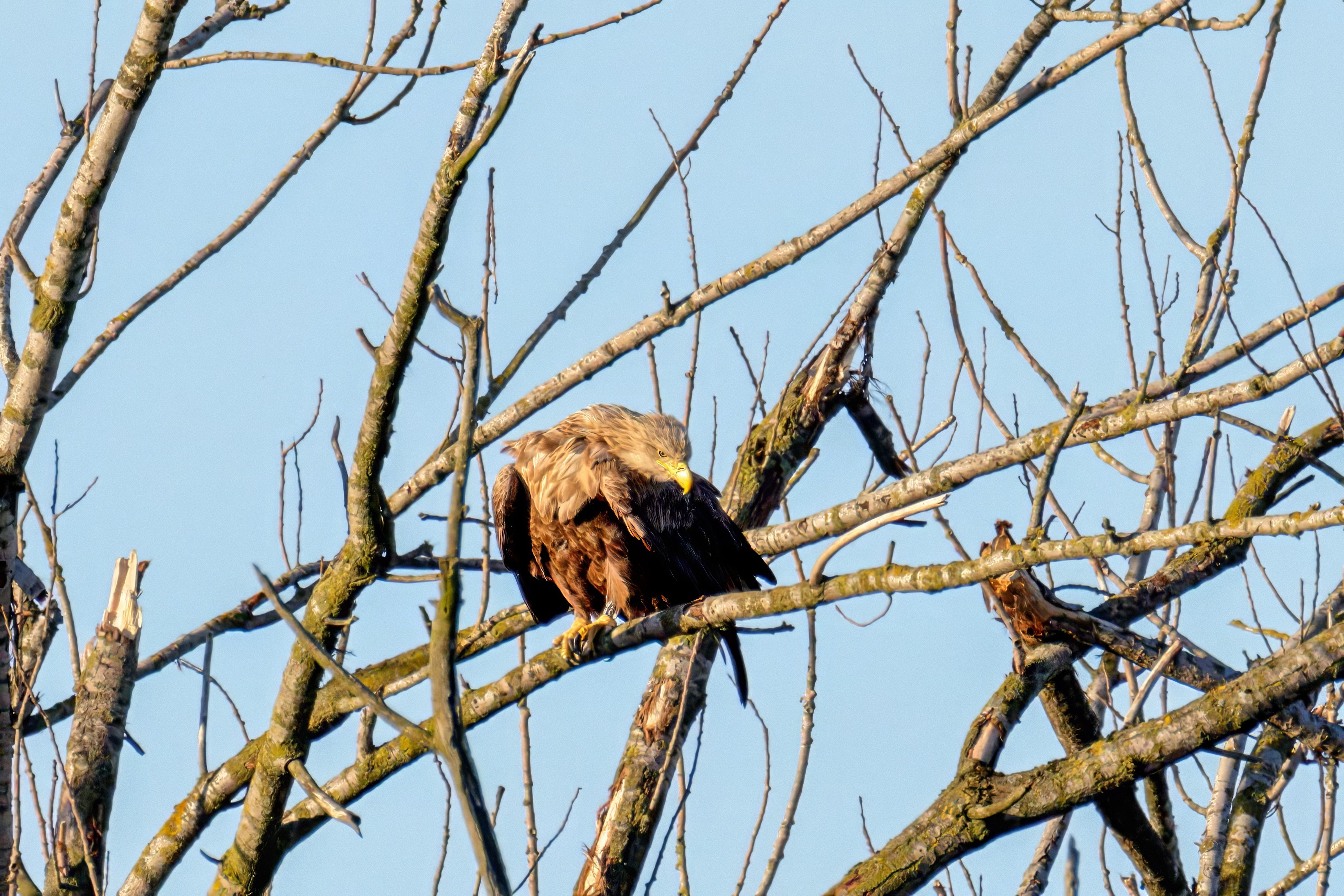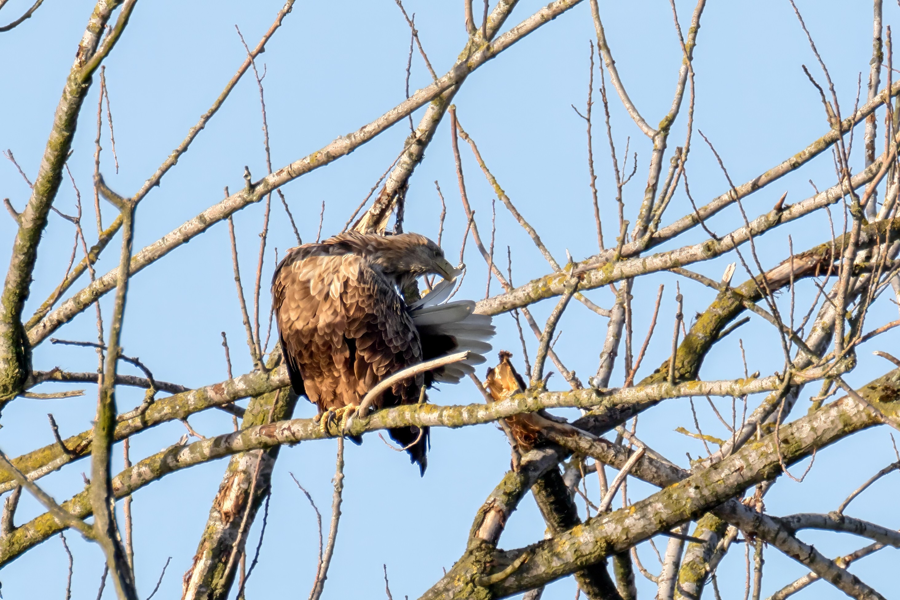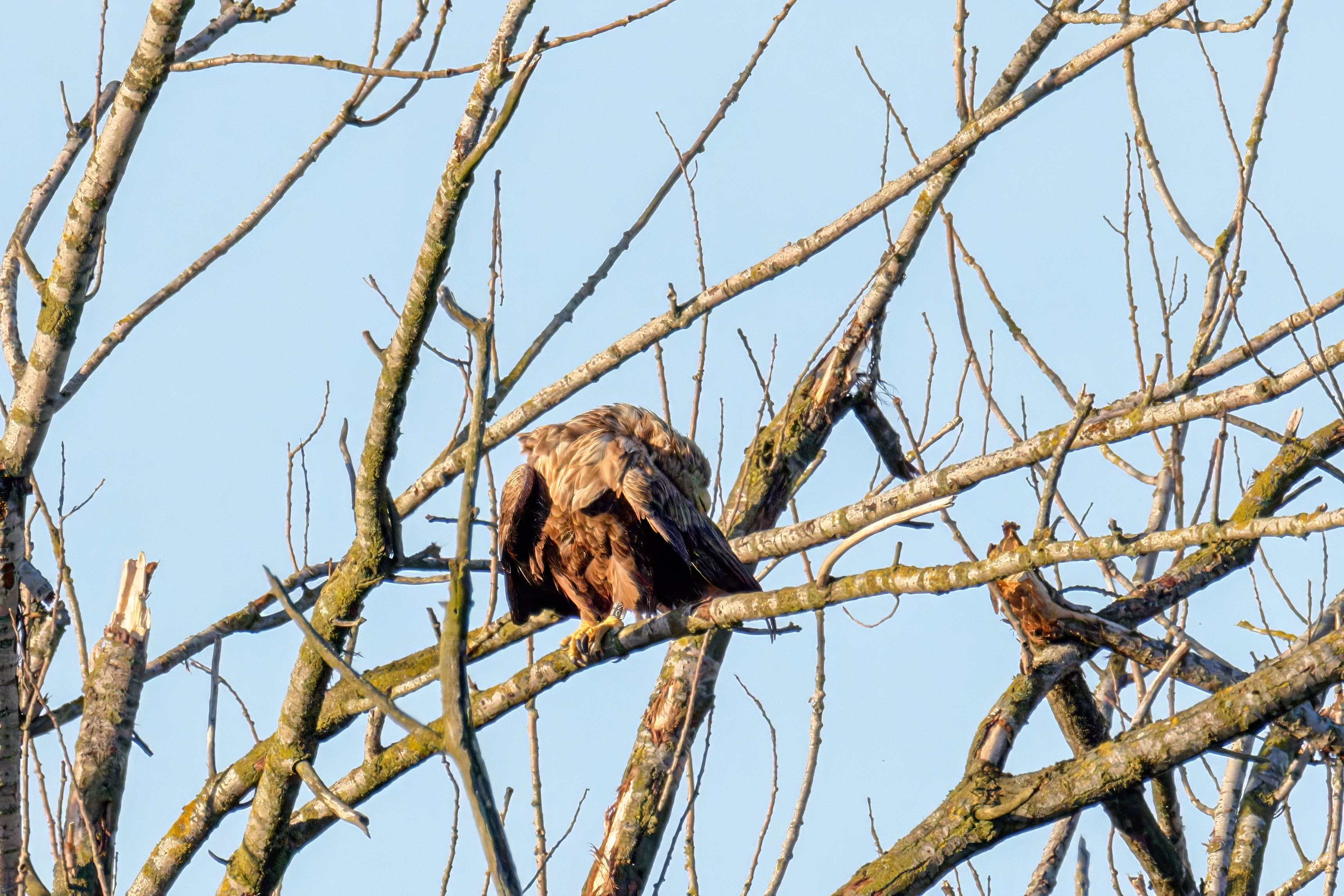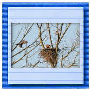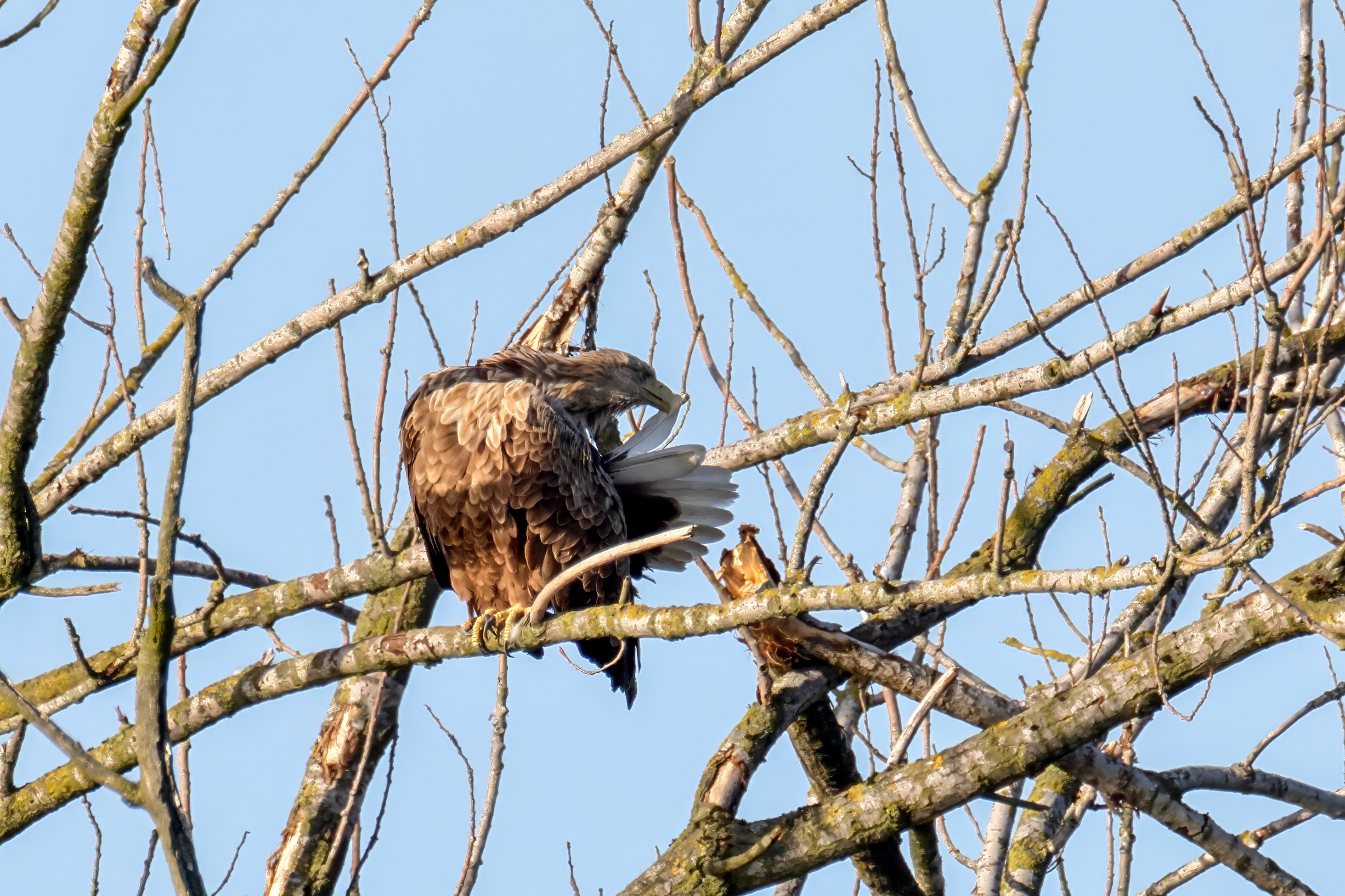 Die kleinen Nestlinge haben sich prächtig entwickelt. Die ständige Anwesenheit der Seeadler im Horst ist nun nicht mehr durchgehend erforderlich. Neben Aufmerksamkeit, Schutz und der Versorgung des Nachwuchses bleibt dem Seeadlerpaar jetzt auch etwas Zeit für sich. Häufig zeigen sie sich gemeinsam in der Nähe des Horstes und lassen dabei ihre enge Verbundenheit und den Stolz als Eltern erkennen.
