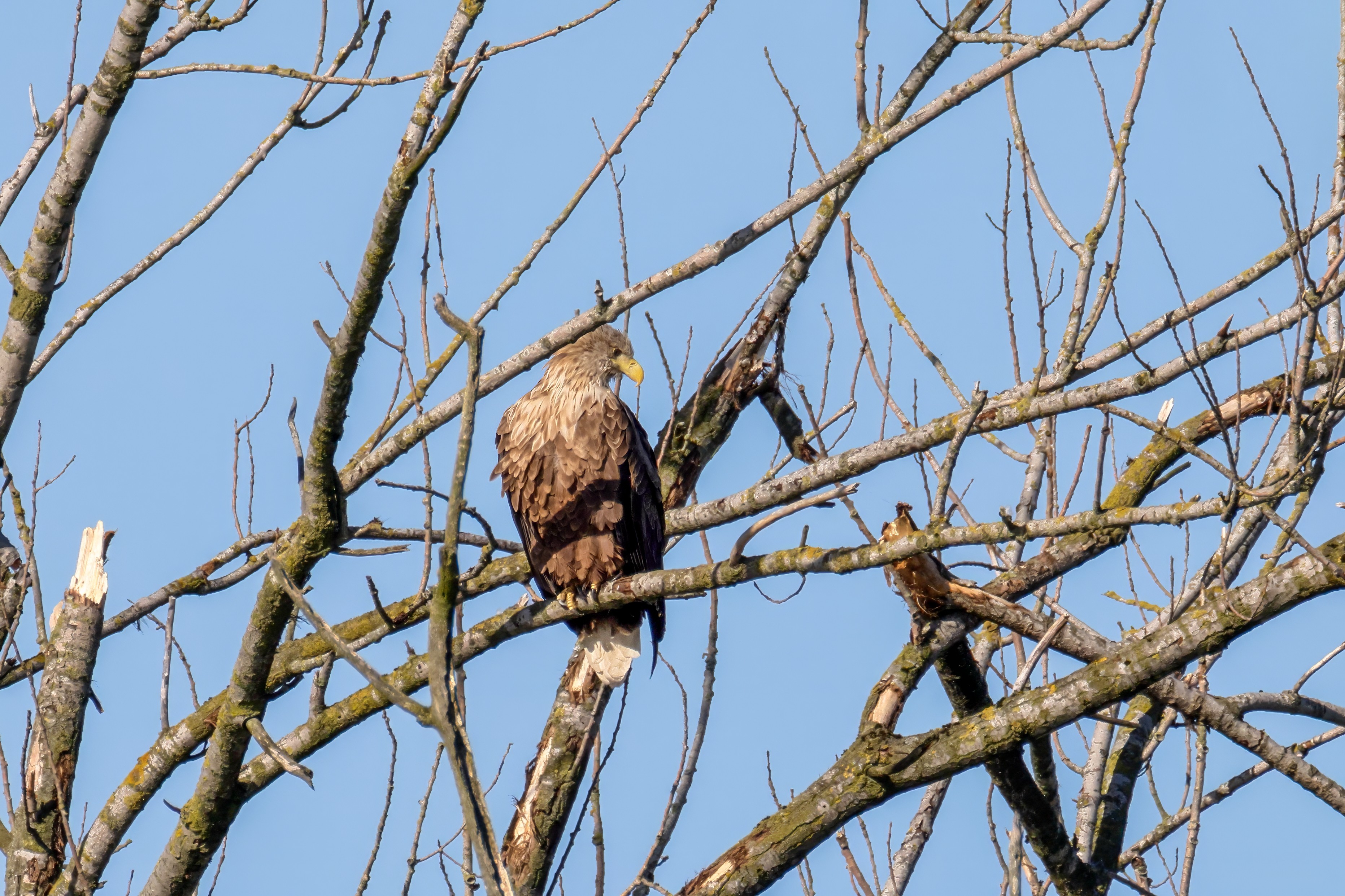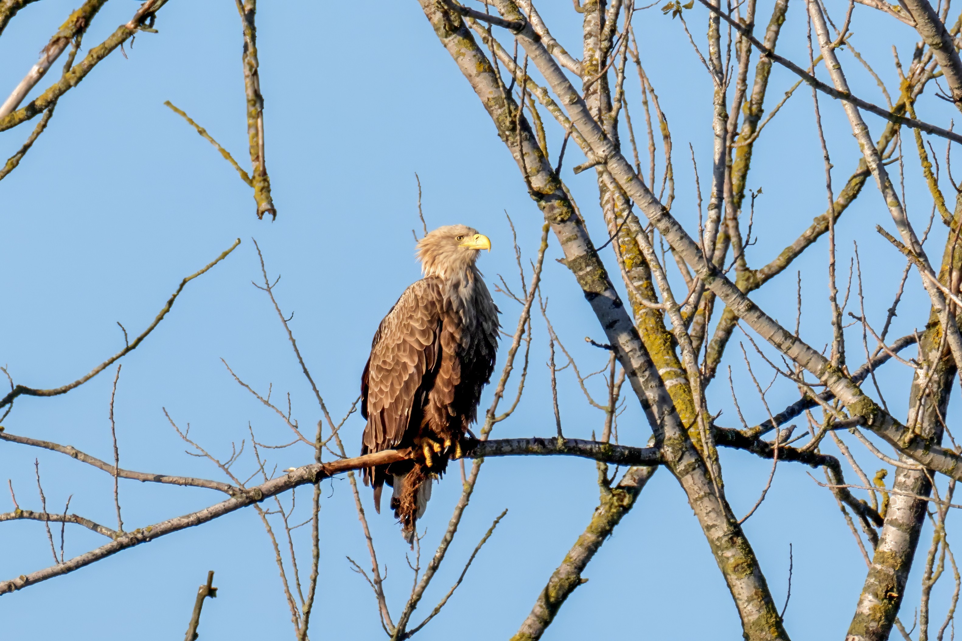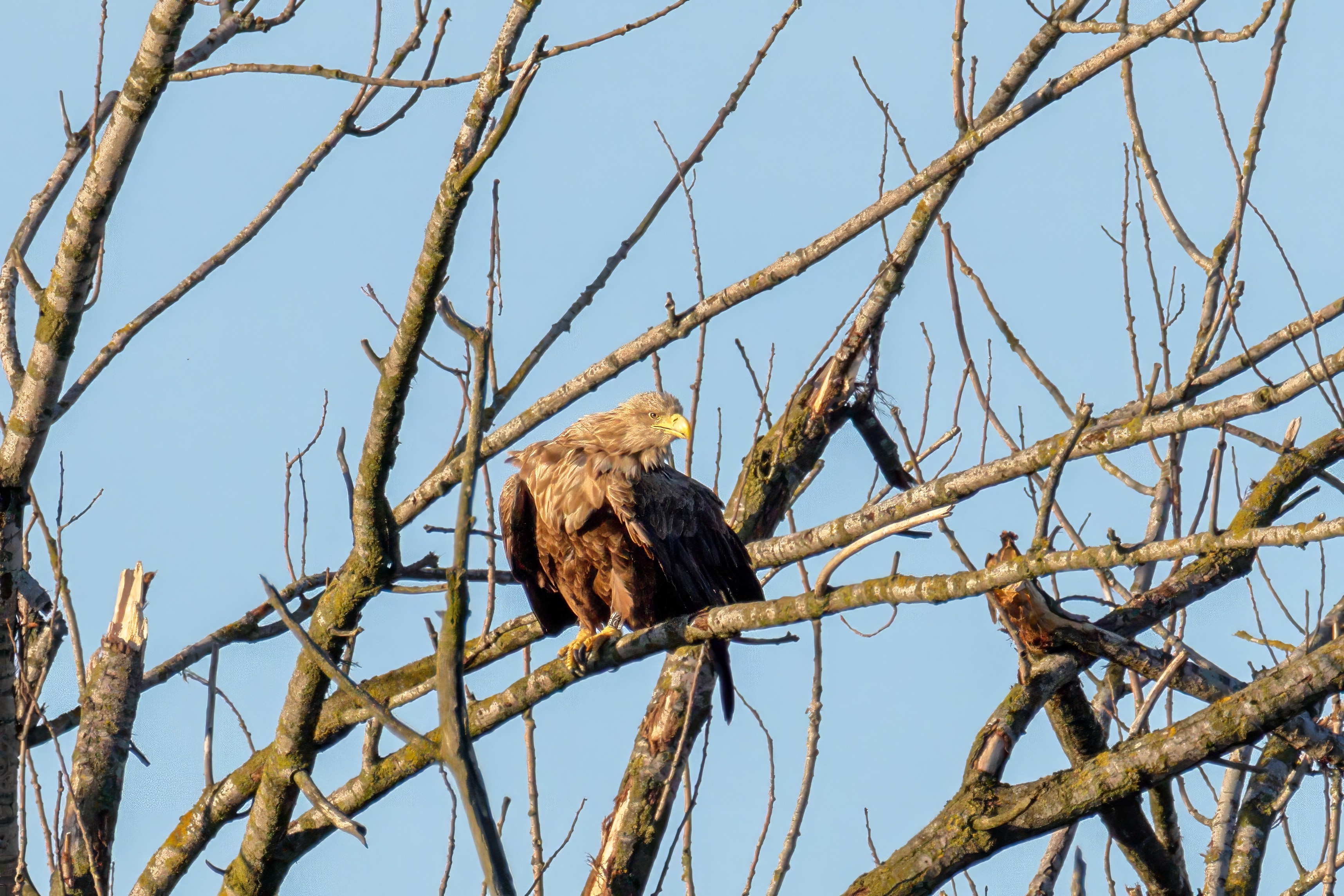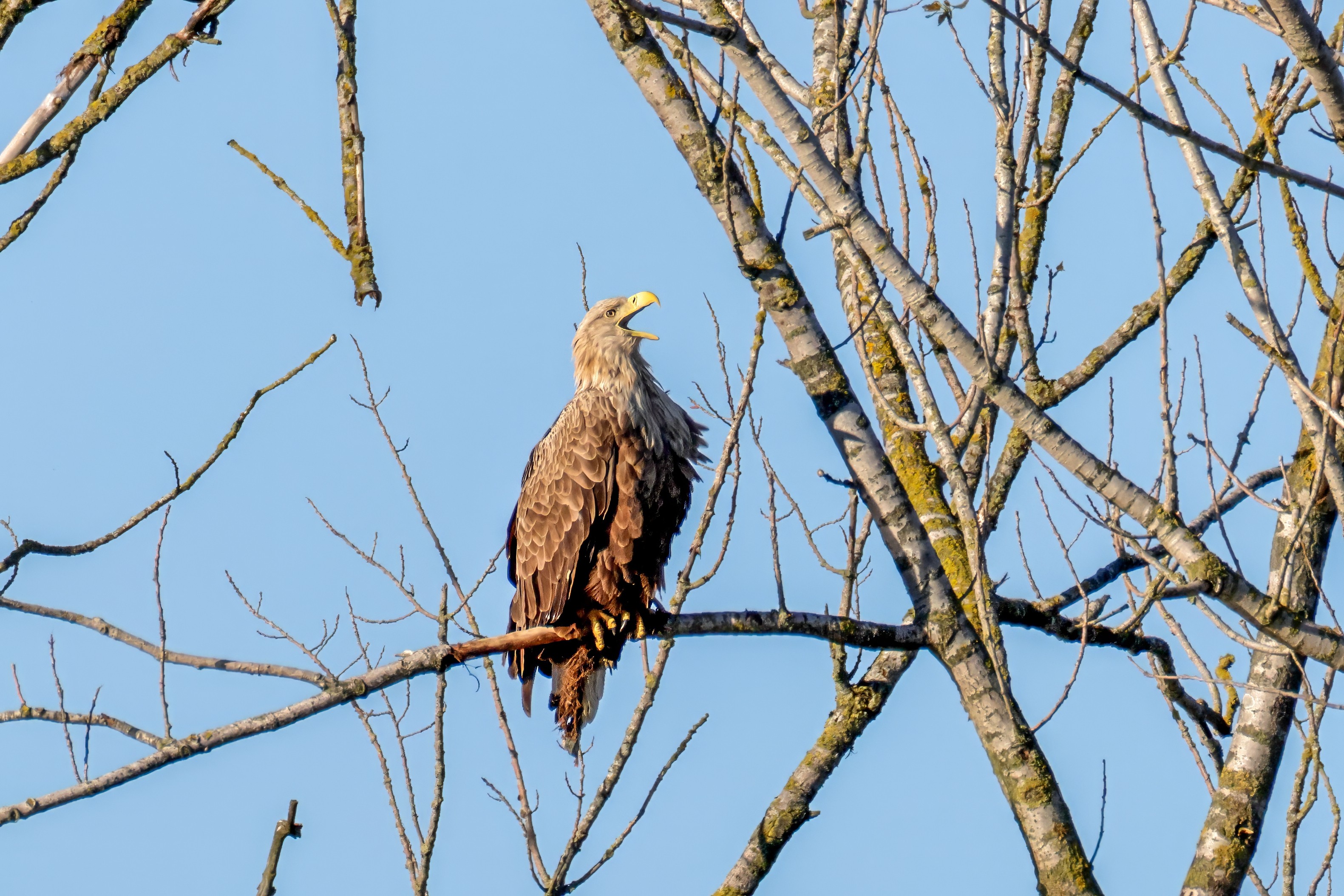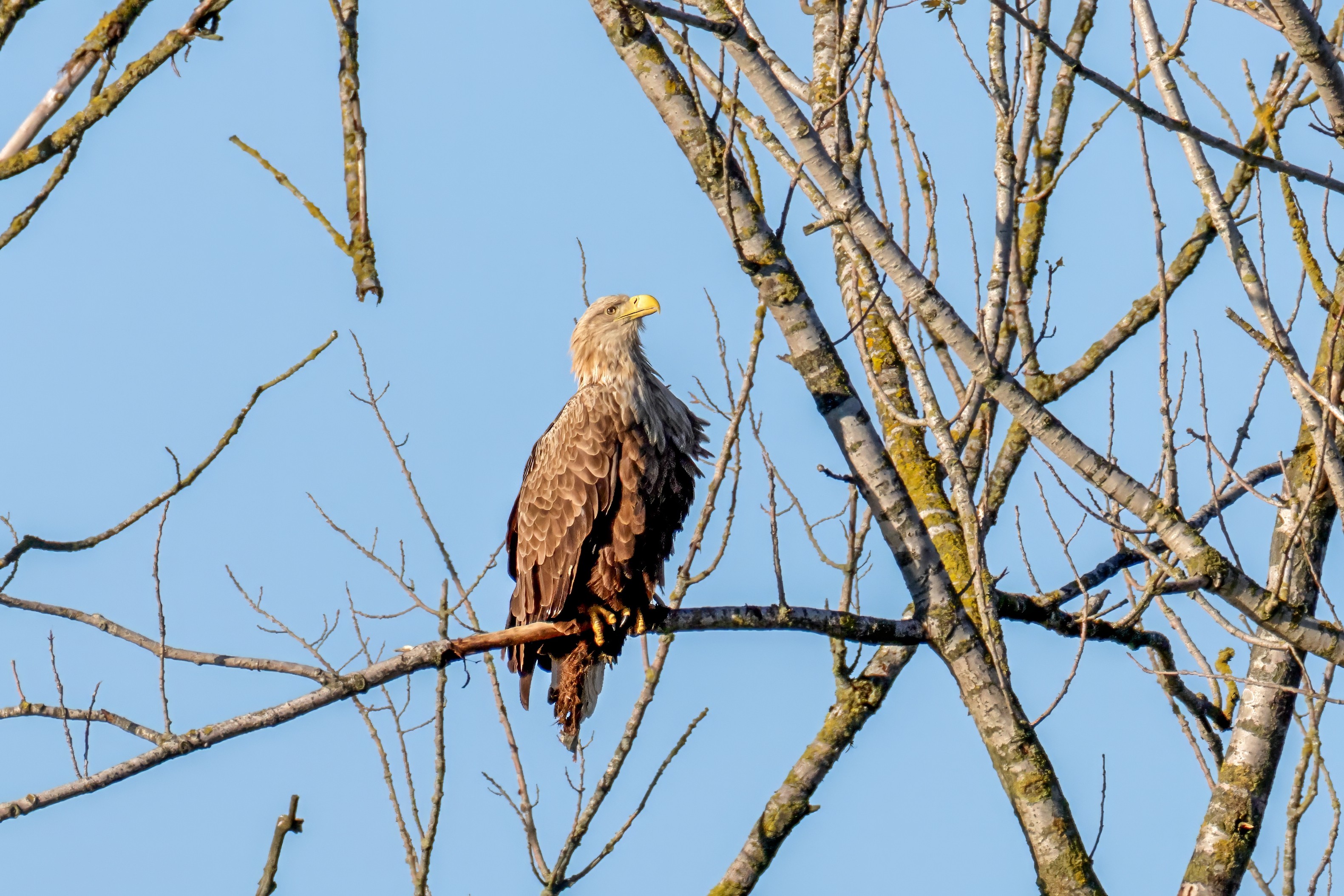 Die kleinen Nestlinge haben sich prächtig entwickelt. Die ständige Anwesenheit der Seeadler im Horst ist nun nicht mehr durchgehend erforderlich. Neben Aufmerksamkeit, Schutz und der Versorgung des Nachwuchses bleibt dem Seeadlerpaar jetzt auch etwas Zeit für sich. Häufig zeigen sie sich gemeinsam in der Nähe des Horstes und lassen dabei ihre enge Verbundenheit und den Stolz als Eltern erkennen.