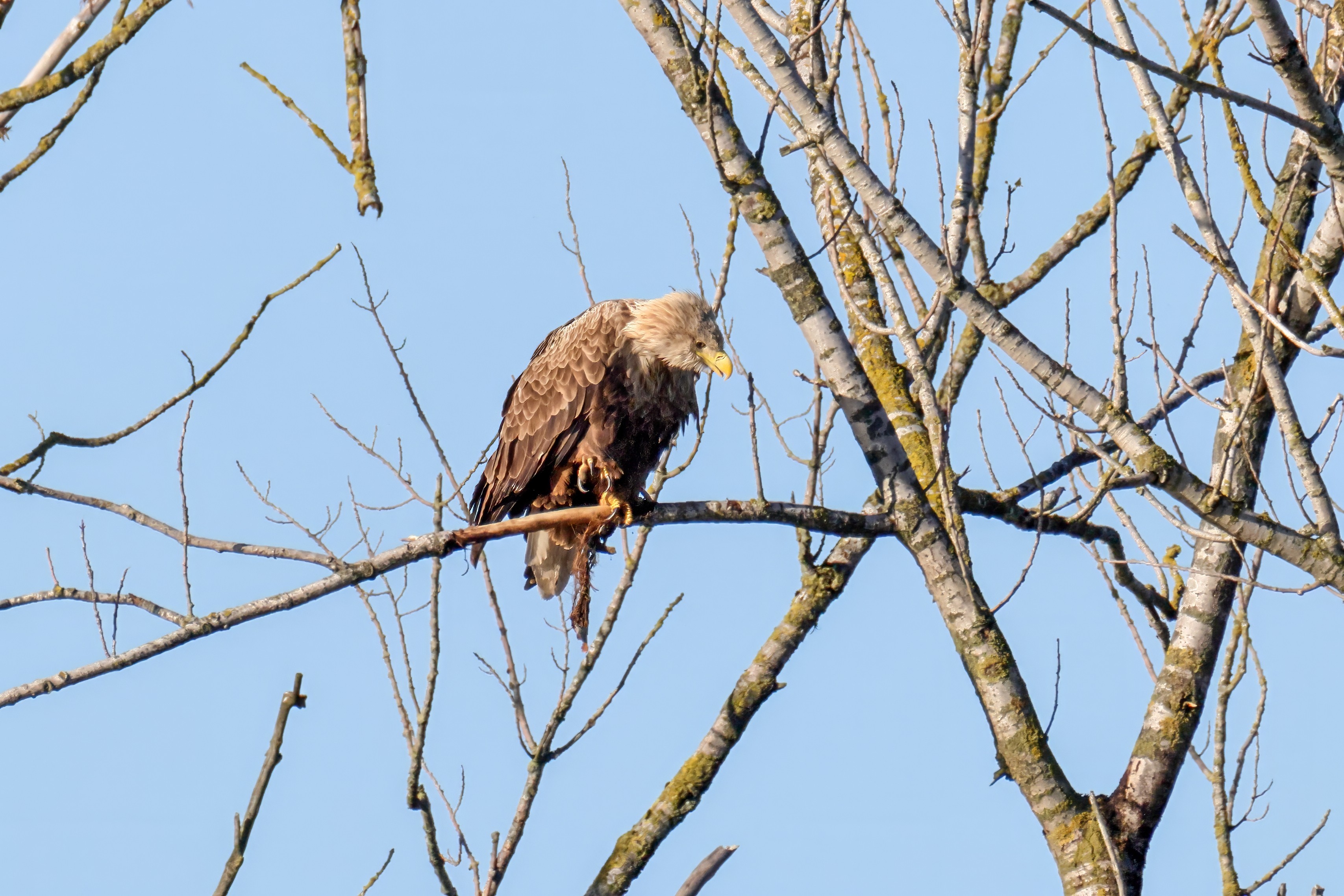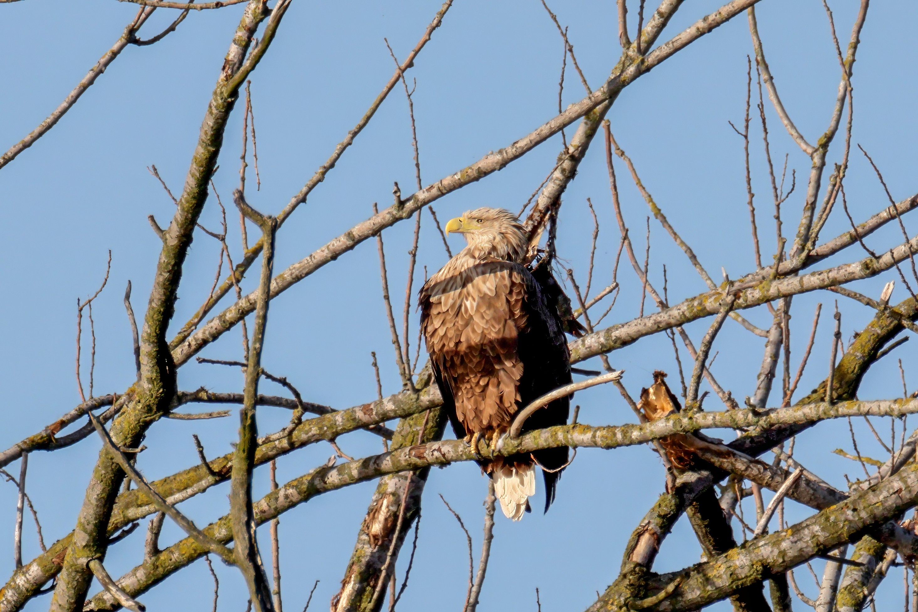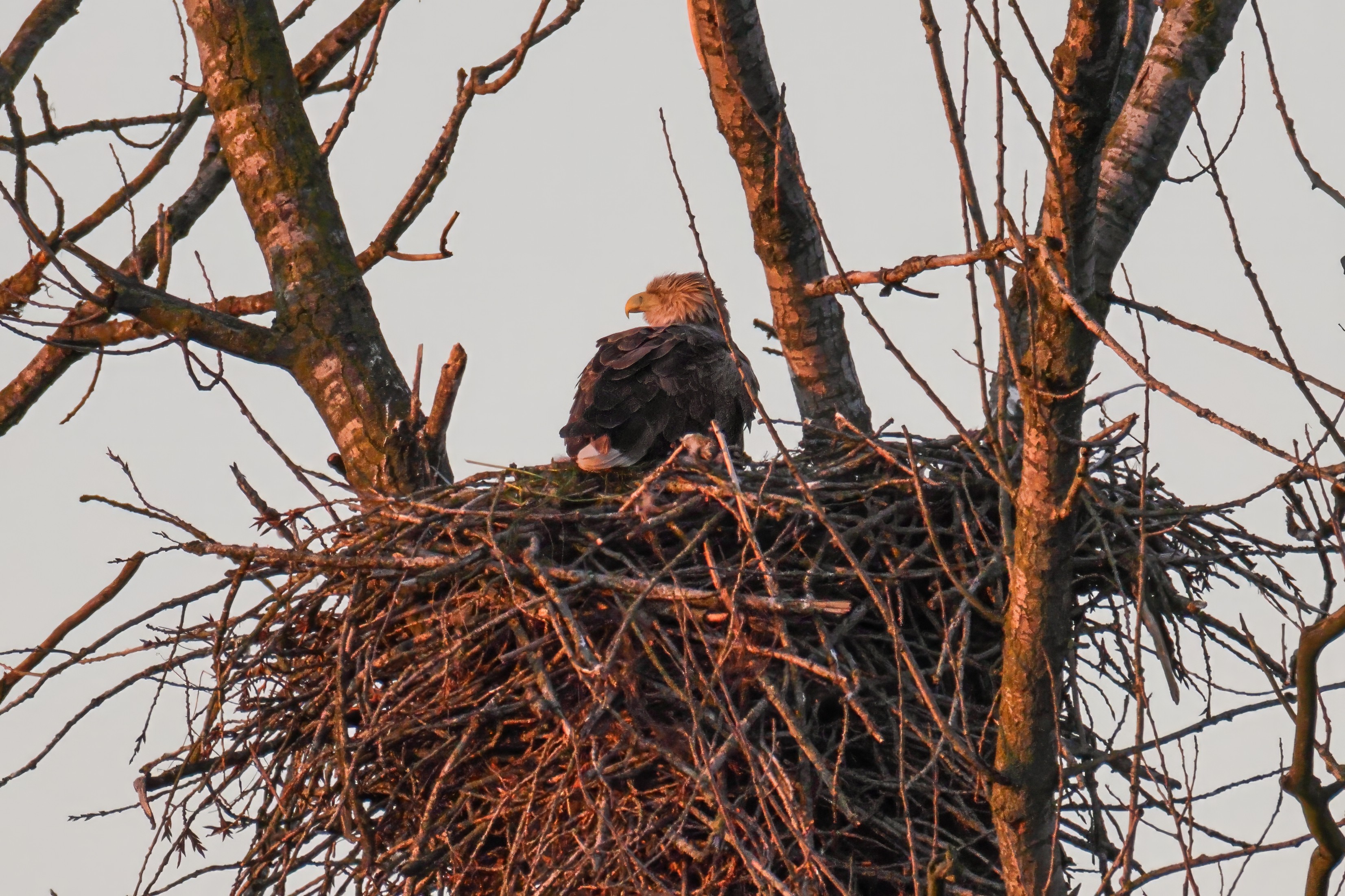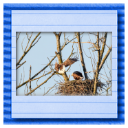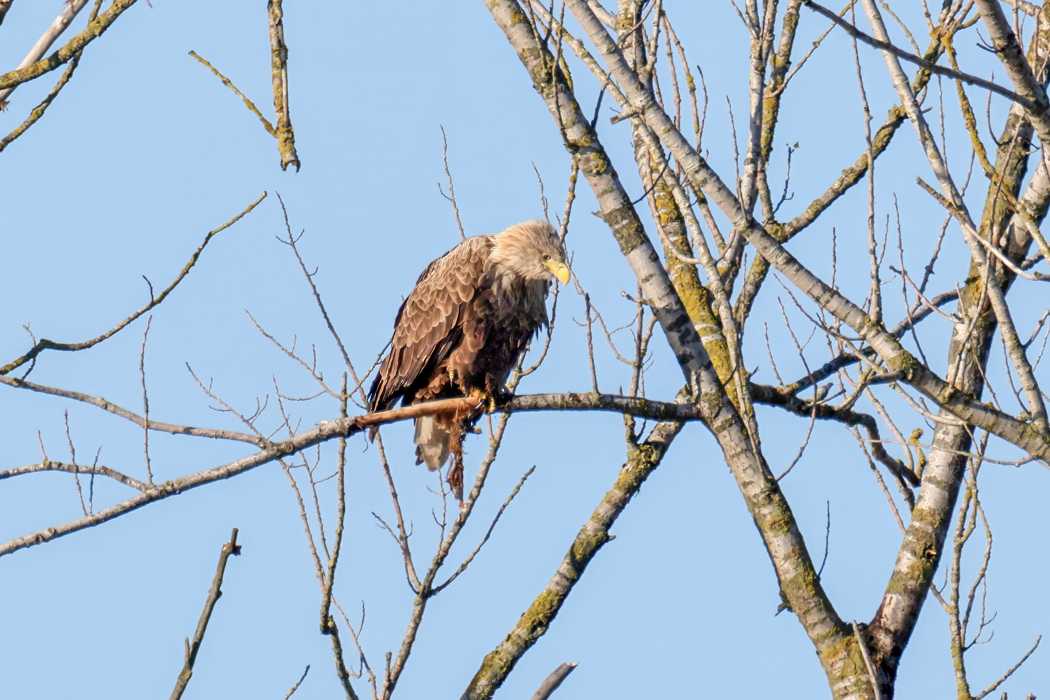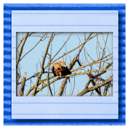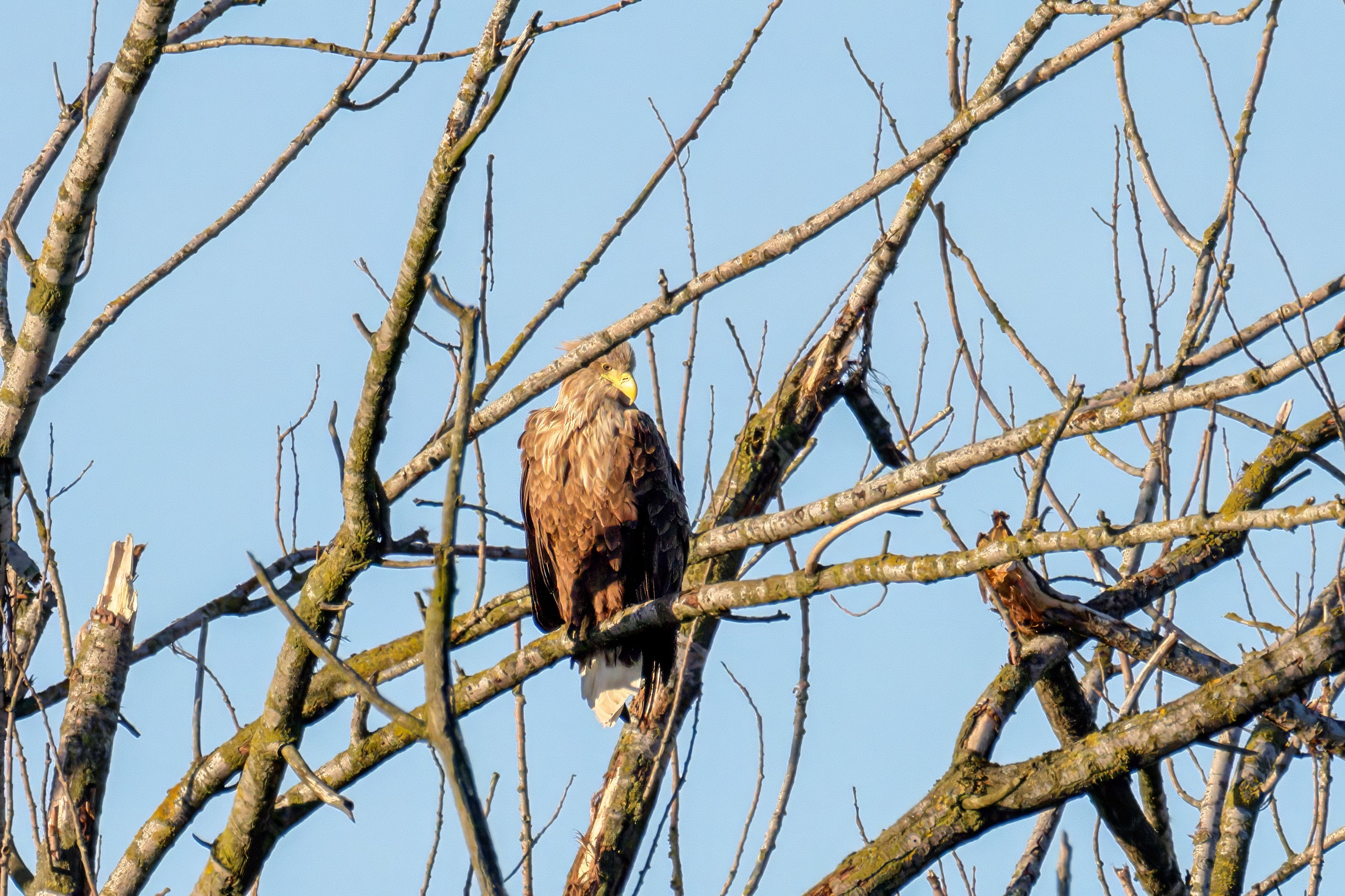 Die kleinen Nestlinge haben sich prächtig entwickelt. Die ständige Anwesenheit der Seeadler im Horst ist nun nicht mehr durchgehend erforderlich. Neben Aufmerksamkeit, Schutz und der Versorgung des Nachwuchses bleibt dem Seeadlerpaar jetzt auch etwas Zeit für sich. Häufig zeigen sie sich gemeinsam in der Nähe des Horstes und lassen dabei ihre enge Verbundenheit und den Stolz als Eltern erkennen.