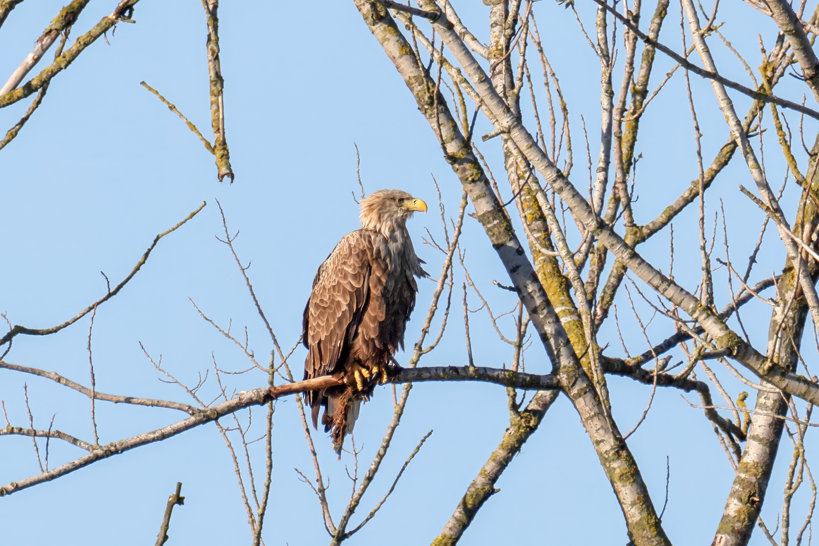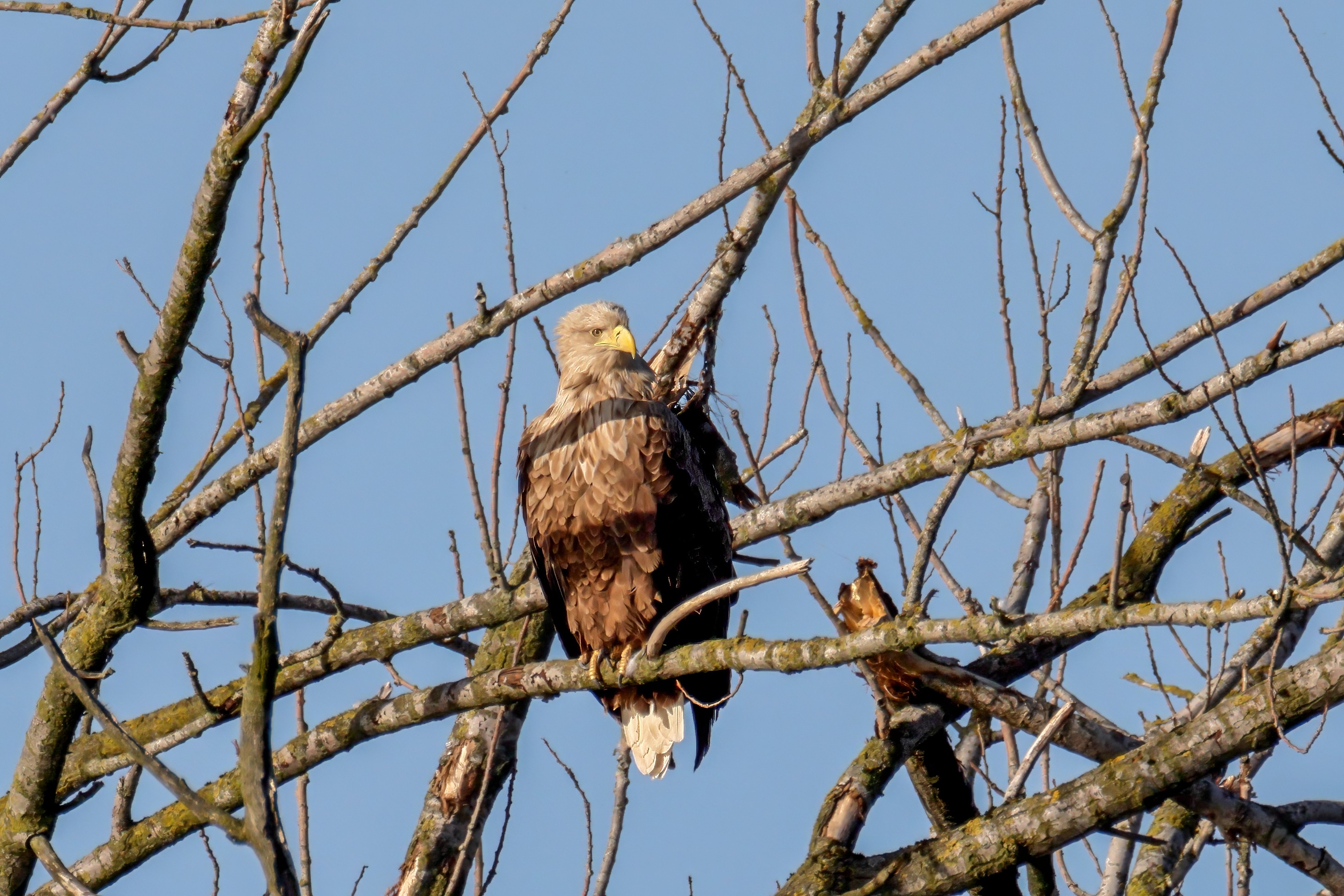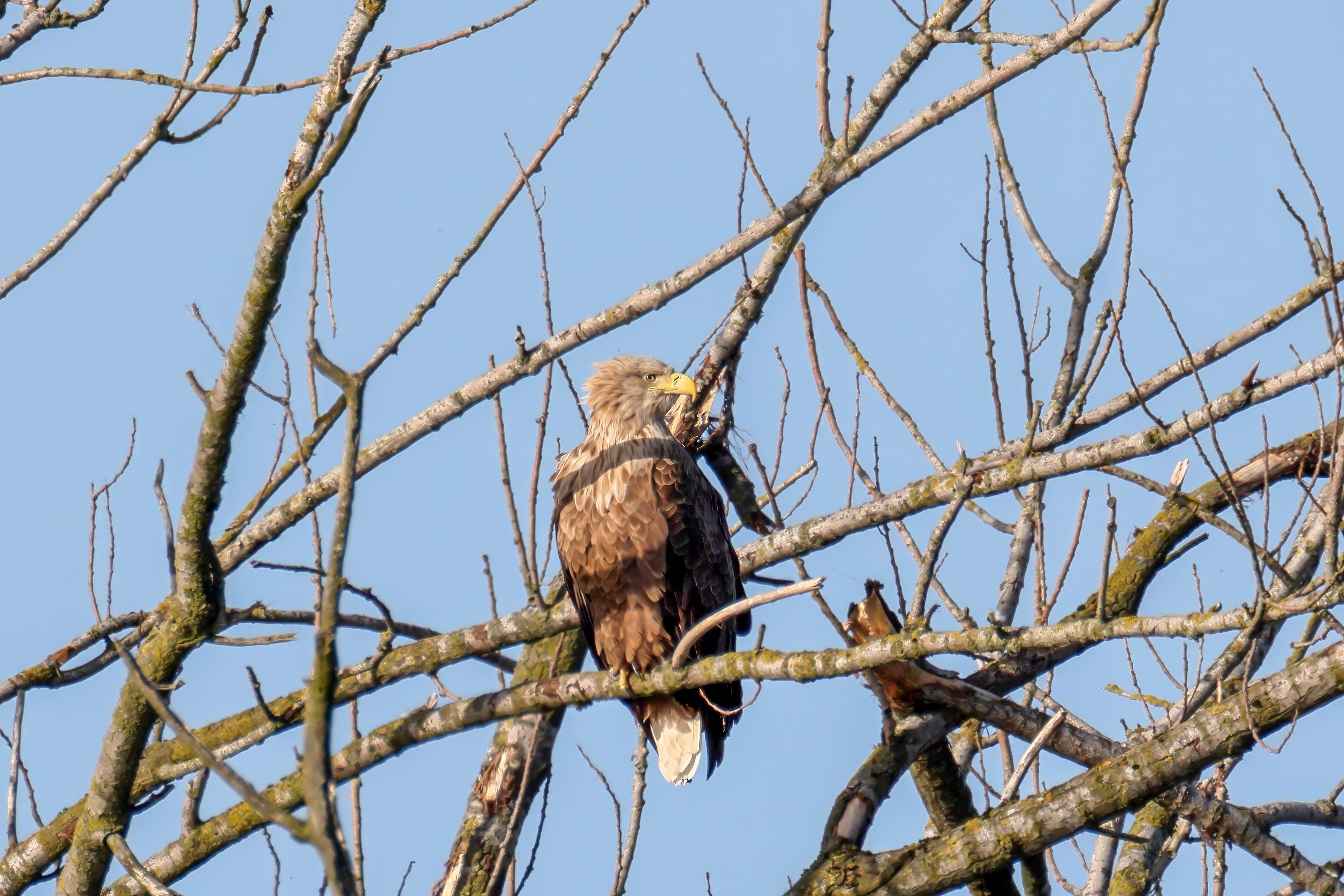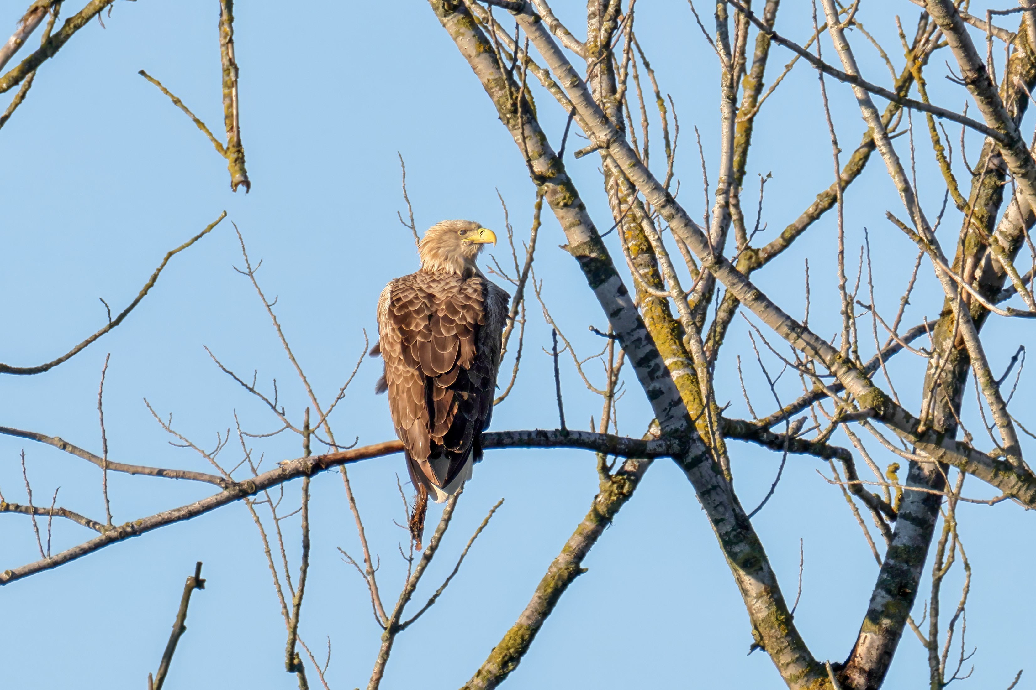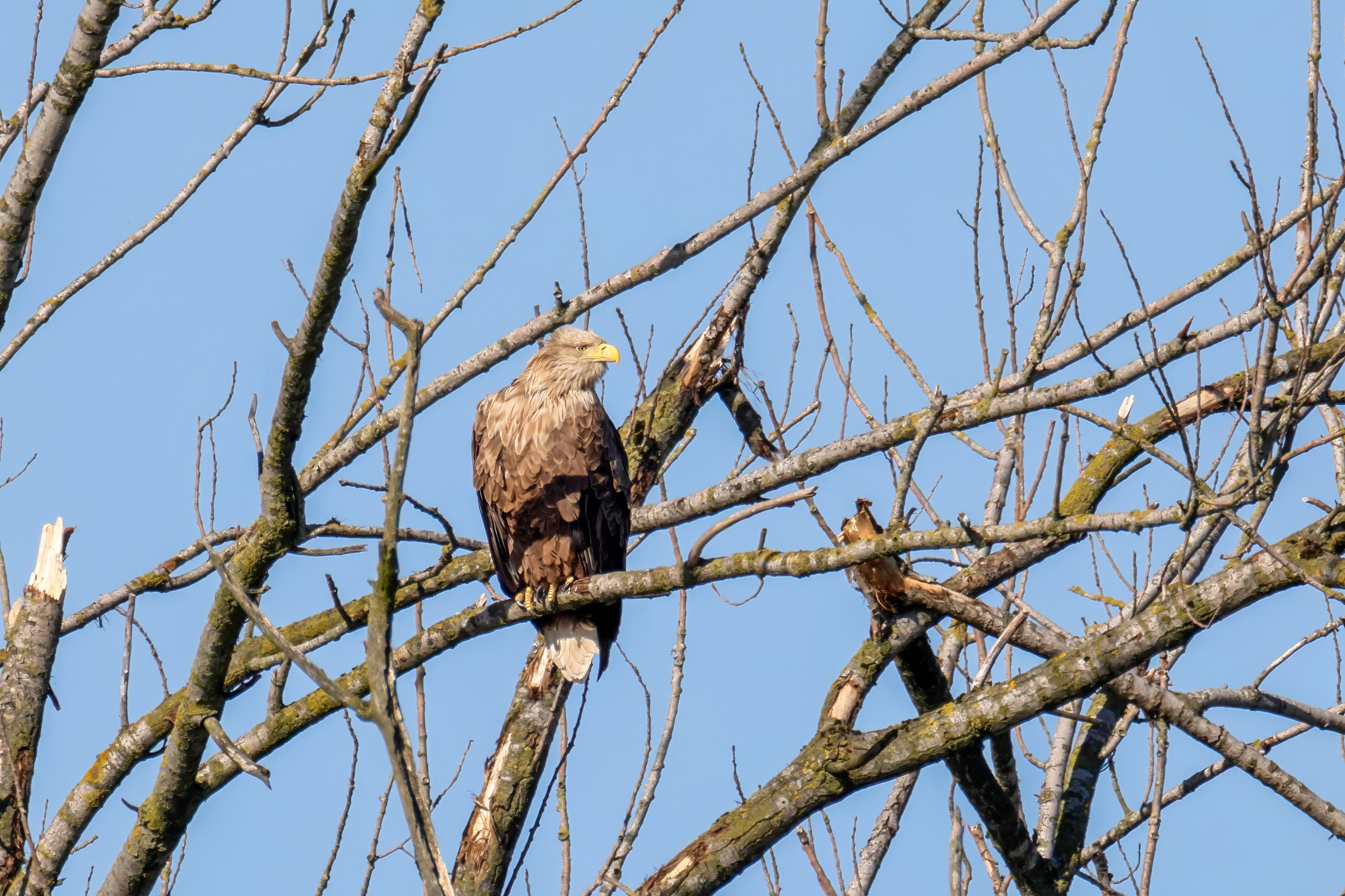 Die kleinen Nestlinge haben sich prächtig entwickelt. Die ständige Anwesenheit der Seeadler im Horst ist nun nicht mehr durchgehend erforderlich. Neben Aufmerksamkeit, Schutz und der Versorgung des Nachwuchses bleibt dem Seeadlerpaar jetzt auch etwas Zeit für sich. Häufig zeigen sie sich gemeinsam in der Nähe des Horstes und lassen dabei ihre enge Verbundenheit und den Stolz als Eltern erkennen.