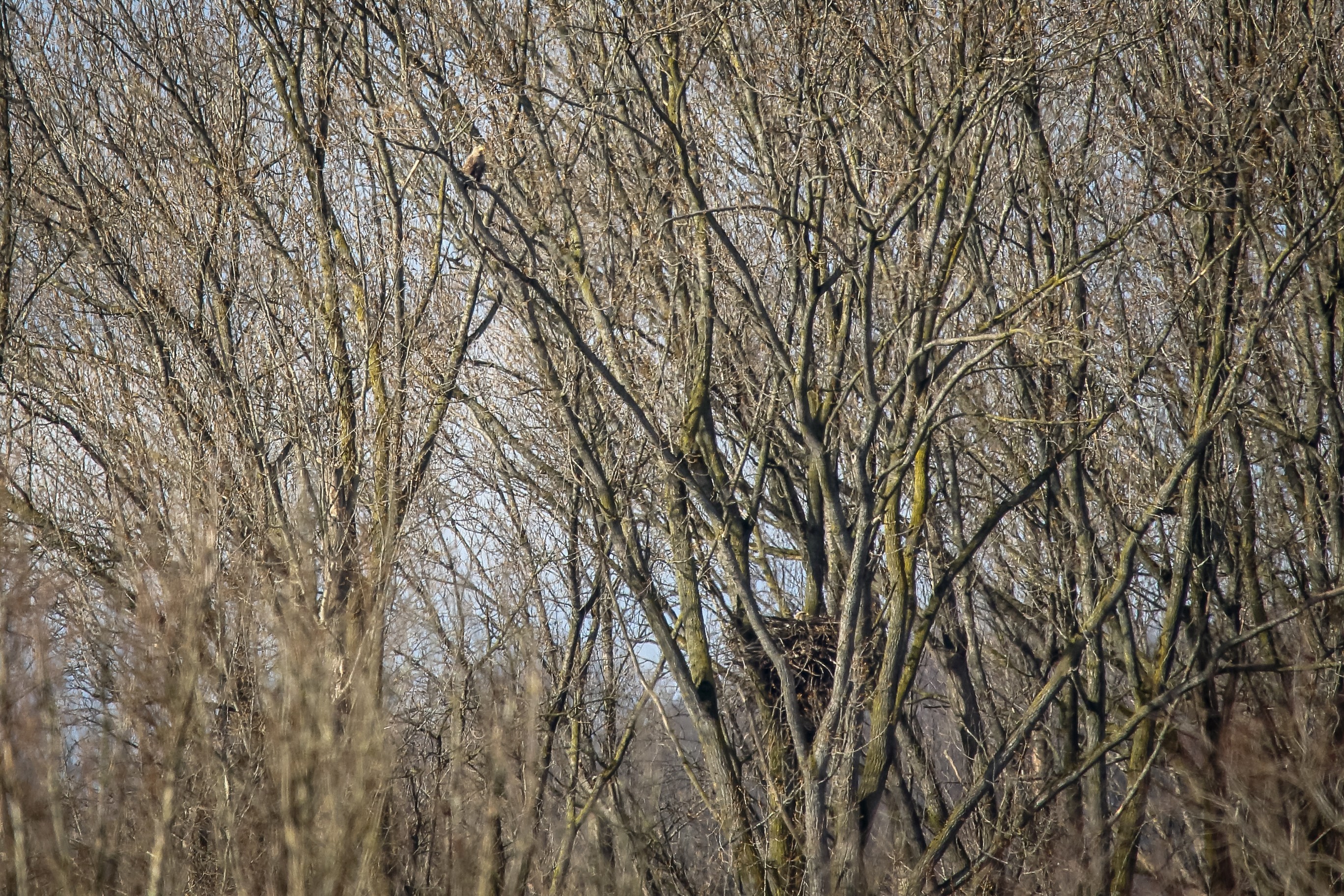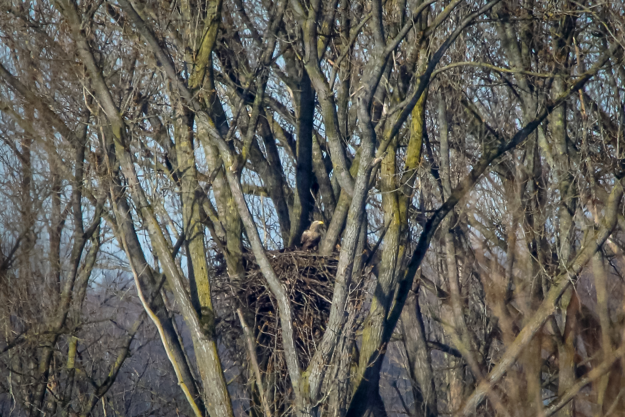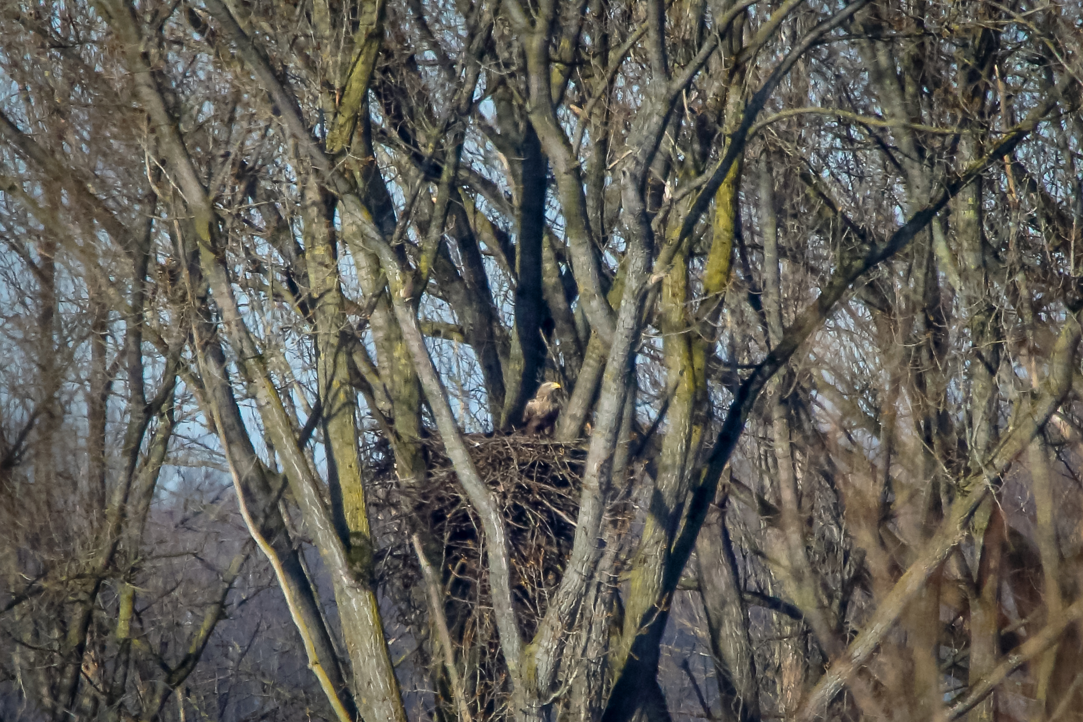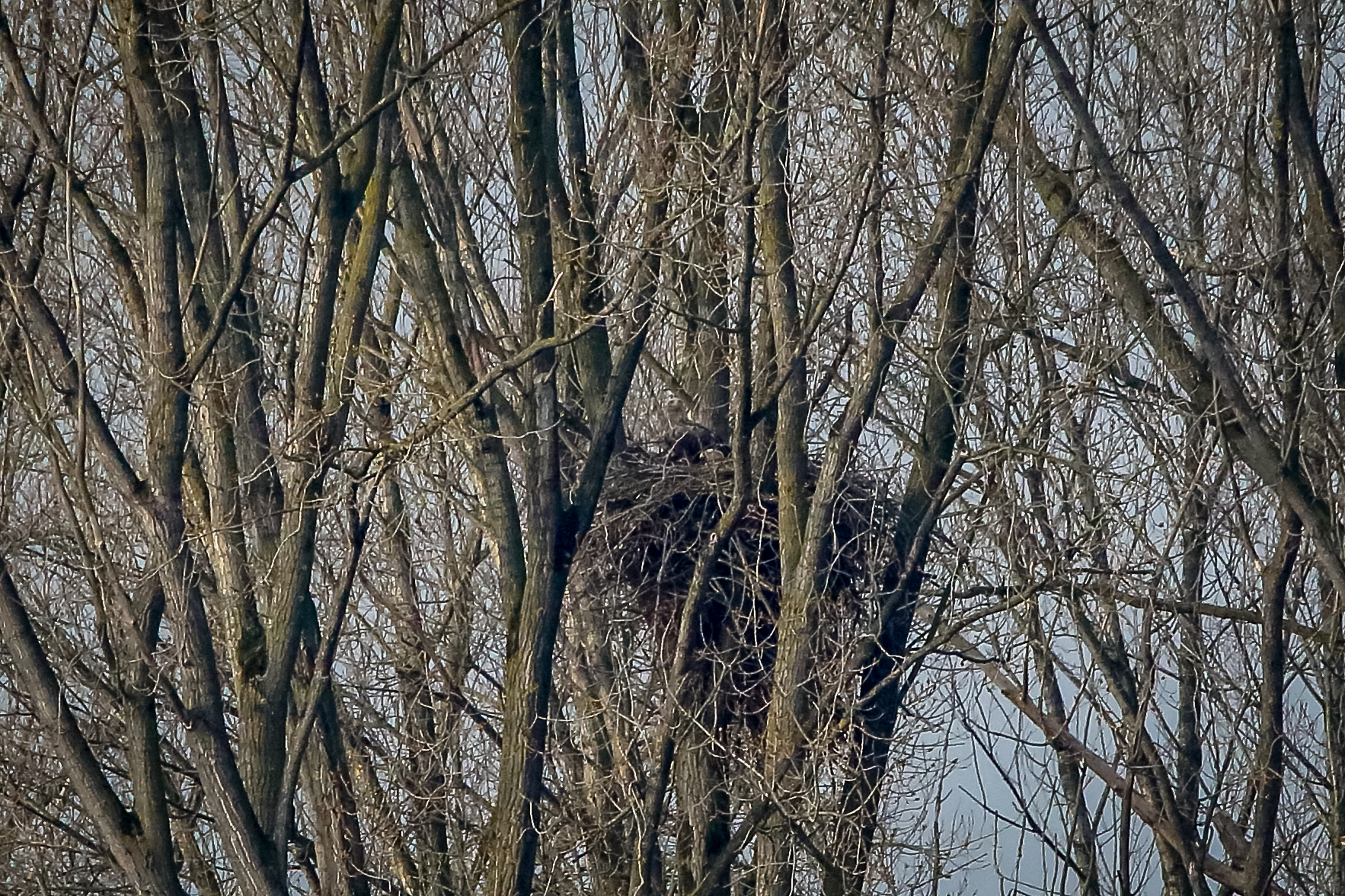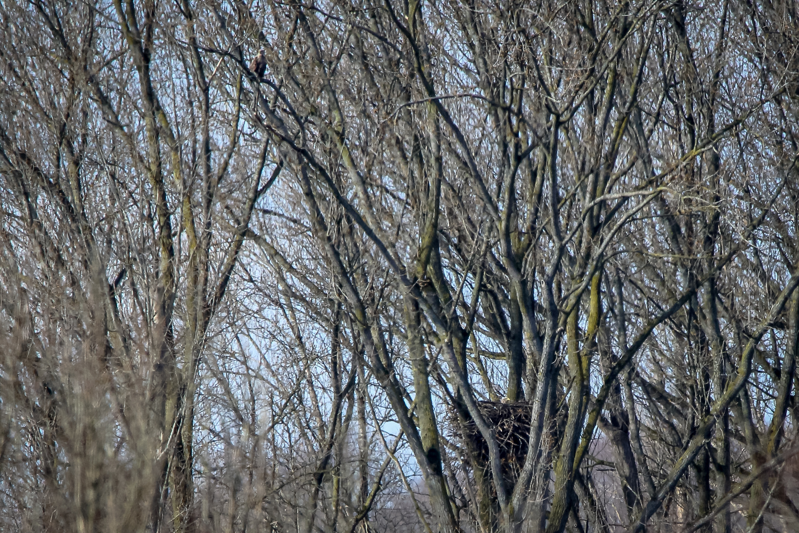 Zwischen dem 03. und 04. März zeigte das Seeadlerweib lange Sitzfolgen im Horst. Vermutlich begann zu diesem Zeitpunkt schon die Eiablage. Nun am 06. März verlässt das Seeadlerweib nicht mehr den Horst und der männliche Seeadler bringt Beute in den Horst. Nach kurzen Beuteflügen des Seeadlermännchens verweilt er ständig in unmittelbarer Nähe des Horstes. Eine freudige Beobachtung, die uns Naturfreunden die Hoffnung auf eine weitere Reproduktion der Seeadler auf der Bislicher Insel schenkt. Somit wird nach dem traurig verlaufenden Jahr 2020 nunmehr ein erlebnisreiches Jahr für die Besucher auf der Bislicher Insel anstehen. In ca. 38 Tagen wird der erste Nachwuchs im Horst schlüpfen und nach weiteren drei Wochen werden die Seeadlerküken, falls Blätter nicht die Sicht versperren, zu sichten sein. Im Alter von ca. 70-75 Tagen werden die Nesthocker sich zu Ästlingen entwickeln und ihre Flugfähigkeit mit ca. 95 Tagen nach dem Schlupf erreichen. Ein spannendes Jahr steht an. Am Vormittag des 06. März beobachtete ich den Anflug eines aus dem zweiten Kalenderjahr stammenden Jungseeadlers, der unbesendert ins Habitat einflog. Seine Höhe war fast unerreichbar für mein Objektiv, aus diesem Grund ließen sich nur Belegaufnahmen fertigen. Wahrscheinlich handelte es sich um einen Jungseeadler des letzten Jahres aus den Niederlanden. Unser Seeadler ließ nicht lange auf sich warten und zeigte dem Jungseeadler unmissverständlich wer der Chef im Habitat ist.
