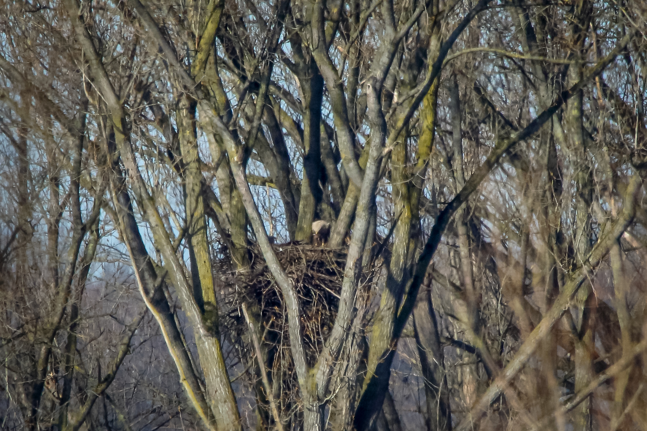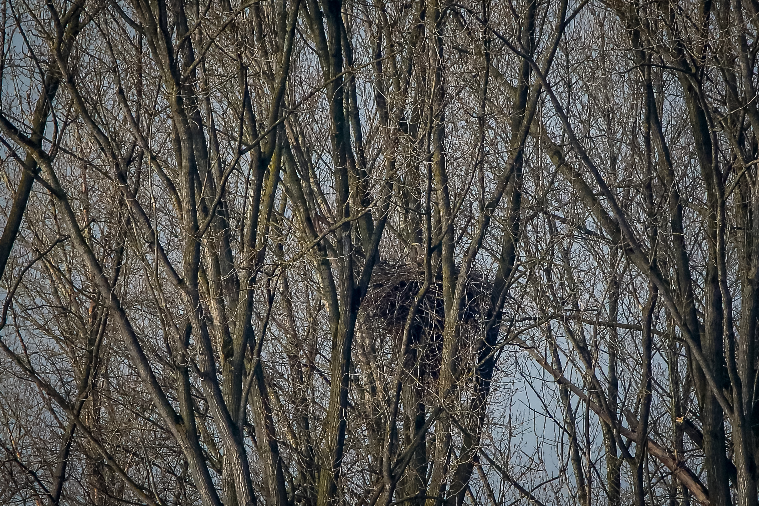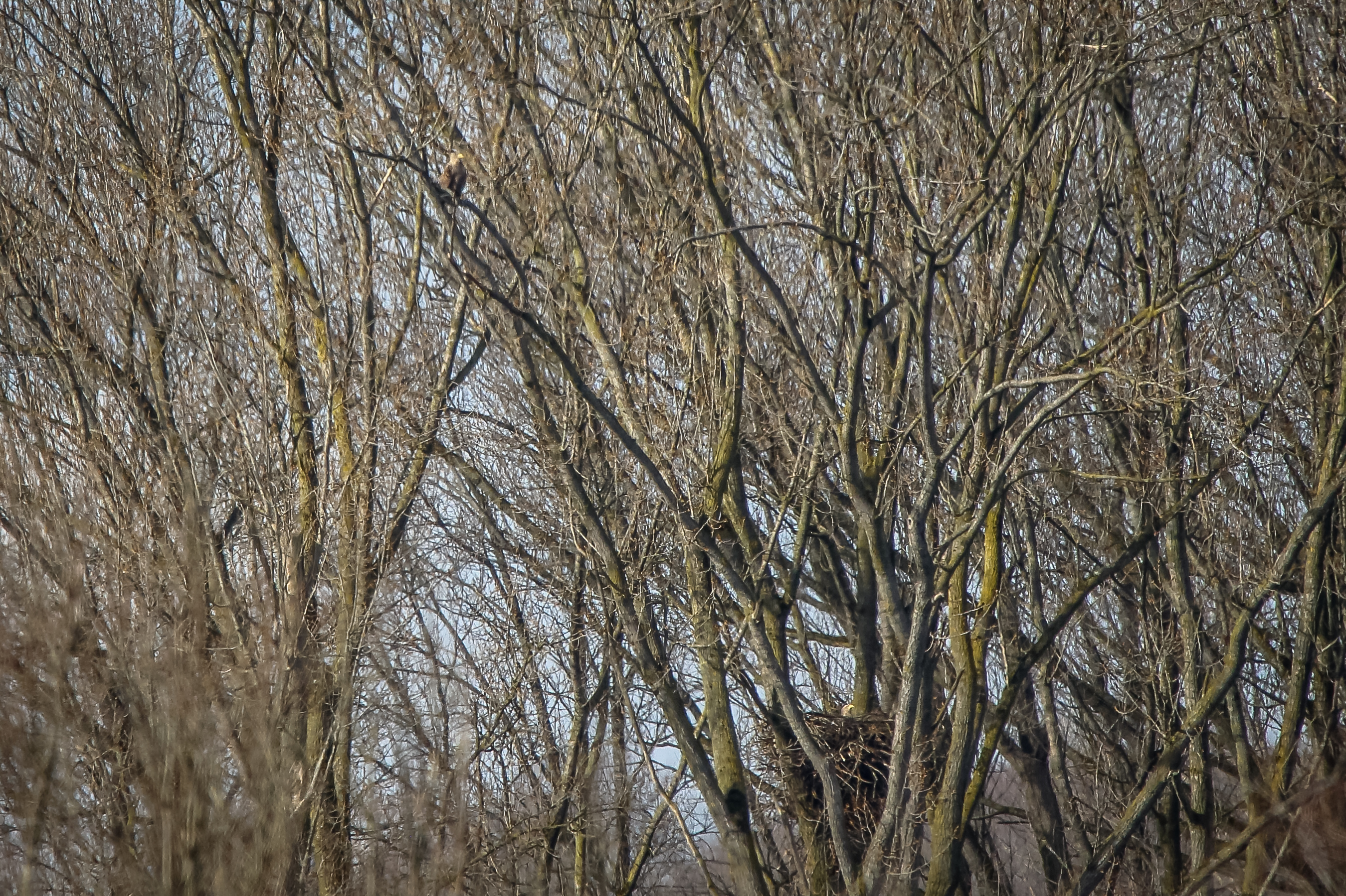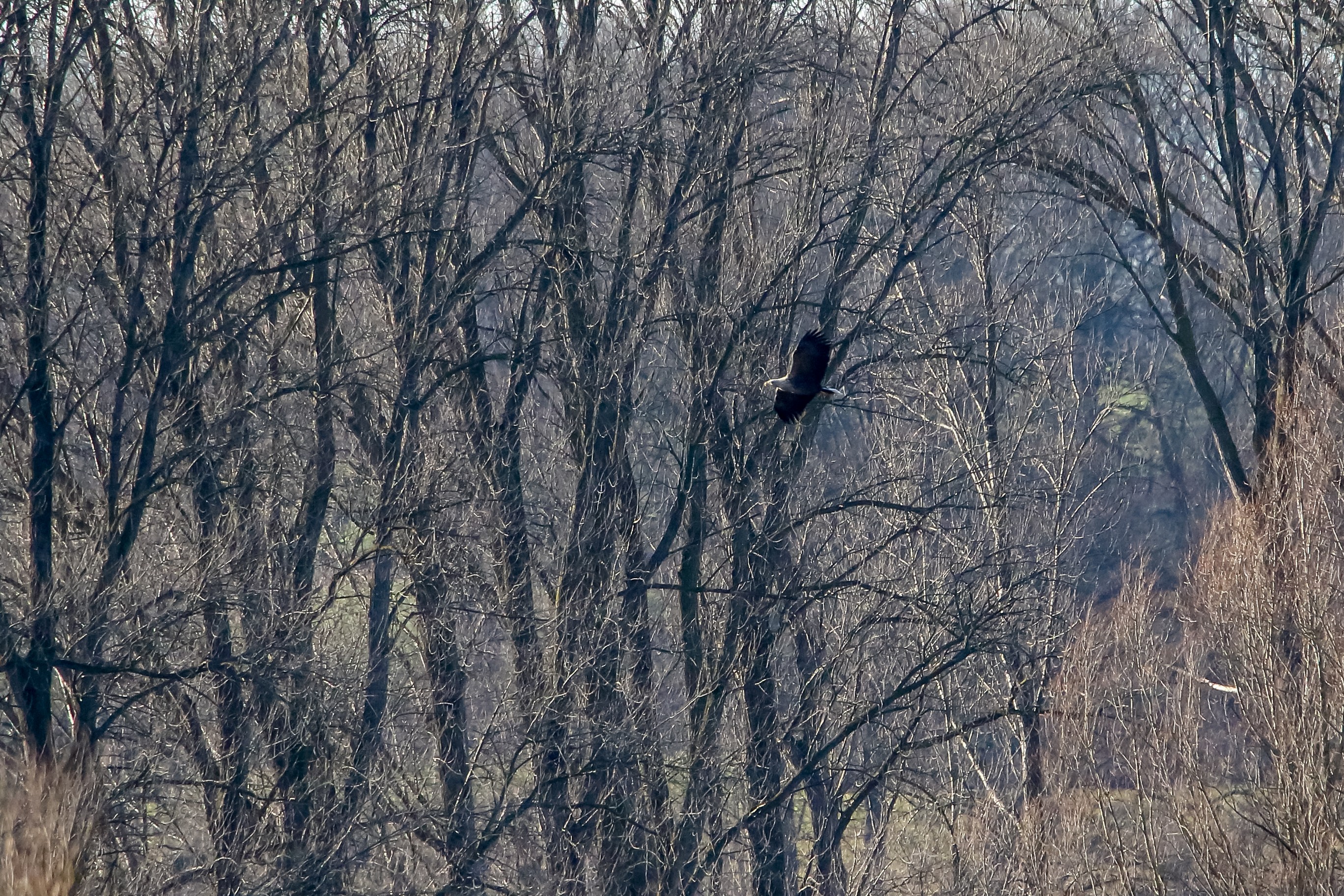 Zwischen dem 03. und 04. März zeigte das Seeadlerweib lange Sitzfolgen im Horst. Vermutlich begann zu diesem Zeitpunkt schon die Eiablage. Nun am 06. März verlässt das Seeadlerweib nicht mehr den Horst und der männliche Seeadler bringt Beute in den Horst. Nach kurzen Beuteflügen des Seeadlermännchens verweilt er ständig in unmittelbarer Nähe des Horstes. Eine freudige Beobachtung, die uns Naturfreunden die Hoffnung auf eine weitere Reproduktion der Seeadler auf der Bislicher Insel schenkt. Somit wird nach dem traurig verlaufenden Jahr 2020 nunmehr ein erlebnisreiches Jahr für die Besucher auf der Bislicher Insel anstehen. In ca. 38 Tagen wird der erste Nachwuchs im Horst schlüpfen und nach weiteren drei Wochen werden die Seeadlerküken, falls Blätter nicht die Sicht versperren, zu sichten sein. Im Alter von ca. 70-75 Tagen werden die Nesthocker sich zu Ästlingen entwickeln und ihre Flugfähigkeit mit ca. 95 Tagen nach dem Schlupf erreichen. Ein spannendes Jahr steht an. Am Vormittag des 06. März beobachtete ich den Anflug eines aus dem zweiten Kalenderjahr stammenden Jungseeadlers, der unbesendert ins Habitat einflog. Seine Höhe war fast unerreichbar für mein Objektiv, aus diesem Grund ließen sich nur Belegaufnahmen fertigen. Wahrscheinlich handelte es sich um einen Jungseeadler des letzten Jahres aus den Niederlanden. Unser Seeadler ließ nicht lange auf sich warten und zeigte dem Jungseeadler unmissverständlich wer der Chef im Habitat ist.