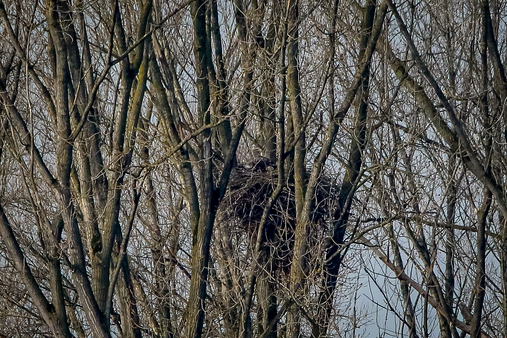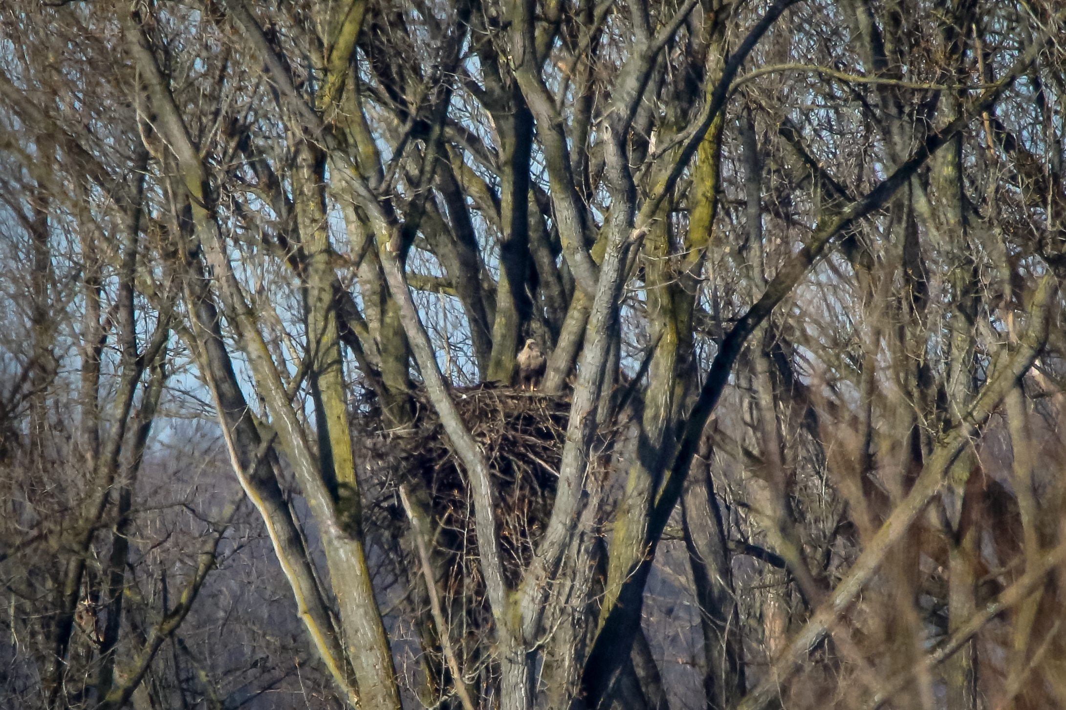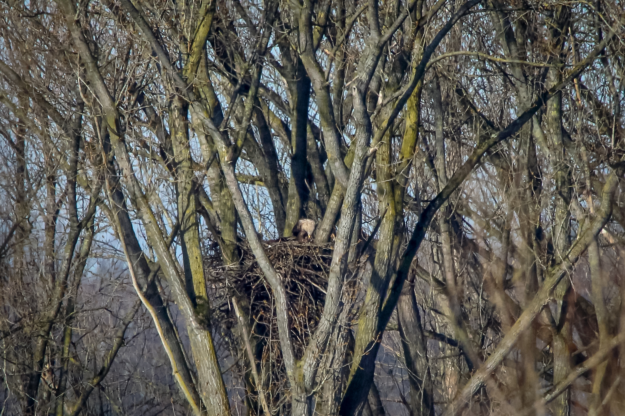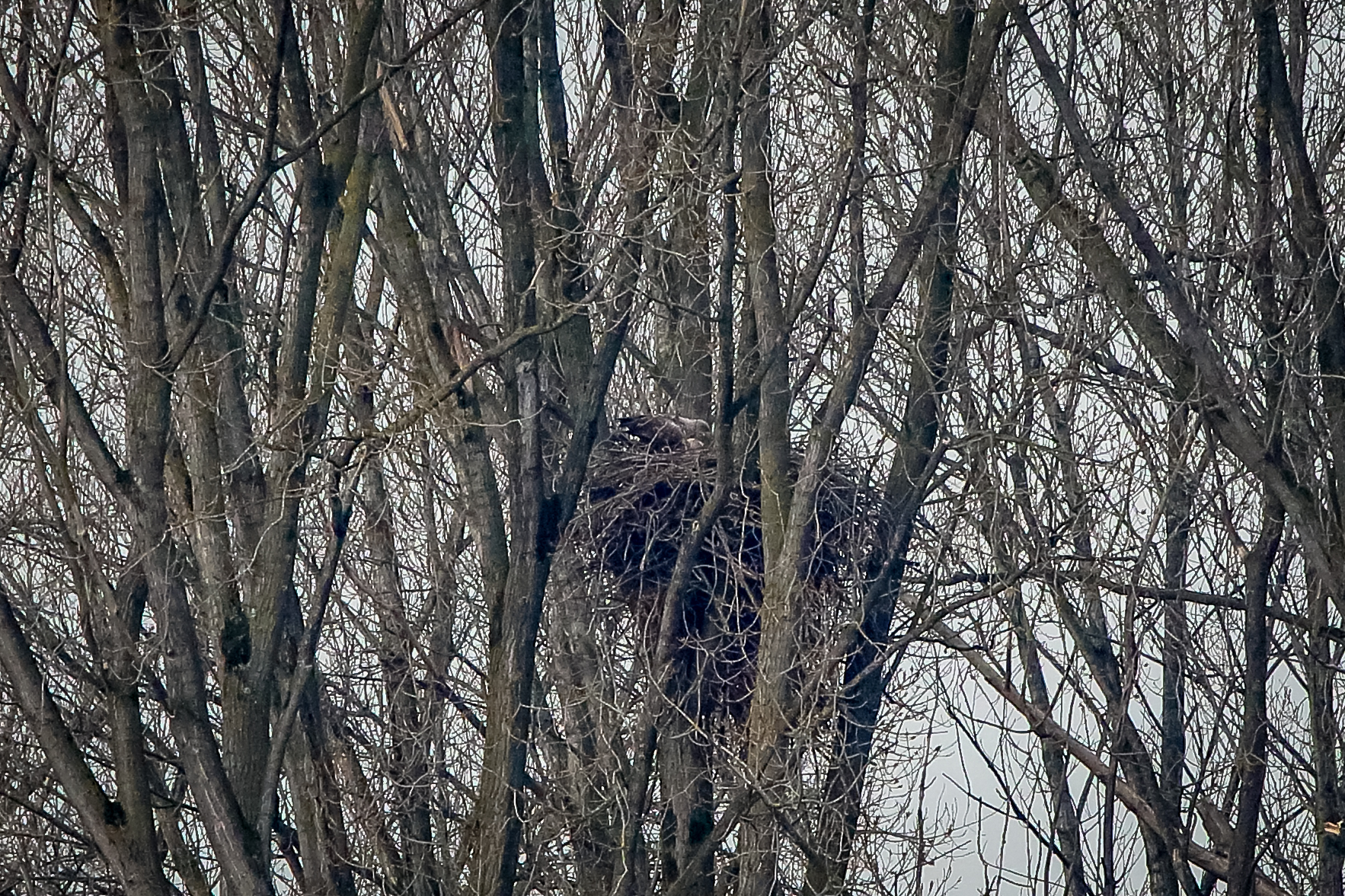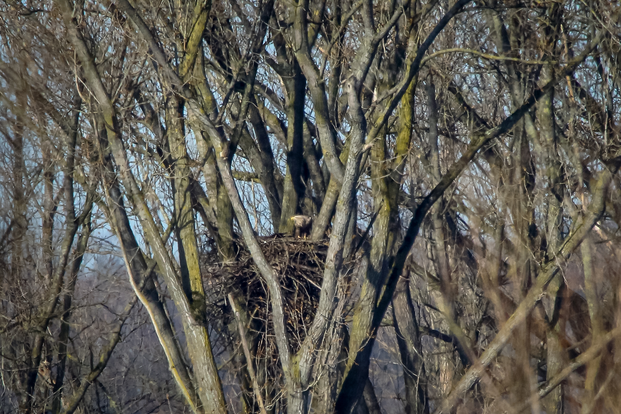 Zwischen dem 03. und 04. März zeigte das Seeadlerweib lange Sitzfolgen im Horst. Vermutlich begann zu diesem Zeitpunkt schon die Eiablage. Nun am 06. März verlässt das Seeadlerweib nicht mehr den Horst und der männliche Seeadler bringt Beute in den Horst. Nach kurzen Beuteflügen des Seeadlermännchens verweilt er ständig in unmittelbarer Nähe des Horstes. Eine freudige Beobachtung, die uns Naturfreunden die Hoffnung auf eine weitere Reproduktion der Seeadler auf der Bislicher Insel schenkt. Somit wird nach dem traurig verlaufenden Jahr 2020 nunmehr ein erlebnisreiches Jahr für die Besucher auf der Bislicher Insel anstehen. In ca. 38 Tagen wird der erste Nachwuchs im Horst schlüpfen und nach weiteren drei Wochen werden die Seeadlerküken, falls Blätter nicht die Sicht versperren, zu sichten sein. Im Alter von ca. 70-75 Tagen werden die Nesthocker sich zu Ästlingen entwickeln und ihre Flugfähigkeit mit ca. 95 Tagen nach dem Schlupf erreichen. Ein spannendes Jahr steht an. Am Vormittag des 06. März beobachtete ich den Anflug eines aus dem zweiten Kalenderjahr stammenden Jungseeadlers, der unbesendert ins Habitat einflog. Seine Höhe war fast unerreichbar für mein Objektiv, aus diesem Grund ließen sich nur Belegaufnahmen fertigen. Wahrscheinlich handelte es sich um einen Jungseeadler des letzten Jahres aus den Niederlanden. Unser Seeadler ließ nicht lange auf sich warten und zeigte dem Jungseeadler unmissverständlich wer der Chef im Habitat ist.