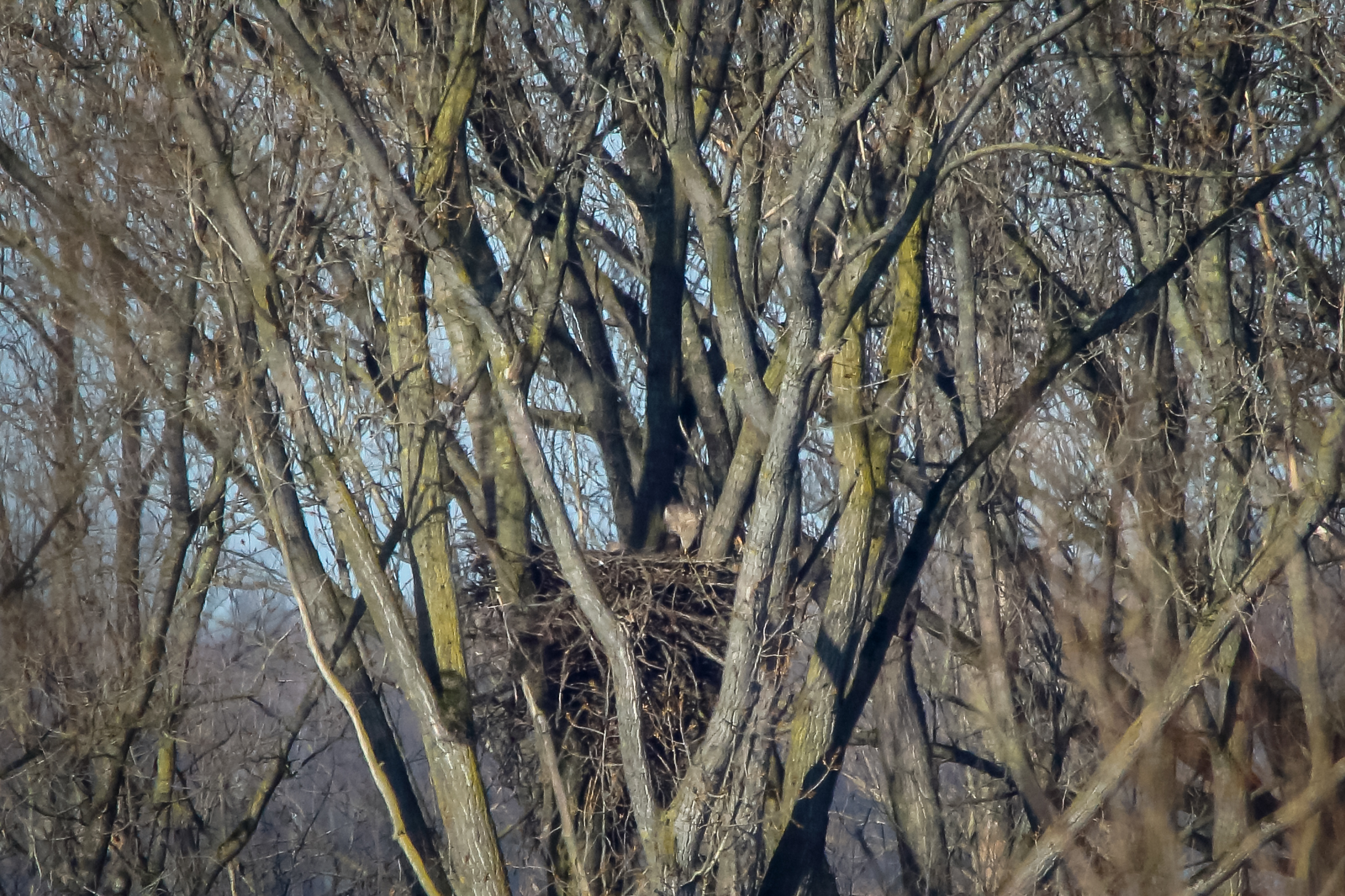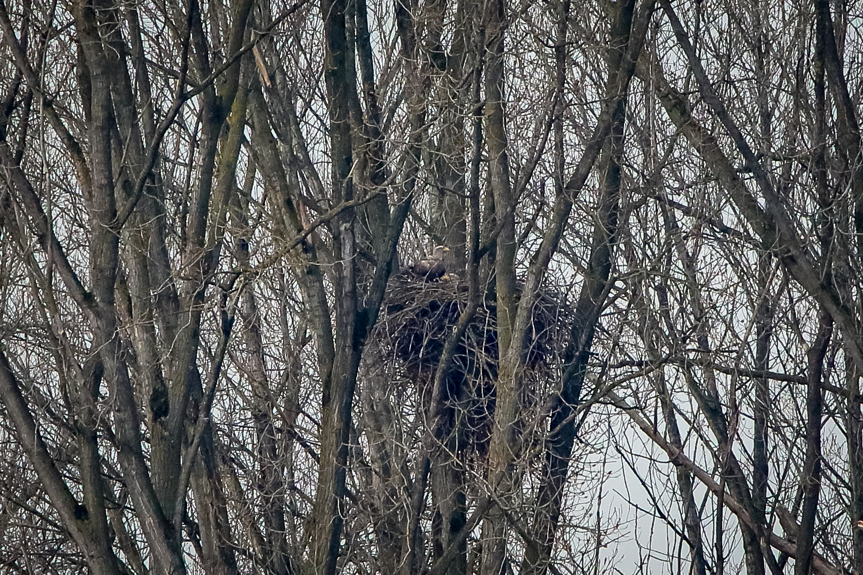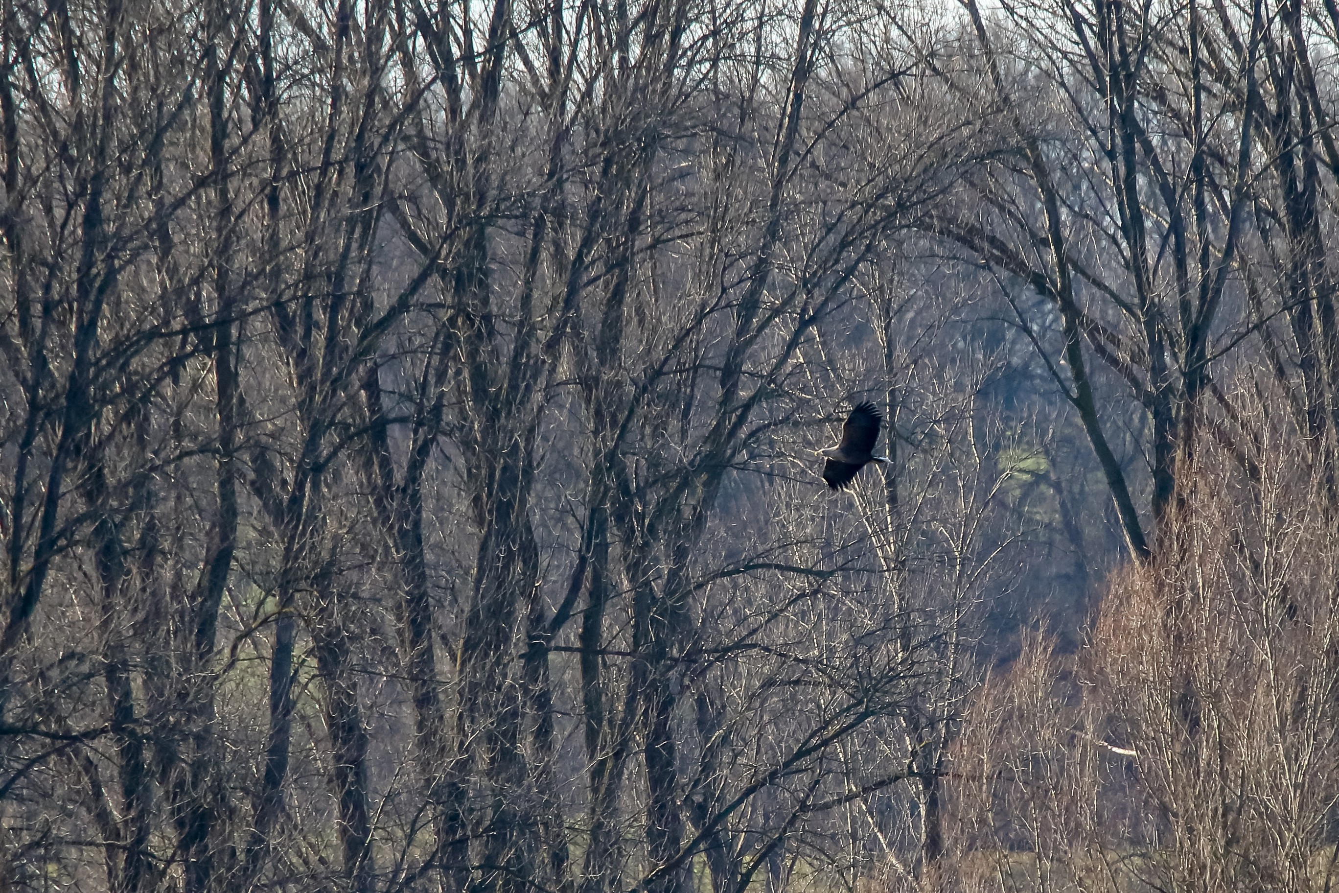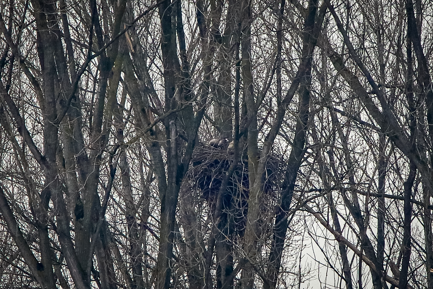 Zwischen dem 03. und 04. März zeigte das Seeadlerweib lange Sitzfolgen im Horst. Vermutlich begann zu diesem Zeitpunkt schon die Eiablage. Nun am 06. März verlässt das Seeadlerweib nicht mehr den Horst und der männliche Seeadler bringt Beute in den Horst. Nach kurzen Beuteflügen des Seeadlermännchens verweilt er ständig in unmittelbarer Nähe des Horstes. Eine freudige Beobachtung, die uns Naturfreunden die Hoffnung auf eine weitere Reproduktion der Seeadler auf der Bislicher Insel schenkt. Somit wird nach dem traurig verlaufenden Jahr 2020 nunmehr ein erlebnisreiches Jahr für die Besucher auf der Bislicher Insel anstehen. In ca. 38 Tagen wird der erste Nachwuchs im Horst schlüpfen und nach weiteren drei Wochen werden die Seeadlerküken, falls Blätter nicht die Sicht versperren, zu sichten sein. Im Alter von ca. 70-75 Tagen werden die Nesthocker sich zu Ästlingen entwickeln und ihre Flugfähigkeit mit ca. 95 Tagen nach dem Schlupf erreichen. Ein spannendes Jahr steht an. Am Vormittag des 06. März beobachtete ich den Anflug eines aus dem zweiten Kalenderjahr stammenden Jungseeadlers, der unbesendert ins Habitat einflog. Seine Höhe war fast unerreichbar für mein Objektiv, aus diesem Grund ließen sich nur Belegaufnahmen fertigen. Wahrscheinlich handelte es sich um einen Jungseeadler des letzten Jahres aus den Niederlanden. Unser Seeadler ließ nicht lange auf sich warten und zeigte dem Jungseeadler unmissverständlich wer der Chef im Habitat ist.