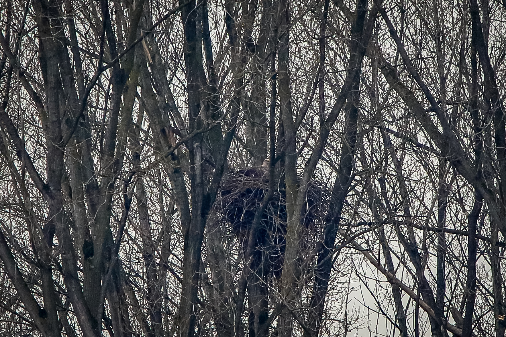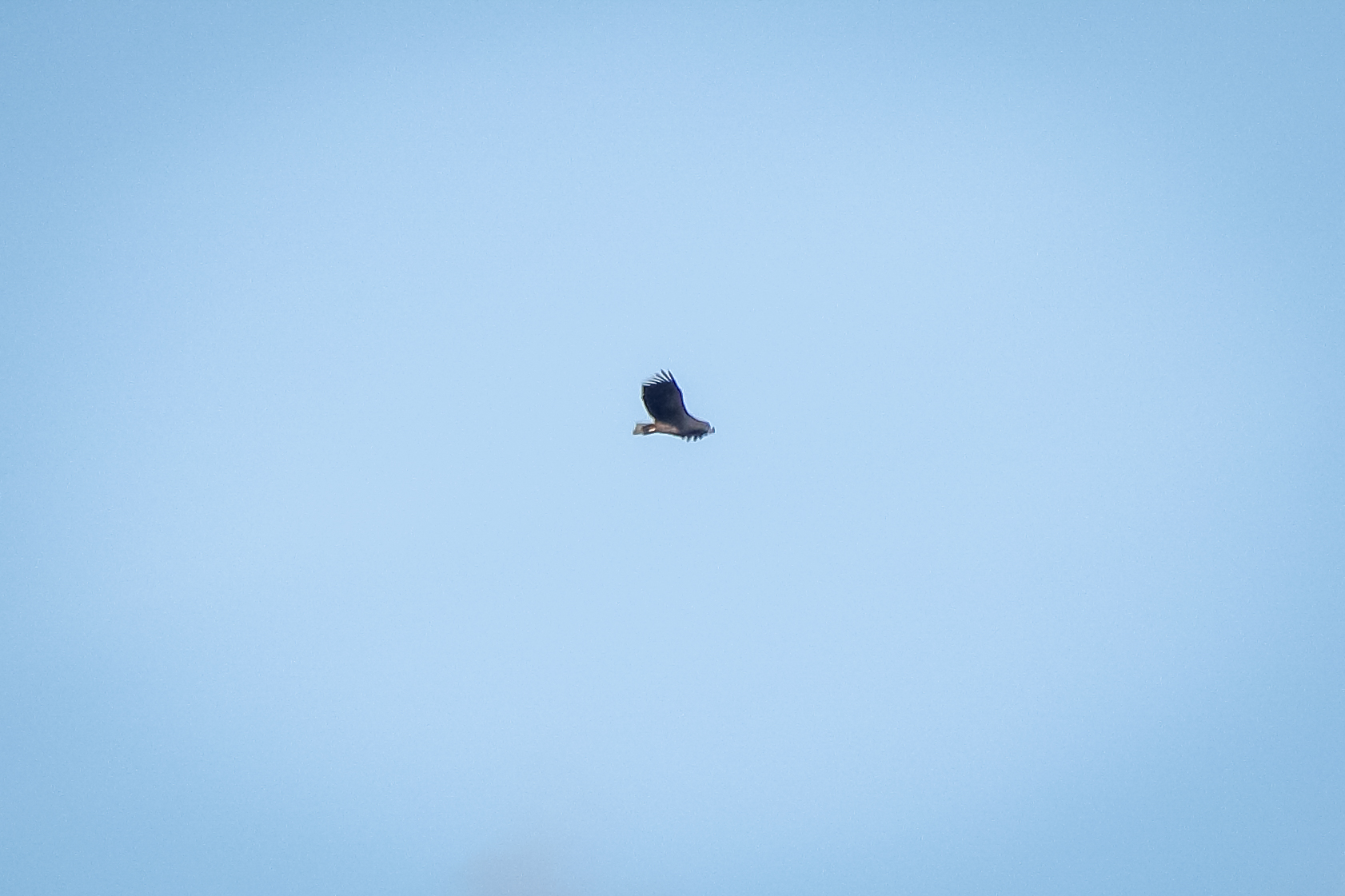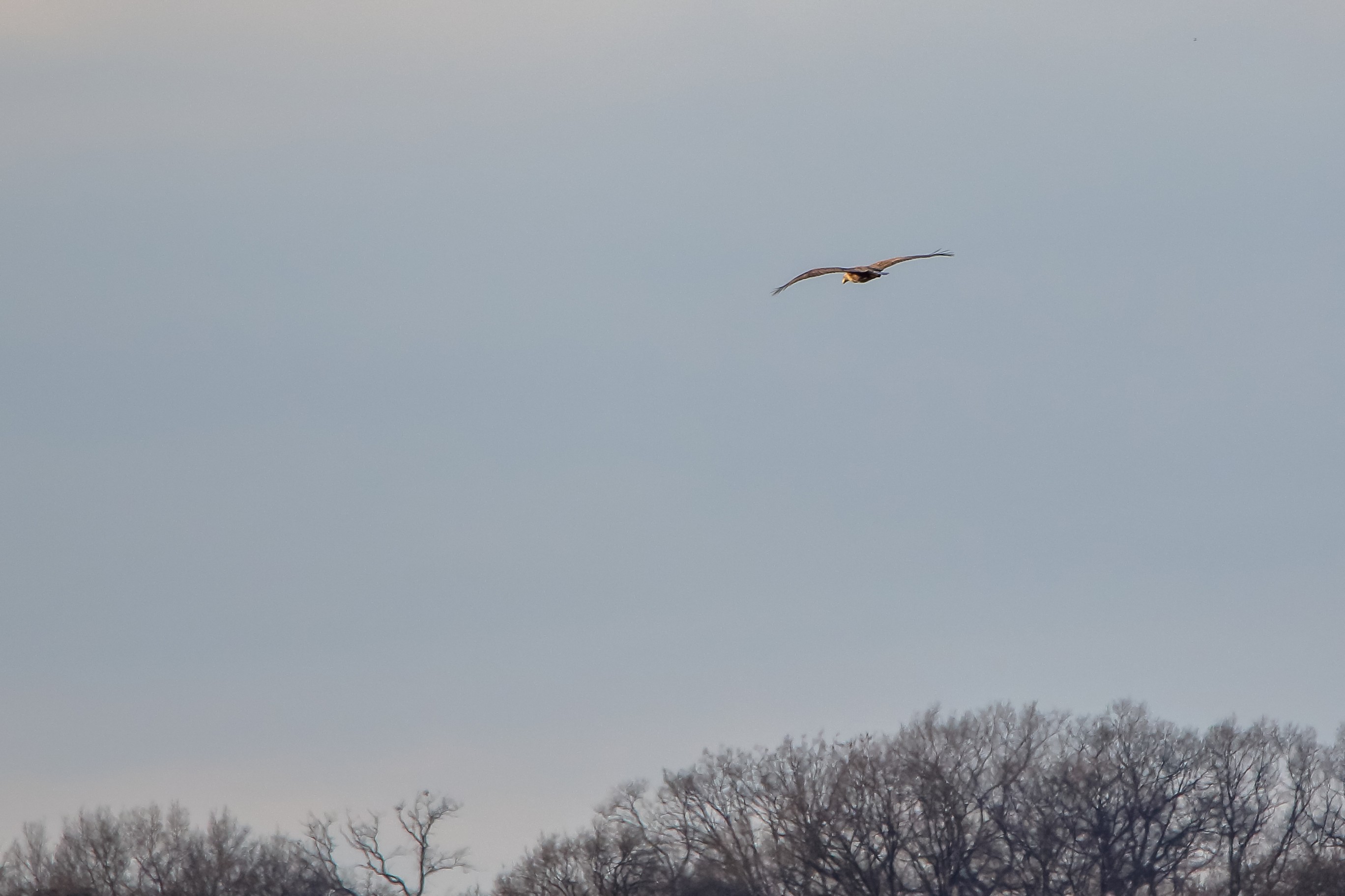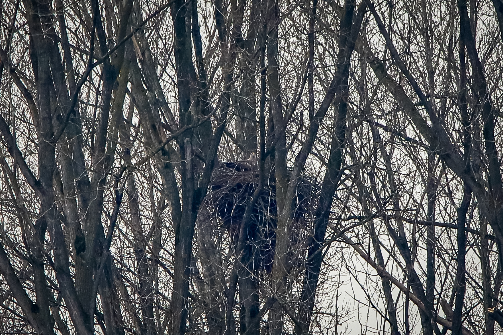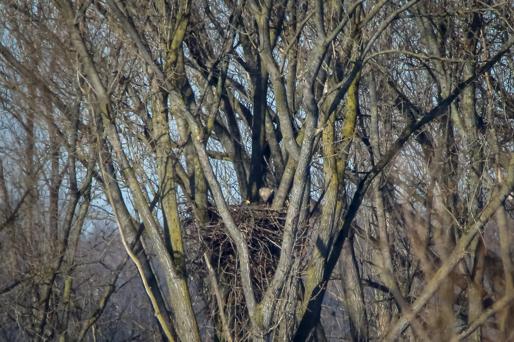 Zwischen dem 03. und 04. März zeigte das Seeadlerweib lange Sitzfolgen im Horst. Vermutlich begann zu diesem Zeitpunkt schon die Eiablage. Nun am 06. März verlässt das Seeadlerweib nicht mehr den Horst und der männliche Seeadler bringt Beute in den Horst. Nach kurzen Beuteflügen des Seeadlermännchens verweilt er ständig in unmittelbarer Nähe des Horstes. Eine freudige Beobachtung, die uns Naturfreunden die Hoffnung auf eine weitere Reproduktion der Seeadler auf der Bislicher Insel schenkt. Somit wird nach dem traurig verlaufenden Jahr 2020 nunmehr ein erlebnisreiches Jahr für die Besucher auf der Bislicher Insel anstehen. In ca. 38 Tagen wird der erste Nachwuchs im Horst schlüpfen und nach weiteren drei Wochen werden die Seeadlerküken, falls Blätter nicht die Sicht versperren, zu sichten sein. Im Alter von ca. 70-75 Tagen werden die Nesthocker sich zu Ästlingen entwickeln und ihre Flugfähigkeit mit ca. 95 Tagen nach dem Schlupf erreichen. Ein spannendes Jahr steht an. Am Vormittag des 06. März beobachtete ich den Anflug eines aus dem zweiten Kalenderjahr stammenden Jungseeadlers, der unbesendert ins Habitat einflog. Seine Höhe war fast unerreichbar für mein Objektiv, aus diesem Grund ließen sich nur Belegaufnahmen fertigen. Wahrscheinlich handelte es sich um einen Jungseeadler des letzten Jahres aus den Niederlanden. Unser Seeadler ließ nicht lange auf sich warten und zeigte dem Jungseeadler unmissverständlich wer der Chef im Habitat ist.