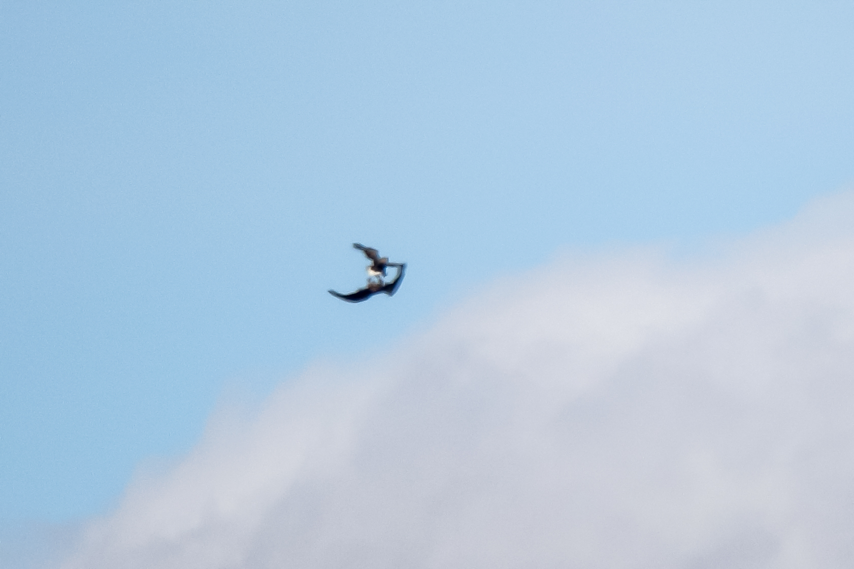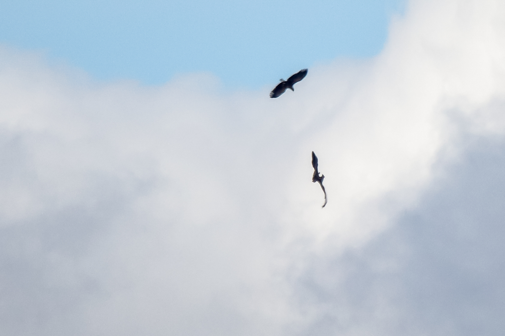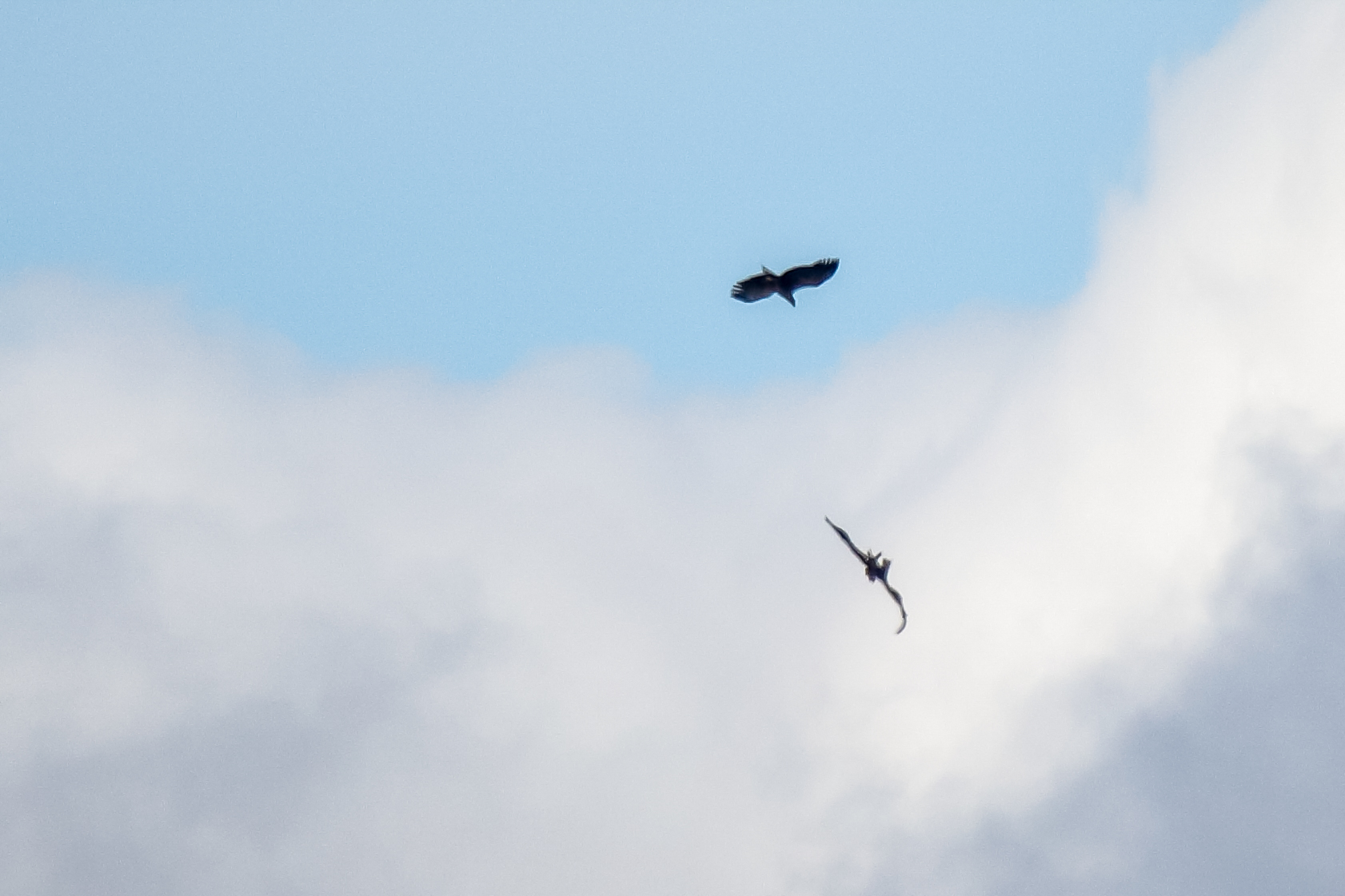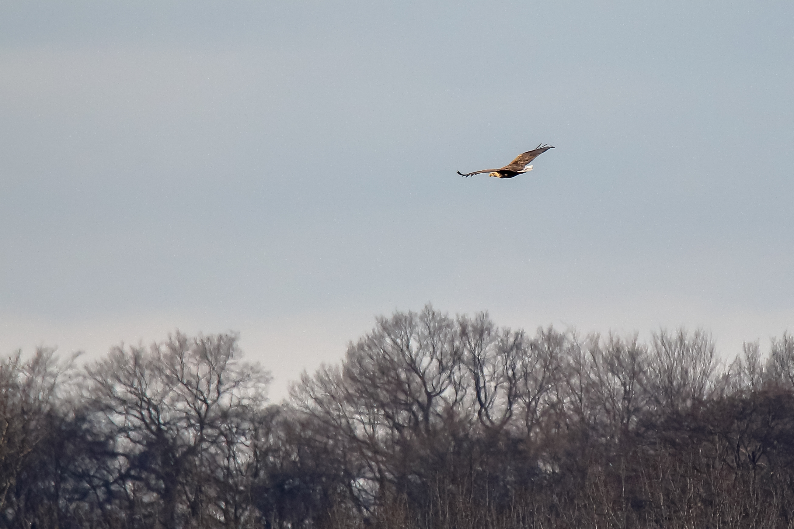 Zwischen dem 03. und 04. März zeigte das Seeadlerweib lange Sitzfolgen im Horst. Vermutlich begann zu diesem Zeitpunkt schon die Eiablage. Nun am 06. März verlässt das Seeadlerweib nicht mehr den Horst und der männliche Seeadler bringt Beute in den Horst. Nach kurzen Beuteflügen des Seeadlermännchens verweilt er ständig in unmittelbarer Nähe des Horstes. Eine freudige Beobachtung, die uns Naturfreunden die Hoffnung auf eine weitere Reproduktion der Seeadler auf der Bislicher Insel schenkt. Somit wird nach dem traurig verlaufenden Jahr 2020 nunmehr ein erlebnisreiches Jahr für die Besucher auf der Bislicher Insel anstehen. In ca. 38 Tagen wird der erste Nachwuchs im Horst schlüpfen und nach weiteren drei Wochen werden die Seeadlerküken, falls Blätter nicht die Sicht versperren, zu sichten sein. Im Alter von ca. 70-75 Tagen werden die Nesthocker sich zu Ästlingen entwickeln und ihre Flugfähigkeit mit ca. 95 Tagen nach dem Schlupf erreichen. Ein spannendes Jahr steht an. Am Vormittag des 06. März beobachtete ich den Anflug eines aus dem zweiten Kalenderjahr stammenden Jungseeadlers, der unbesendert ins Habitat einflog. Seine Höhe war fast unerreichbar für mein Objektiv, aus diesem Grund ließen sich nur Belegaufnahmen fertigen. Wahrscheinlich handelte es sich um einen Jungseeadler des letzten Jahres aus den Niederlanden. Unser Seeadler ließ nicht lange auf sich warten und zeigte dem Jungseeadler unmissverständlich wer der Chef im Habitat ist.