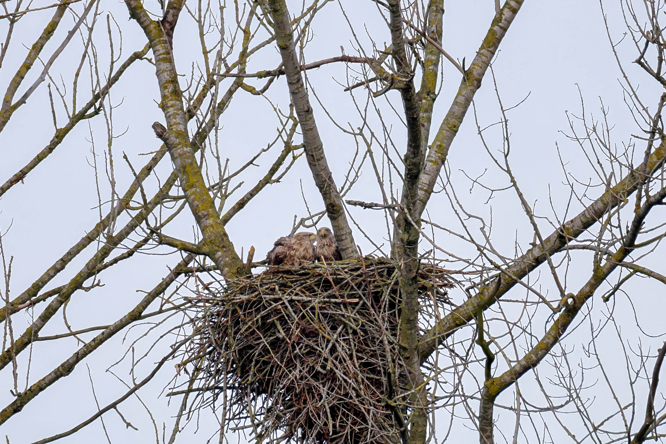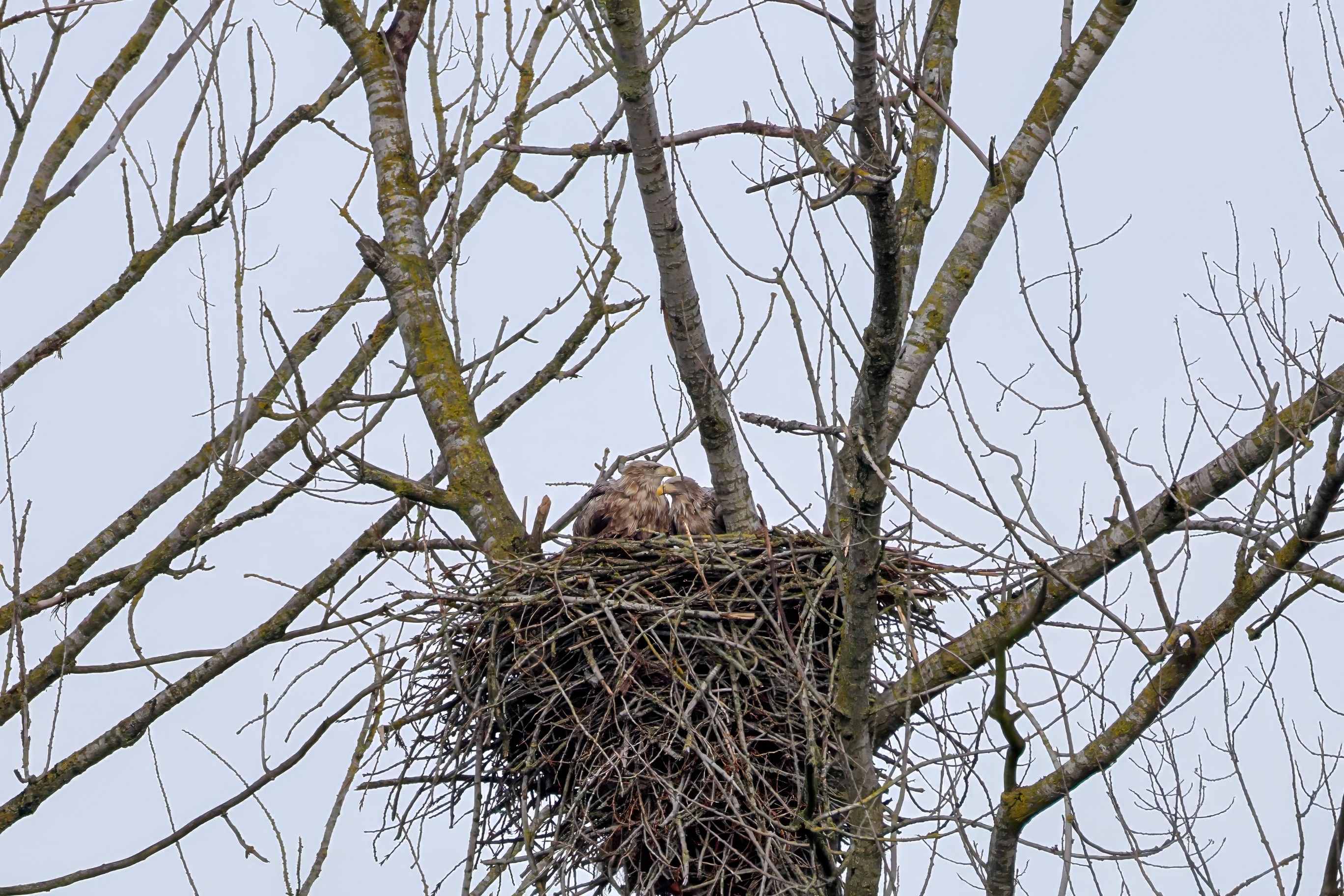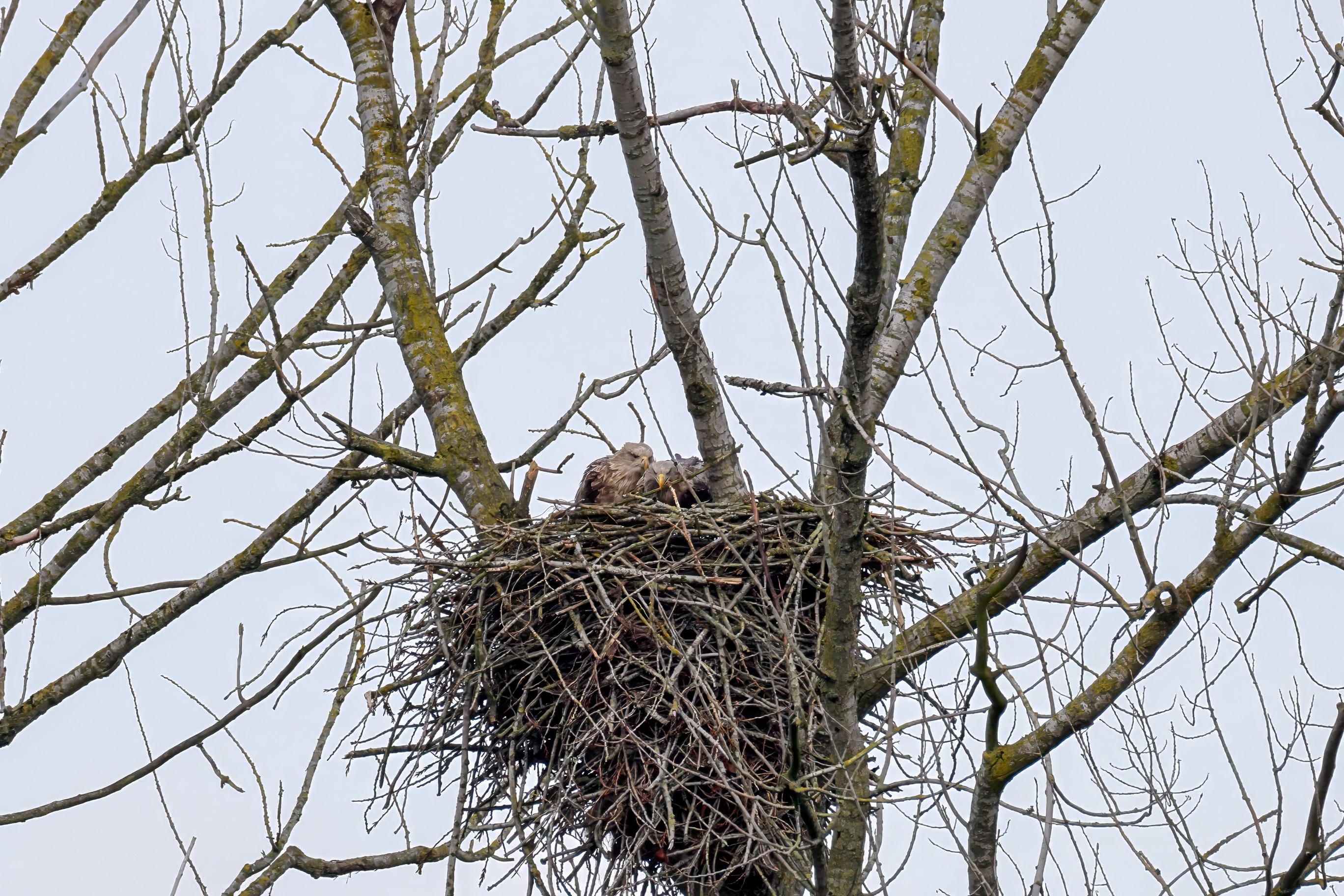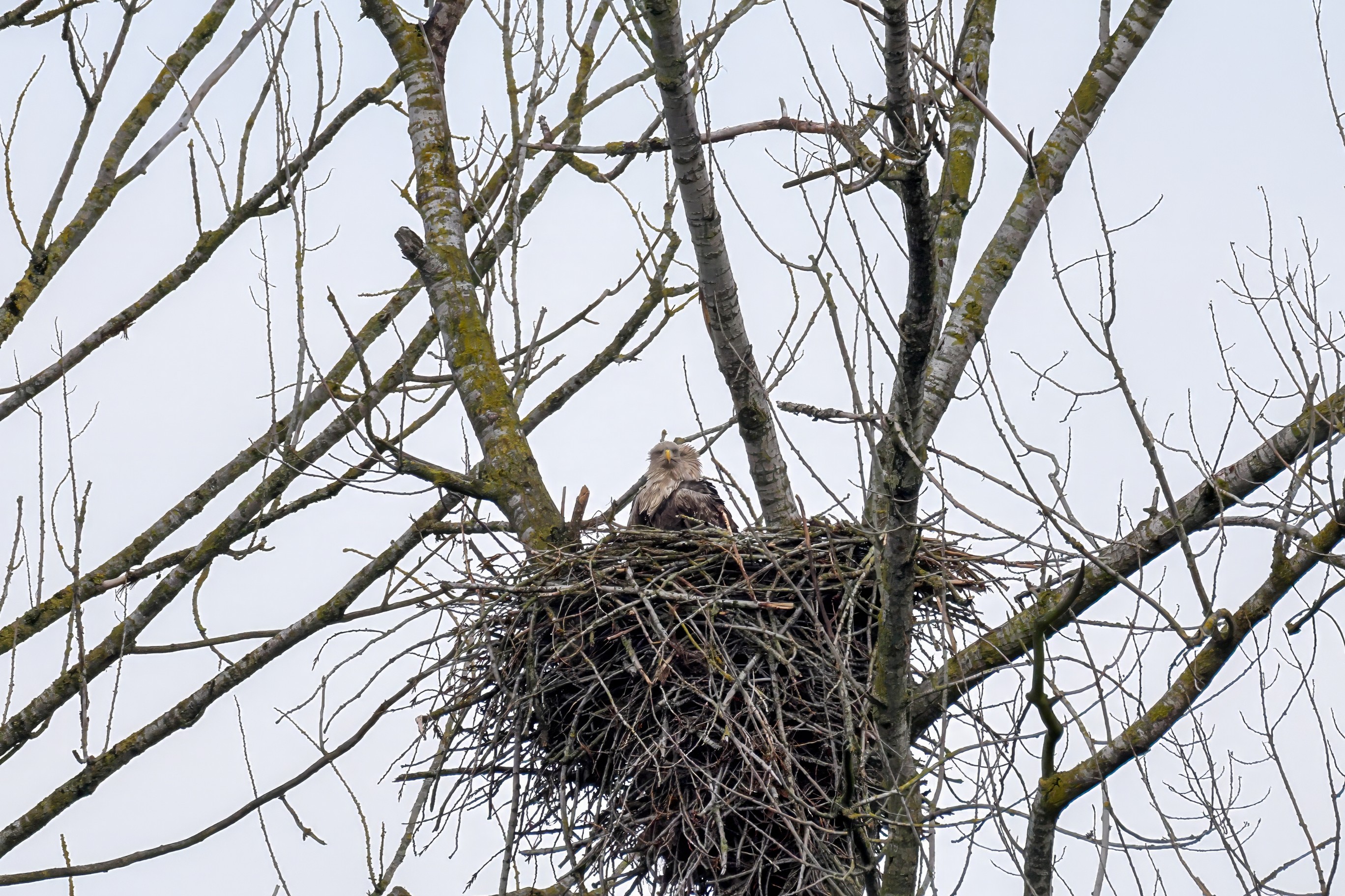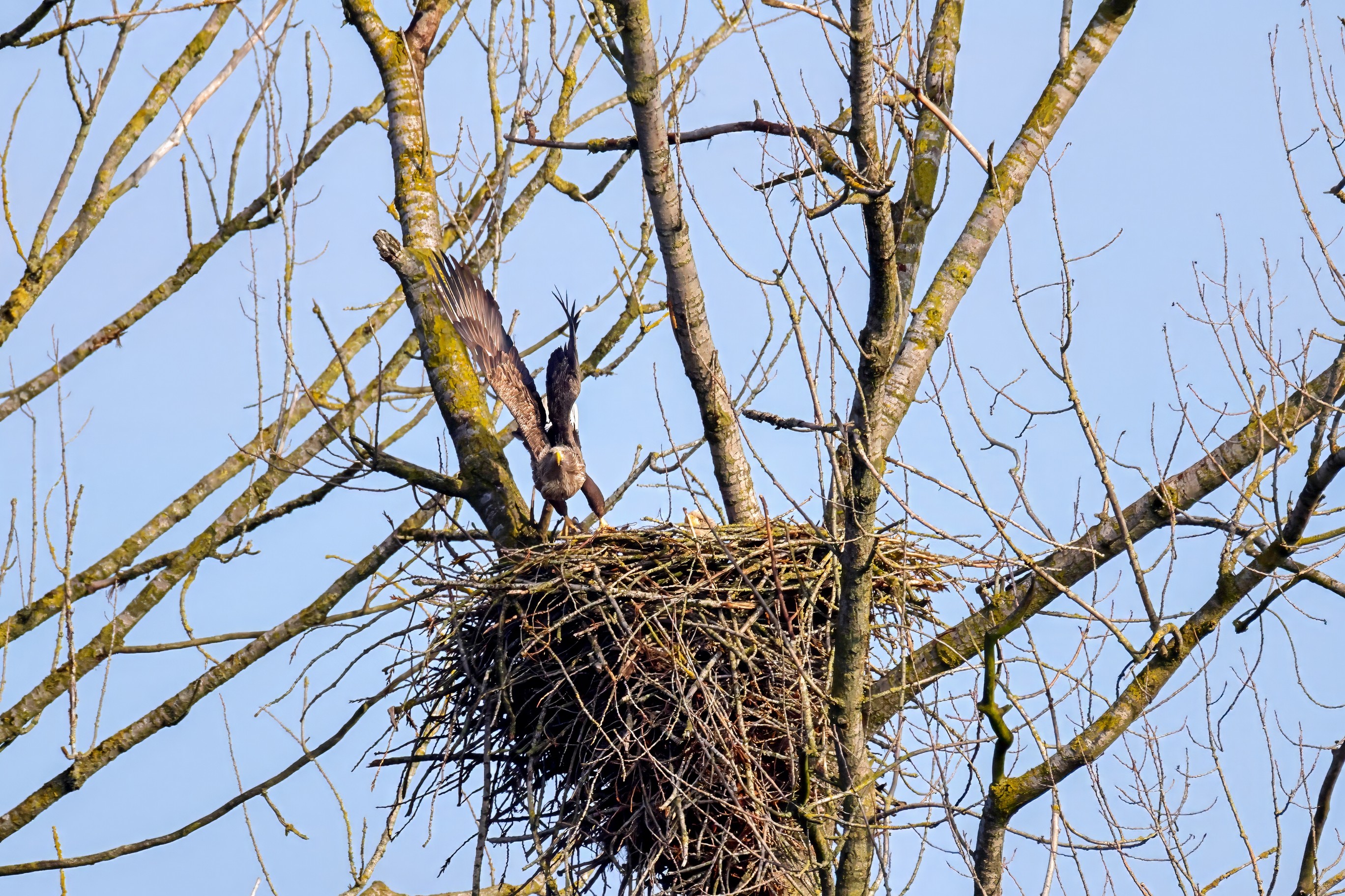 Auf der Bislicher Insel zeigt das Seeadlerpaar derzeit ein deutlich verändertes Verhalten: Der Horst wird nur noch verlassen, wenn ein Partner zurückbleibt und aufmerksam wacht. Dieses abgestimmte Verhalten spricht dafür, dass das Weibchen am Wochenende des 14./15. Februar ein Gelege produziert hat und damit die Brutphase 2026 eröffnet.