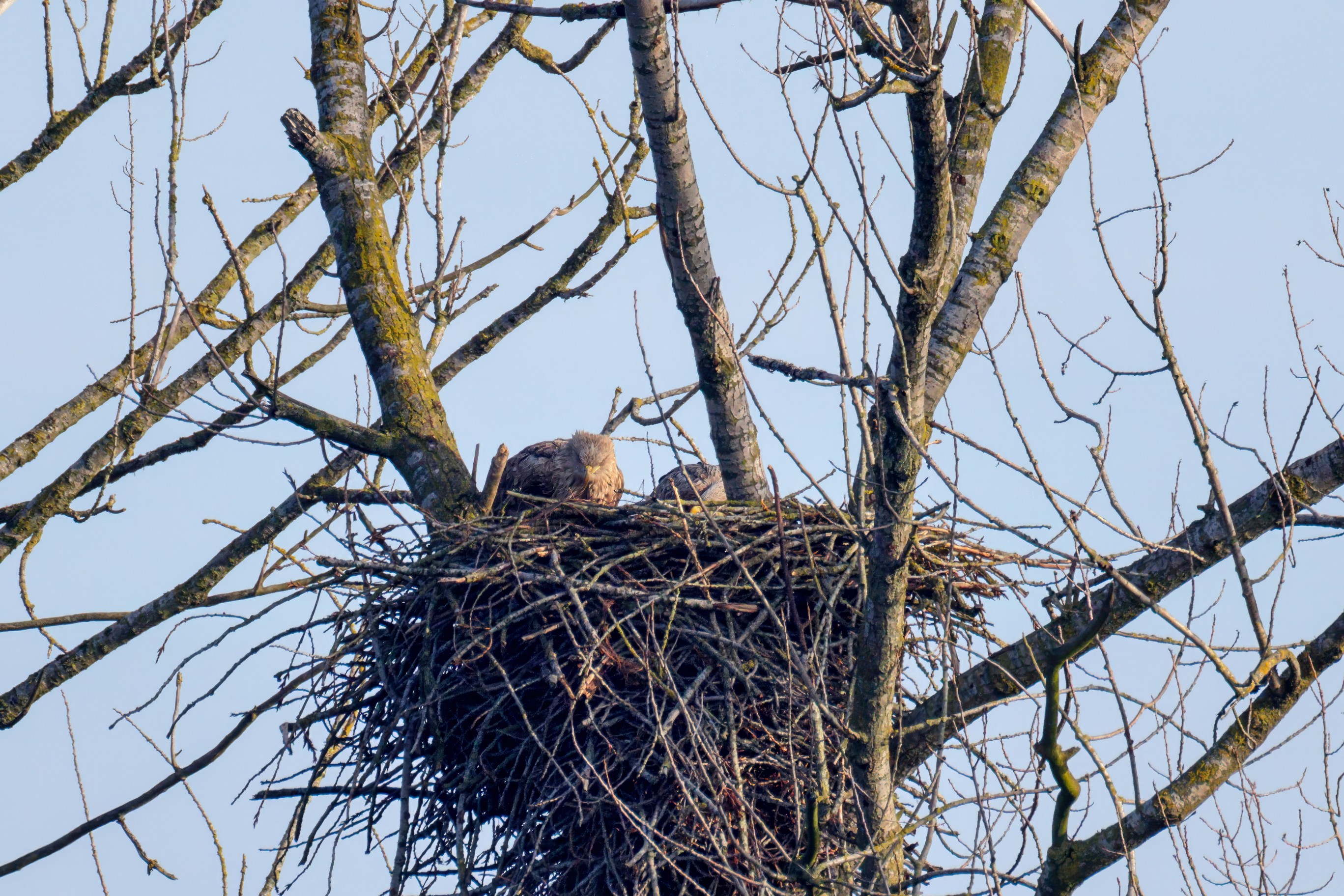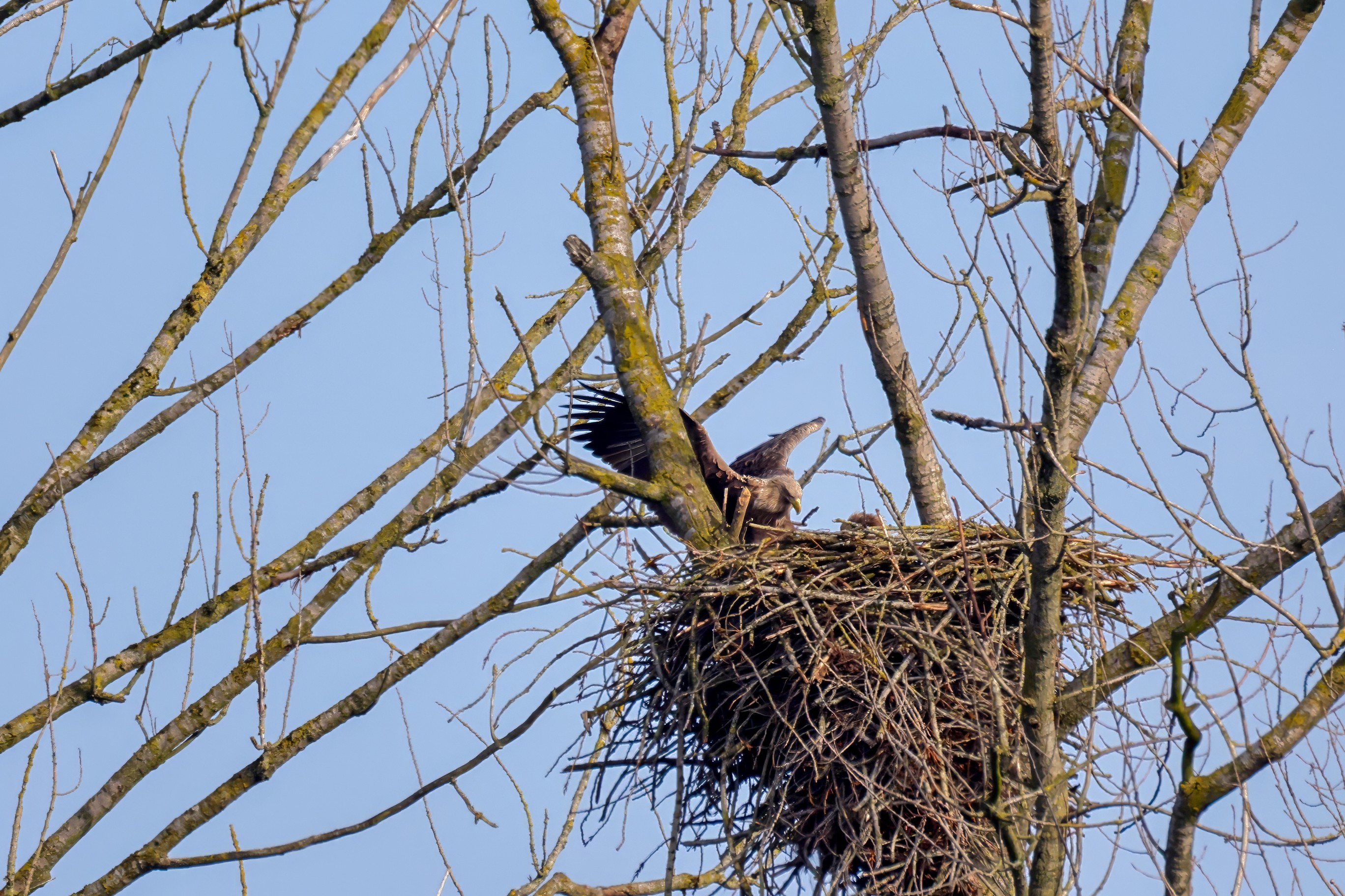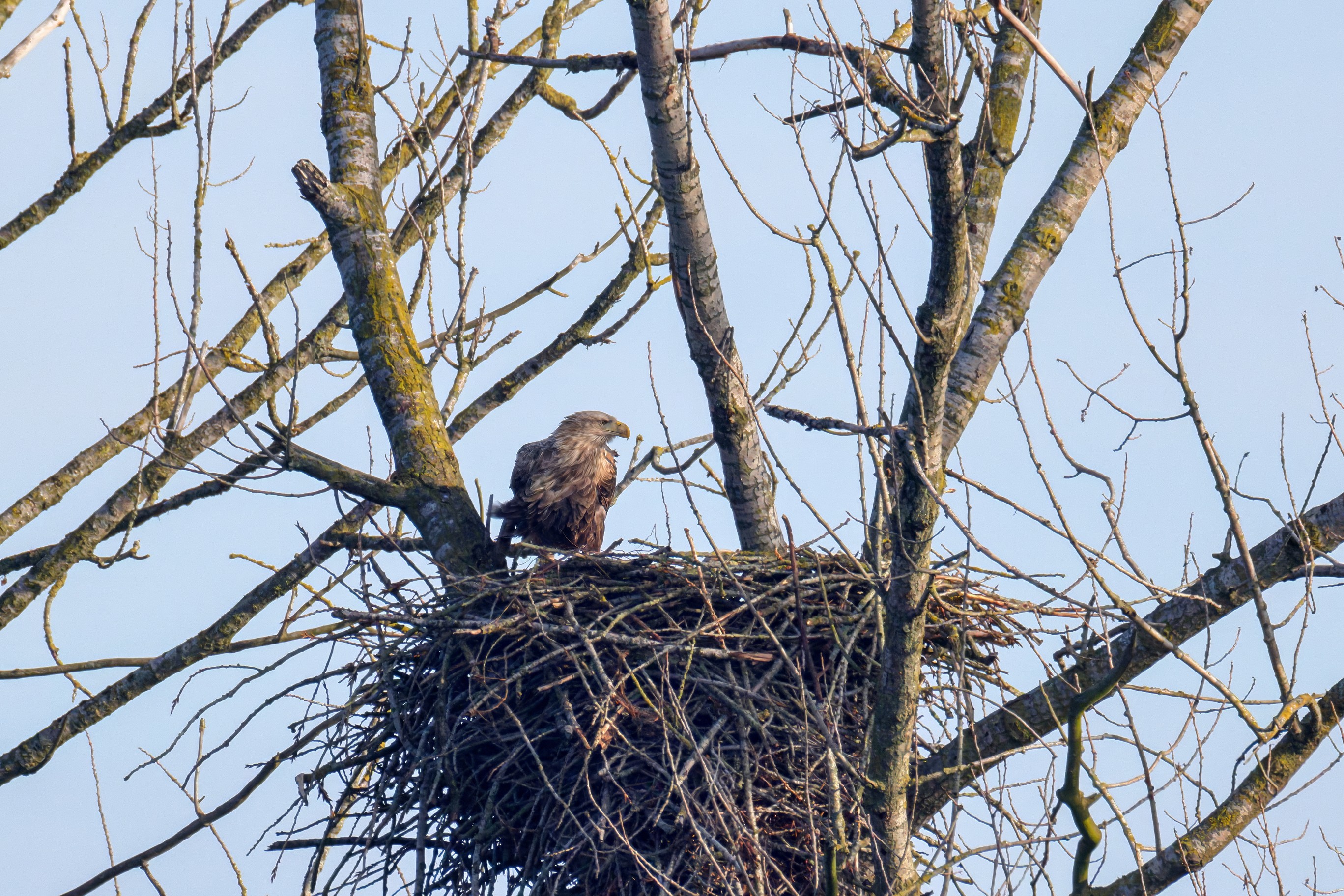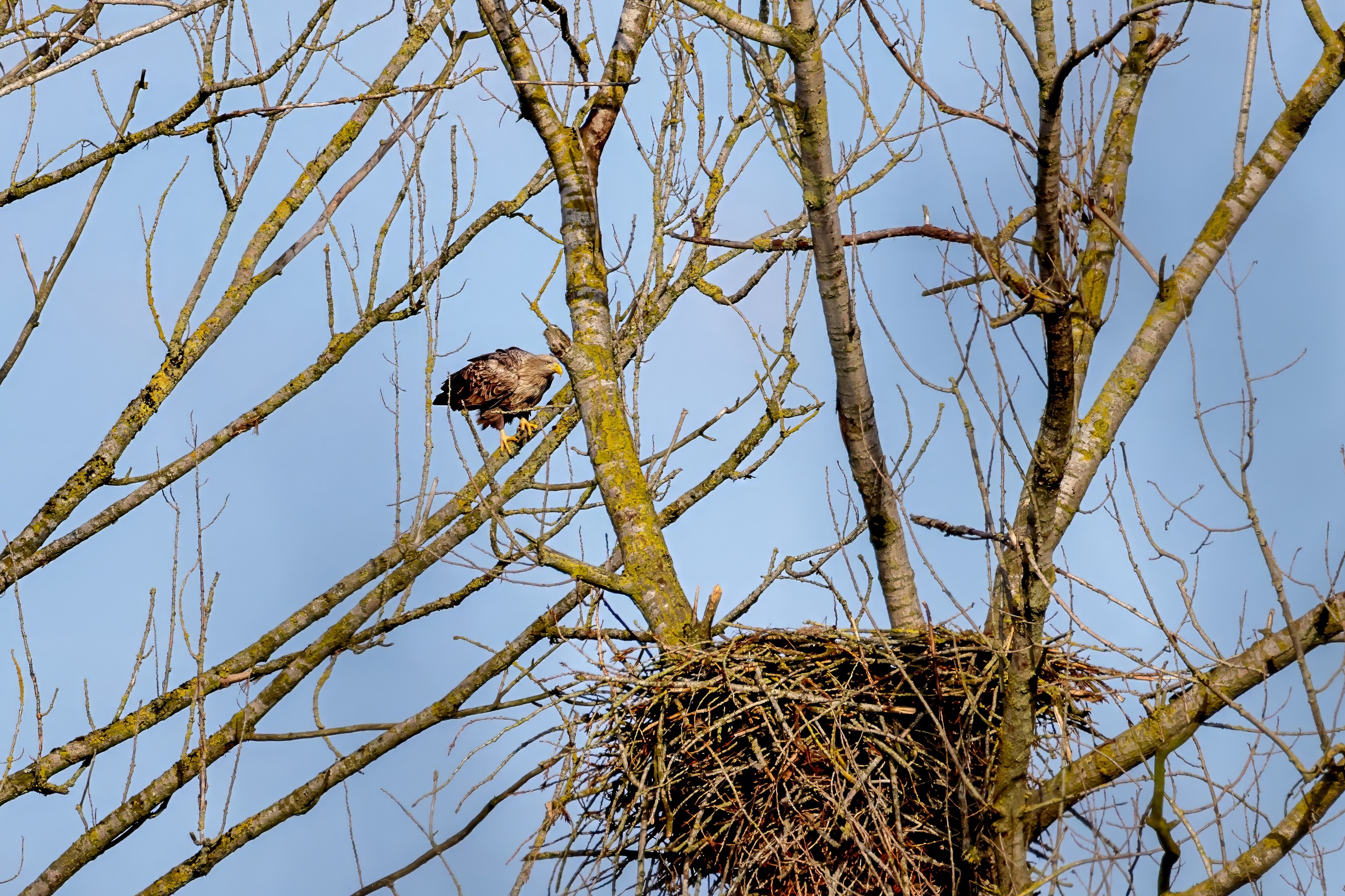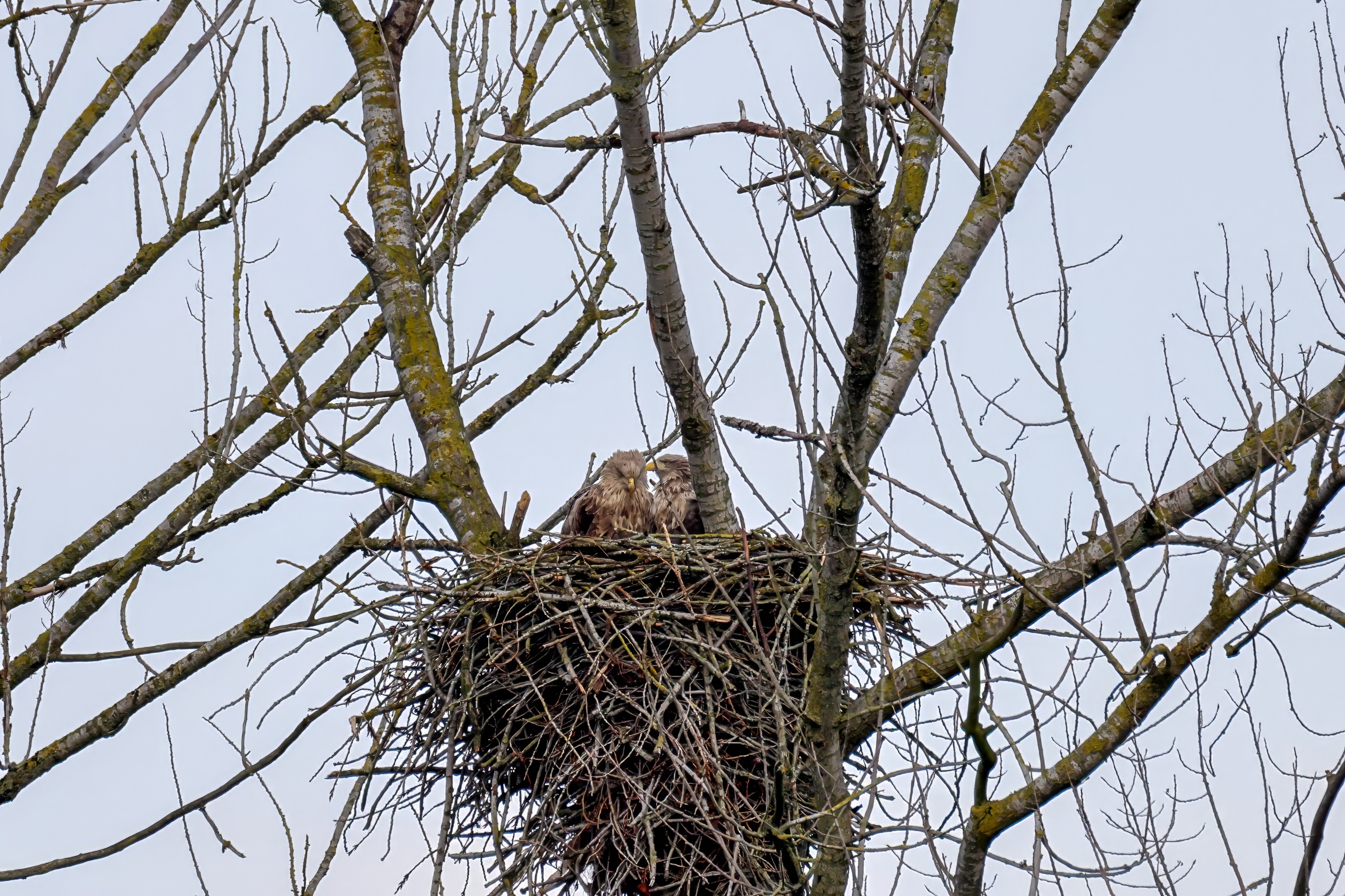 Auf der Bislicher Insel zeigt das Seeadlerpaar derzeit ein deutlich verändertes Verhalten: Der Horst wird nur noch verlassen, wenn ein Partner zurückbleibt und aufmerksam wacht. Dieses abgestimmte Verhalten spricht dafür, dass das Weibchen am Wochenende des 14./15. Februar ein Gelege produziert hat und damit die Brutphase 2026 eröffnet.