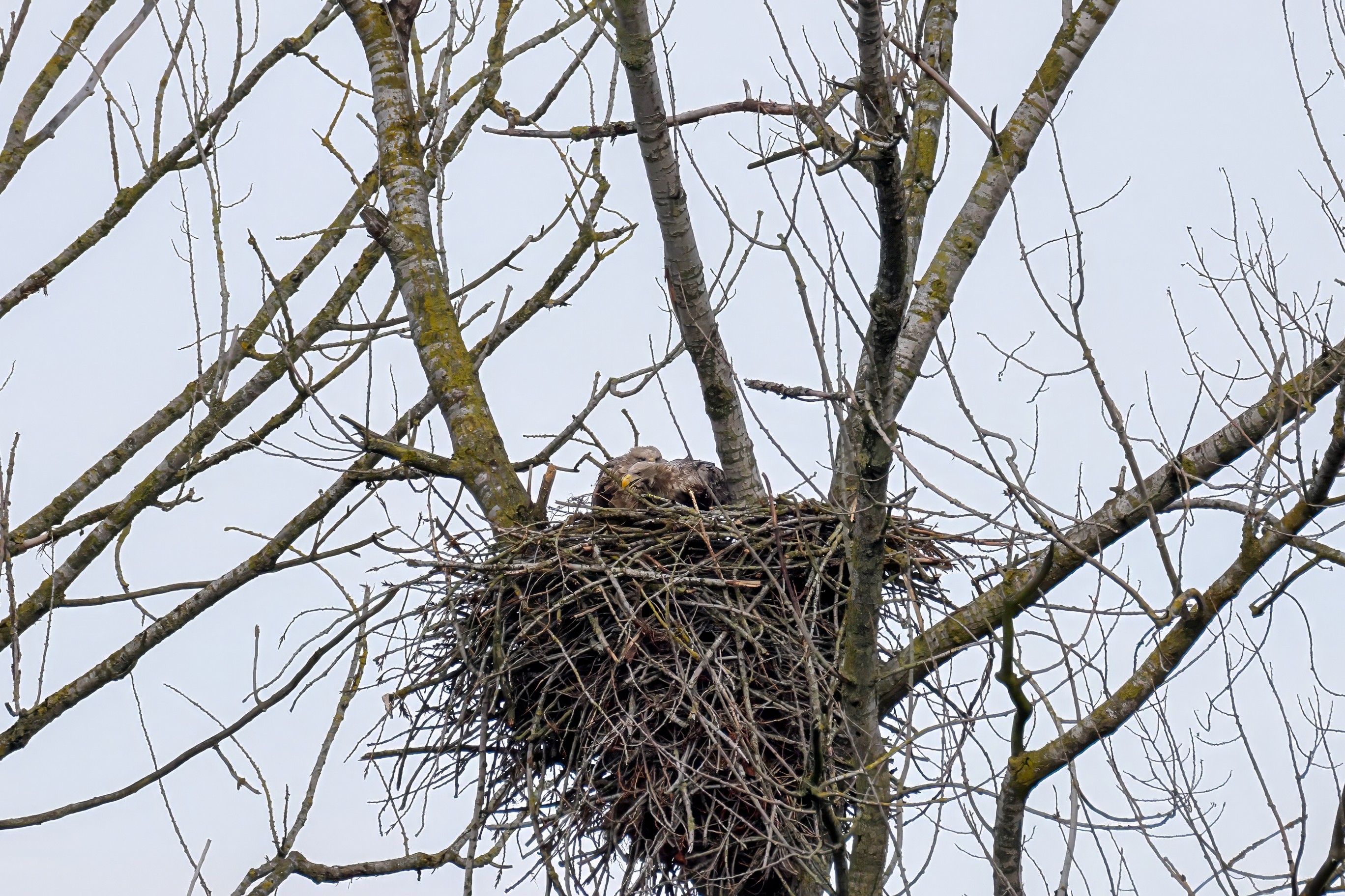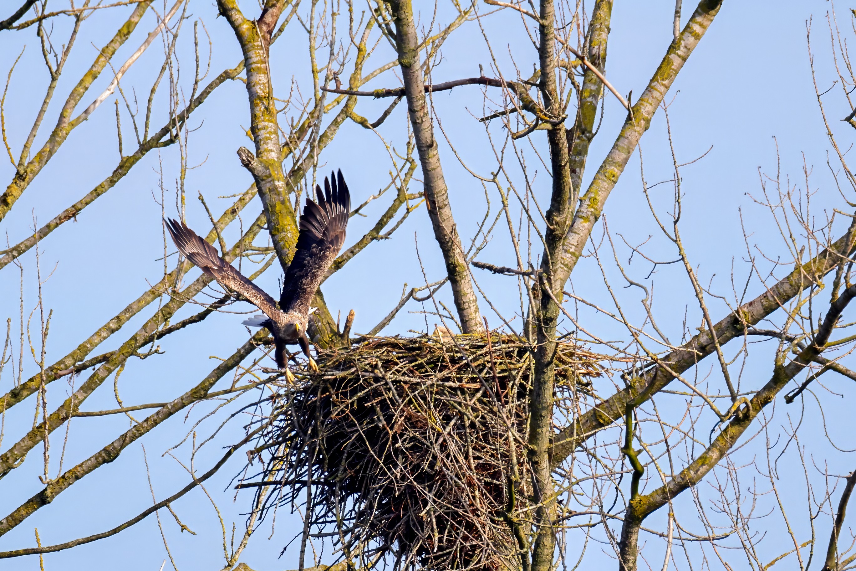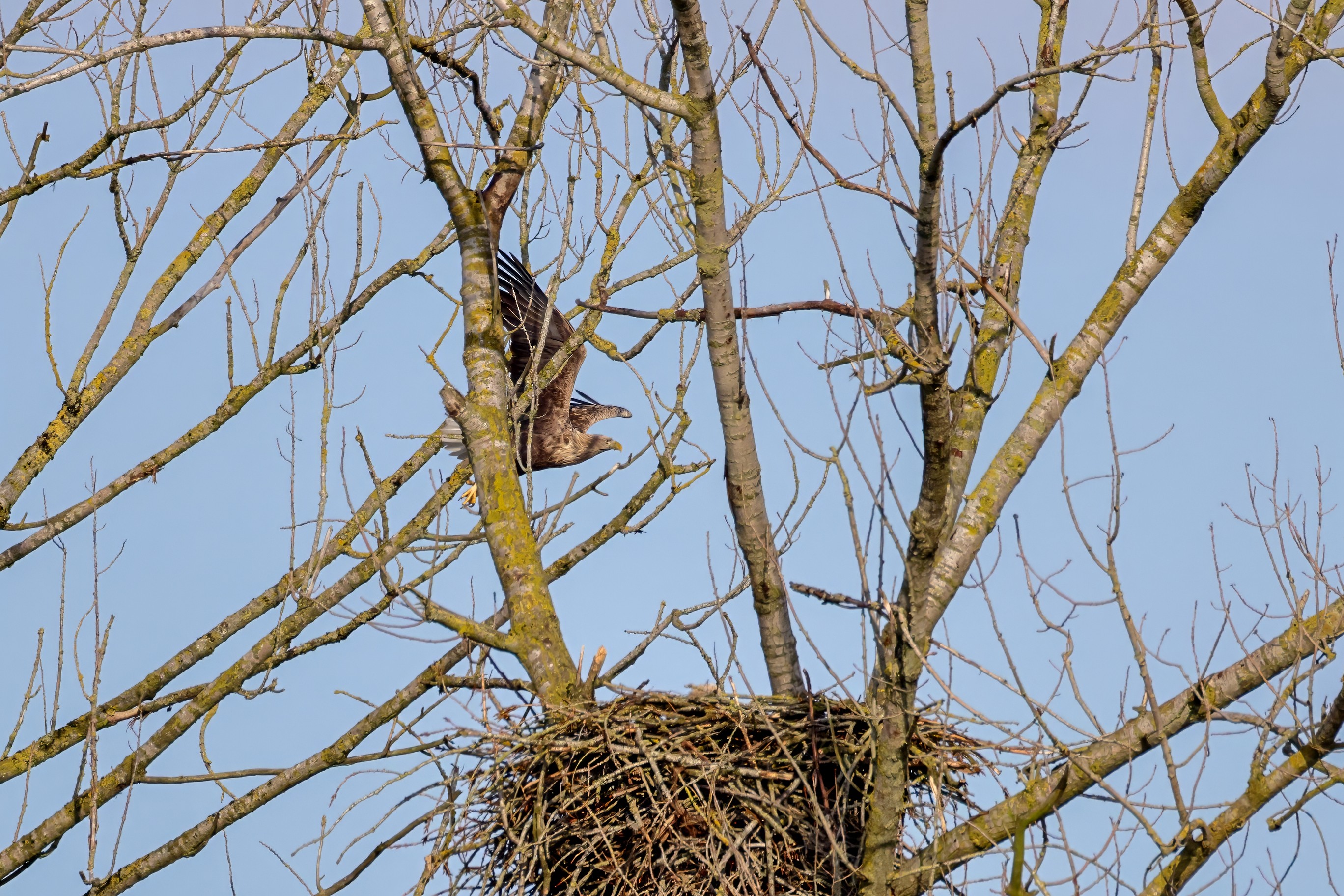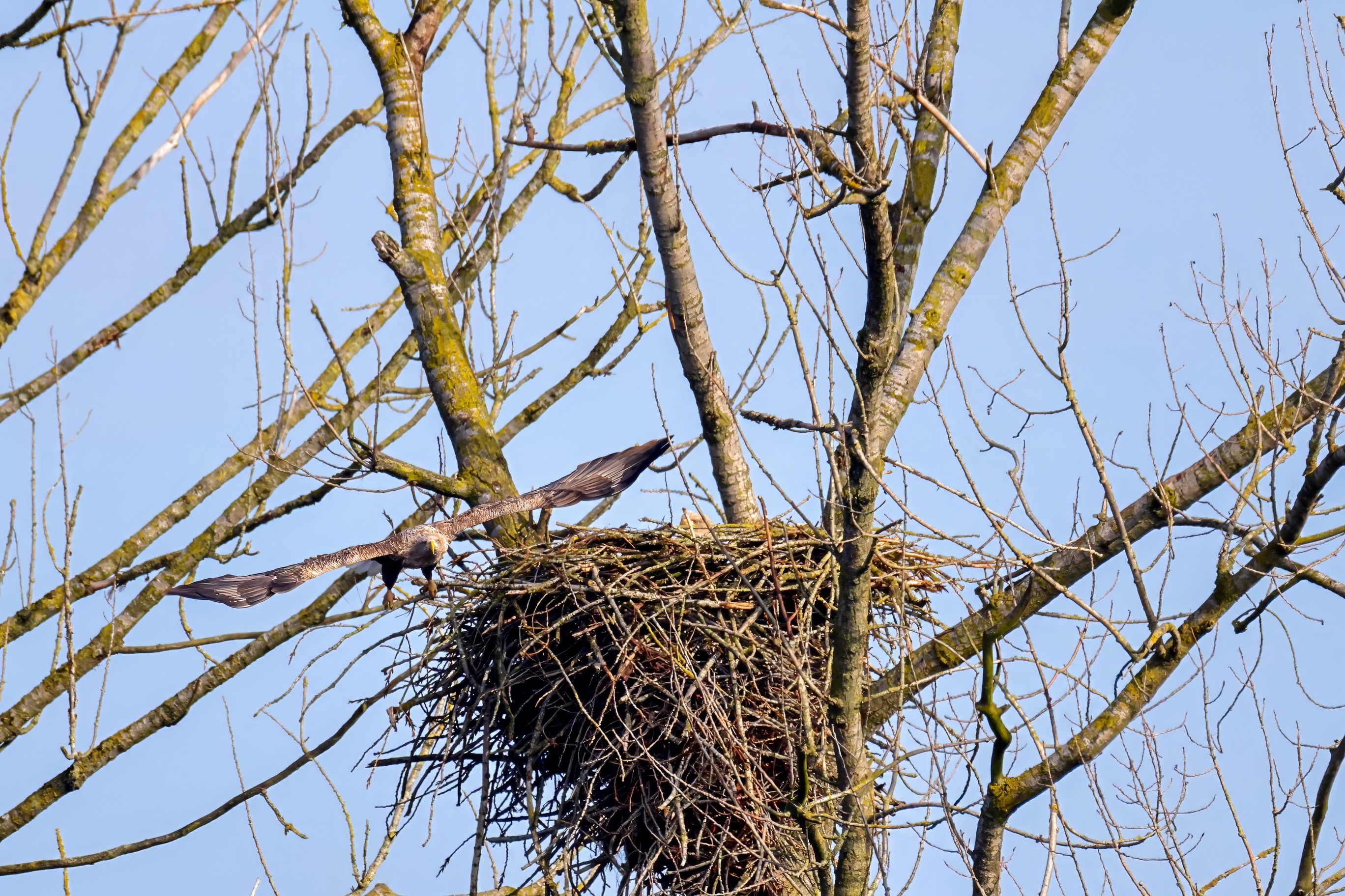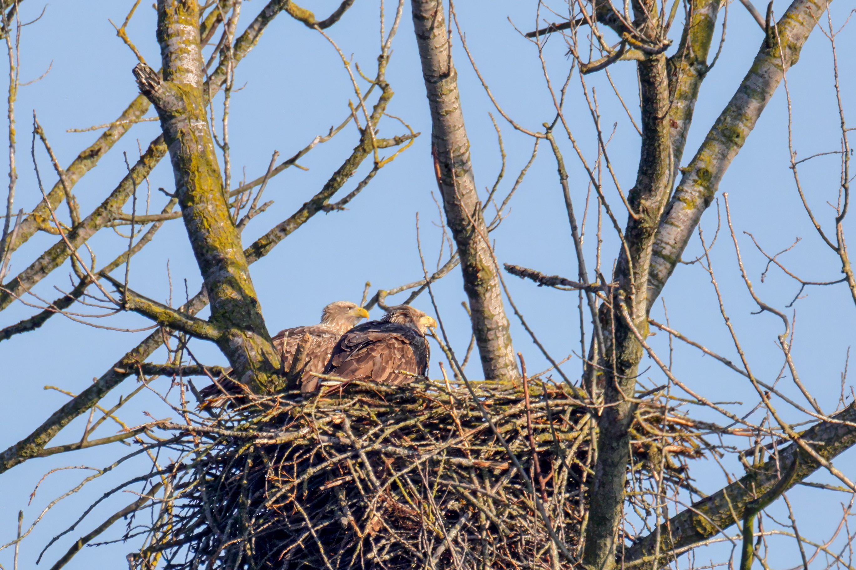 Auf der Bislicher Insel zeigt das Seeadlerpaar derzeit ein deutlich verändertes Verhalten: Der Horst wird nur noch verlassen, wenn ein Partner zurückbleibt und aufmerksam wacht. Dieses abgestimmte Verhalten spricht dafür, dass das Weibchen am Wochenende des 14./15. Februar ein Gelege produziert hat und damit die Brutphase 2026 eröffnet.