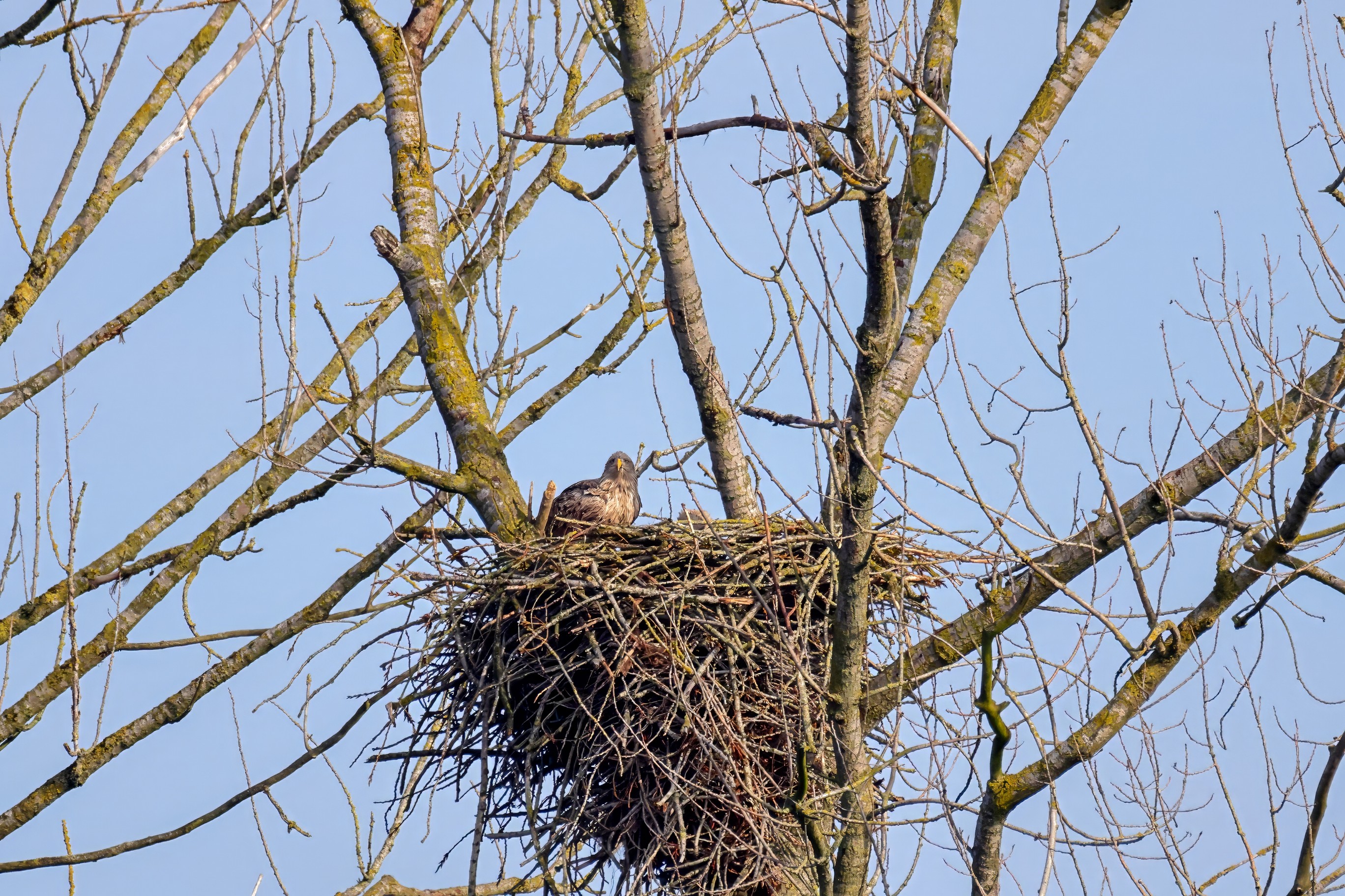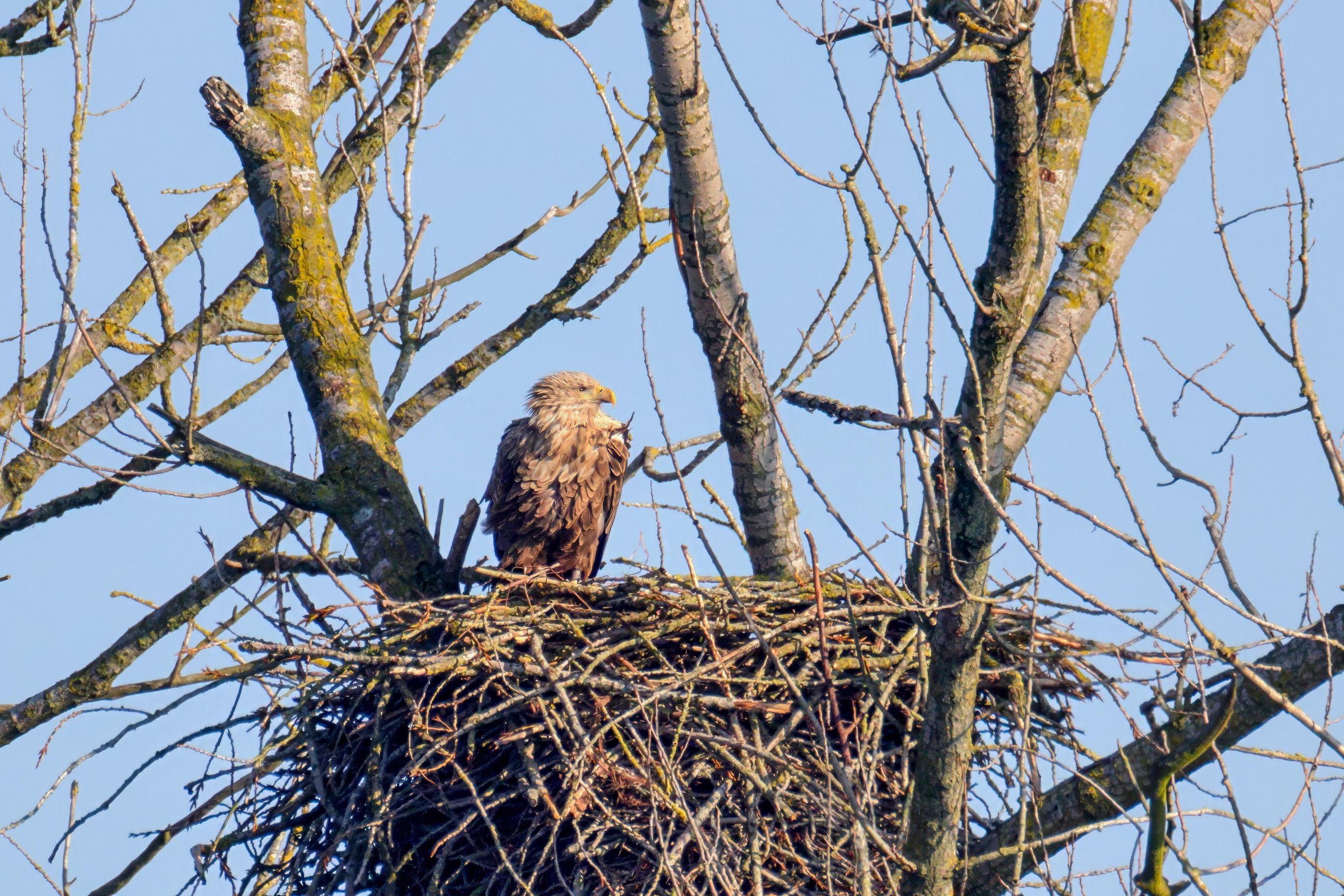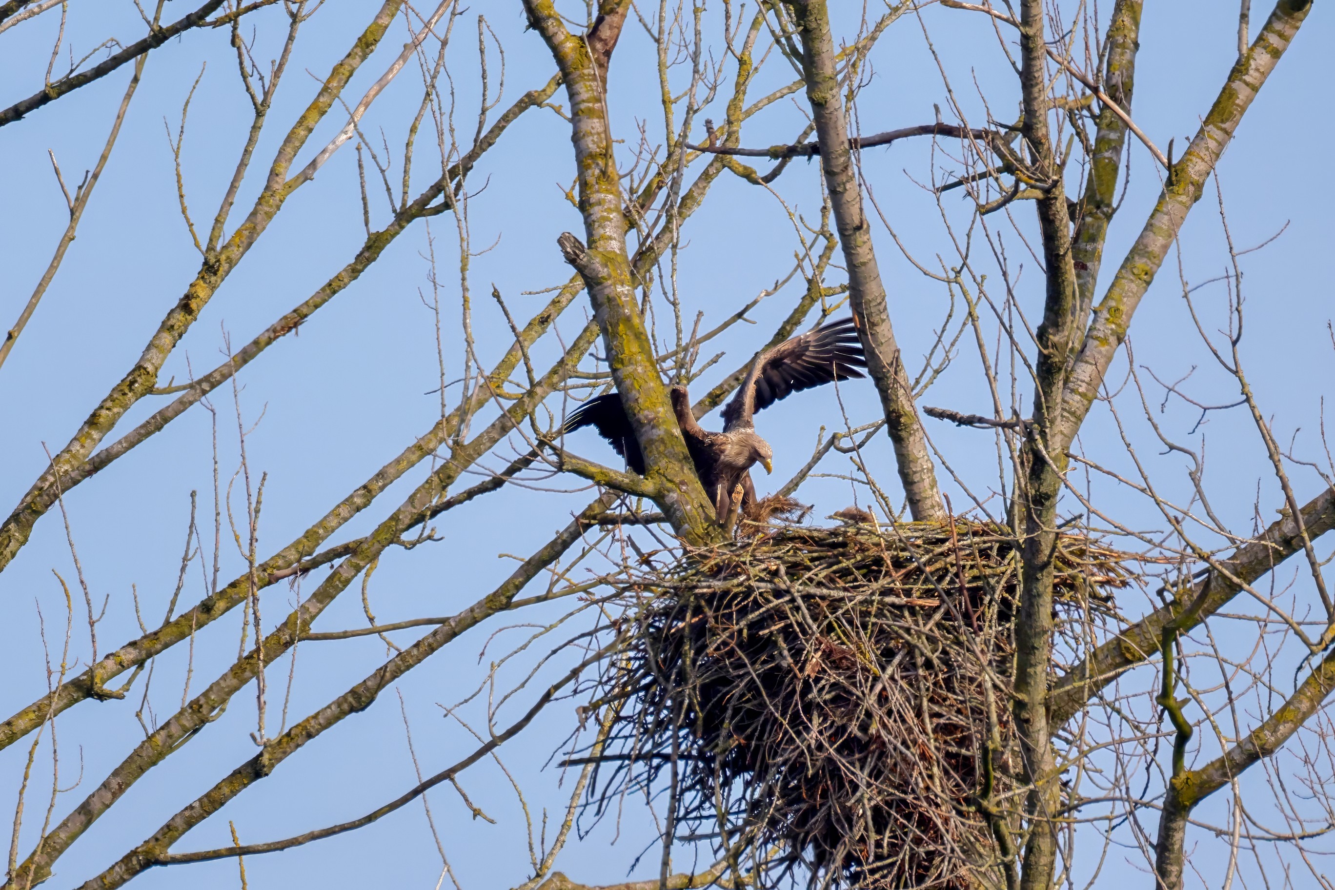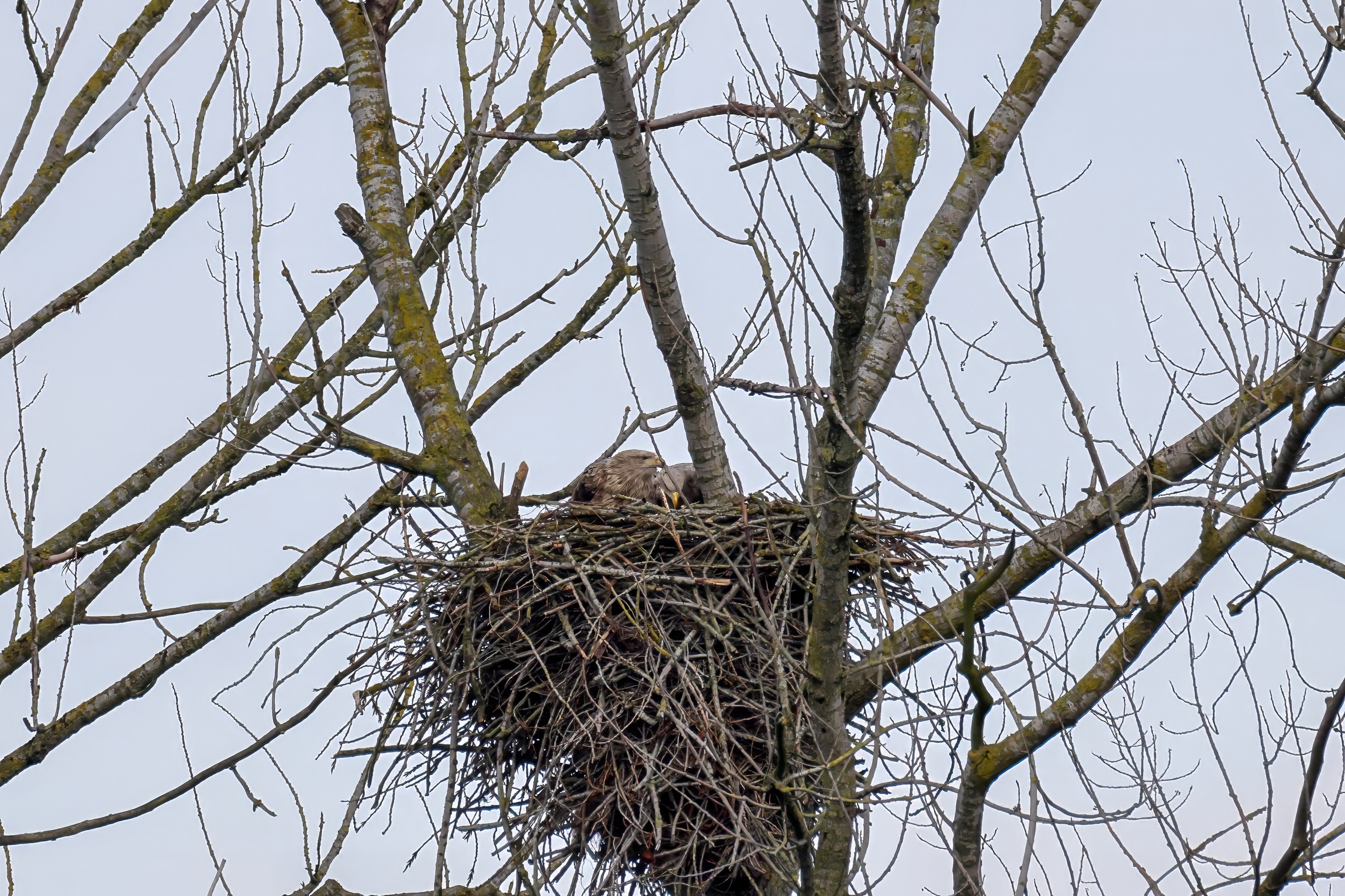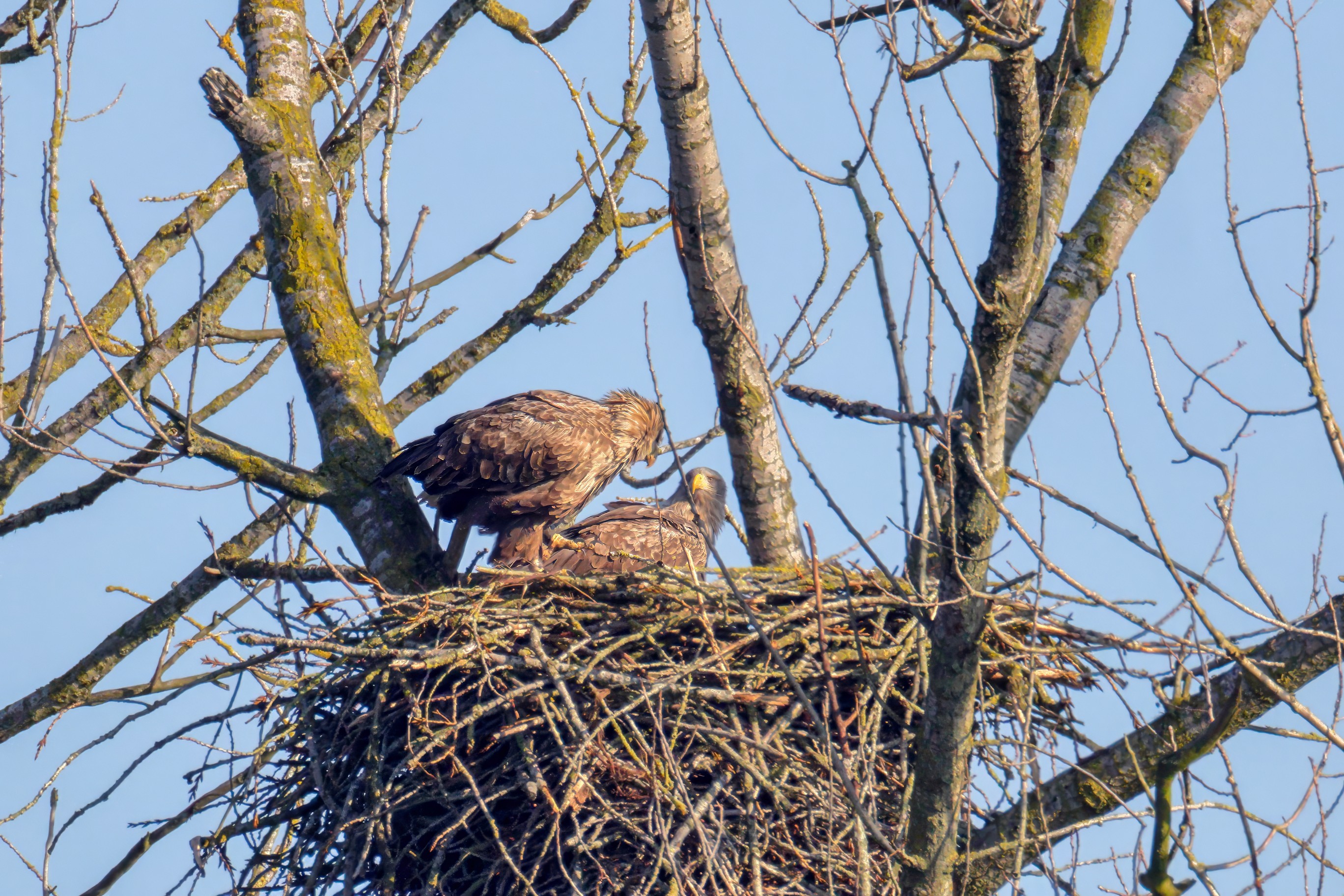 Auf der Bislicher Insel zeigt das Seeadlerpaar derzeit ein deutlich verändertes Verhalten: Der Horst wird nur noch verlassen, wenn ein Partner zurückbleibt und aufmerksam wacht. Dieses abgestimmte Verhalten spricht dafür, dass das Weibchen am Wochenende des 14./15. Februar ein Gelege produziert hat und damit die Brutphase 2026 eröffnet.