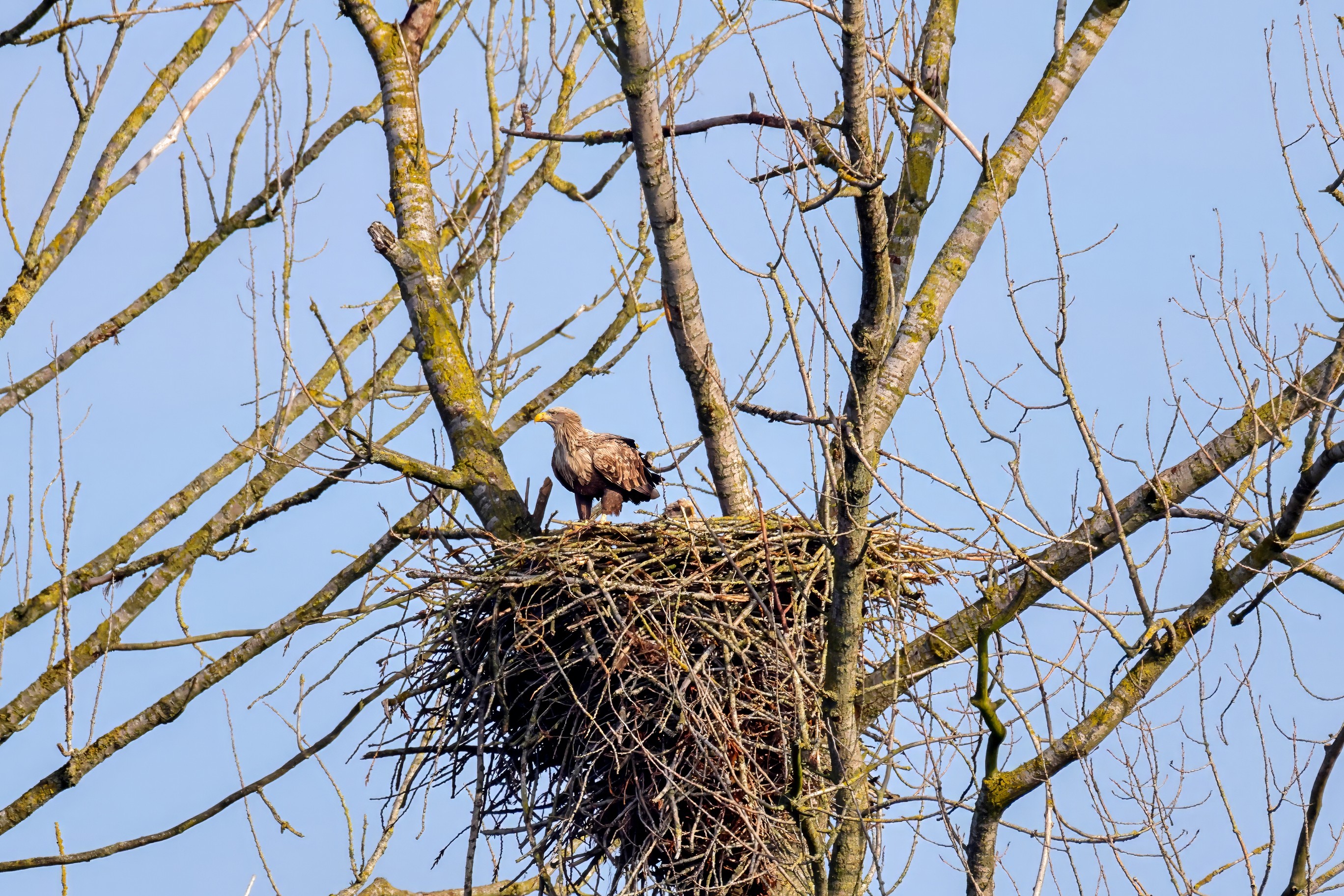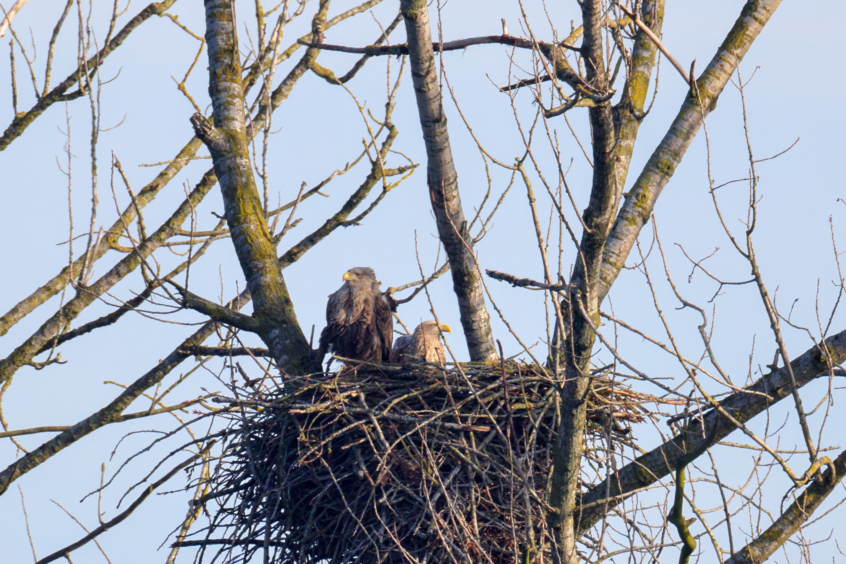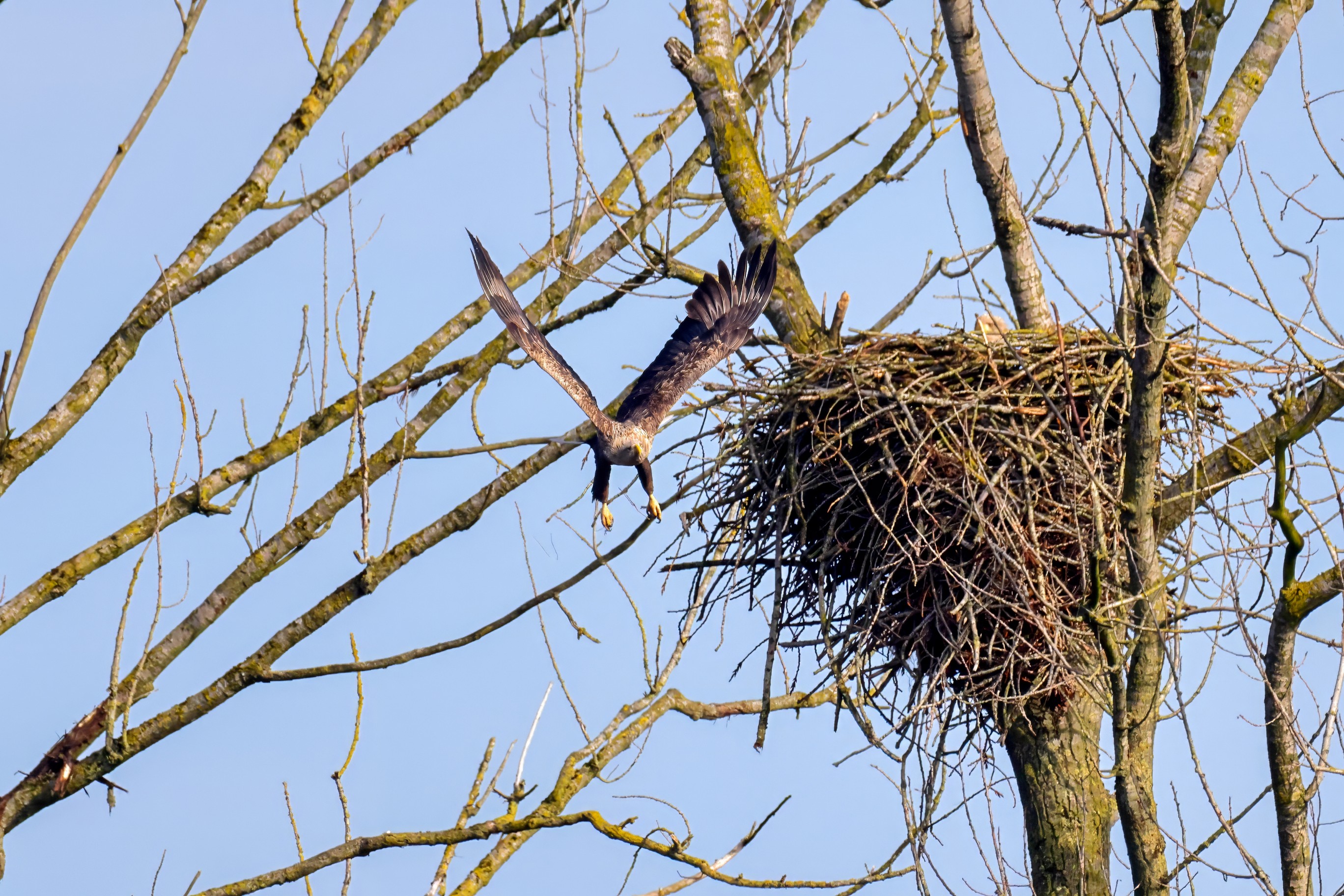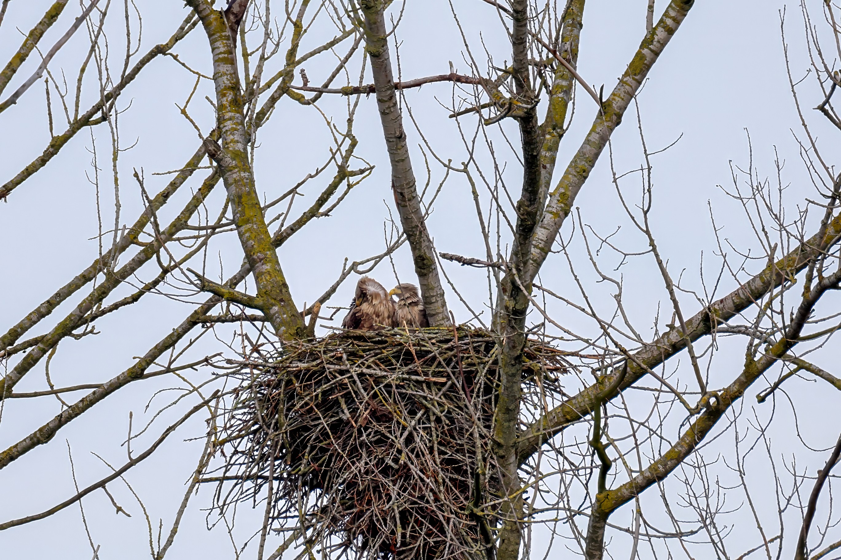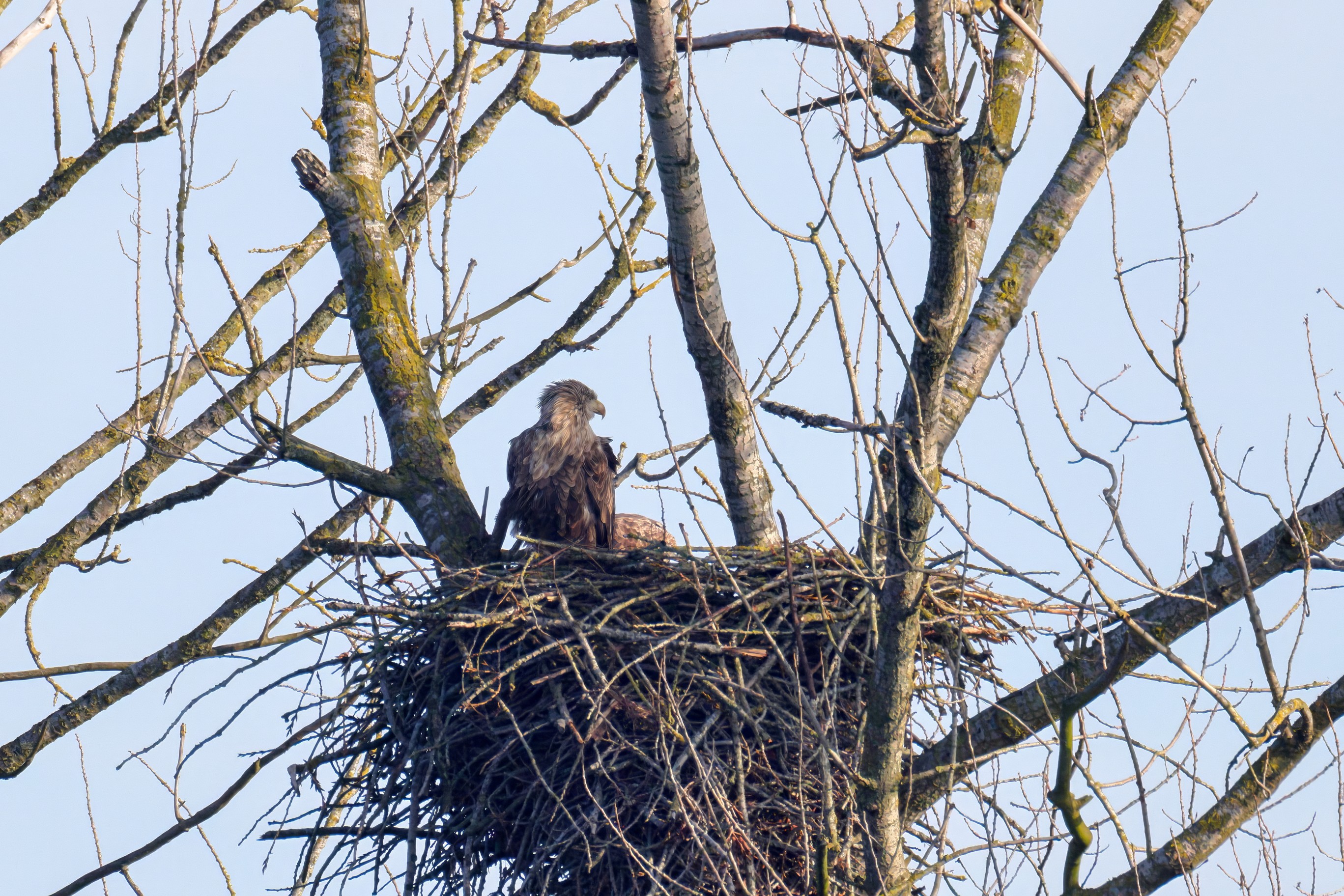 Auf der Bislicher Insel zeigt das Seeadlerpaar derzeit ein deutlich verändertes Verhalten: Der Horst wird nur noch verlassen, wenn ein Partner zurückbleibt und aufmerksam wacht. Dieses abgestimmte Verhalten spricht dafür, dass das Weibchen am Wochenende des 14./15. Februar ein Gelege produziert hat und damit die Brutphase 2026 eröffnet.