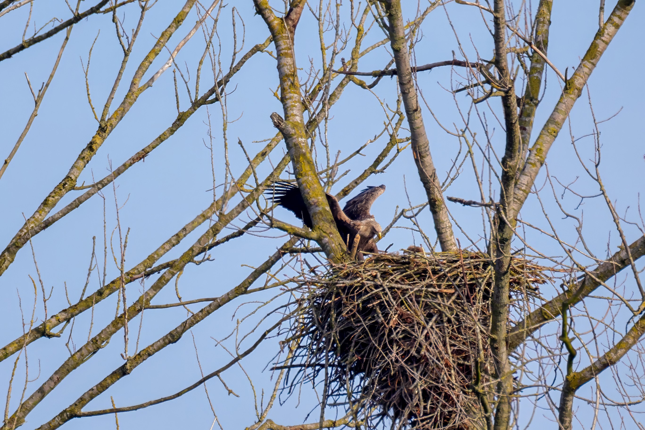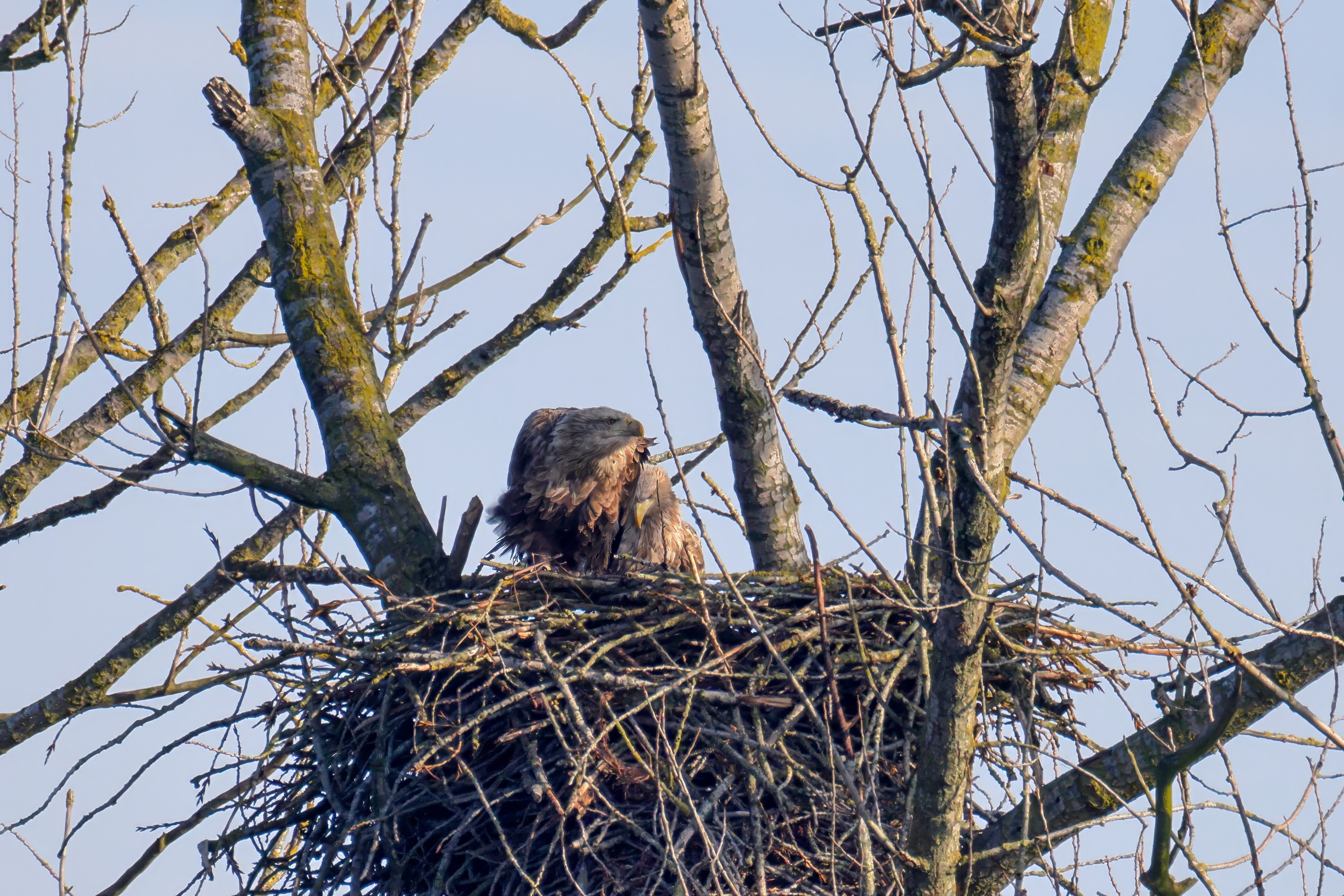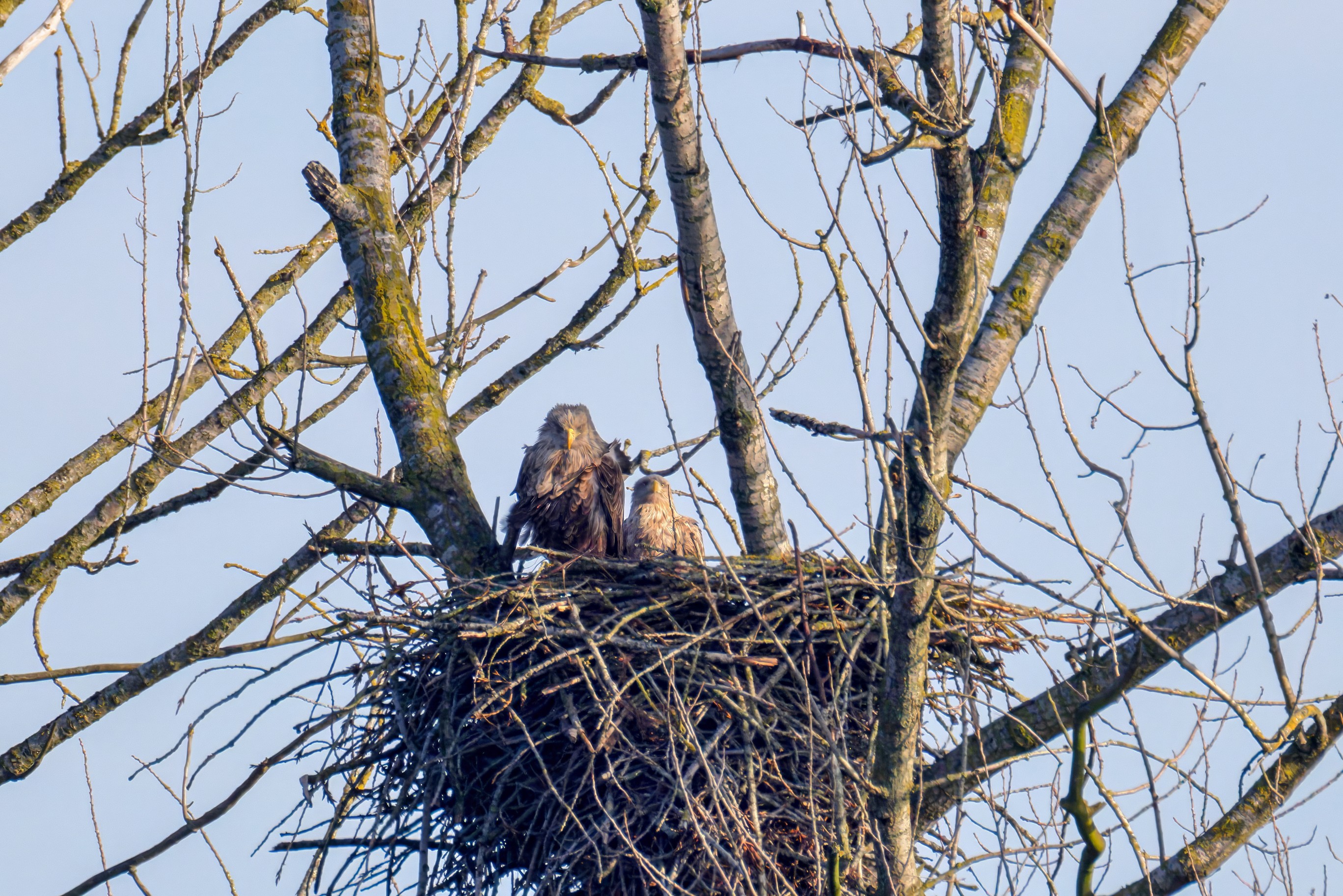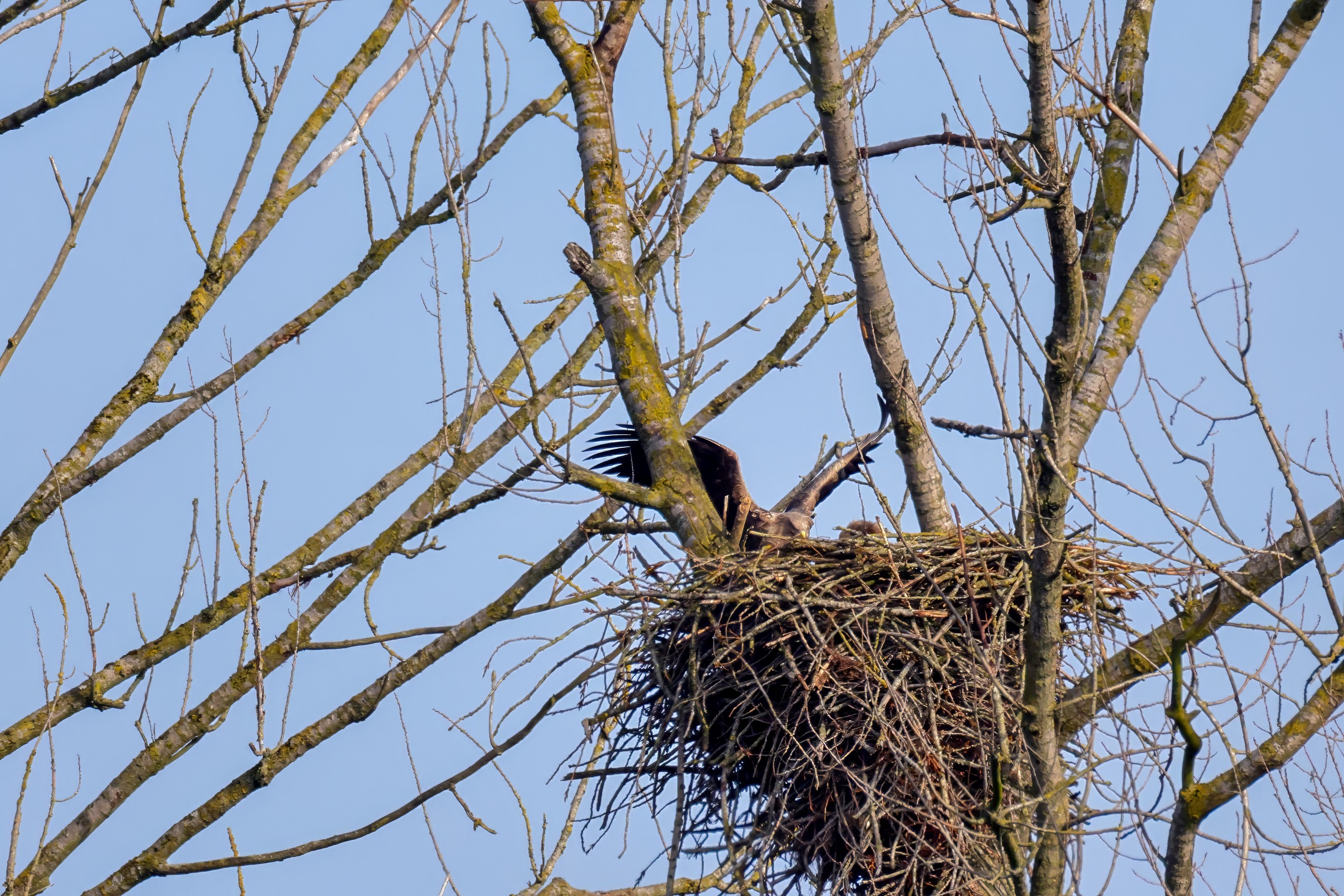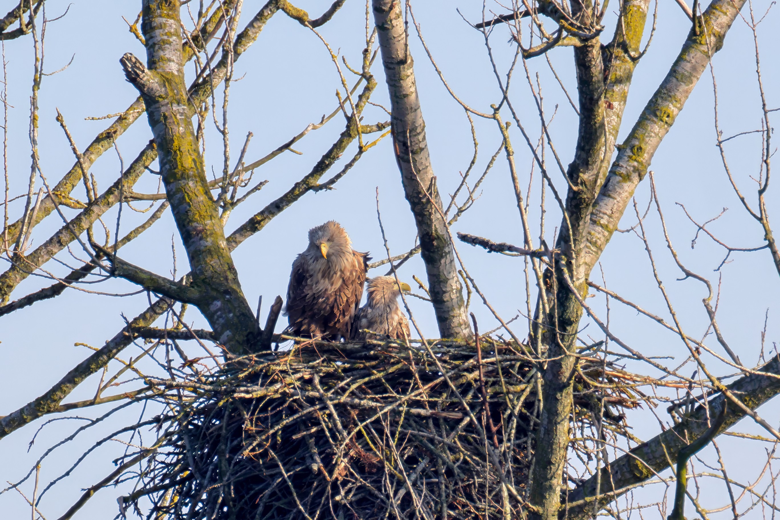 Auf der Bislicher Insel zeigt das Seeadlerpaar derzeit ein deutlich verändertes Verhalten: Der Horst wird nur noch verlassen, wenn ein Partner zurückbleibt und aufmerksam wacht. Dieses abgestimmte Verhalten spricht dafür, dass das Weibchen am Wochenende des 14./15. Februar ein Gelege produziert hat und damit die Brutphase 2026 eröffnet.