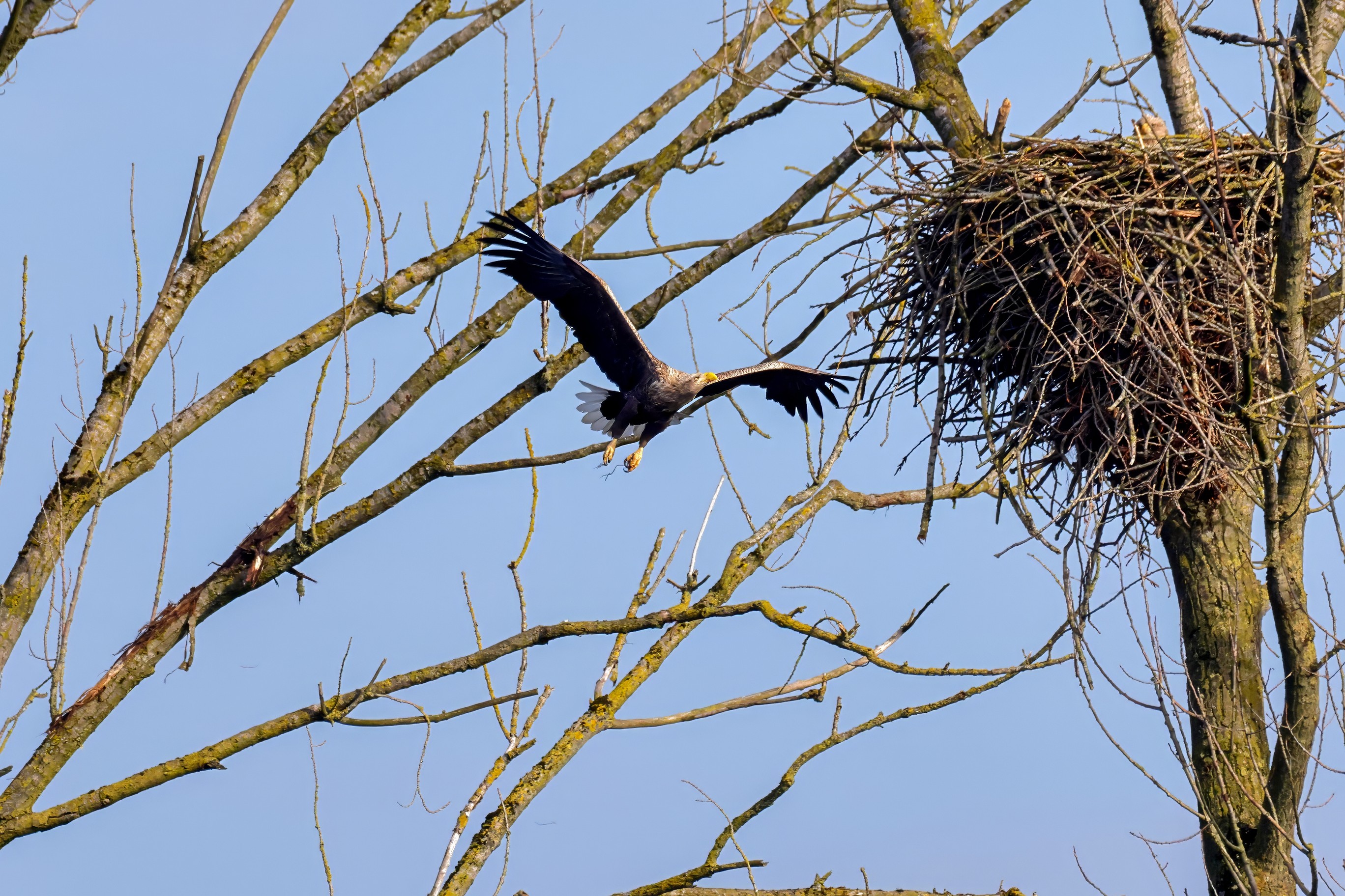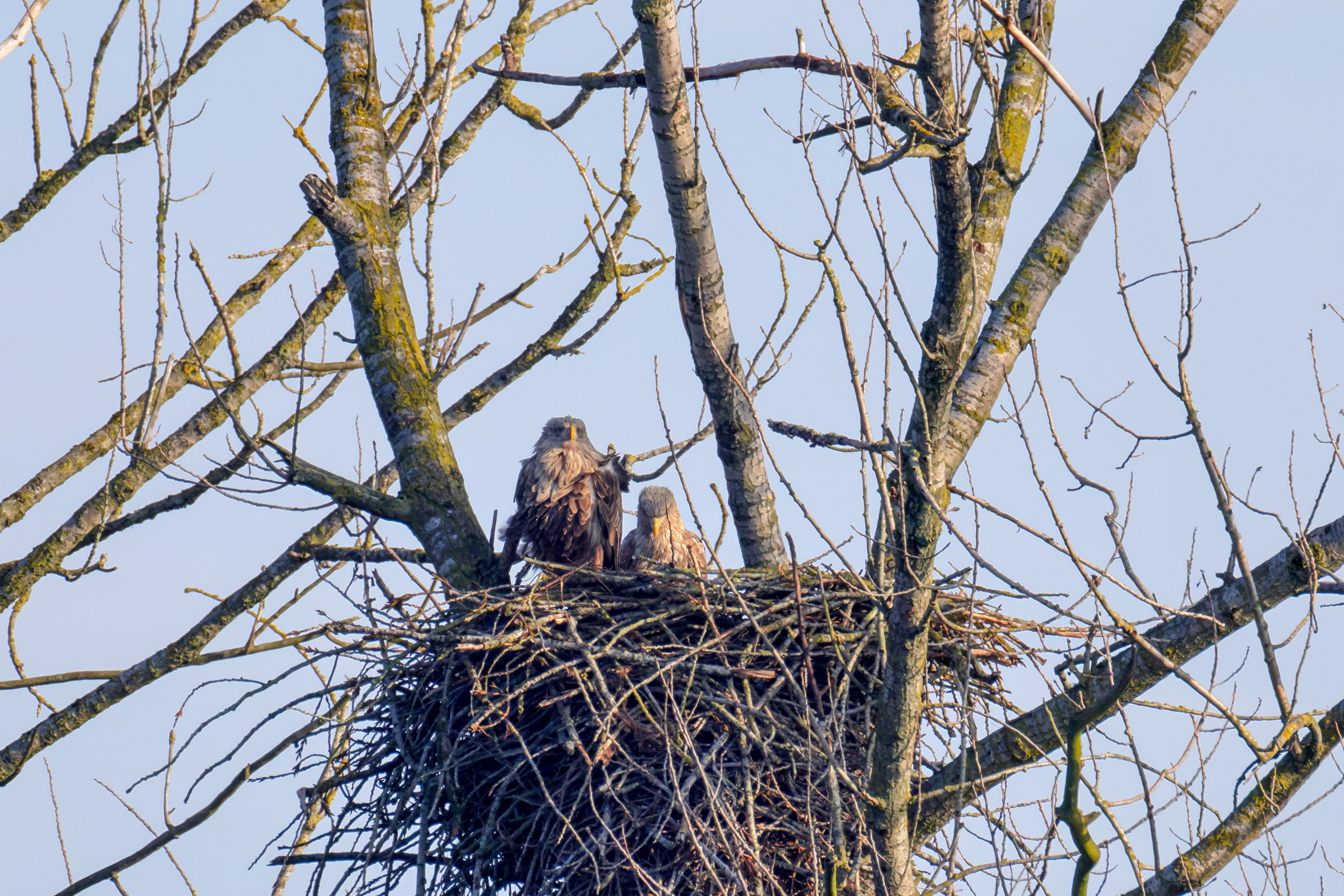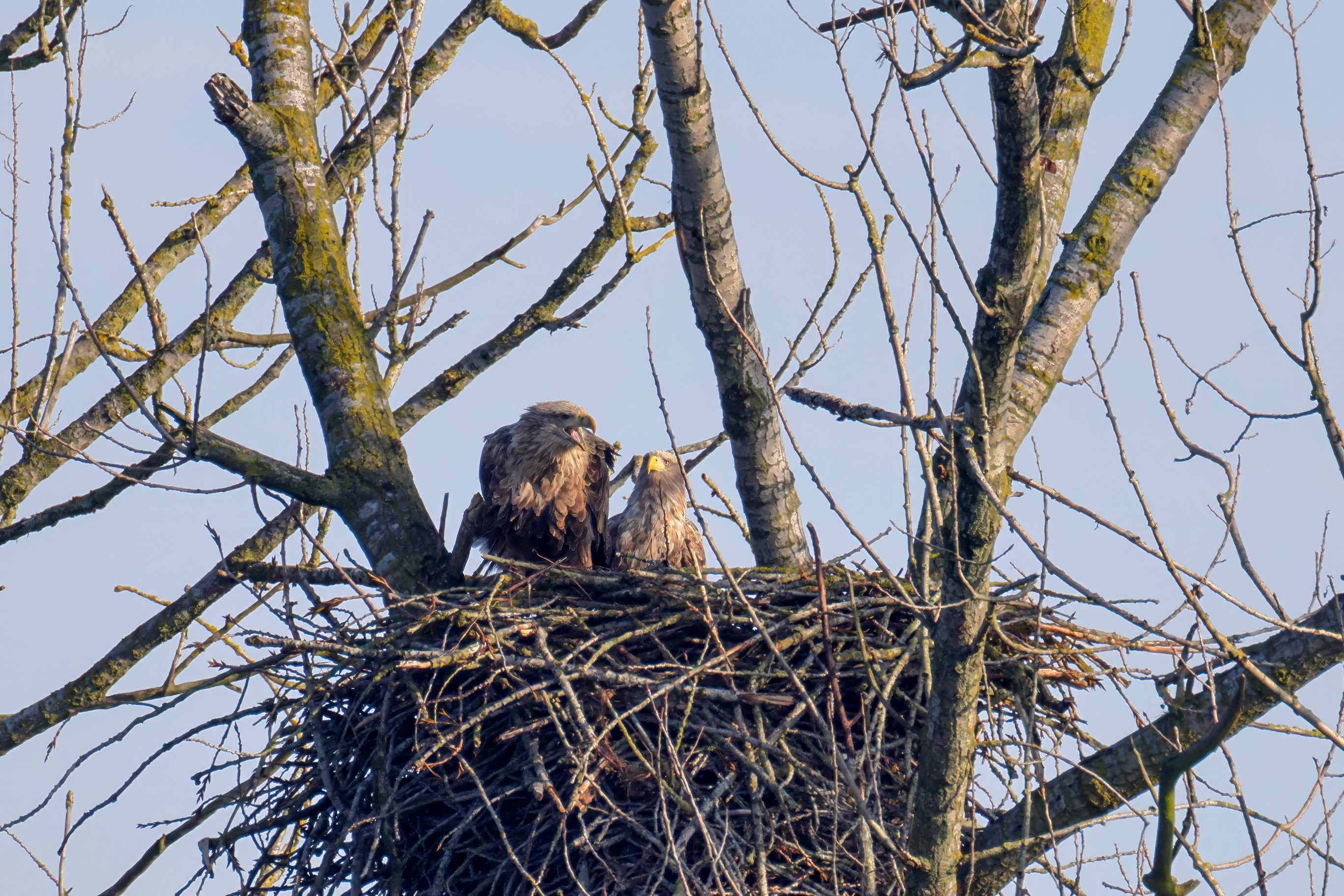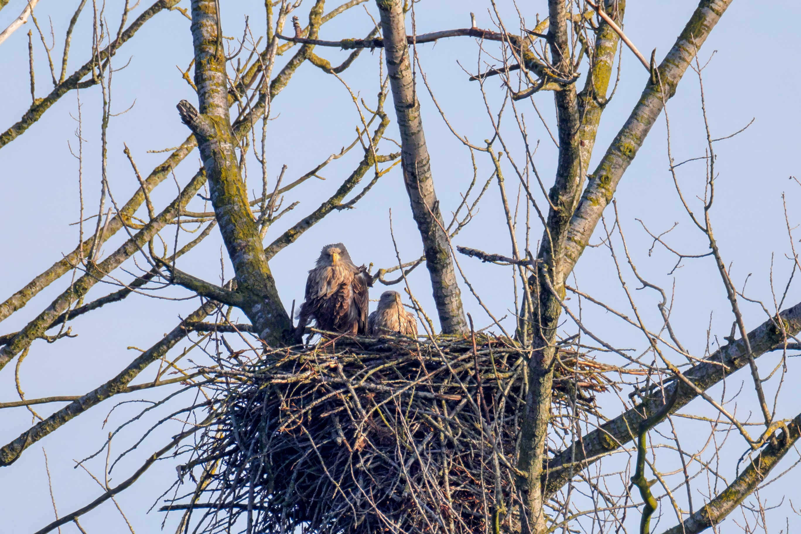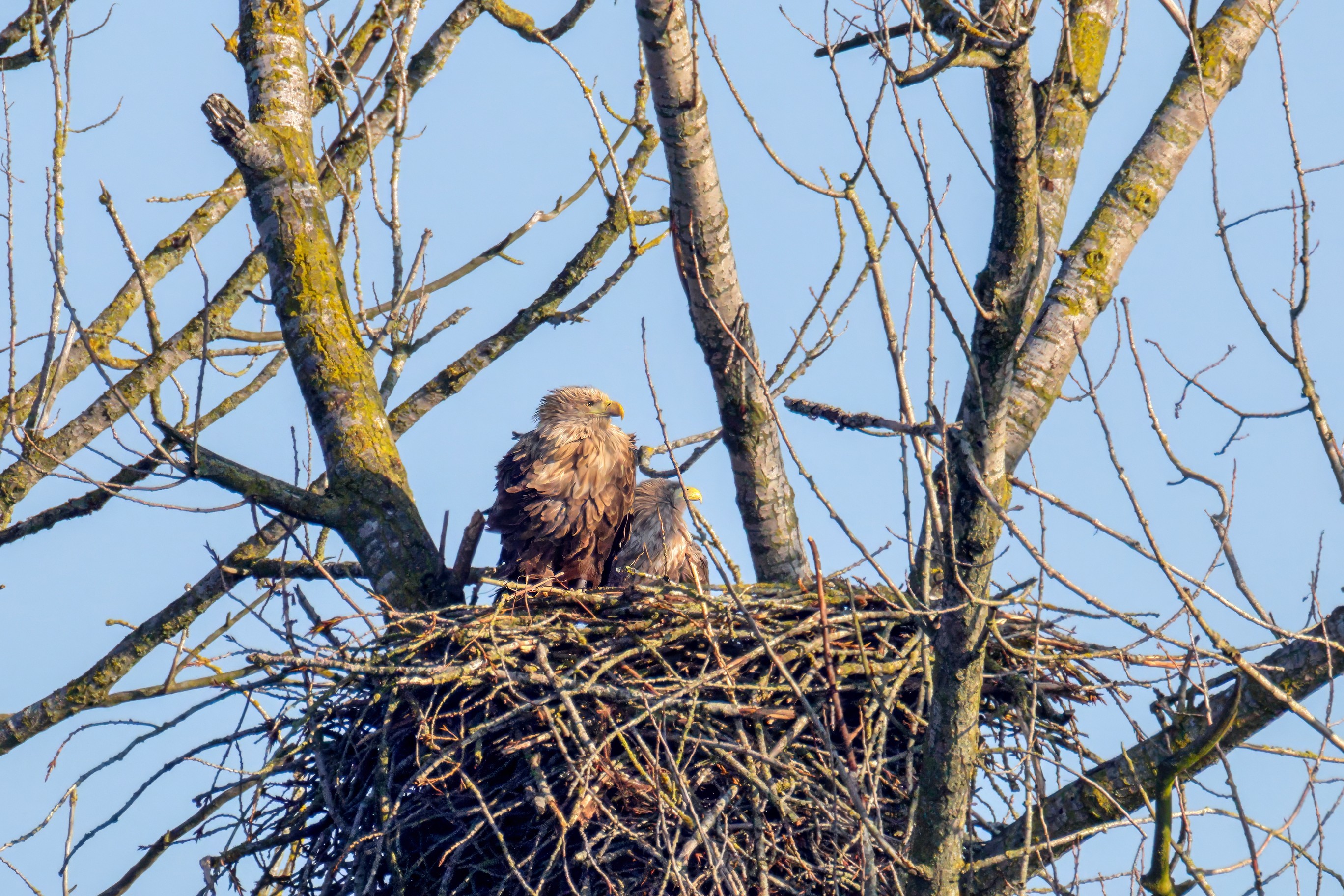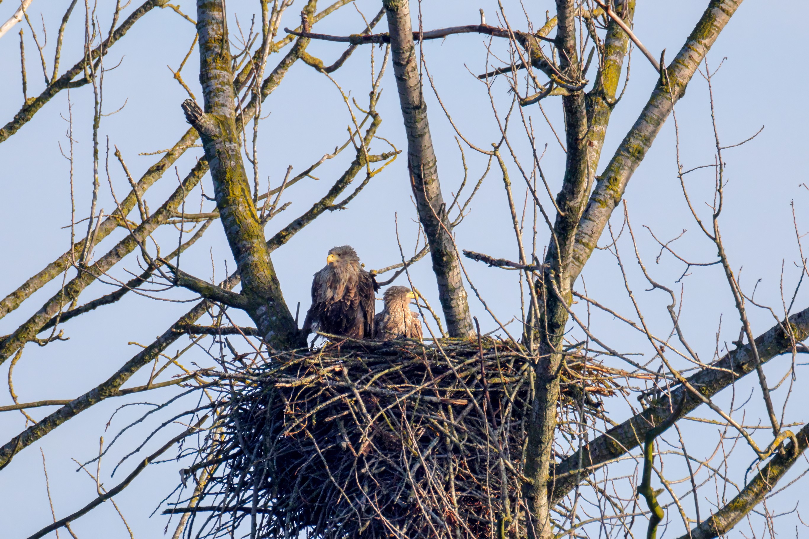 Auf der Bislicher Insel zeigt das Seeadlerpaar derzeit ein deutlich verändertes Verhalten: Der Horst wird nur noch verlassen, wenn ein Partner zurückbleibt und aufmerksam wacht. Dieses abgestimmte Verhalten spricht dafür, dass das Weibchen am Wochenende des 14./15. Februar ein Gelege produziert hat und damit die Brutphase 2026 eröffnet.