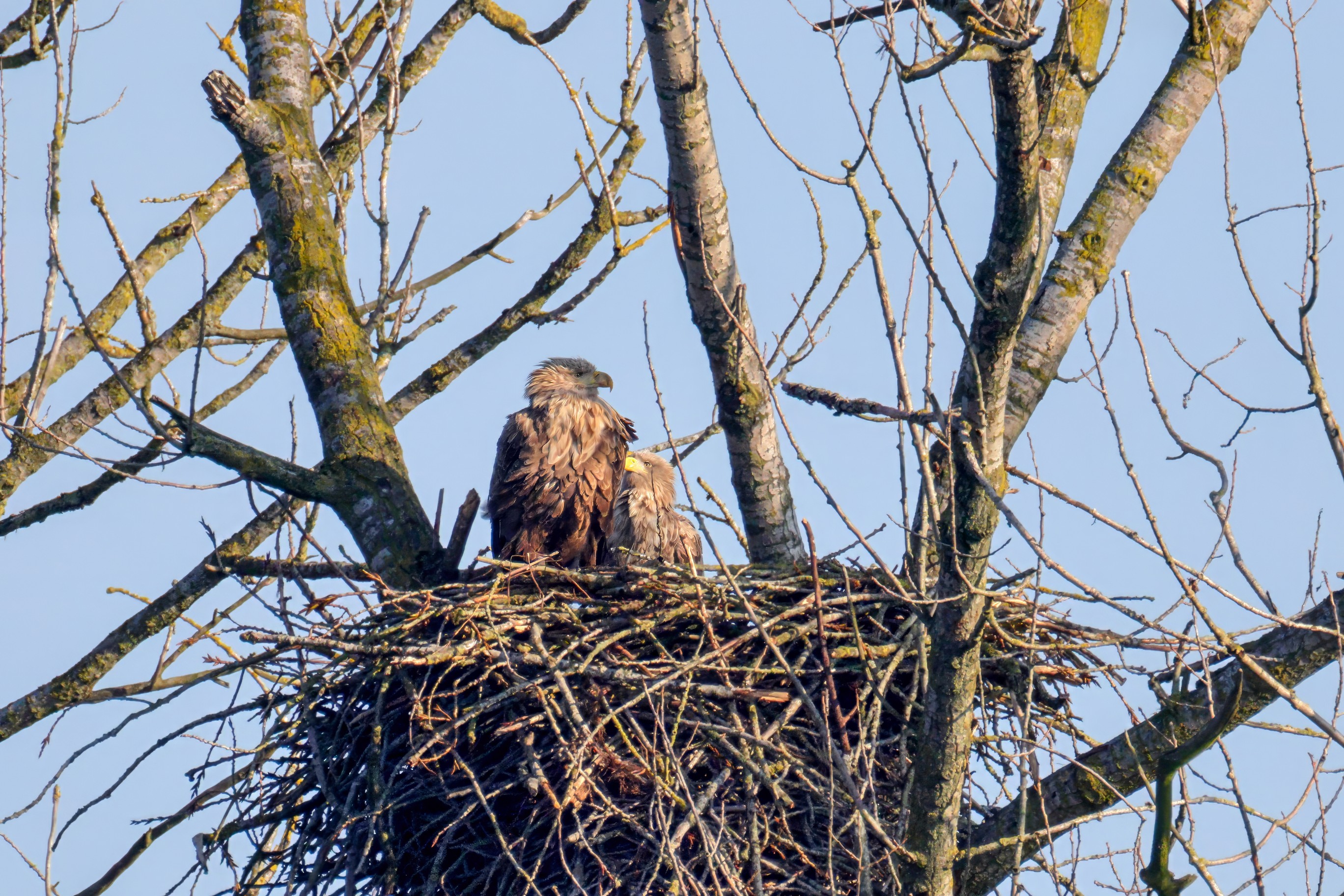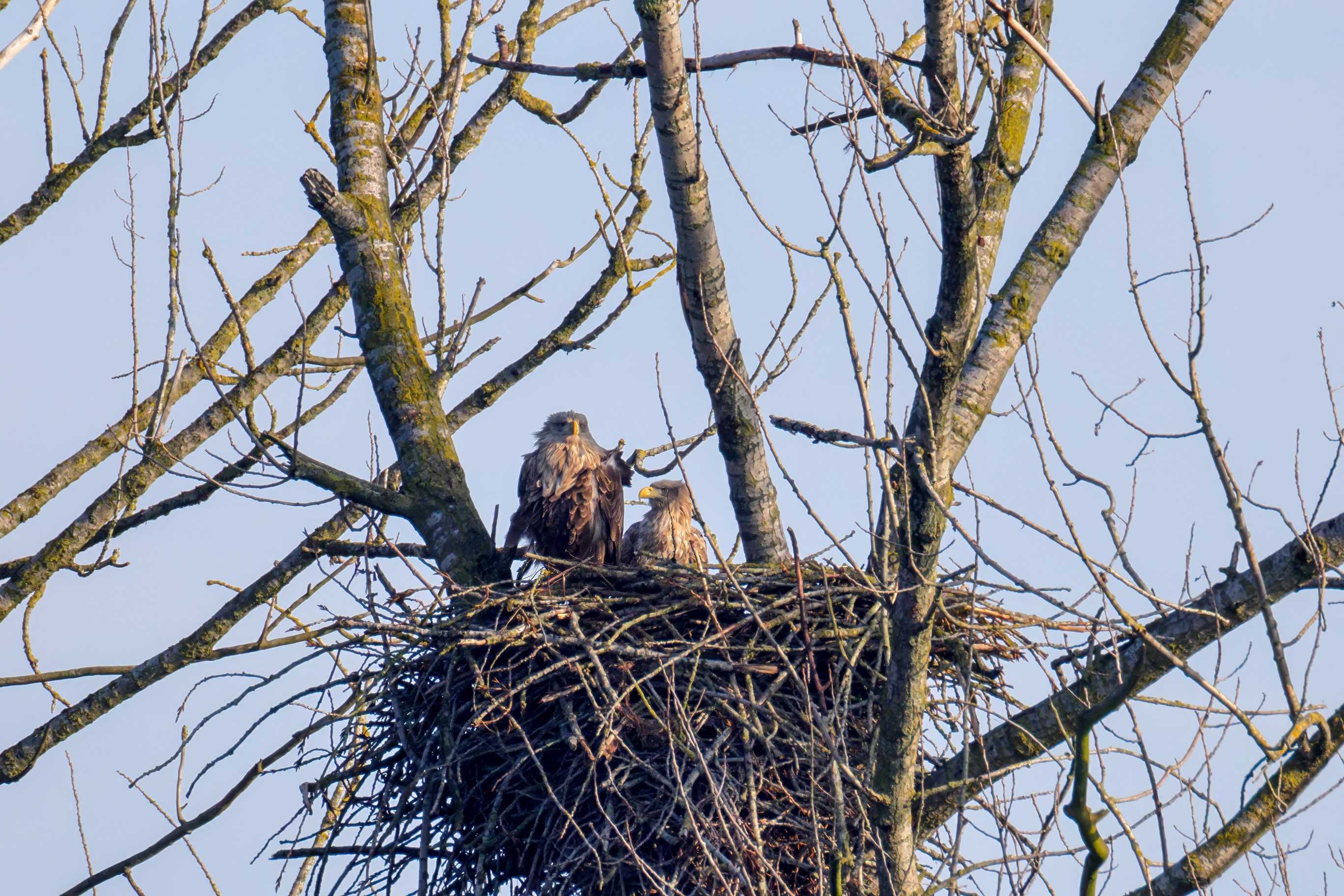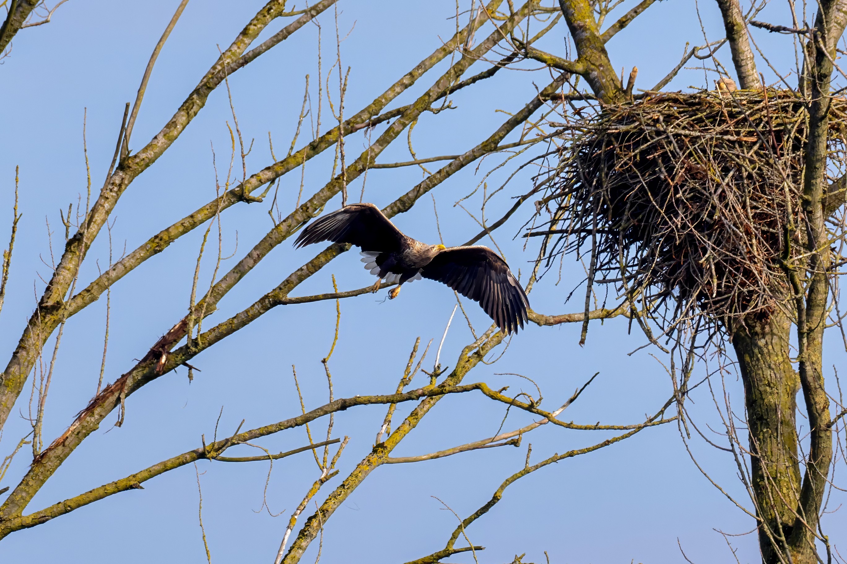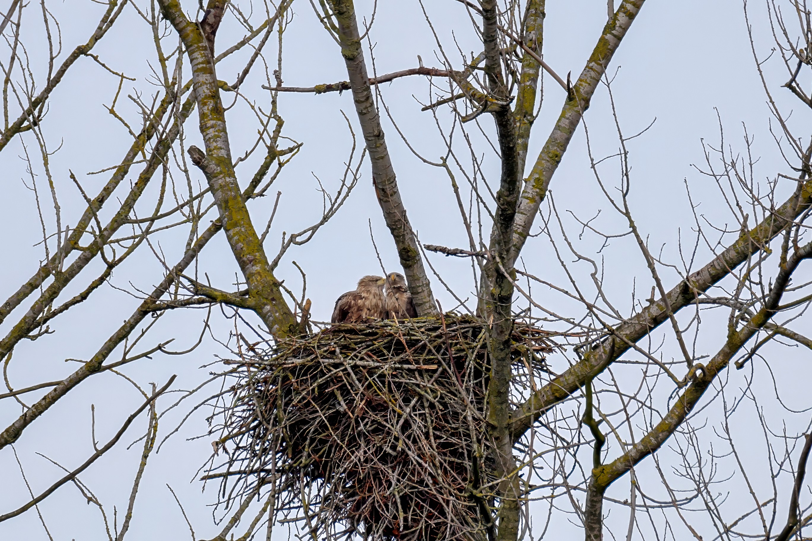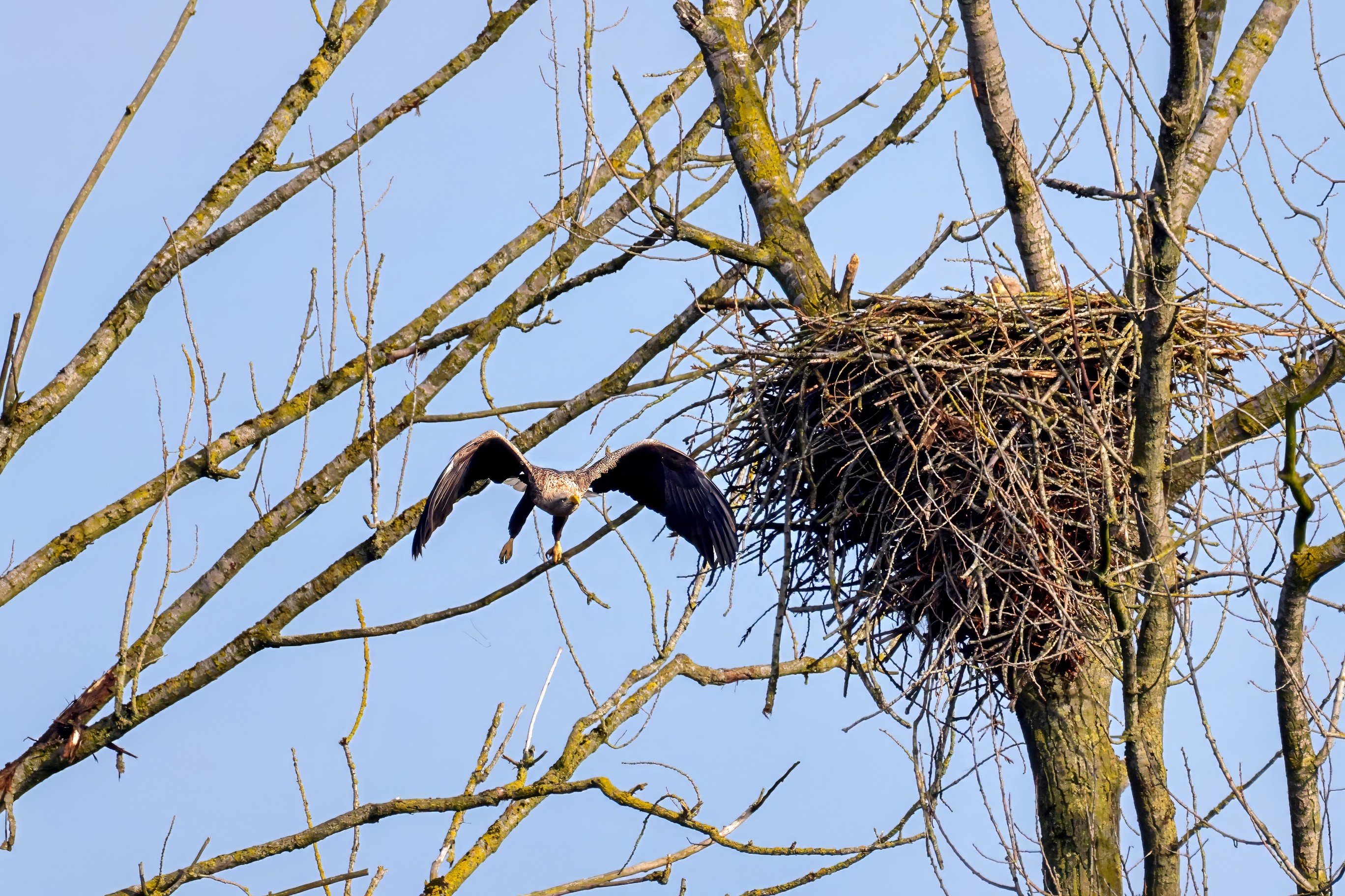 Auf der Bislicher Insel zeigt das Seeadlerpaar derzeit ein deutlich verändertes Verhalten: Der Horst wird nur noch verlassen, wenn ein Partner zurückbleibt und aufmerksam wacht. Dieses abgestimmte Verhalten spricht dafür, dass das Weibchen am Wochenende des 14./15. Februar ein Gelege produziert hat und damit die Brutphase 2026 eröffnet.