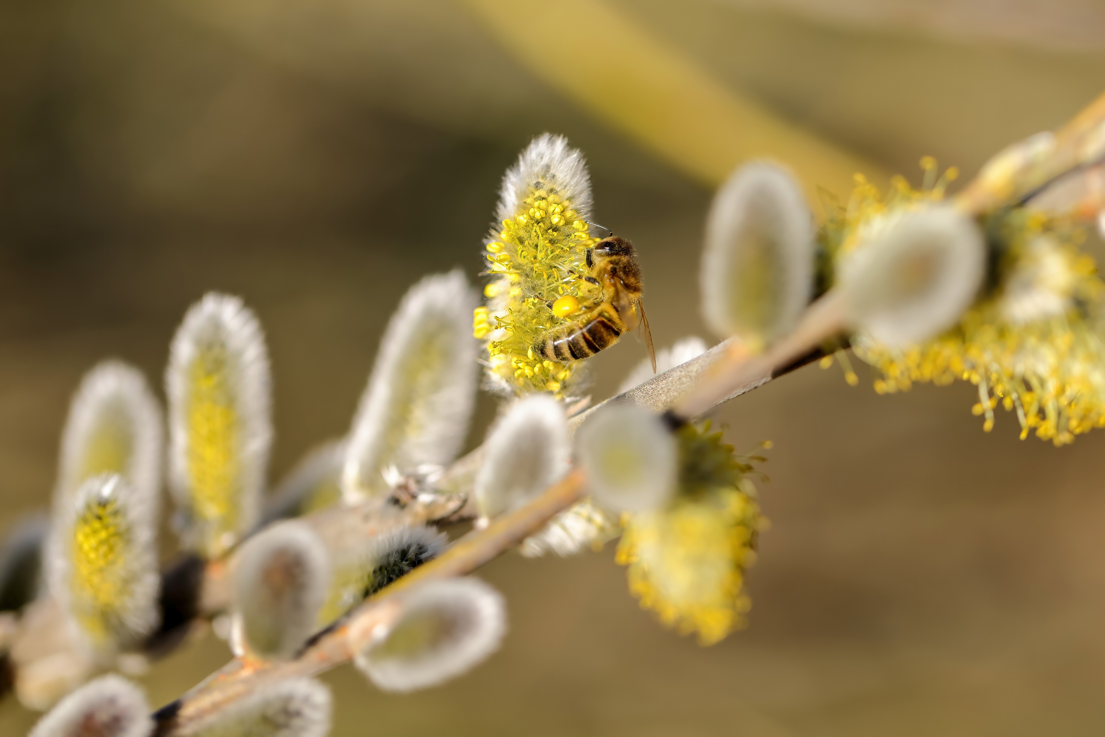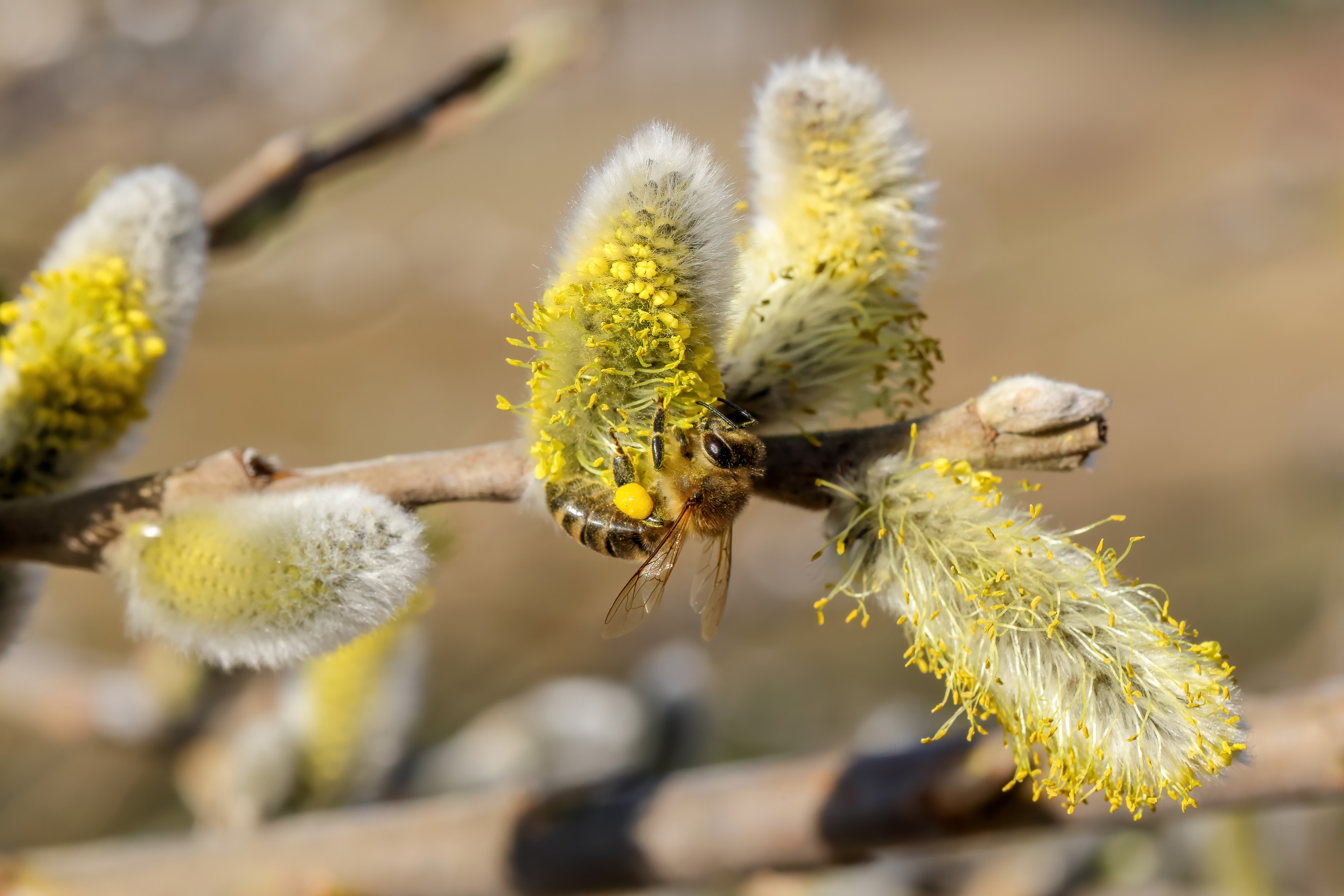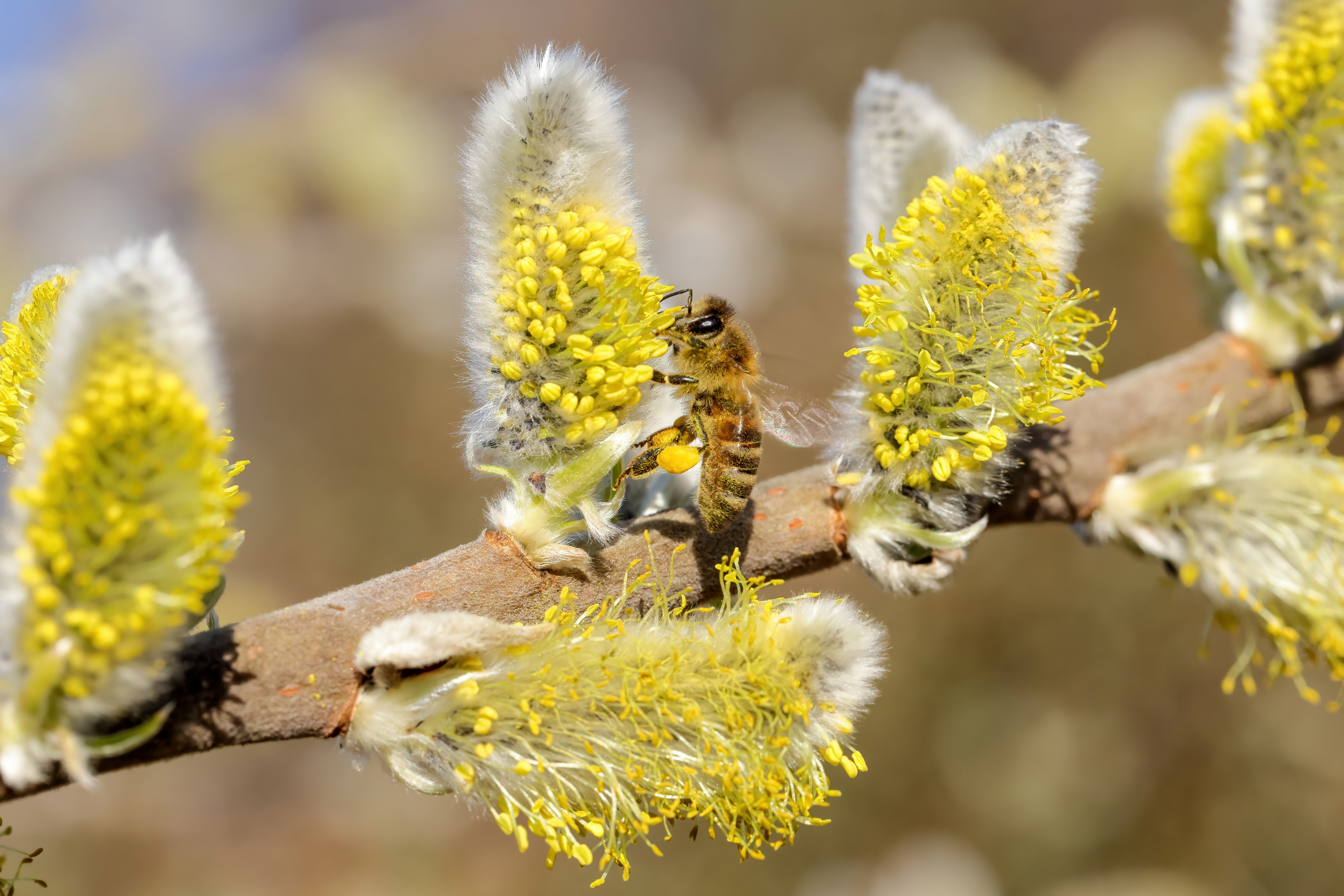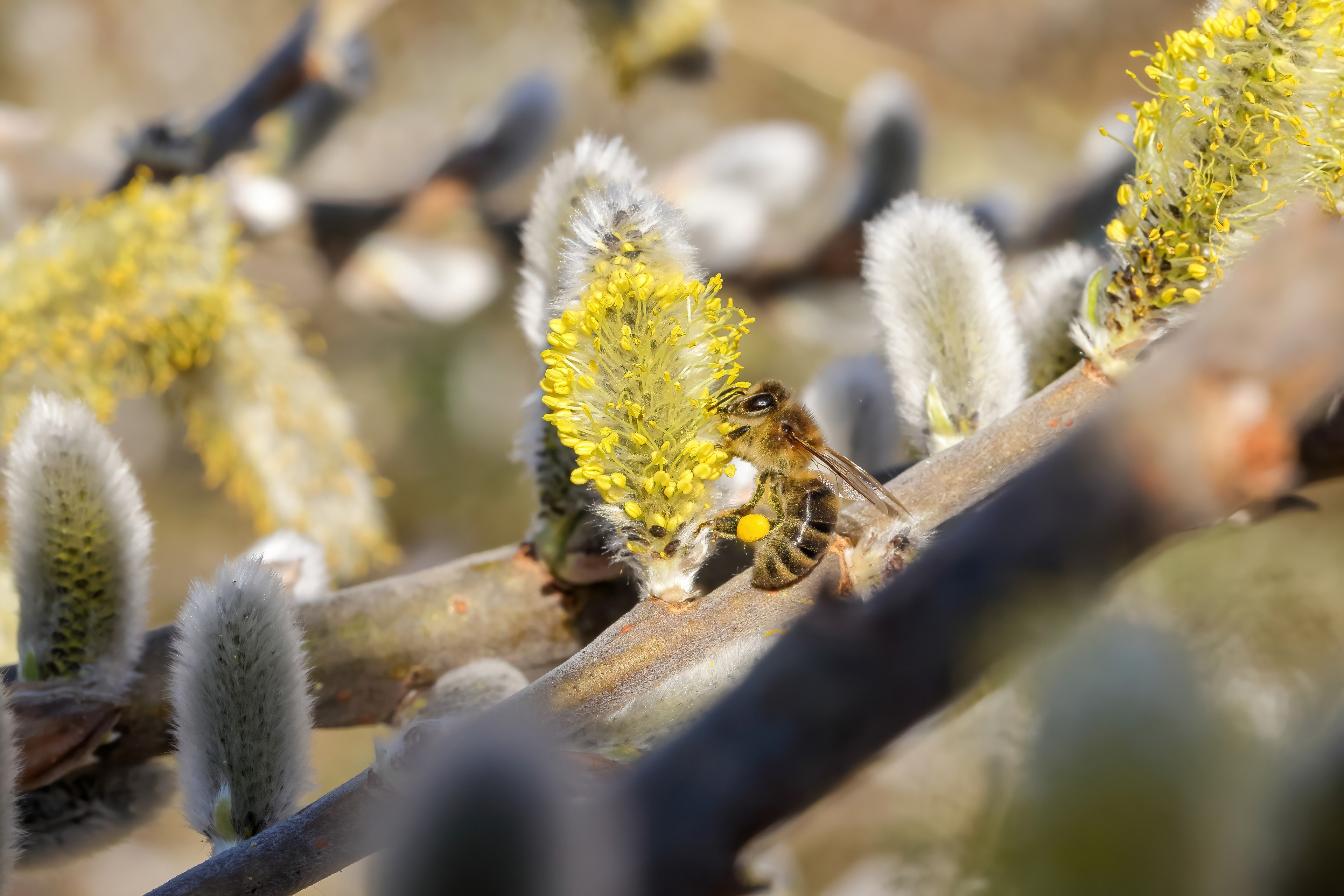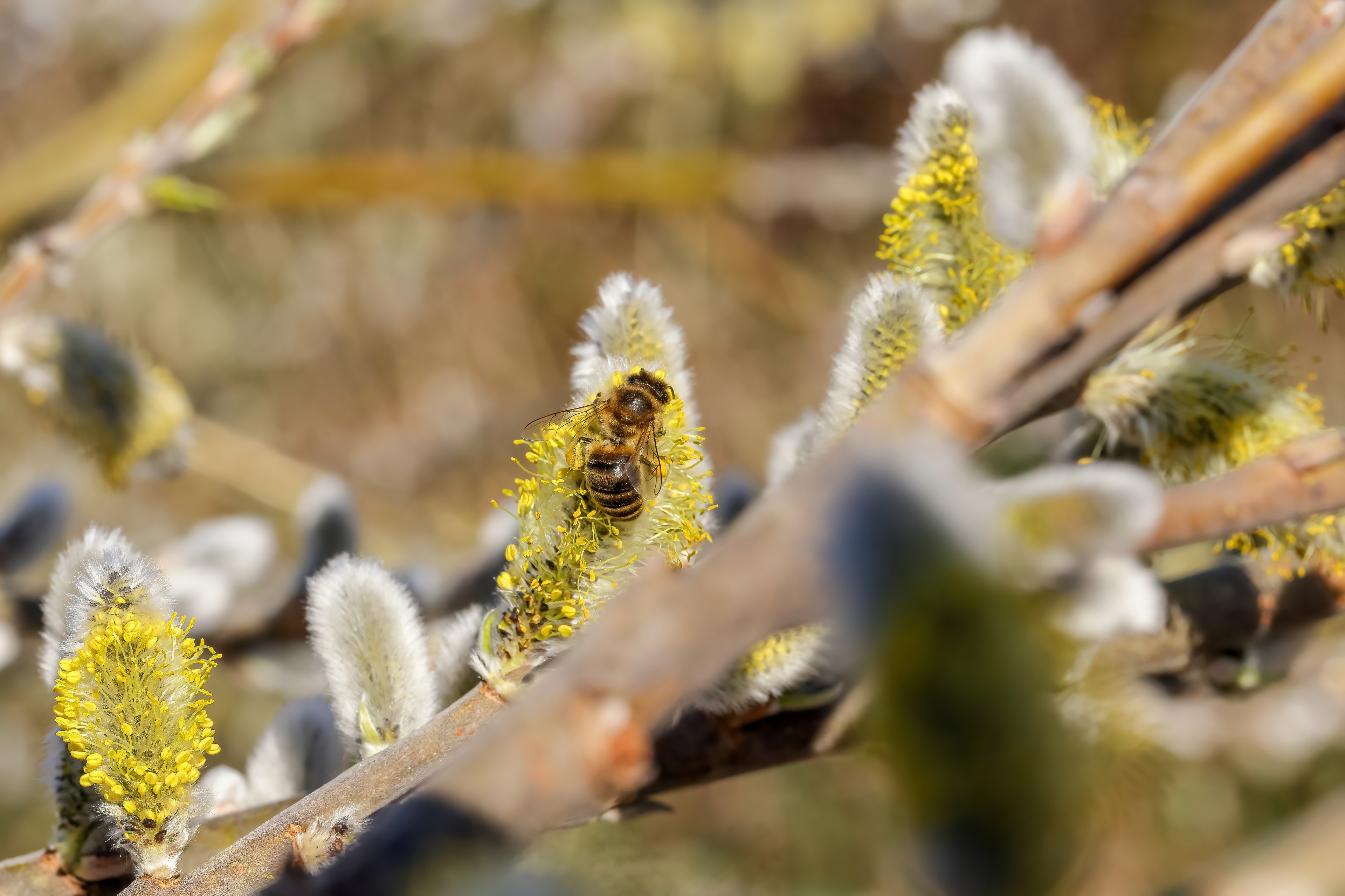 Die ersten Weidenkätzchen werden von den Bienen aufgesucht