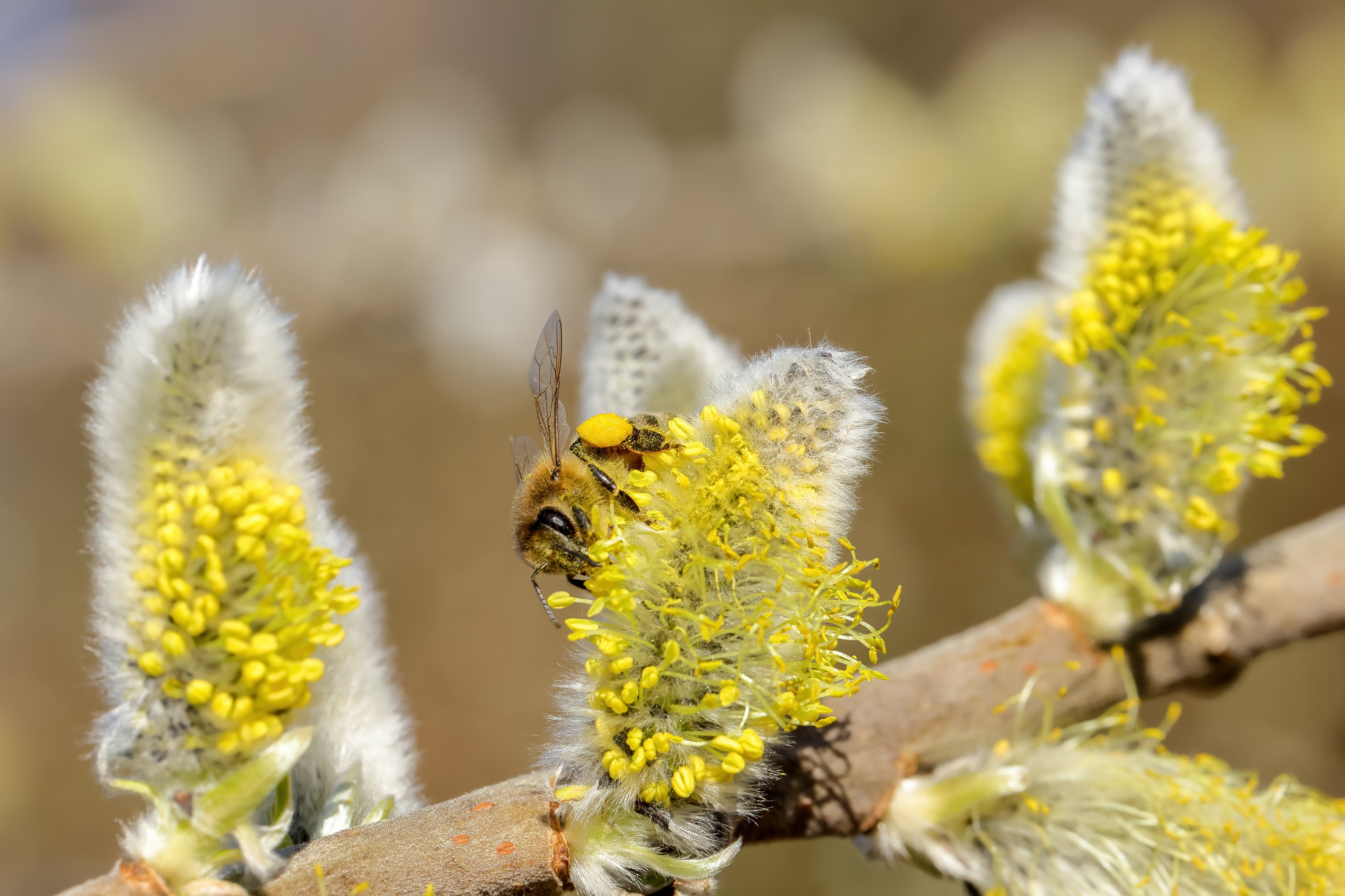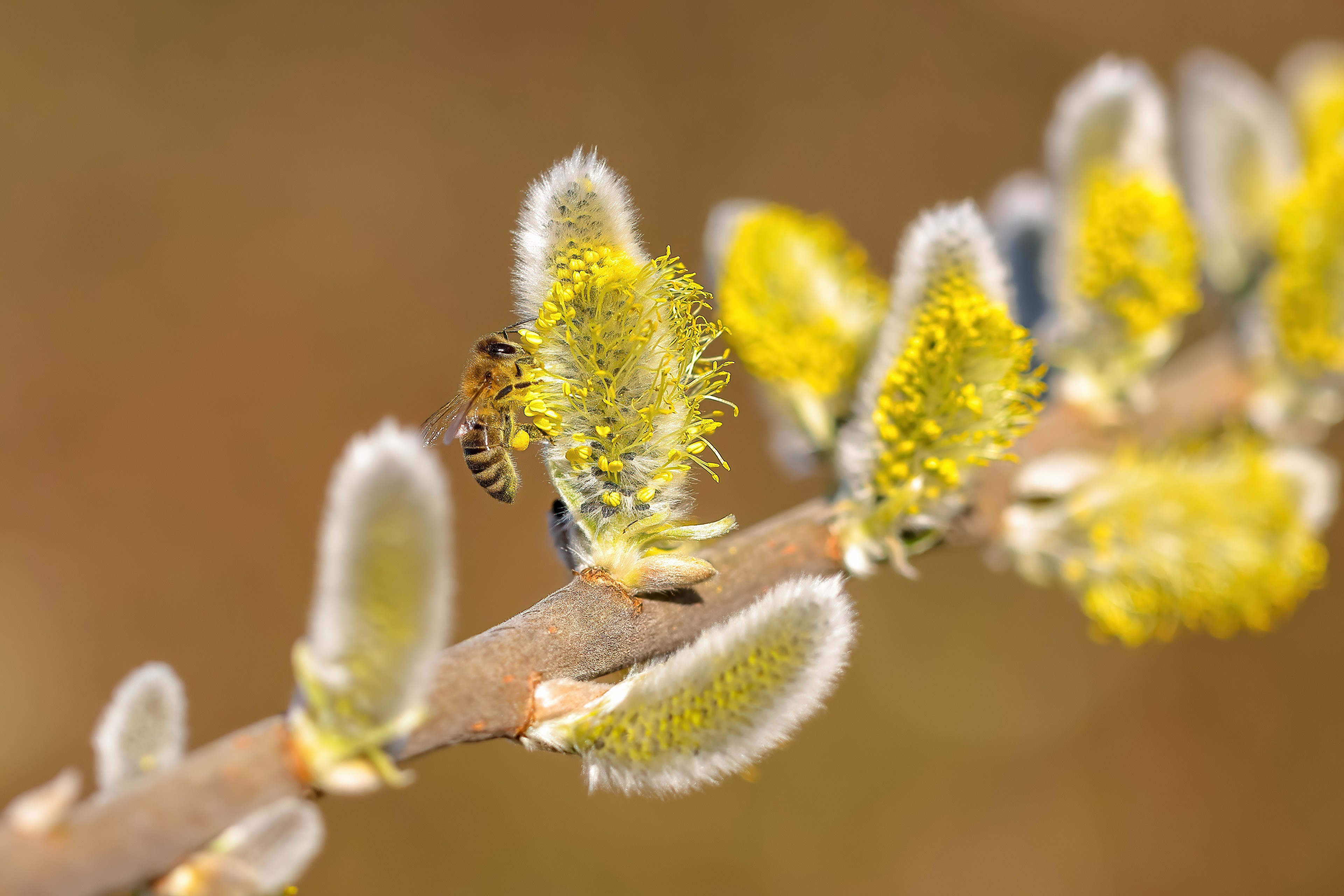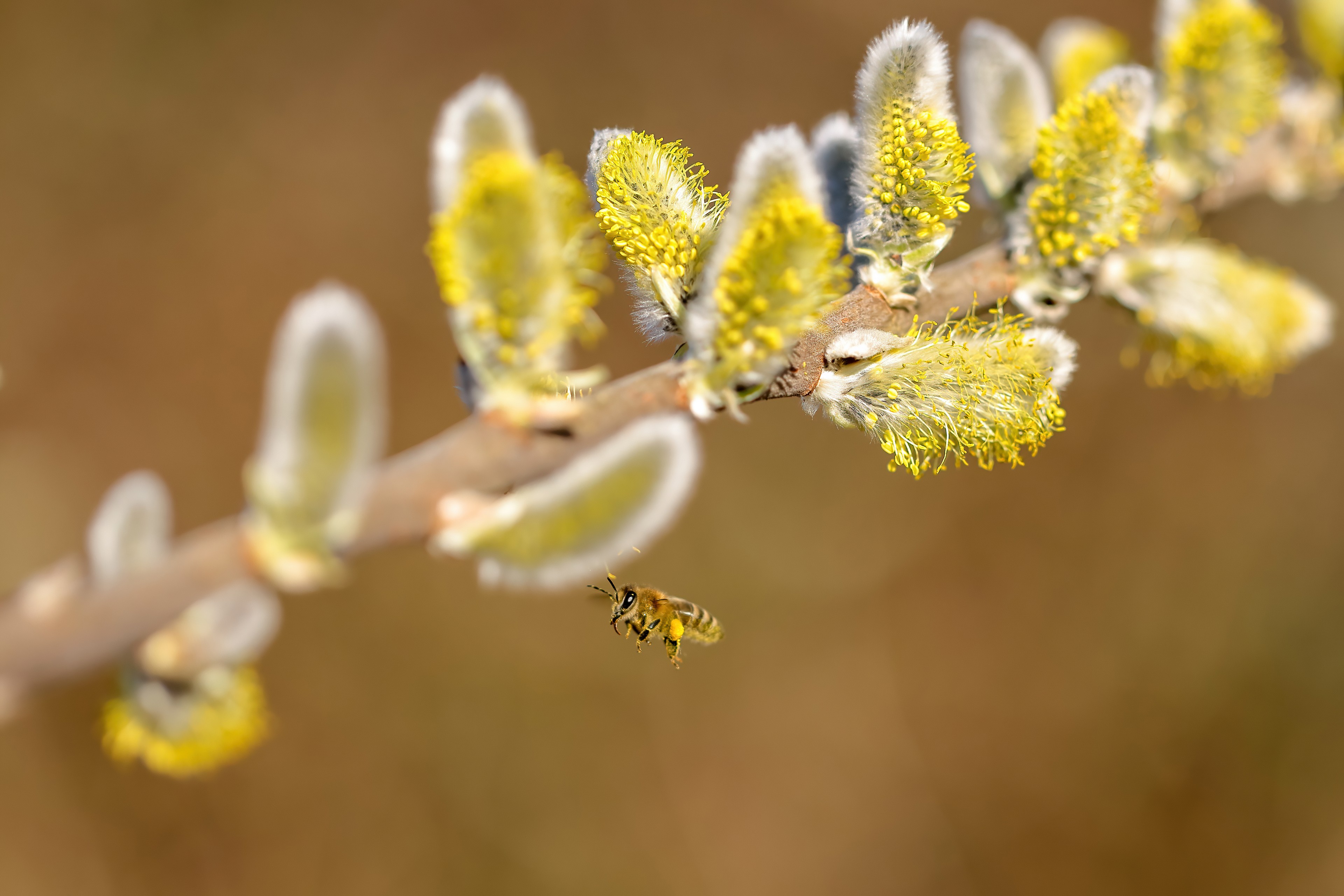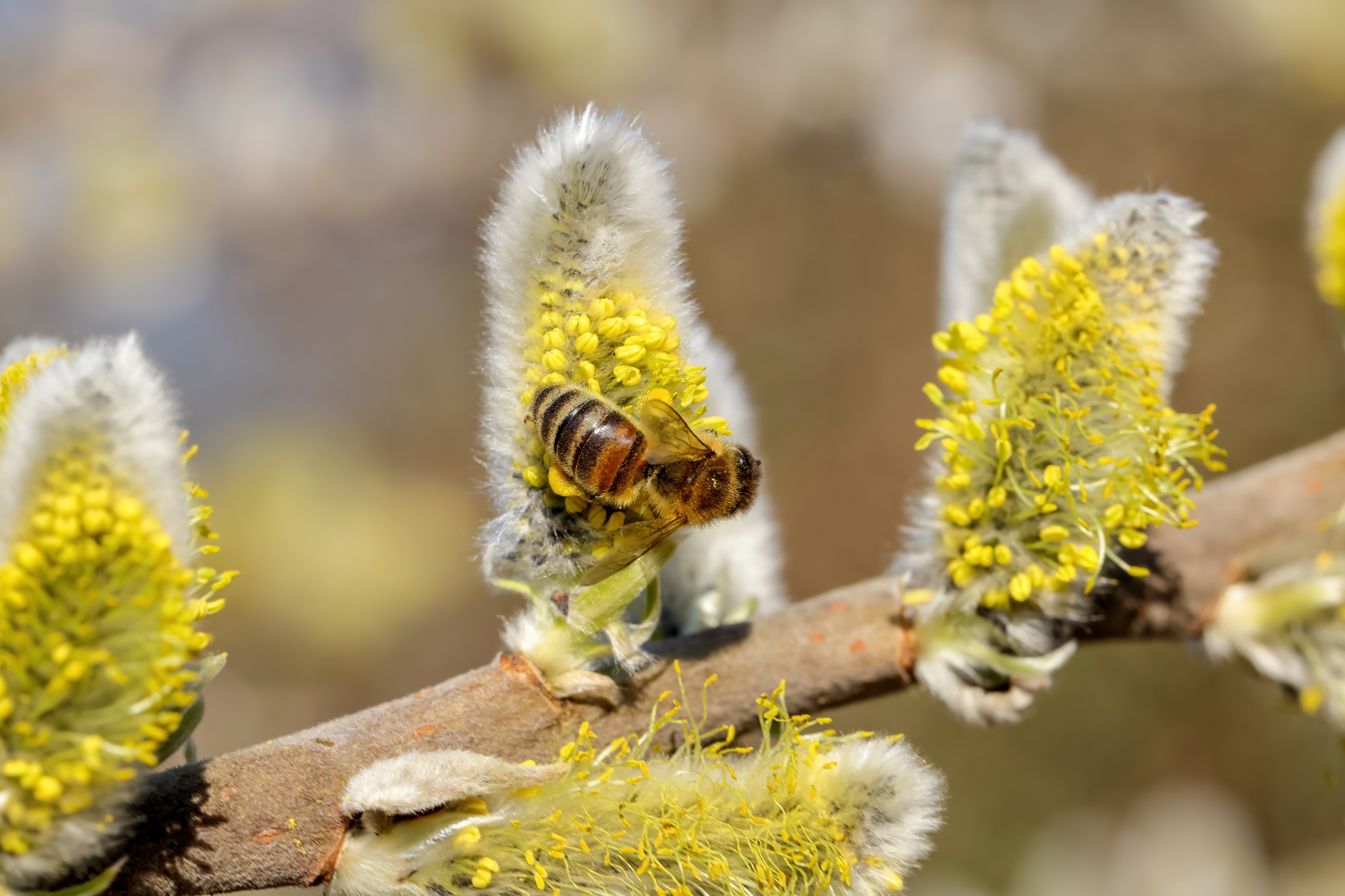 Die ersten Weidenkätzchen werden von den Bienen aufgesucht