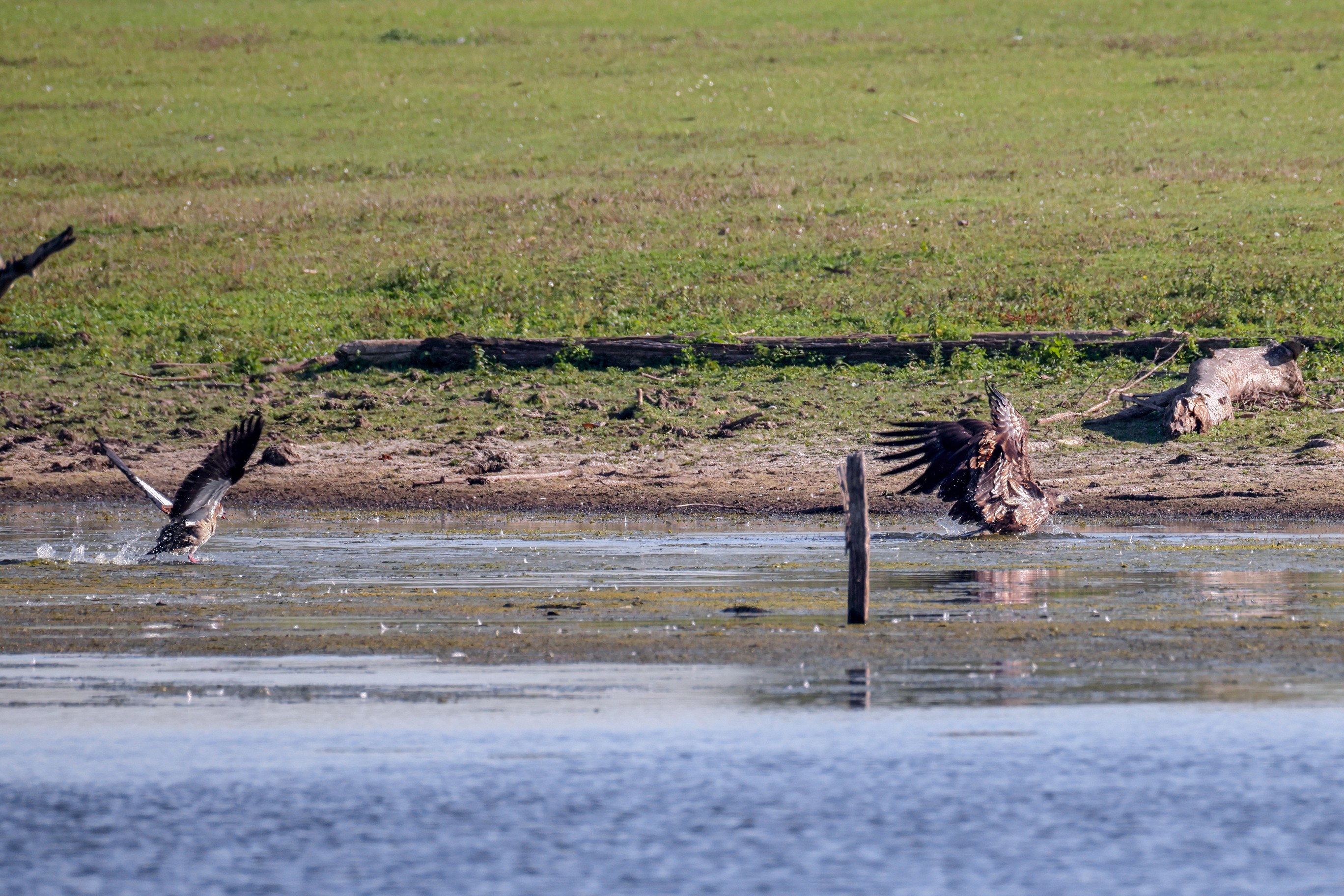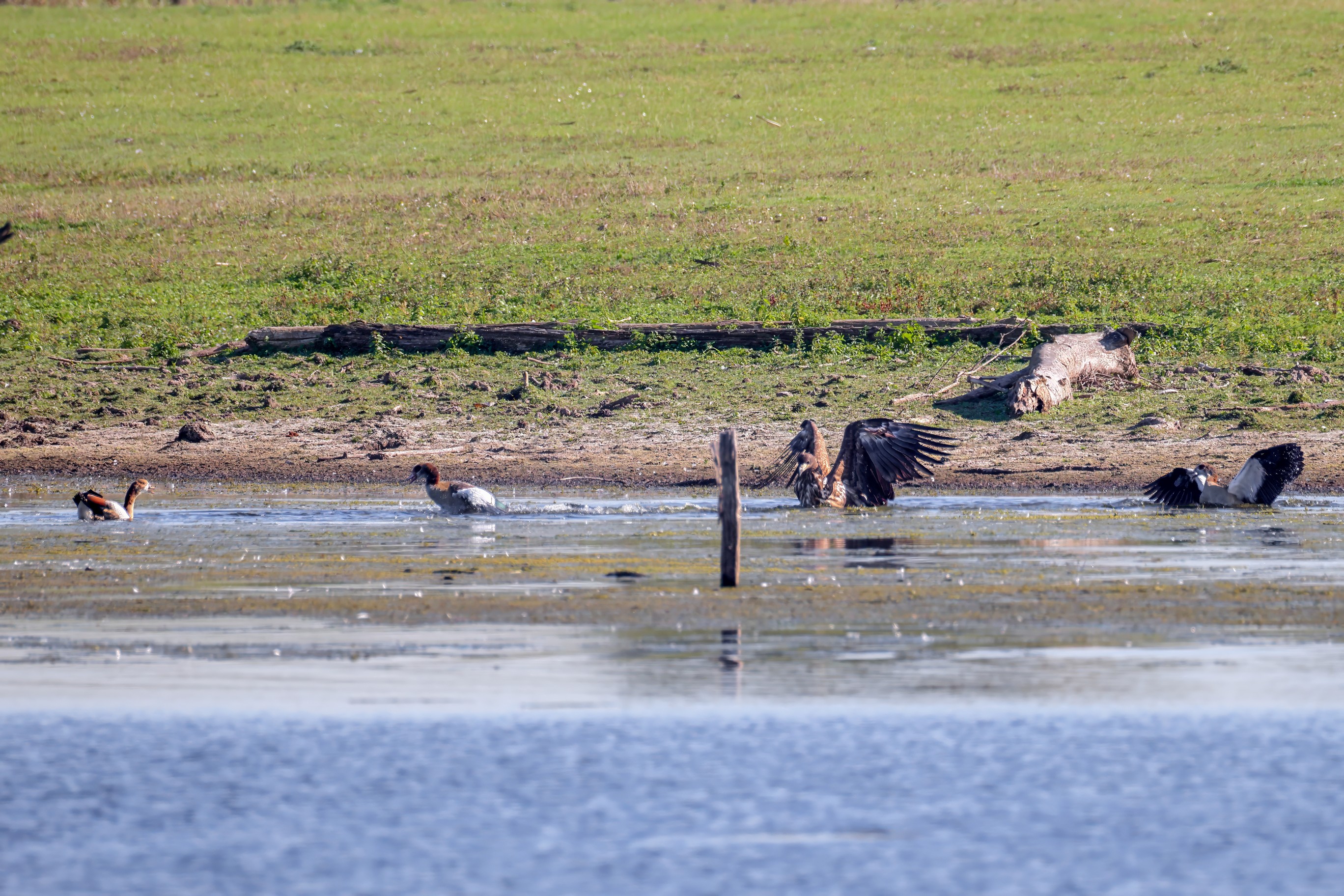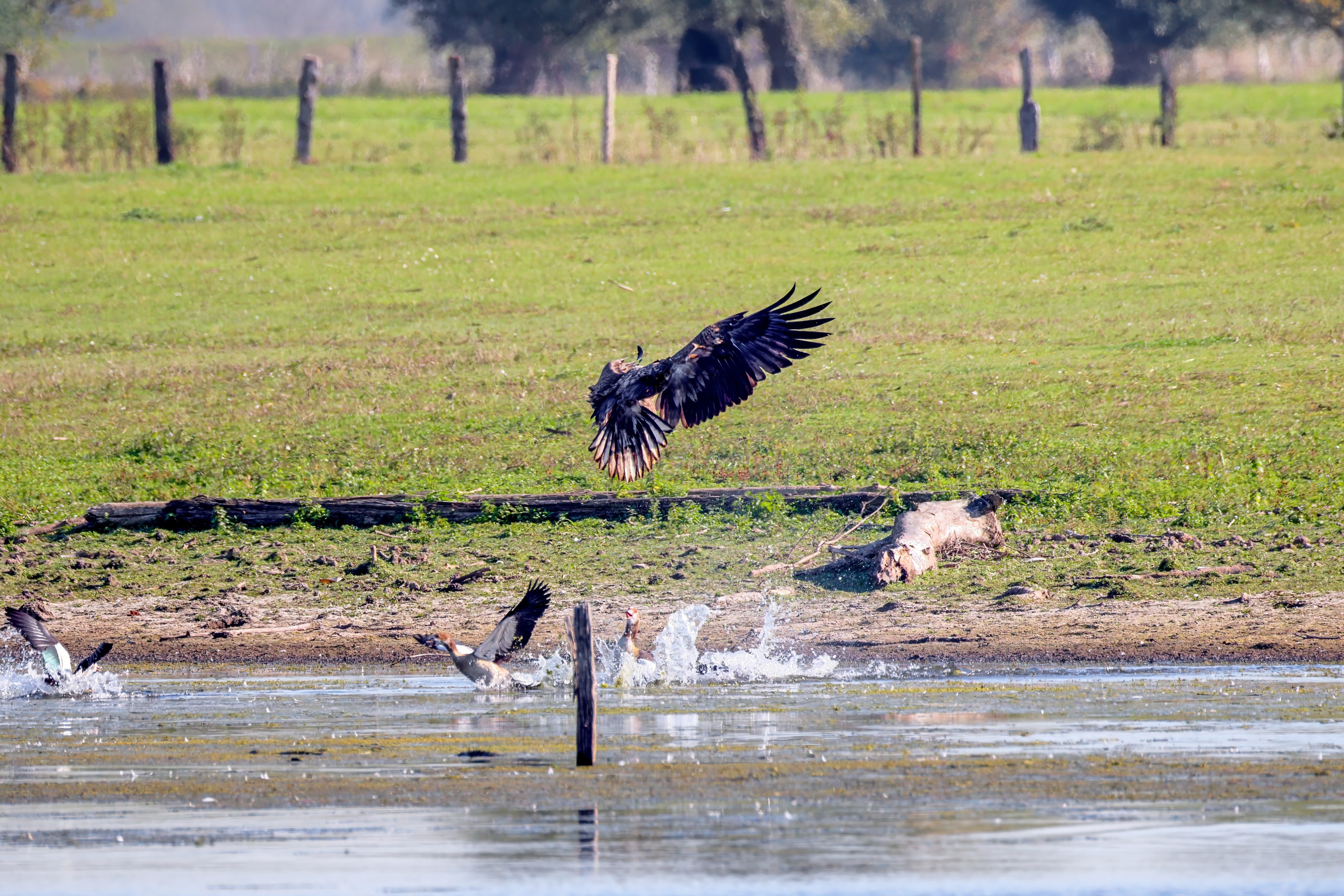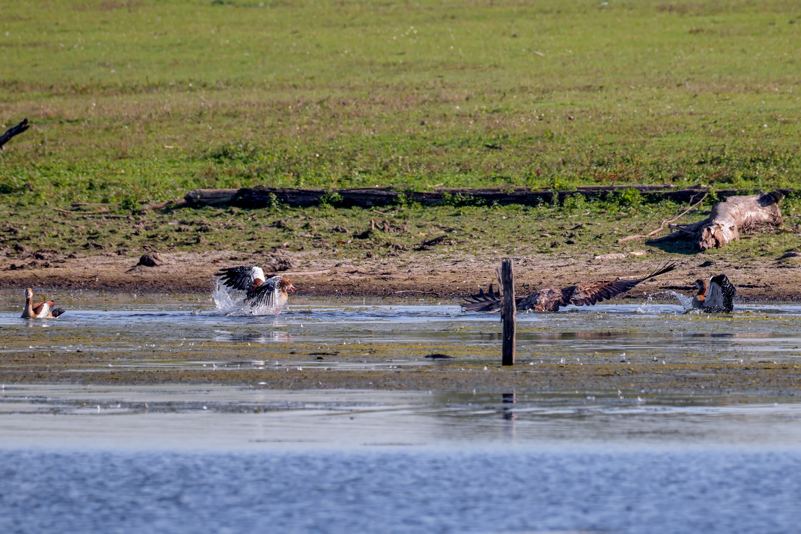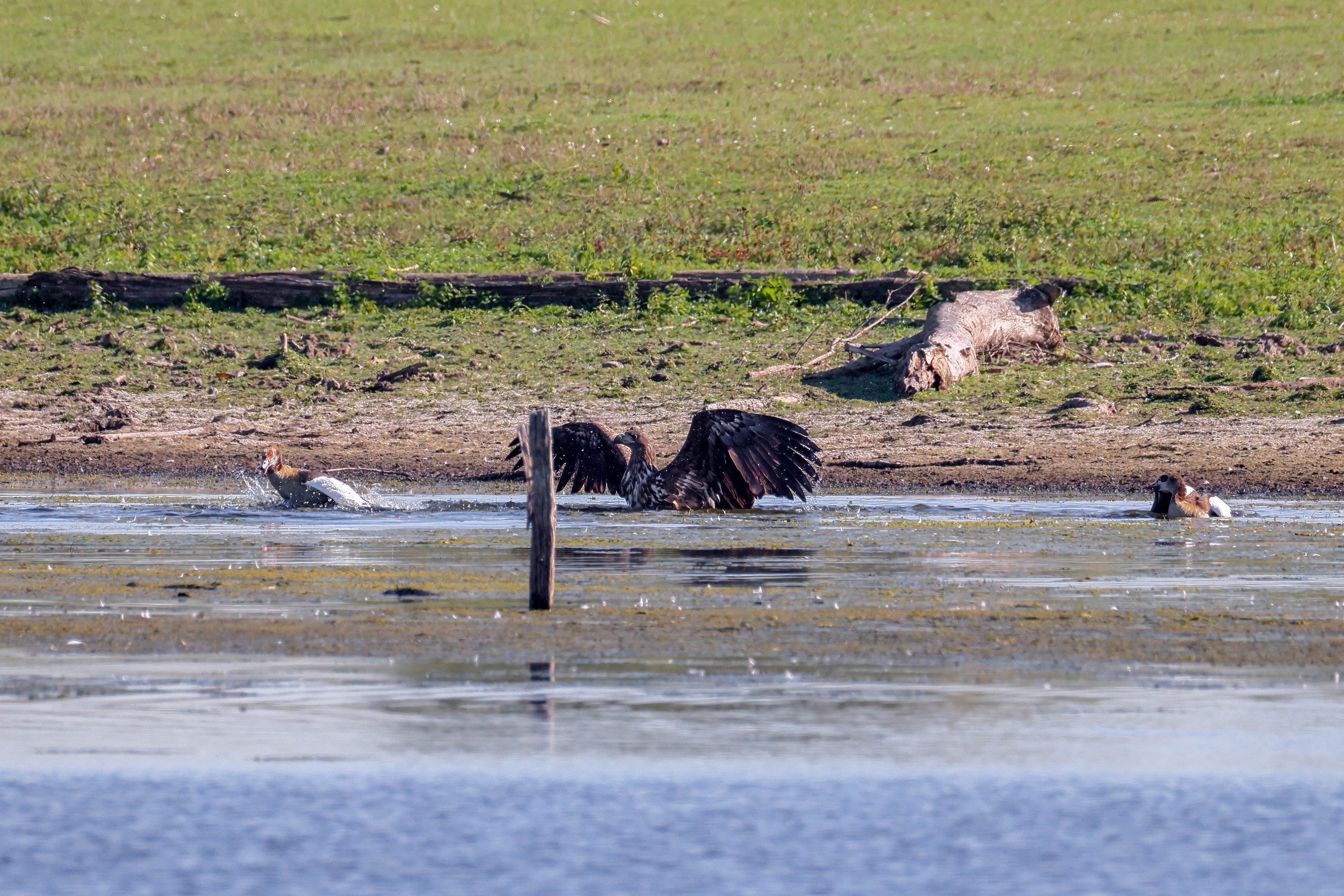 Ein besonders eindrucksvolles Erlebnis bot sich beim Versuch eine junge Nilgans zu erbeuten. Die entschlossene Abwehr der Nilganseltern überraschte den jungen Adler sichtlich und brachte ihm eine deutliche Lektion ein. Aus dieser Niederlage wird er lernen müssen künftig eine überlegtere Strategie zu wählen, wenn er sich an wehrhaft umsorgte Beute heranwagt.