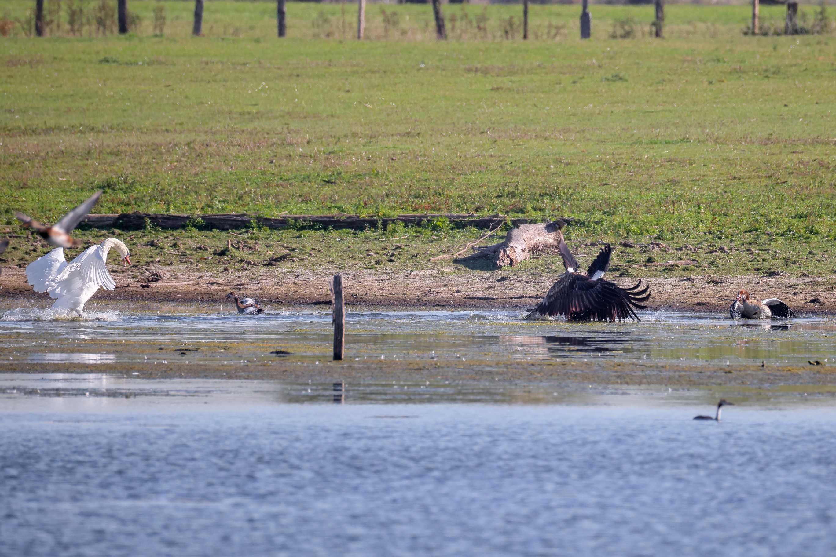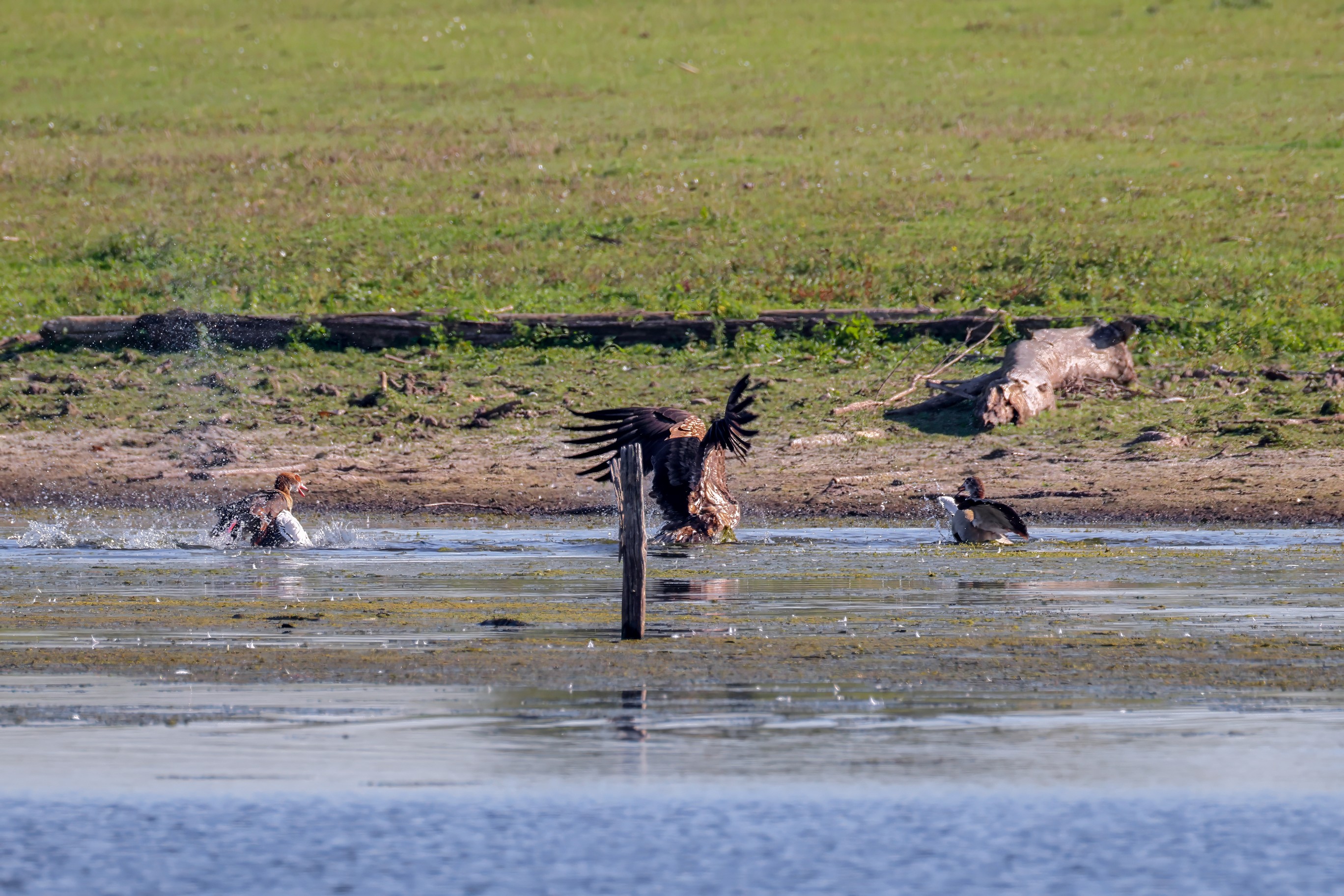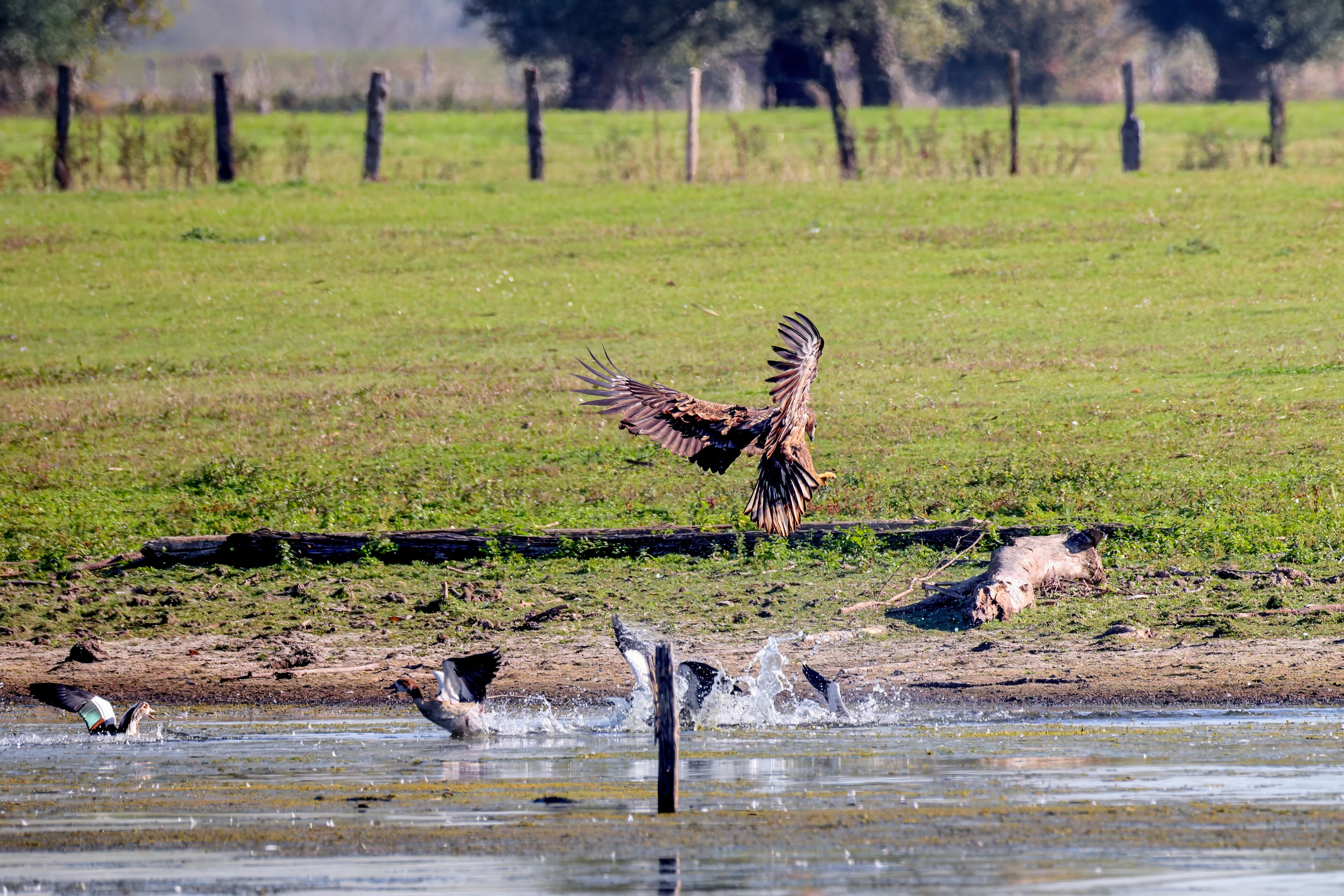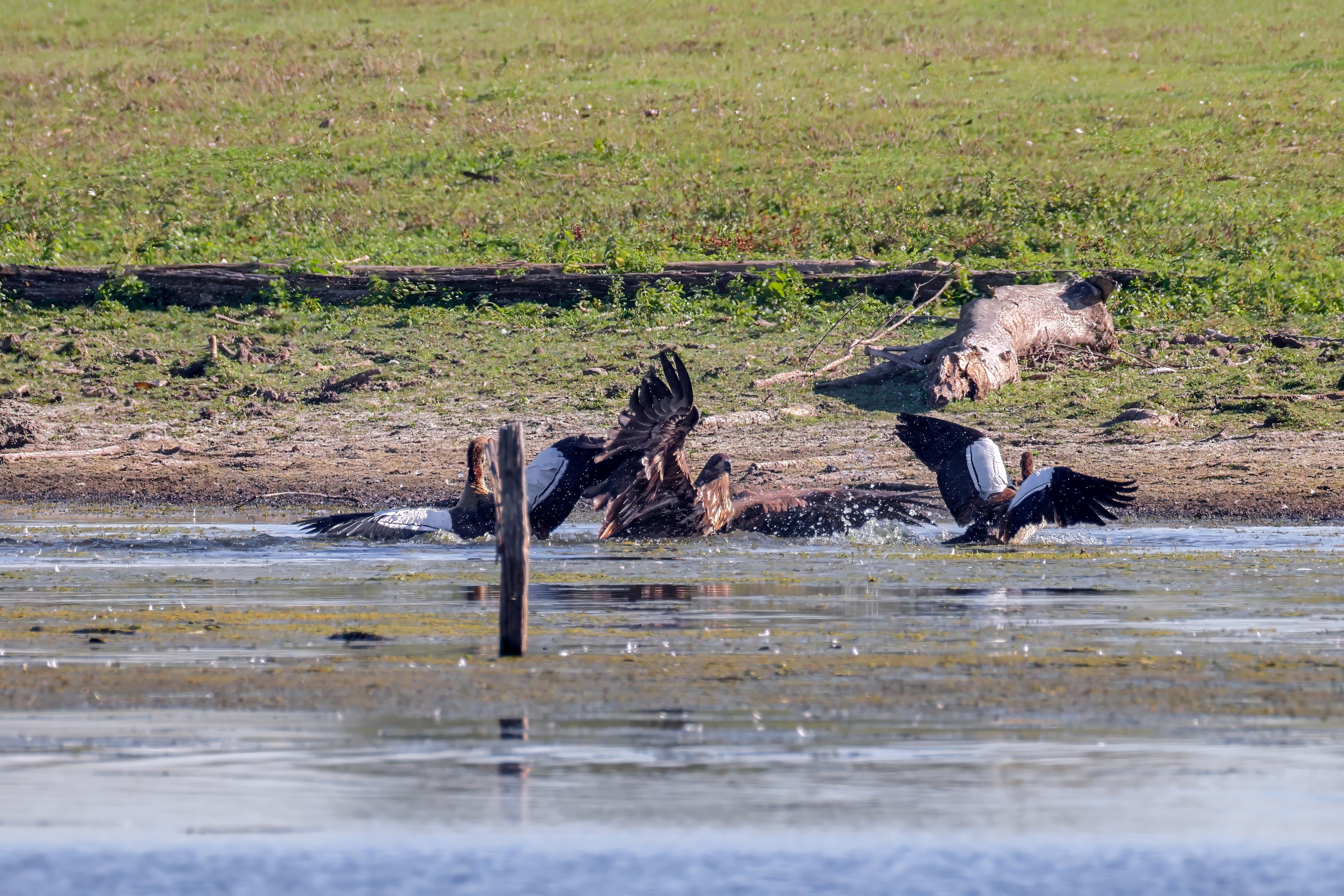 Ein besonders eindrucksvolles Erlebnis bot sich beim Versuch eine junge Nilgans zu erbeuten. Die entschlossene Abwehr der Nilganseltern überraschte den jungen Adler sichtlich und brachte ihm eine deutliche Lektion ein. Aus dieser Niederlage wird er lernen müssen künftig eine überlegtere Strategie zu wählen, wenn er sich an wehrhaft umsorgte Beute heranwagt.
