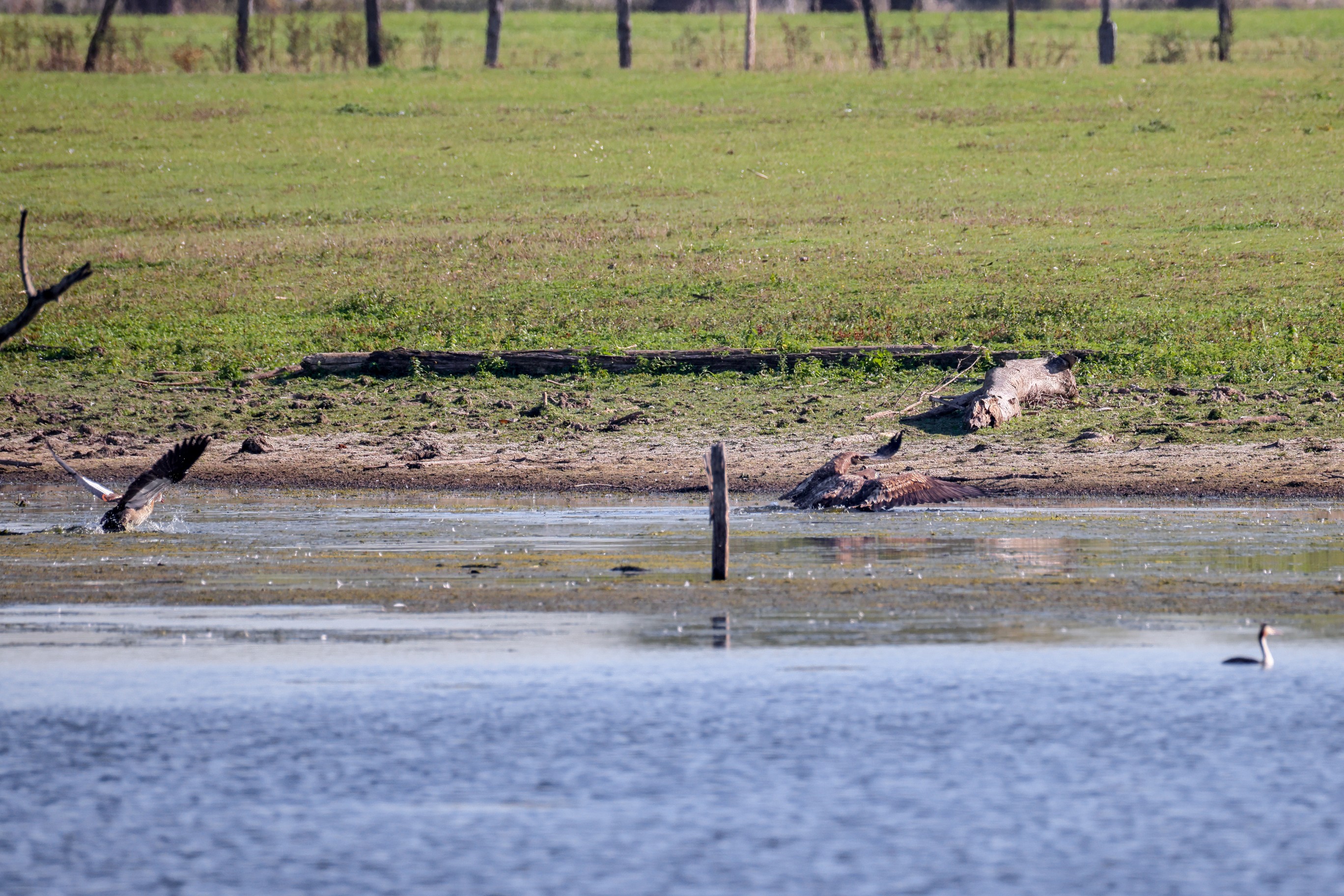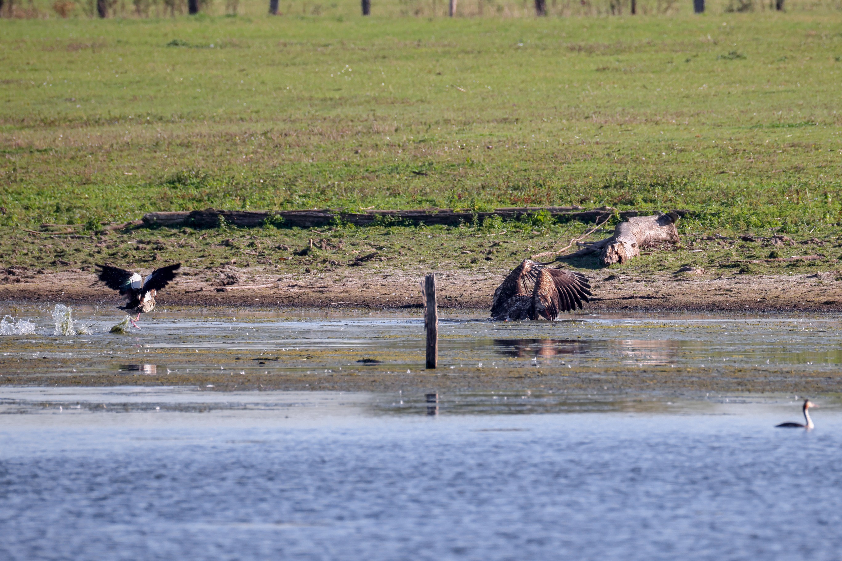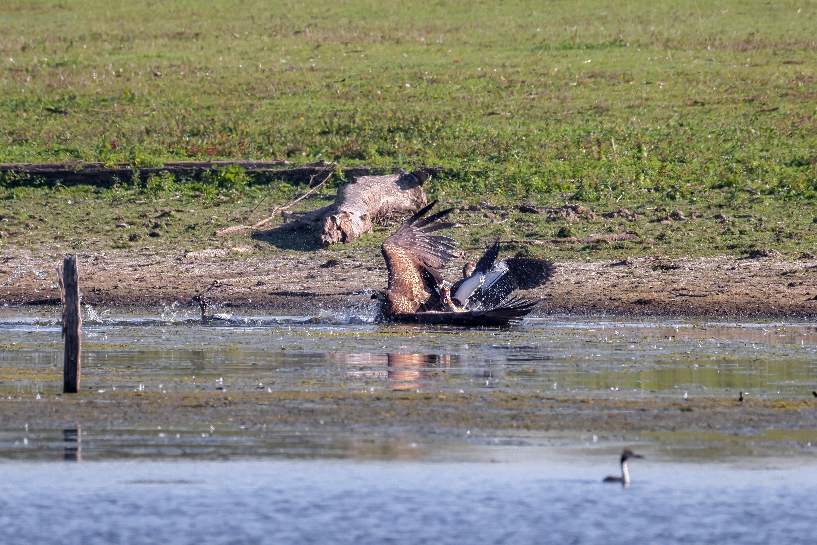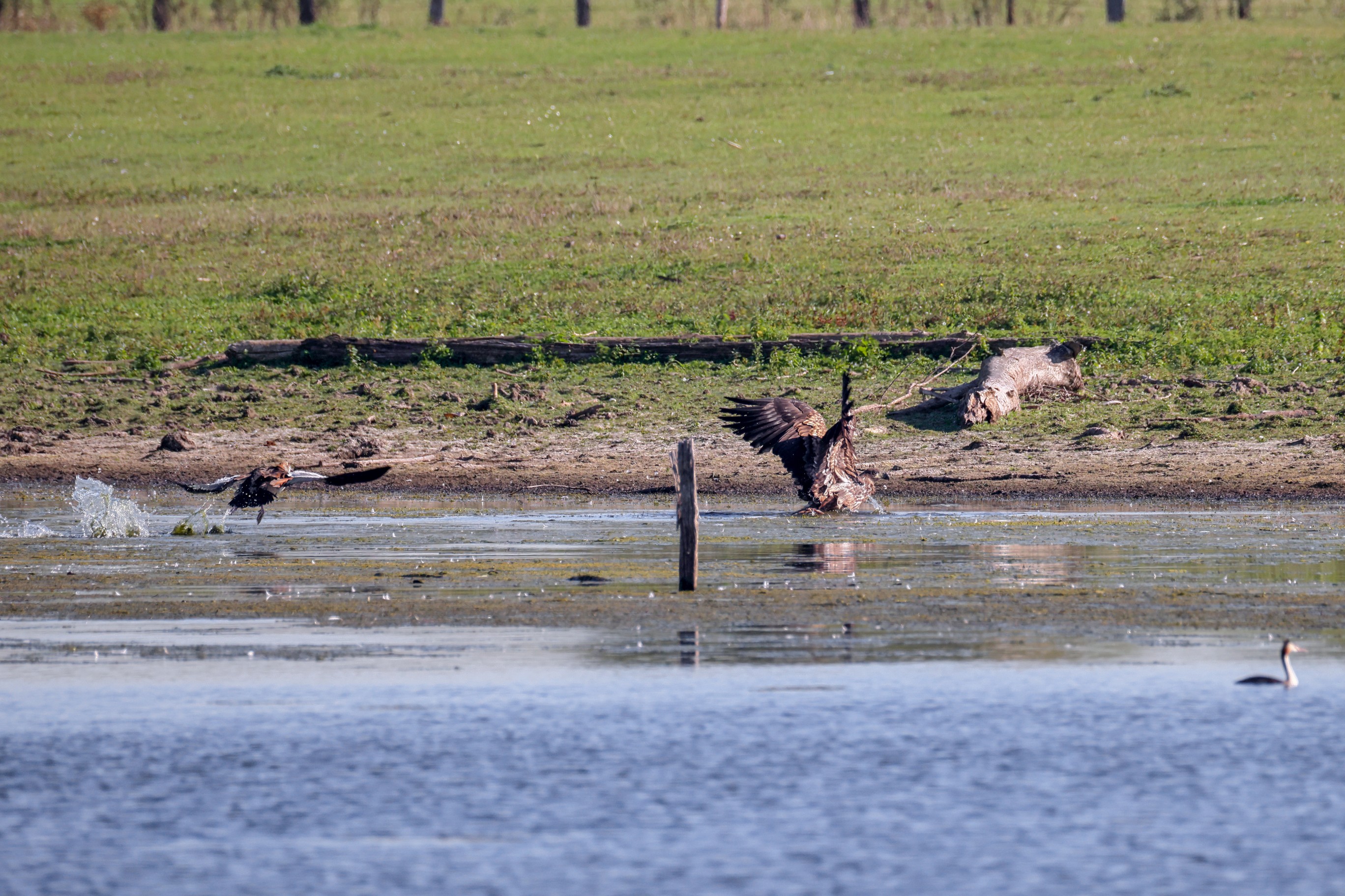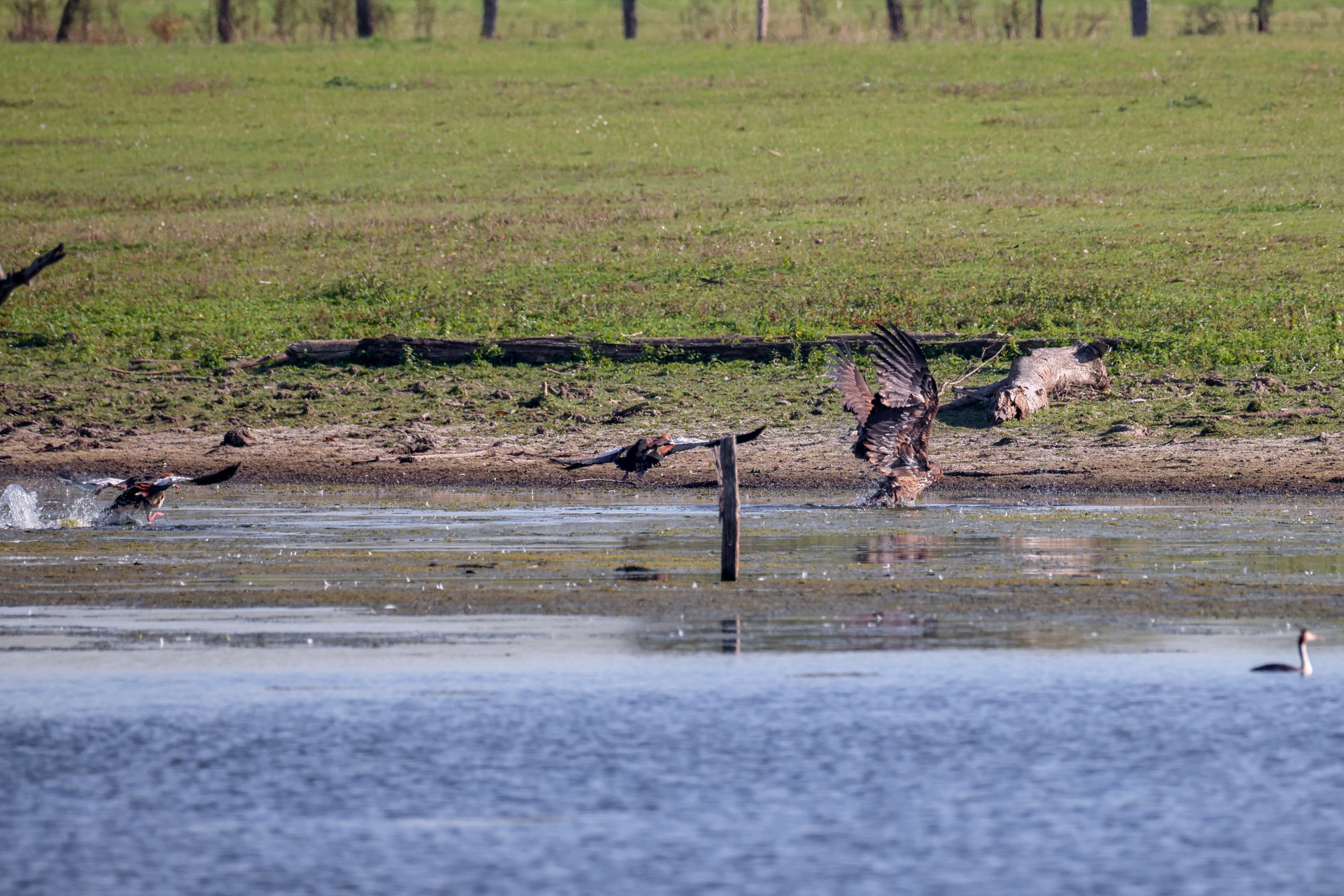 Ein besonders eindrucksvolles Erlebnis bot sich beim Versuch eine junge Nilgans zu erbeuten. Die entschlossene Abwehr der Nilganseltern überraschte den jungen Adler sichtlich und brachte ihm eine deutliche Lektion ein. Aus dieser Niederlage wird er lernen müssen künftig eine überlegtere Strategie zu wählen, wenn er sich an wehrhaft umsorgte Beute heranwagt.