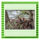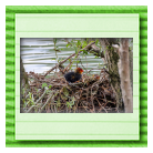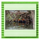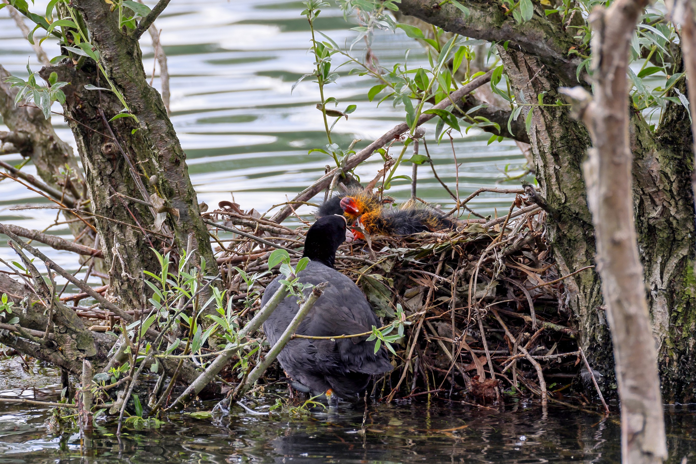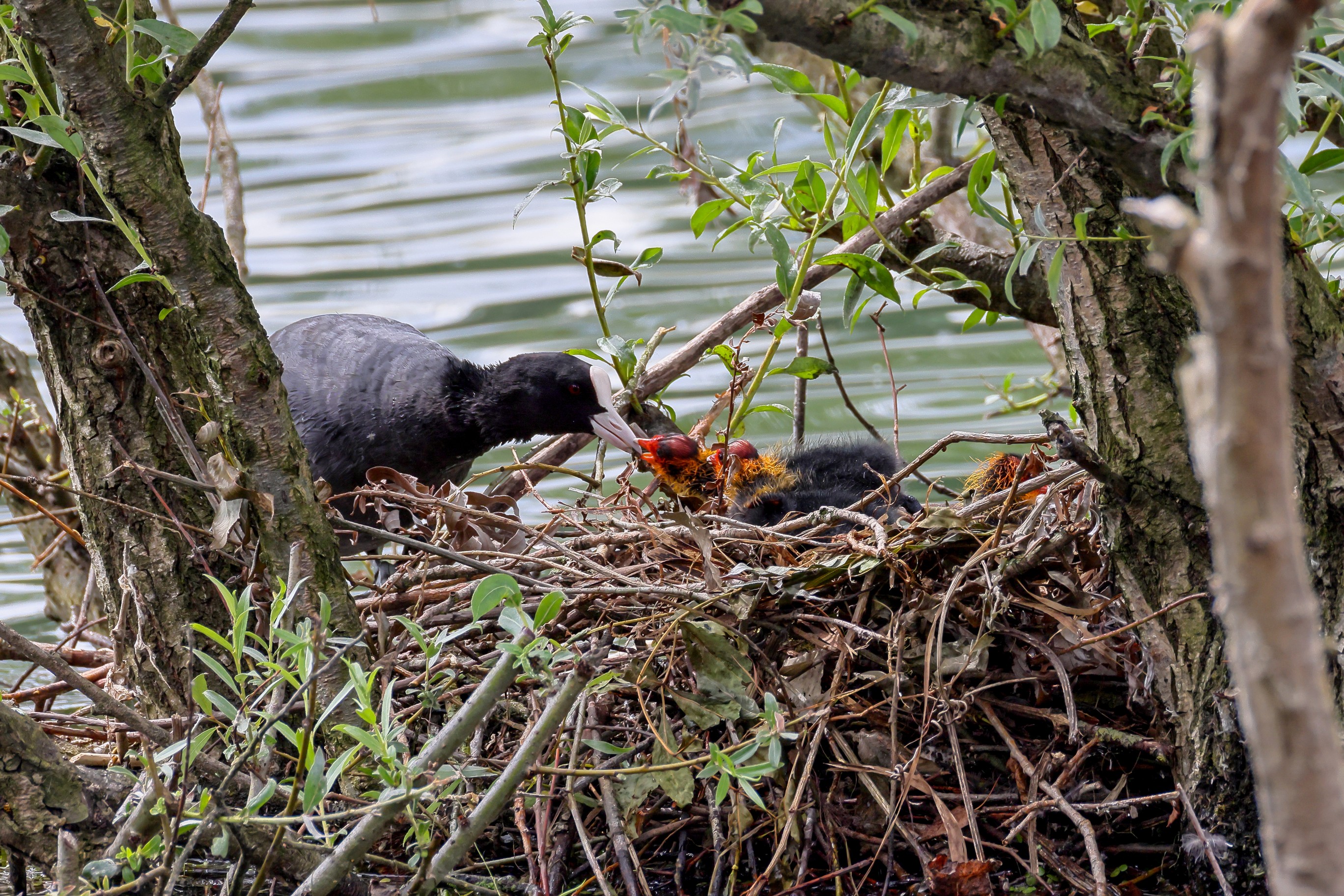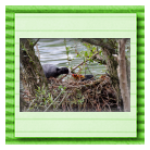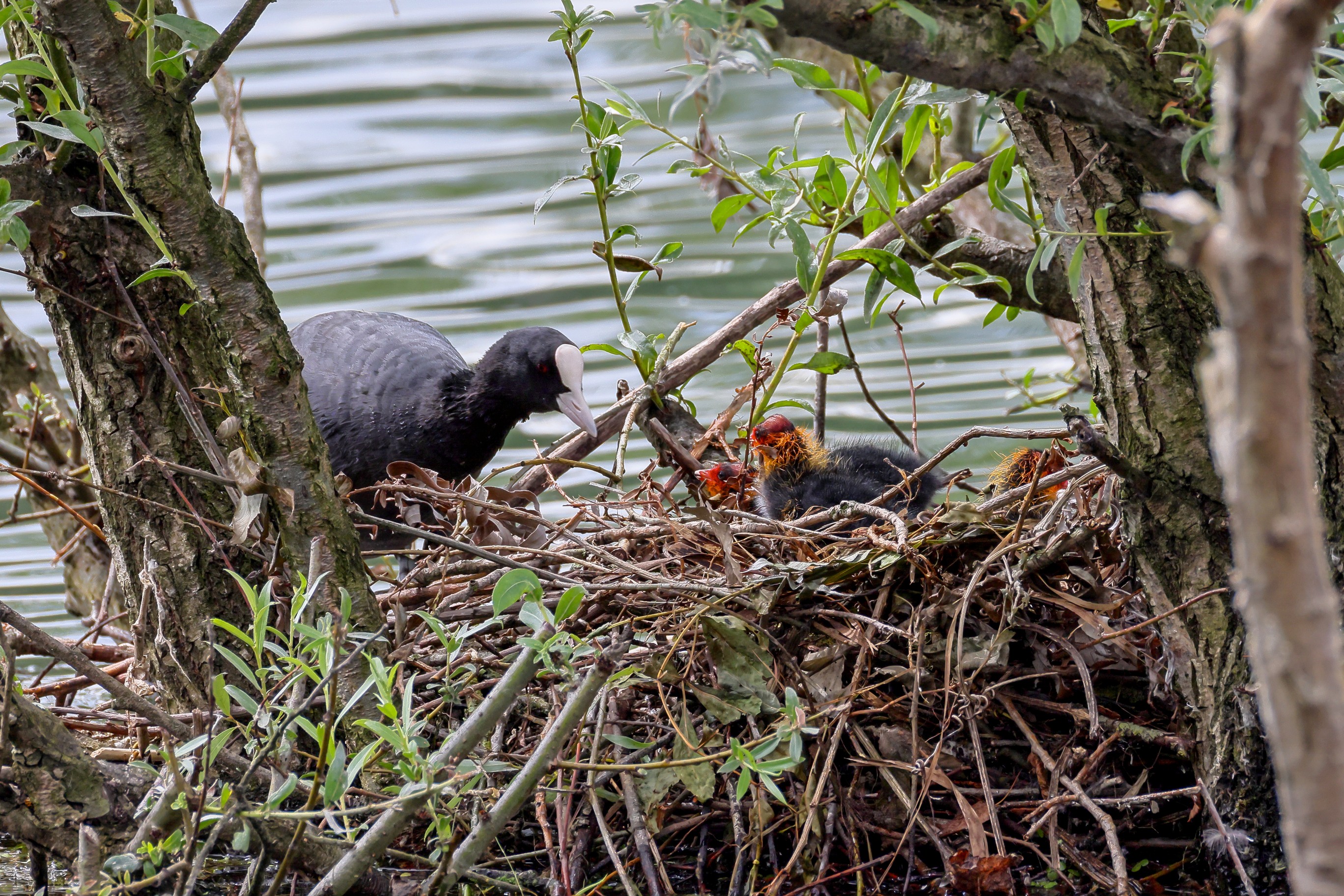 Erster Ausflug der jungen Blässrallen an der Beobachtungshütte 1