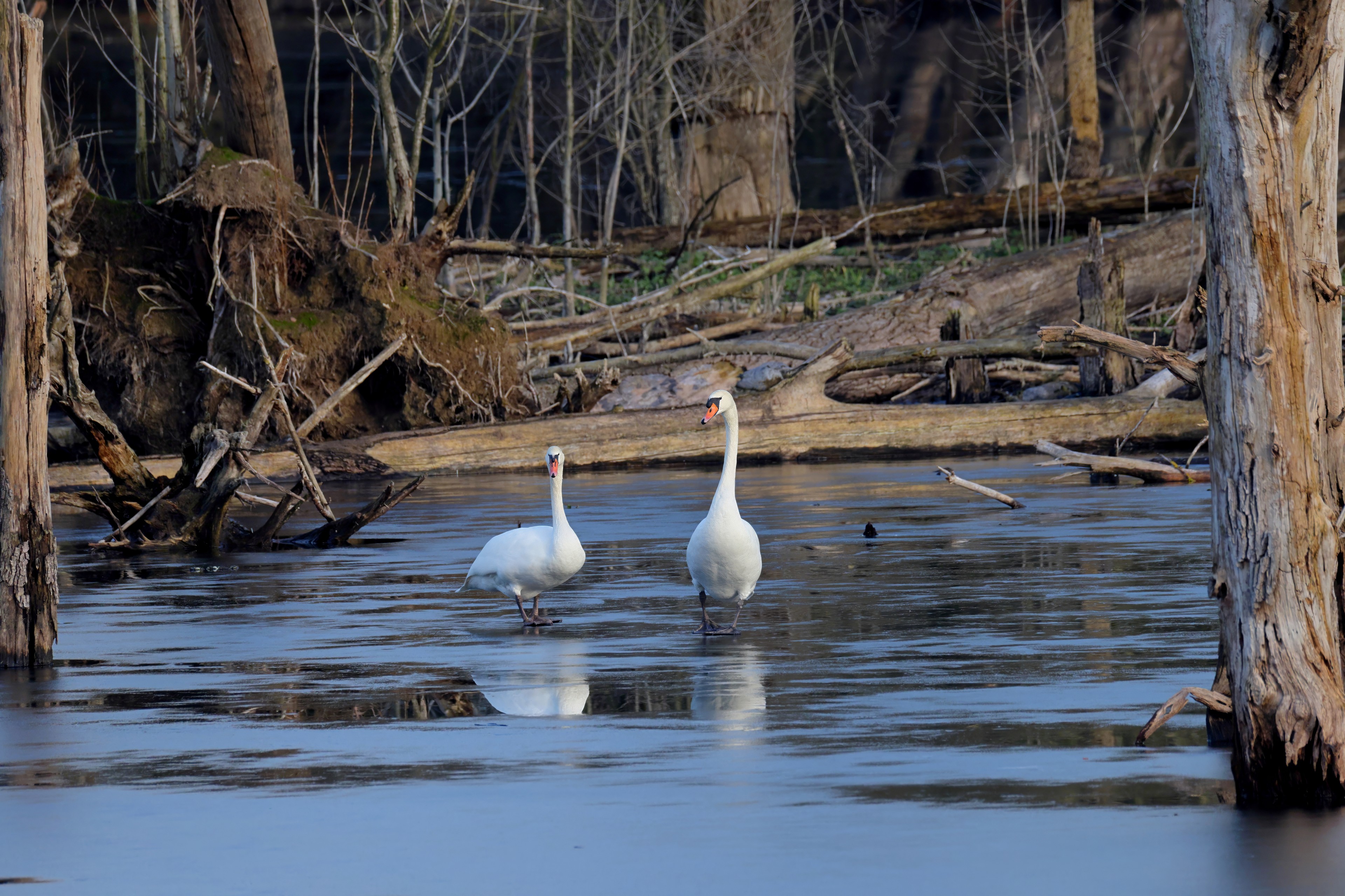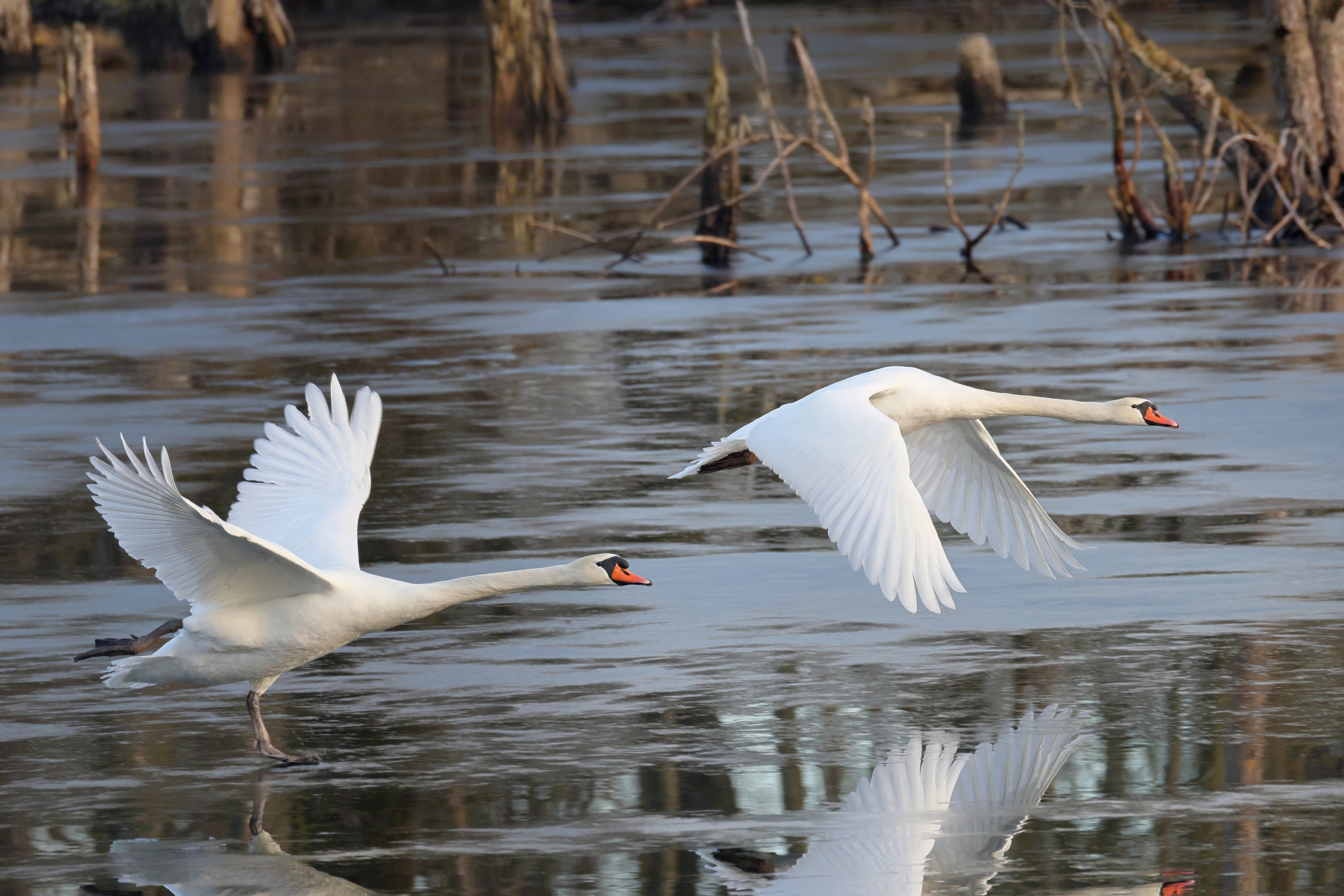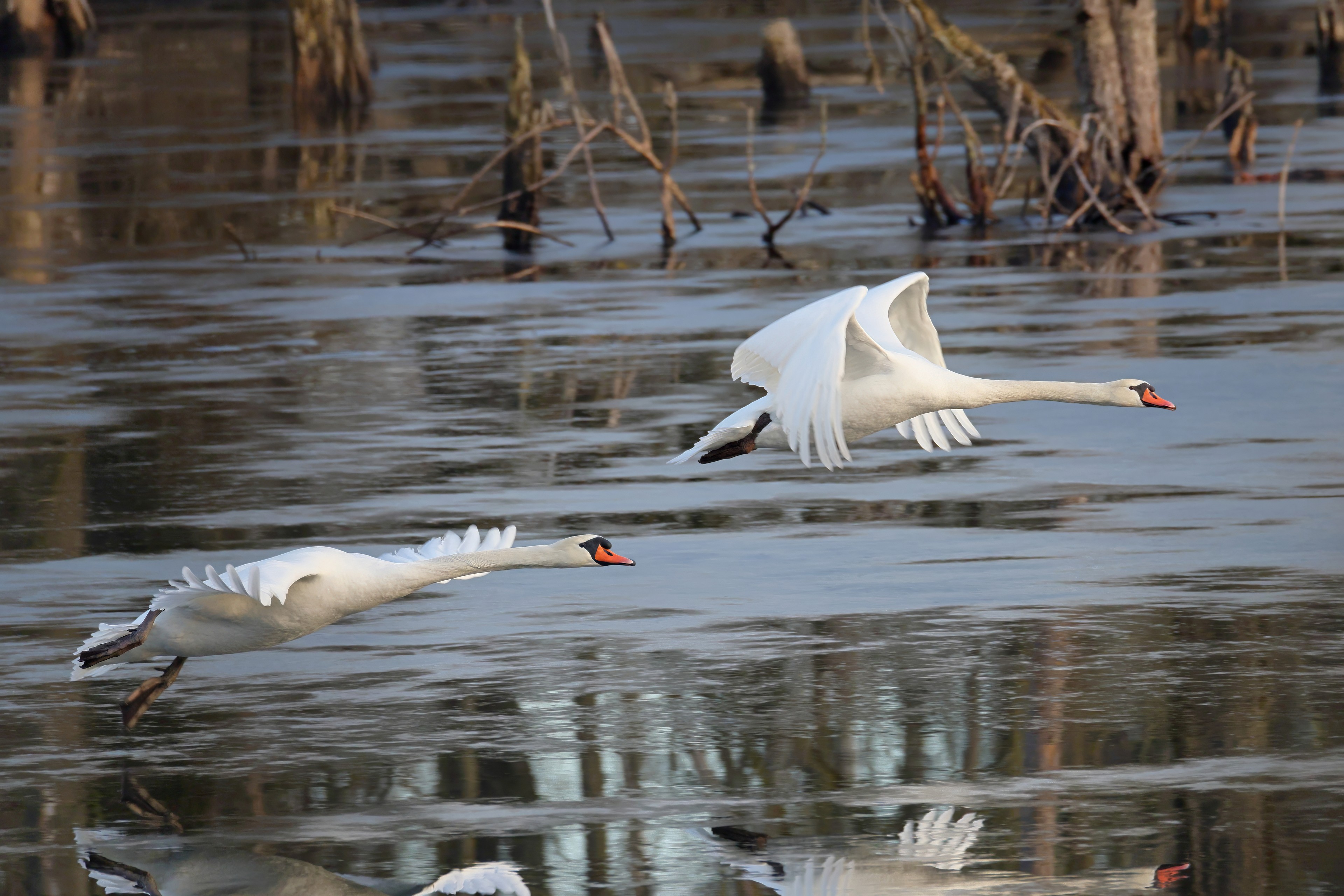Höckerschwan vertreibt Trauerschwan