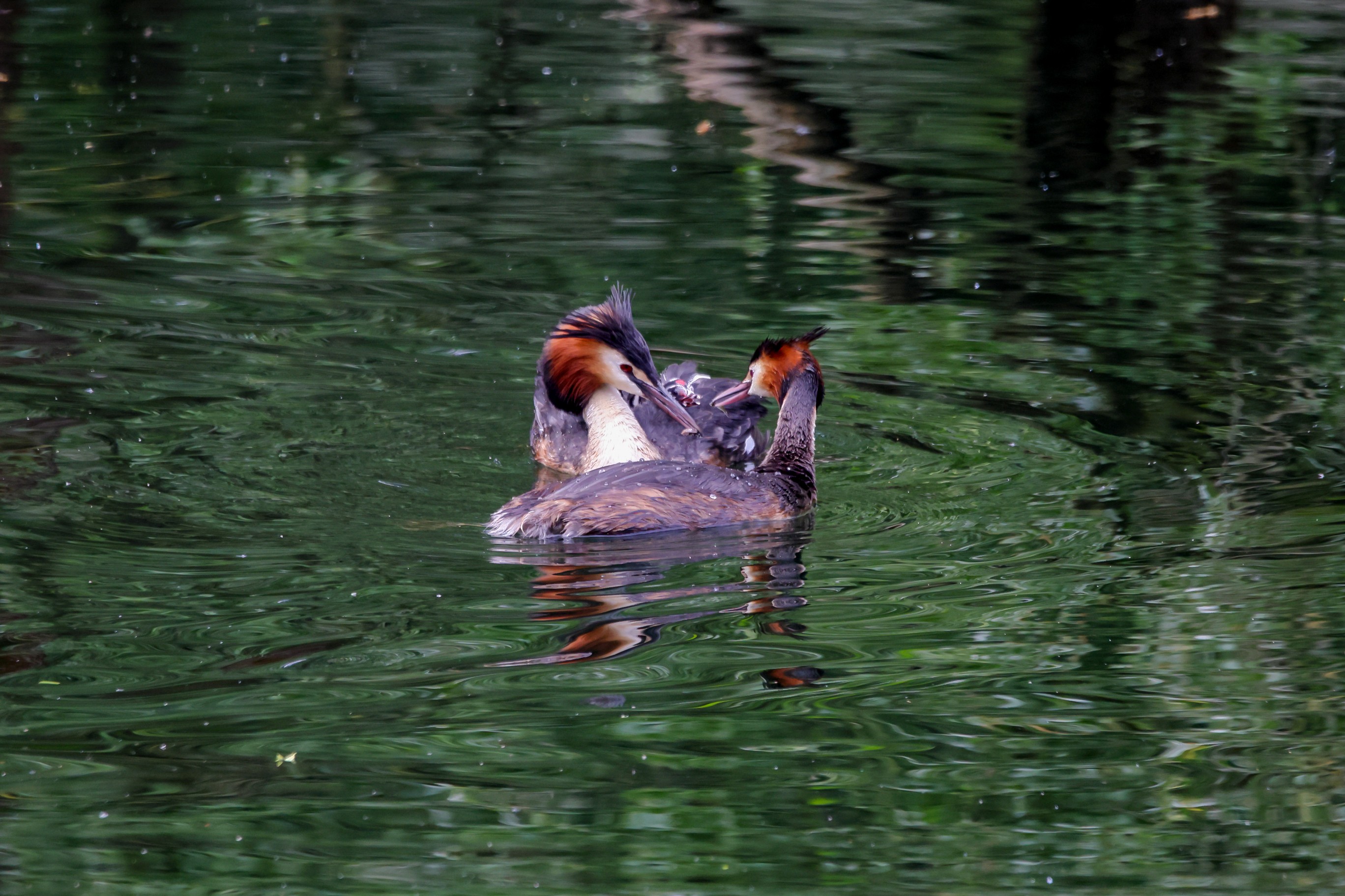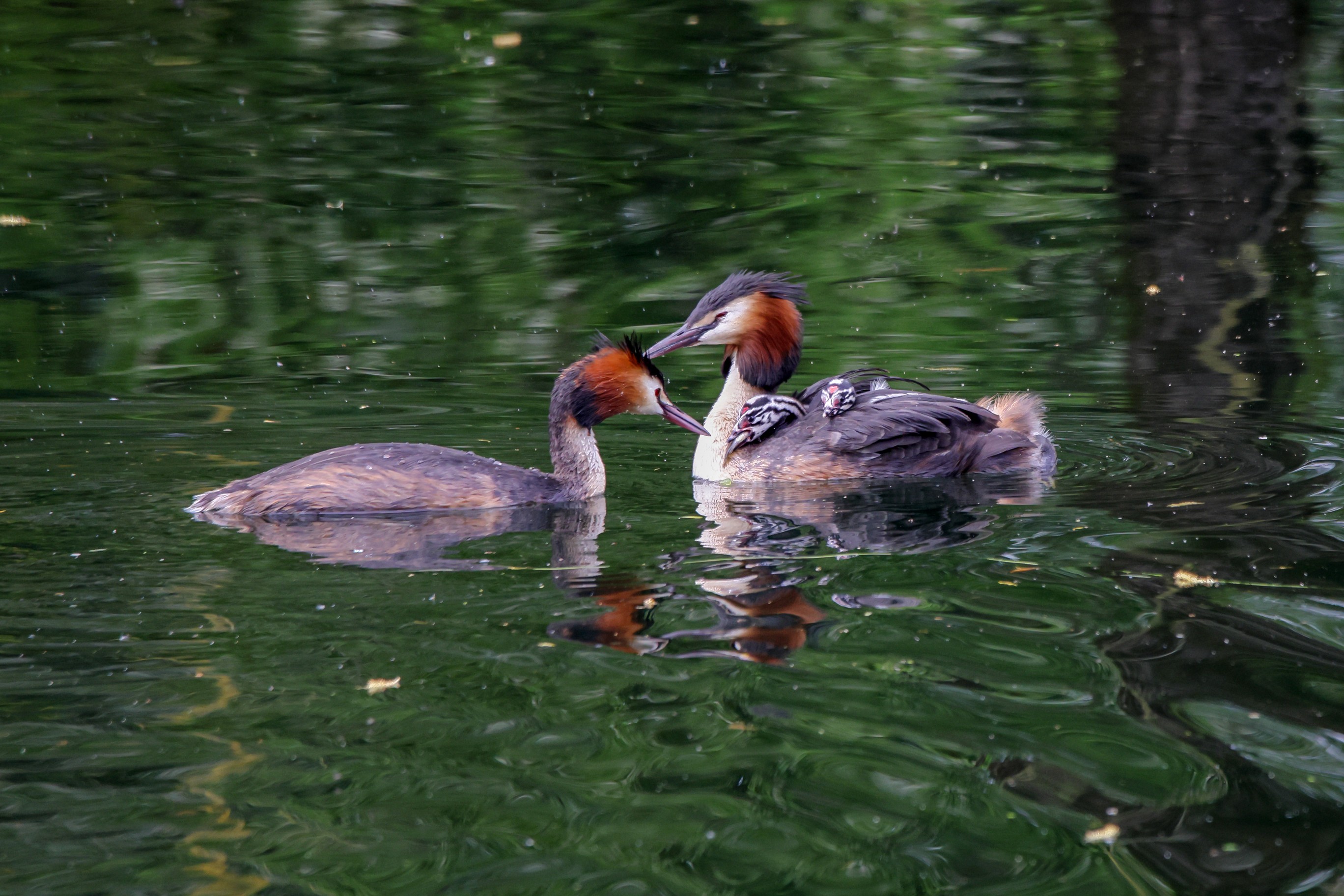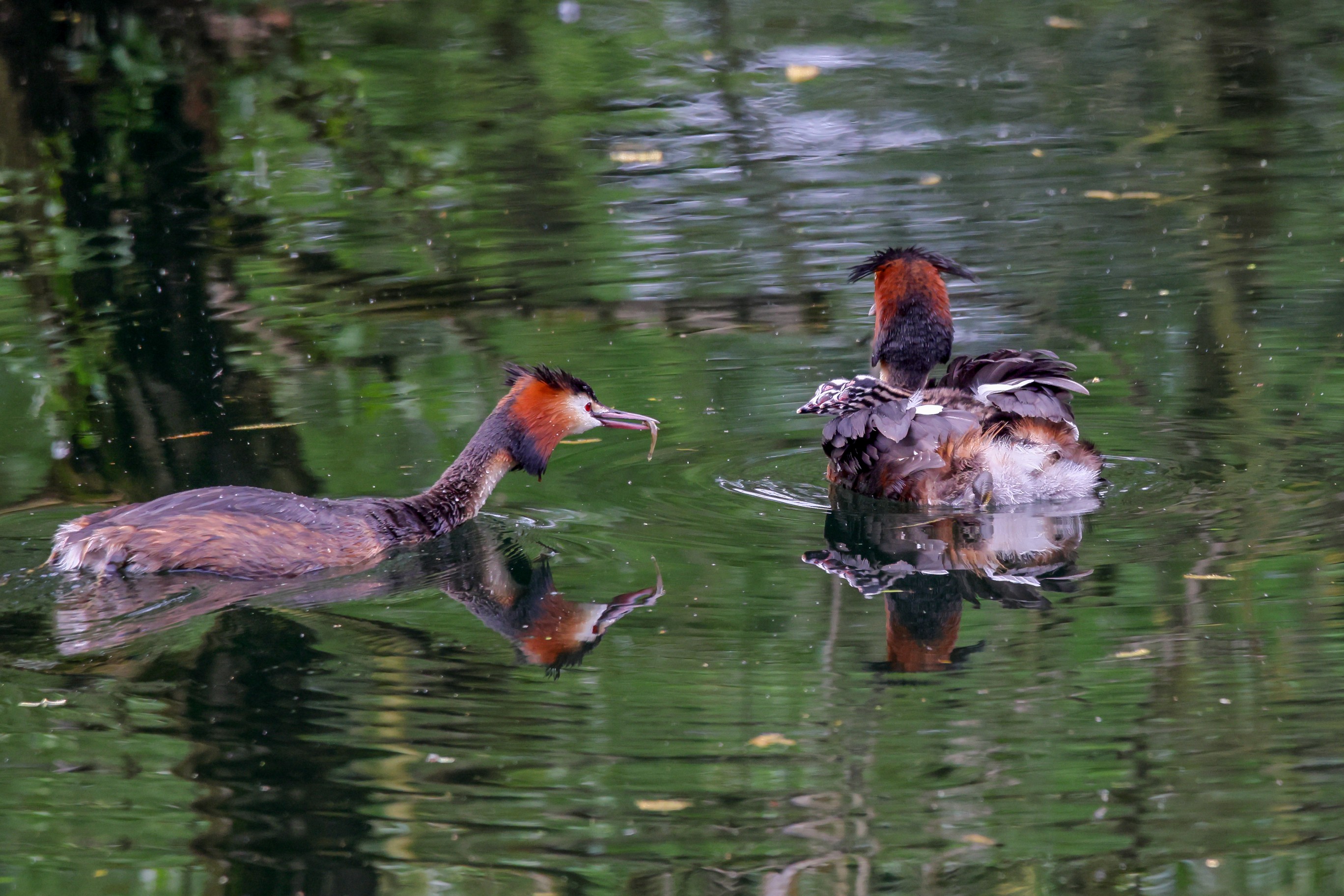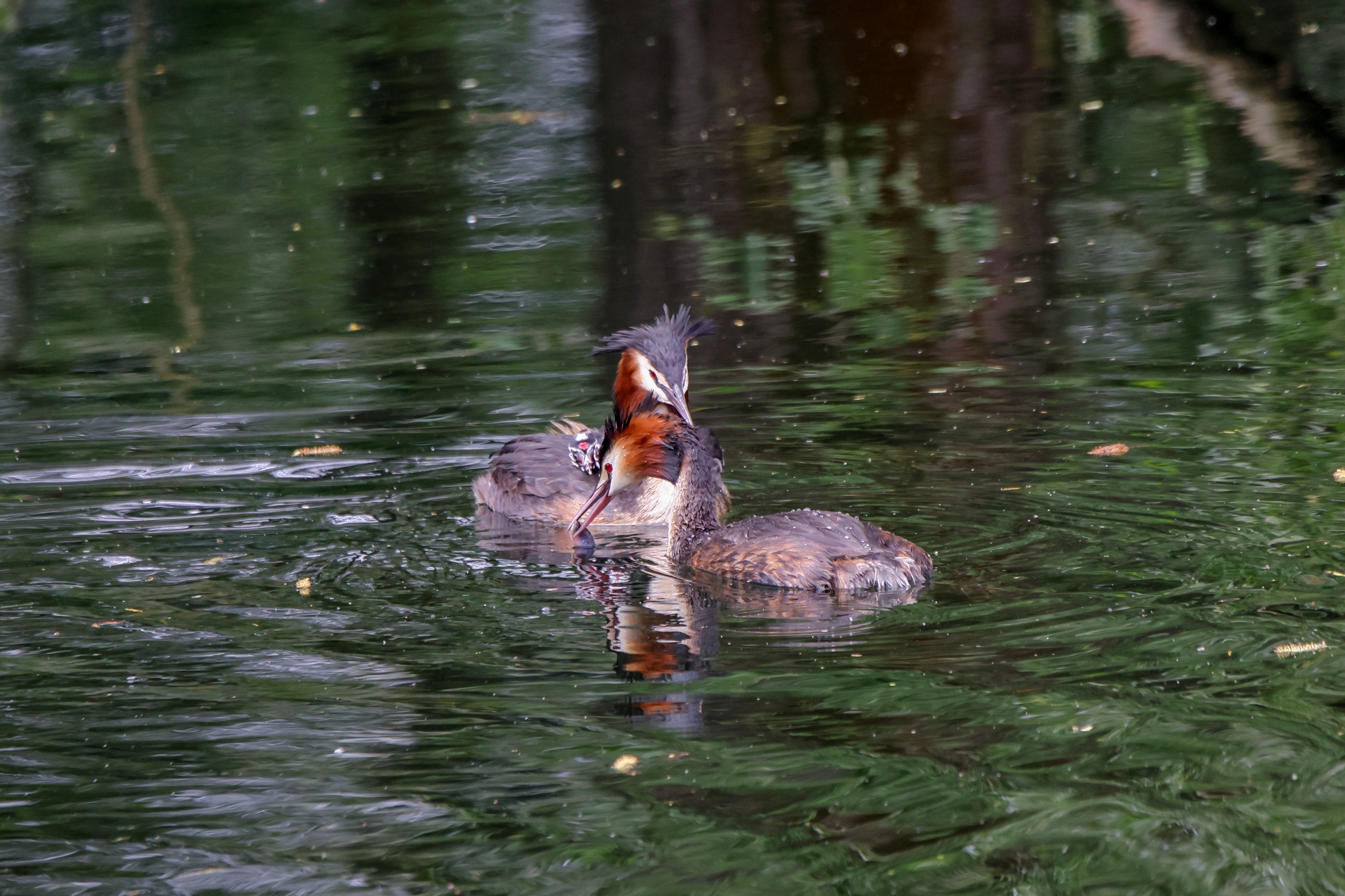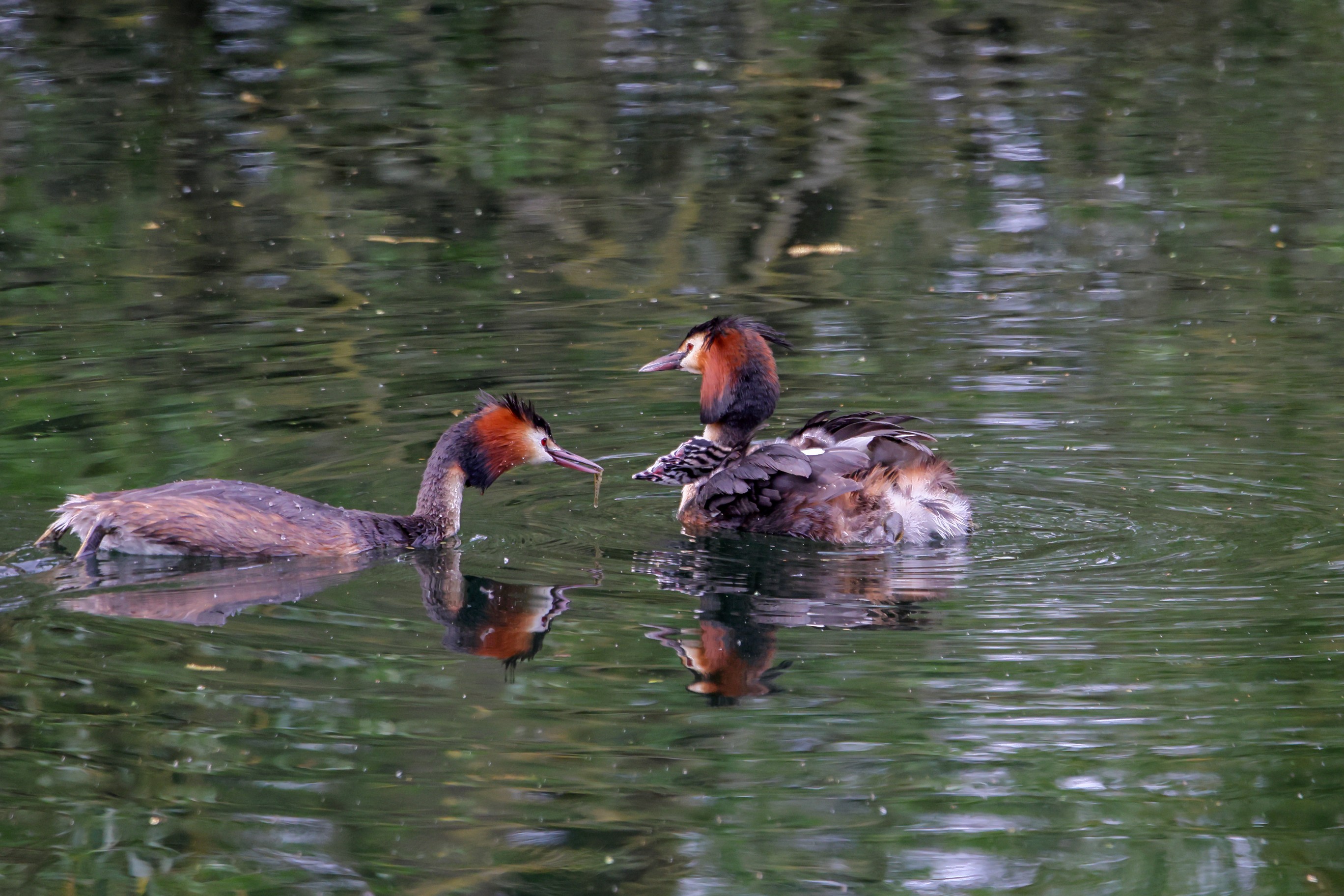 Die Haubentaucher präsentieren ihren Nachwuchs
