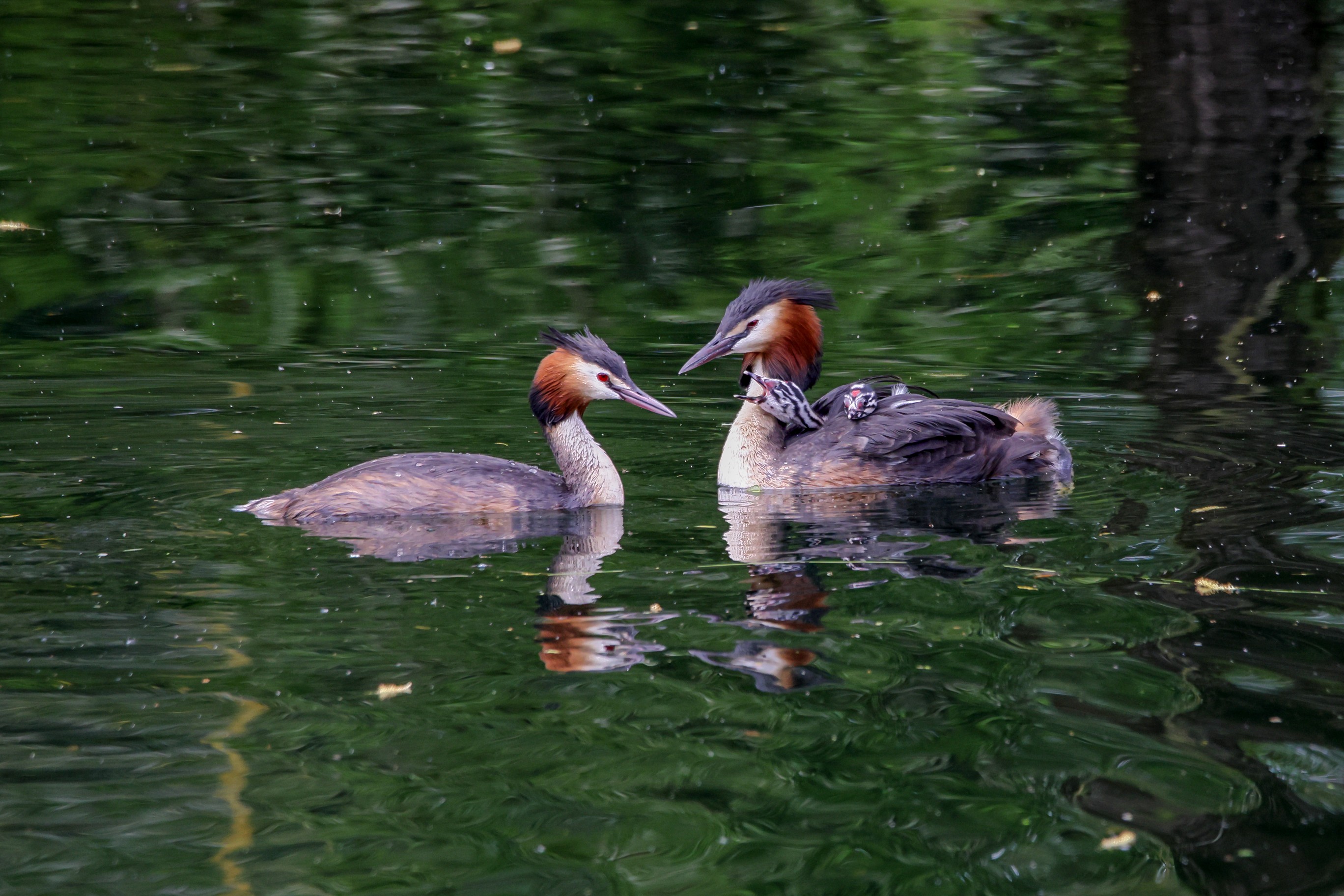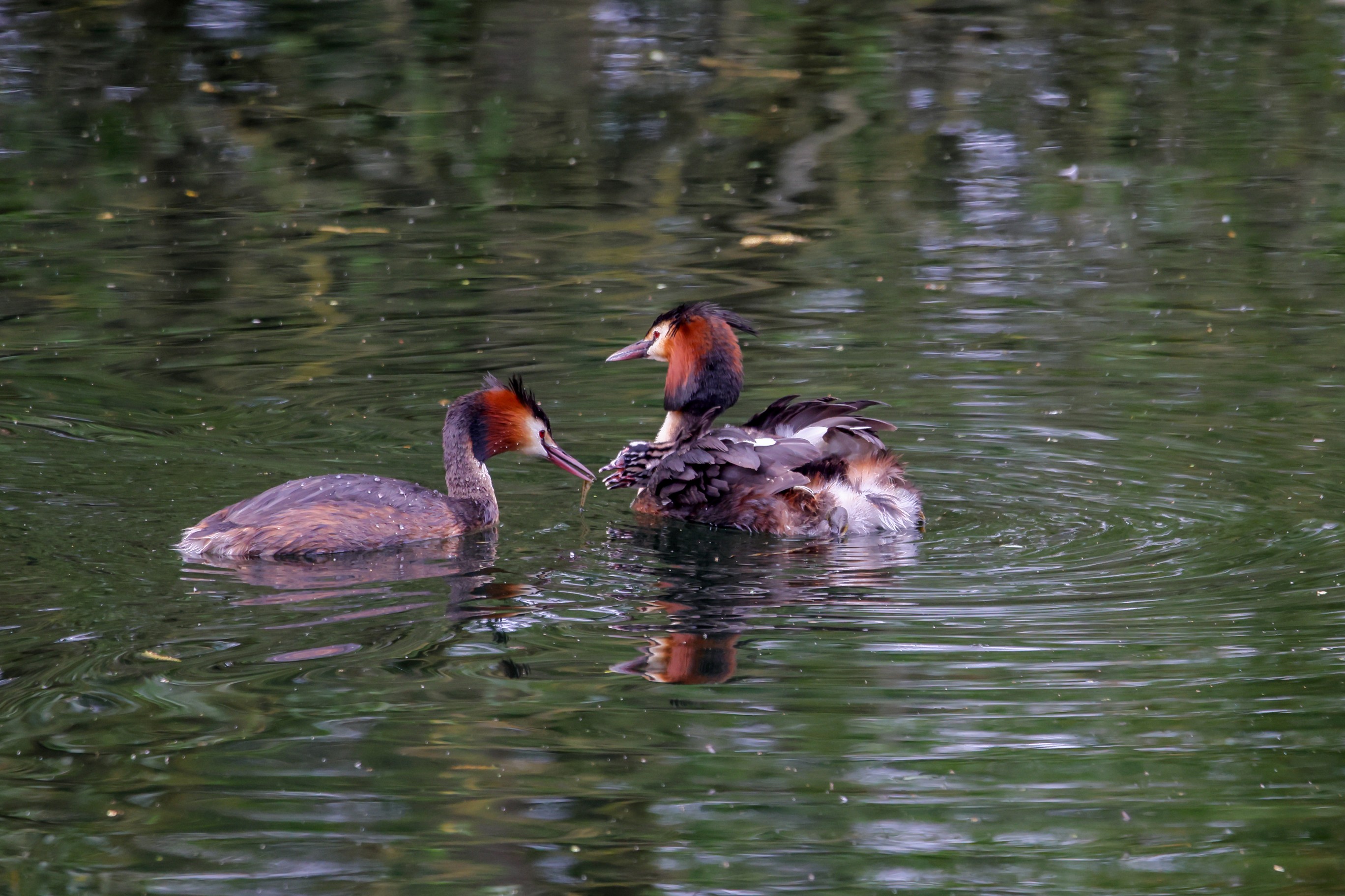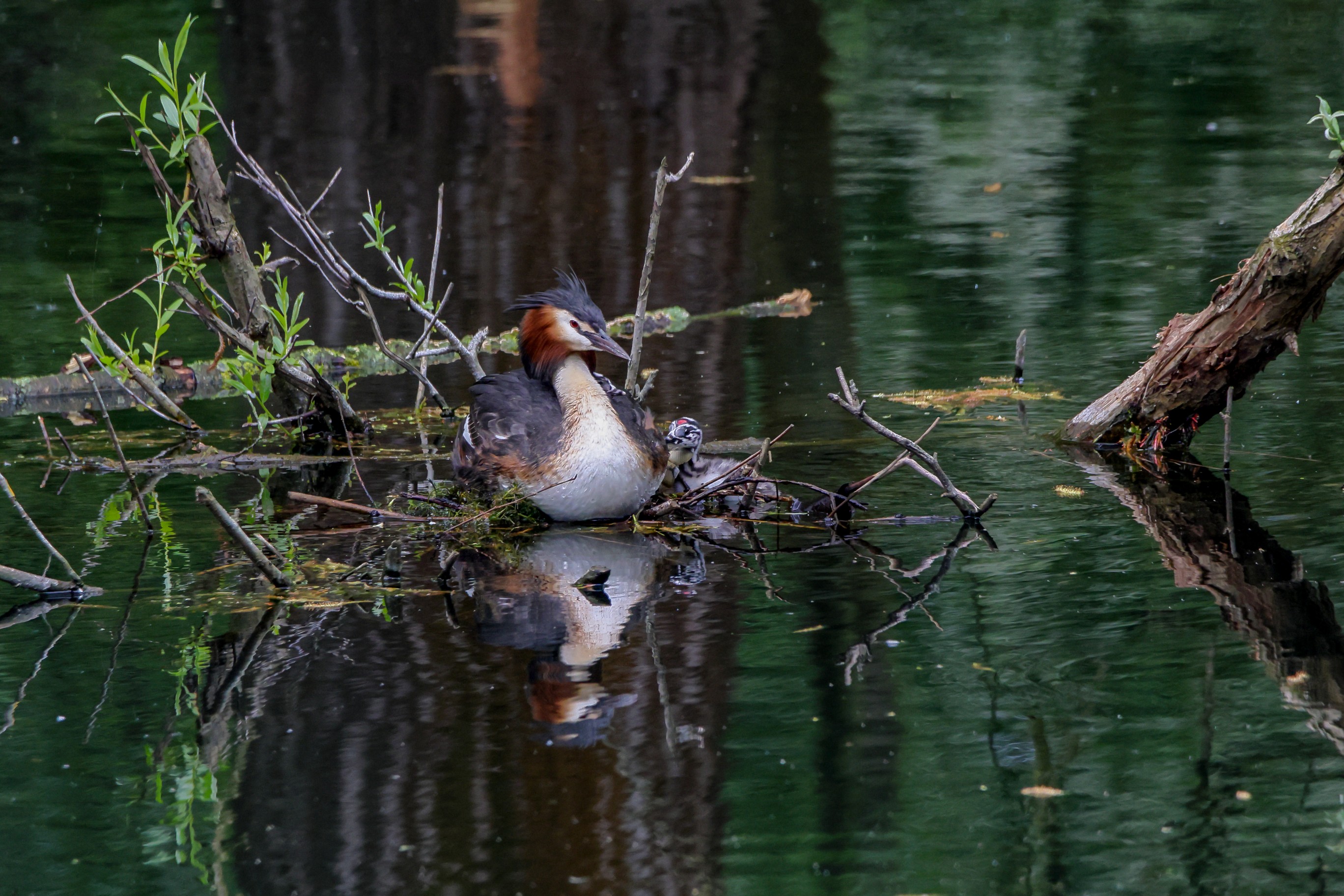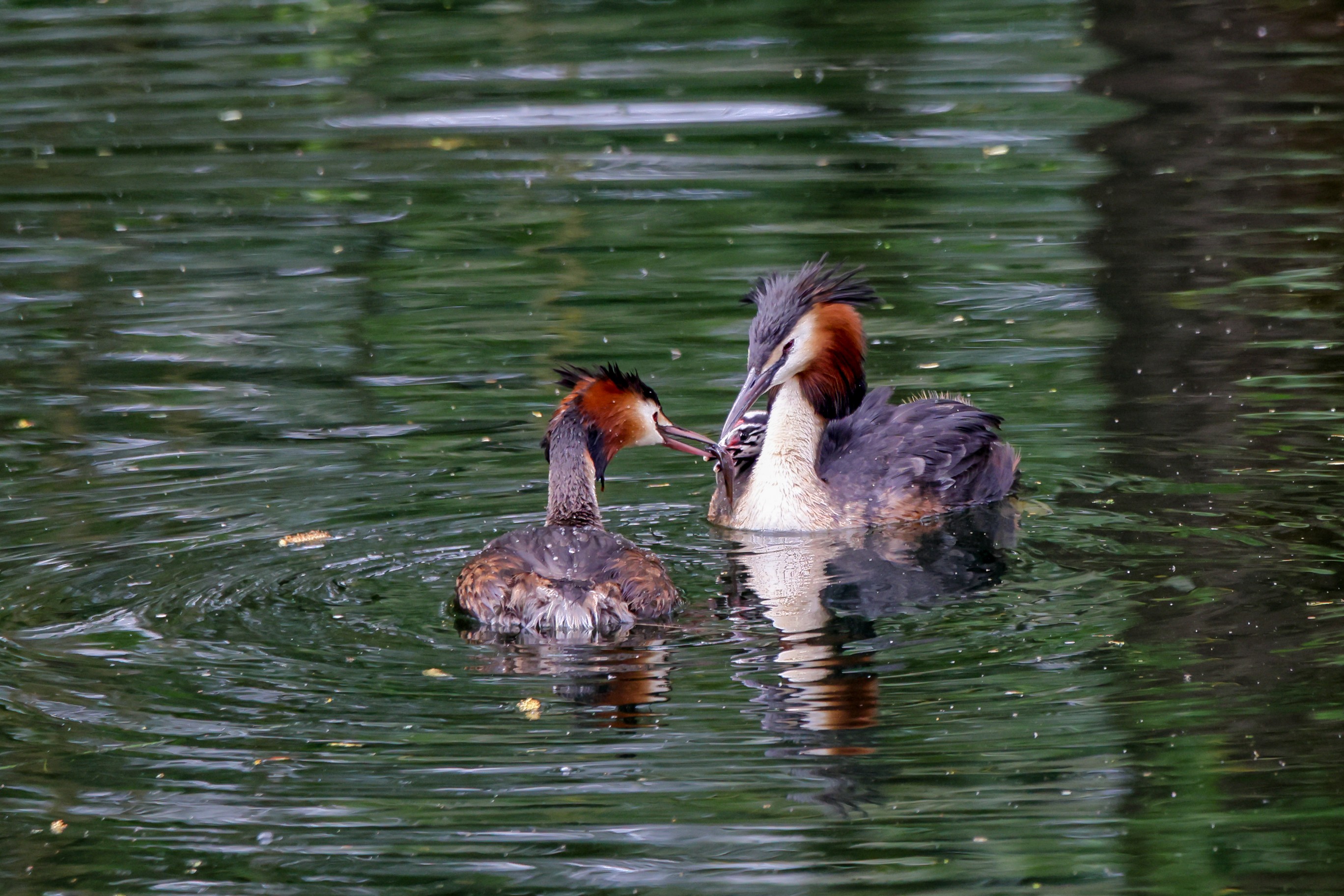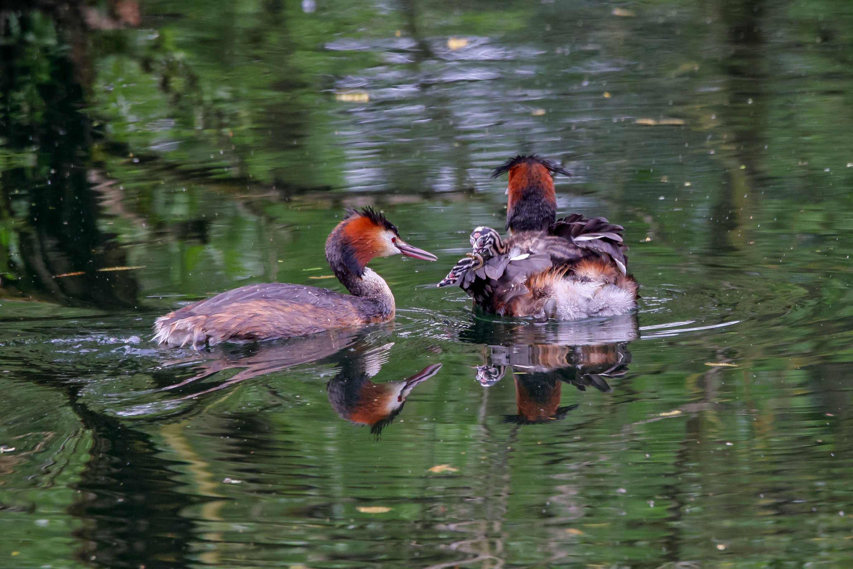 Die Haubentaucher präsentieren ihren Nachwuchs