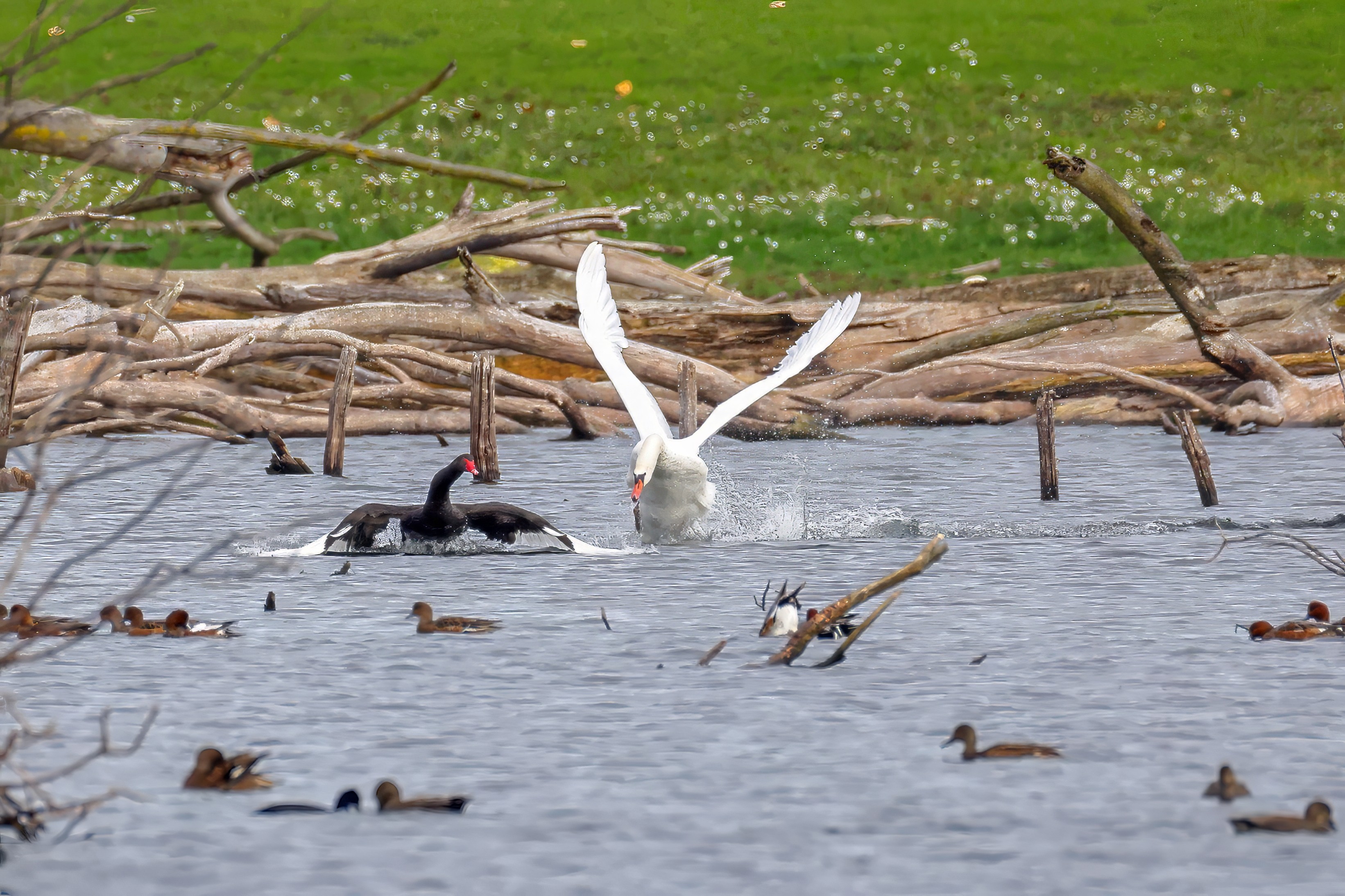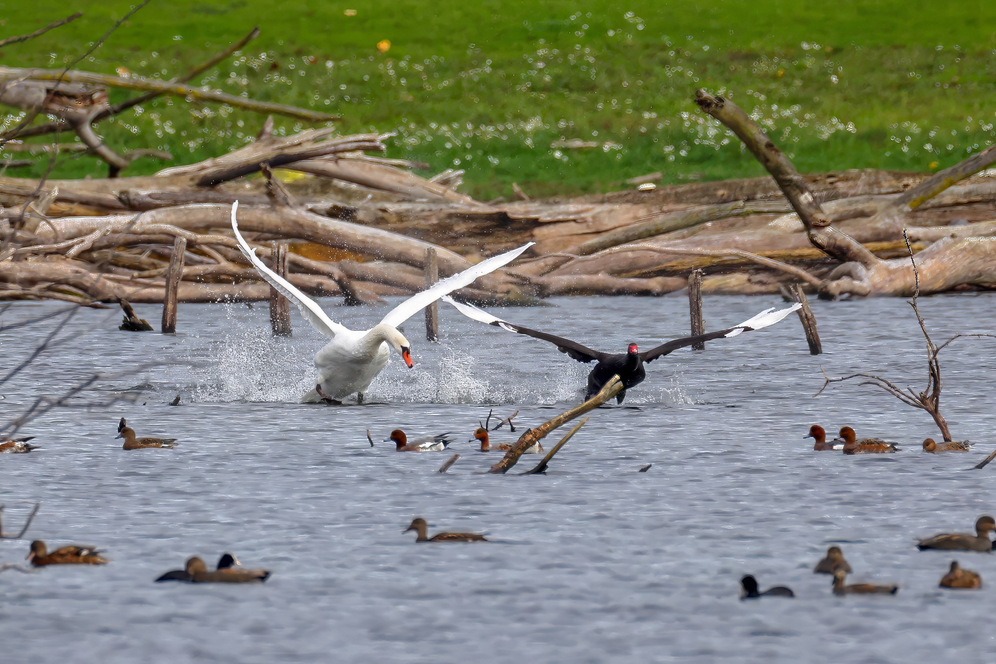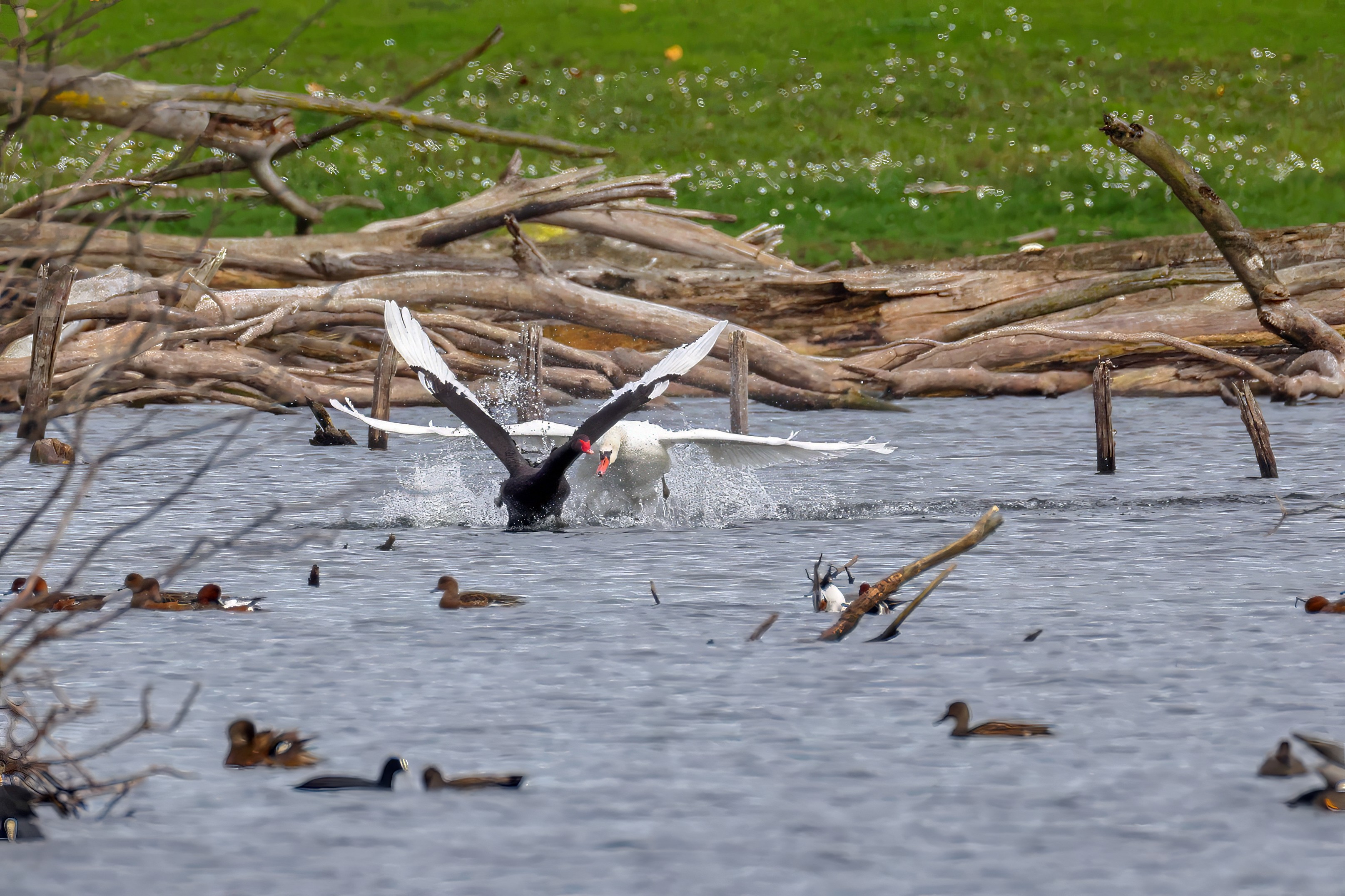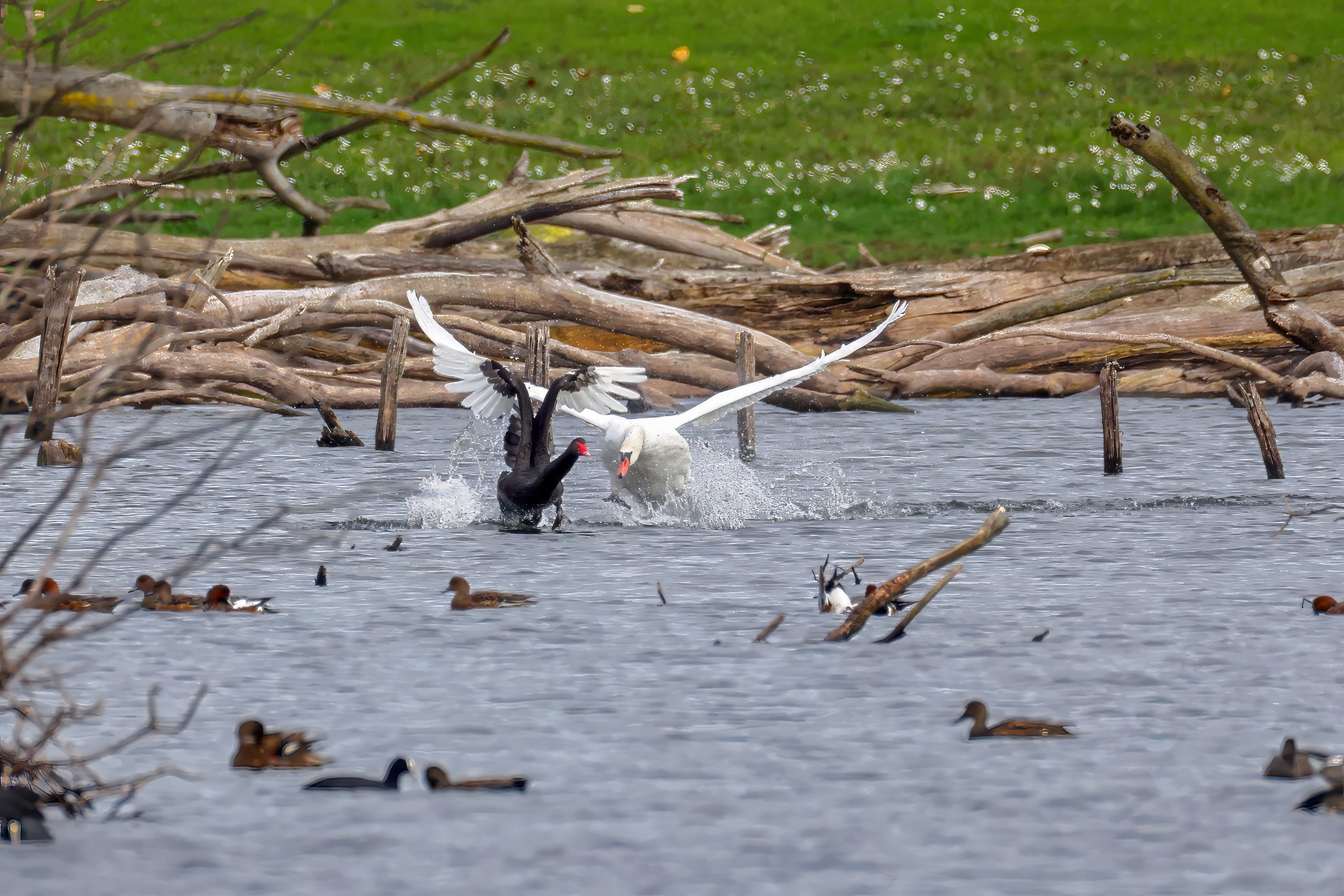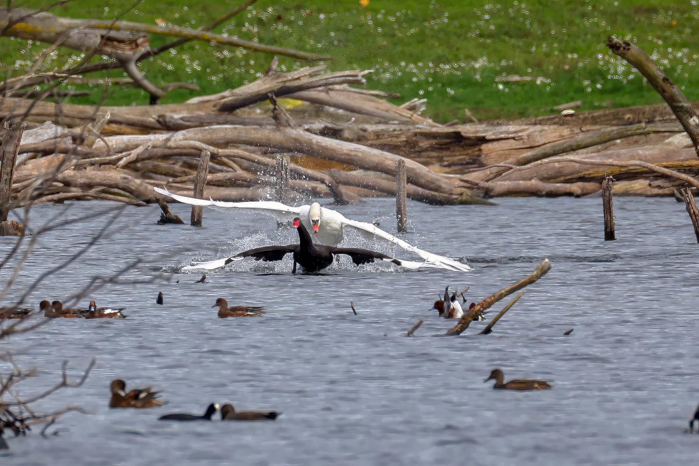 Höckerschwan vertreibt Trauerschwan - Rheingold Natur- und Tierfotografie