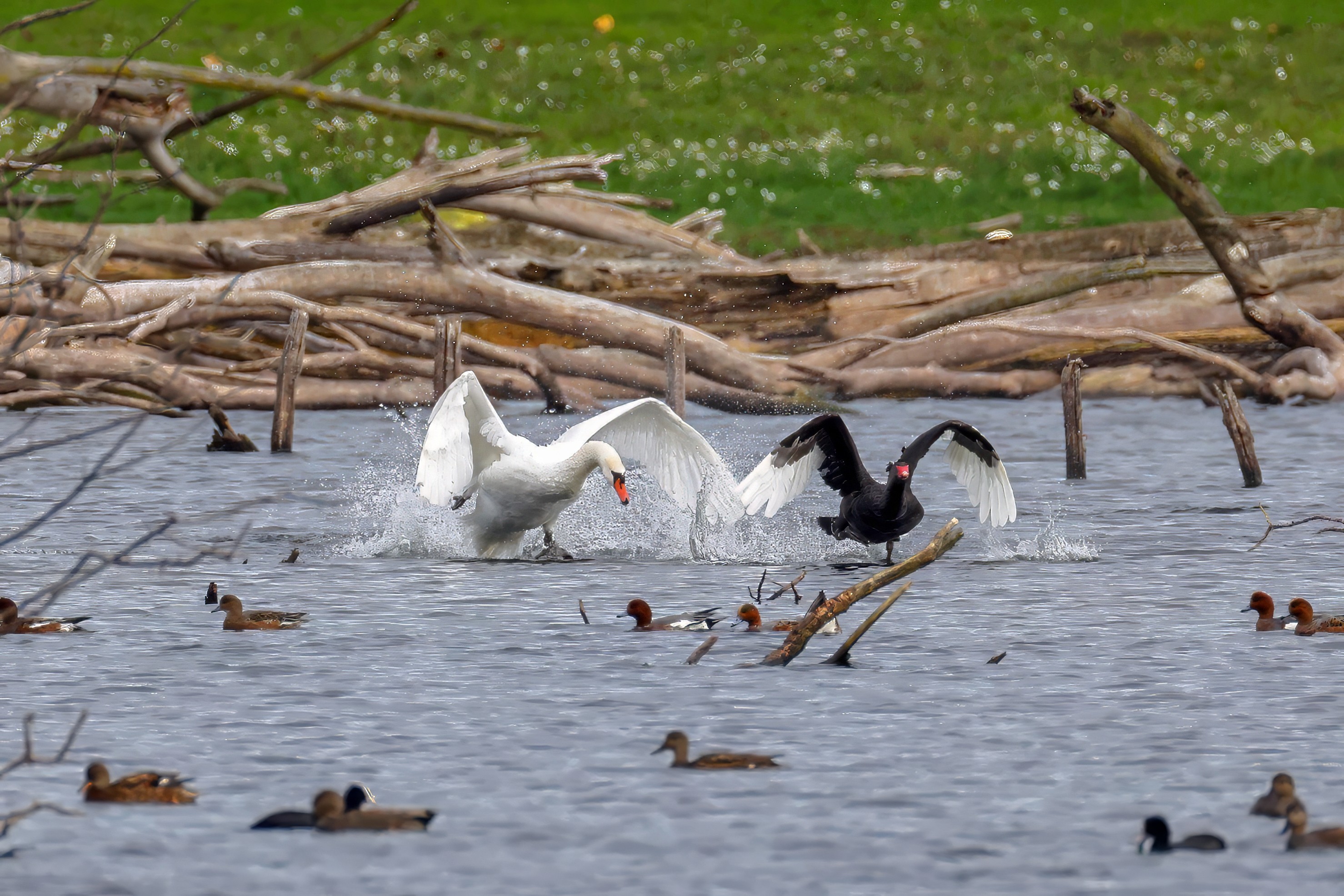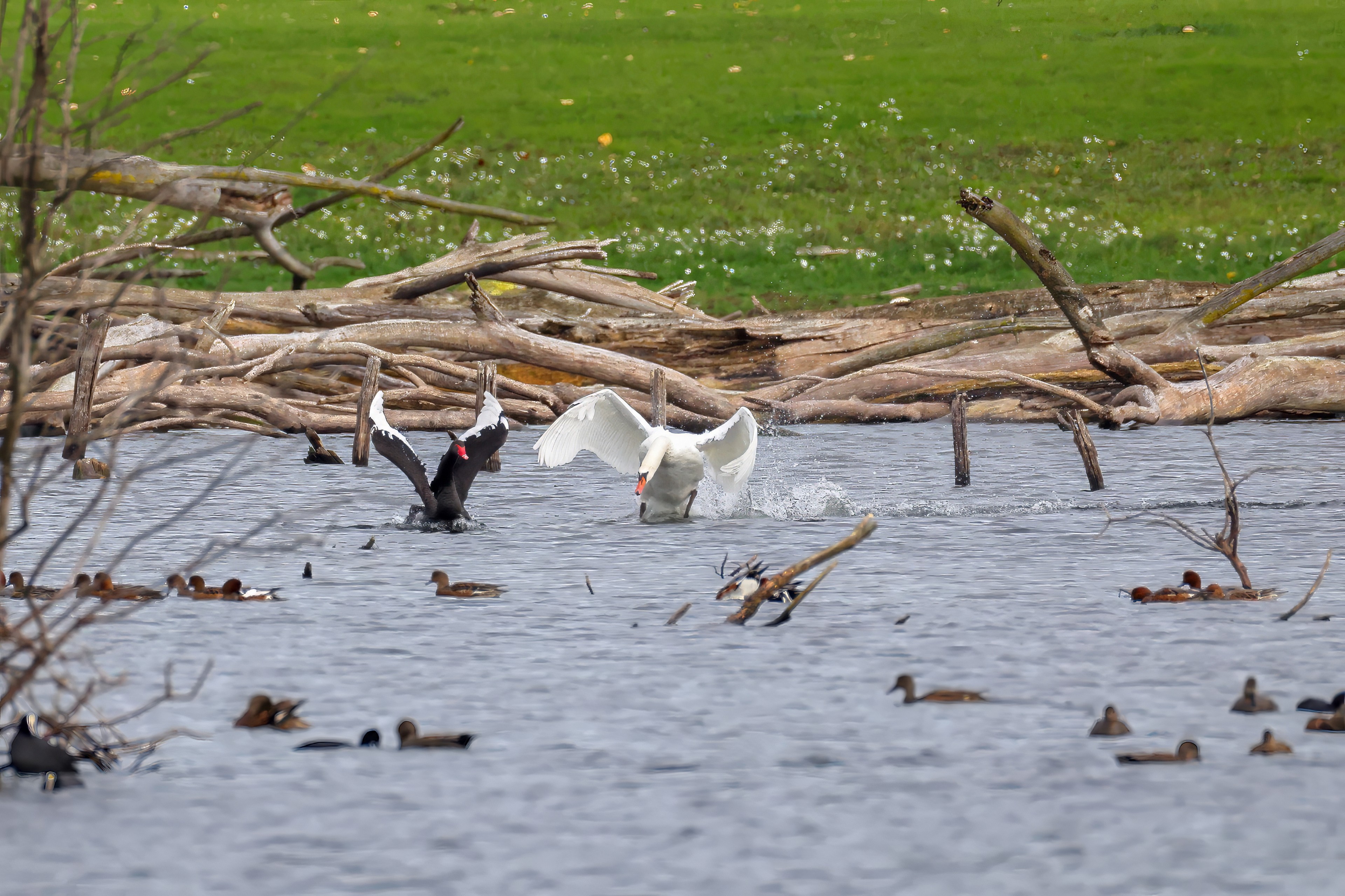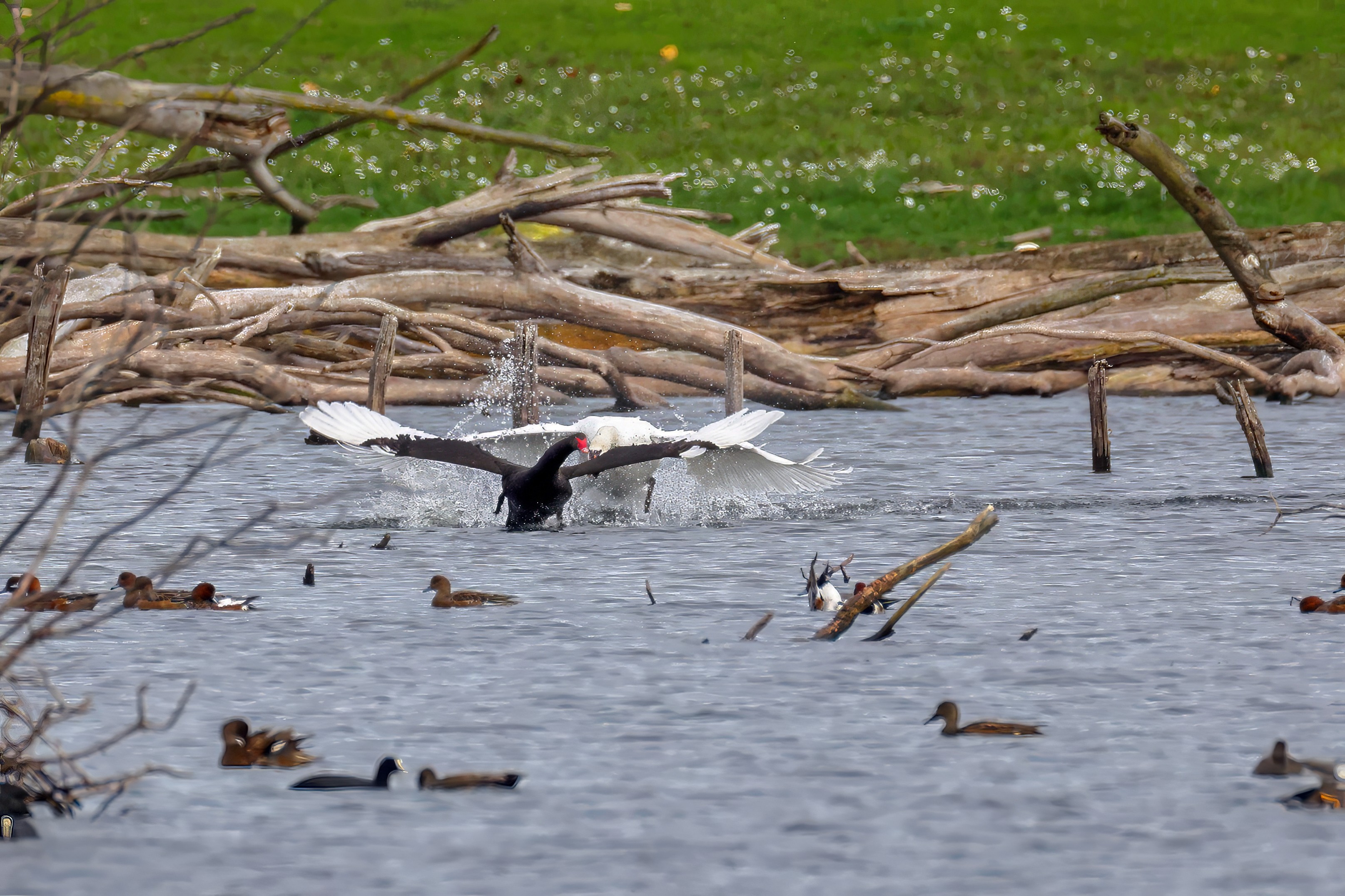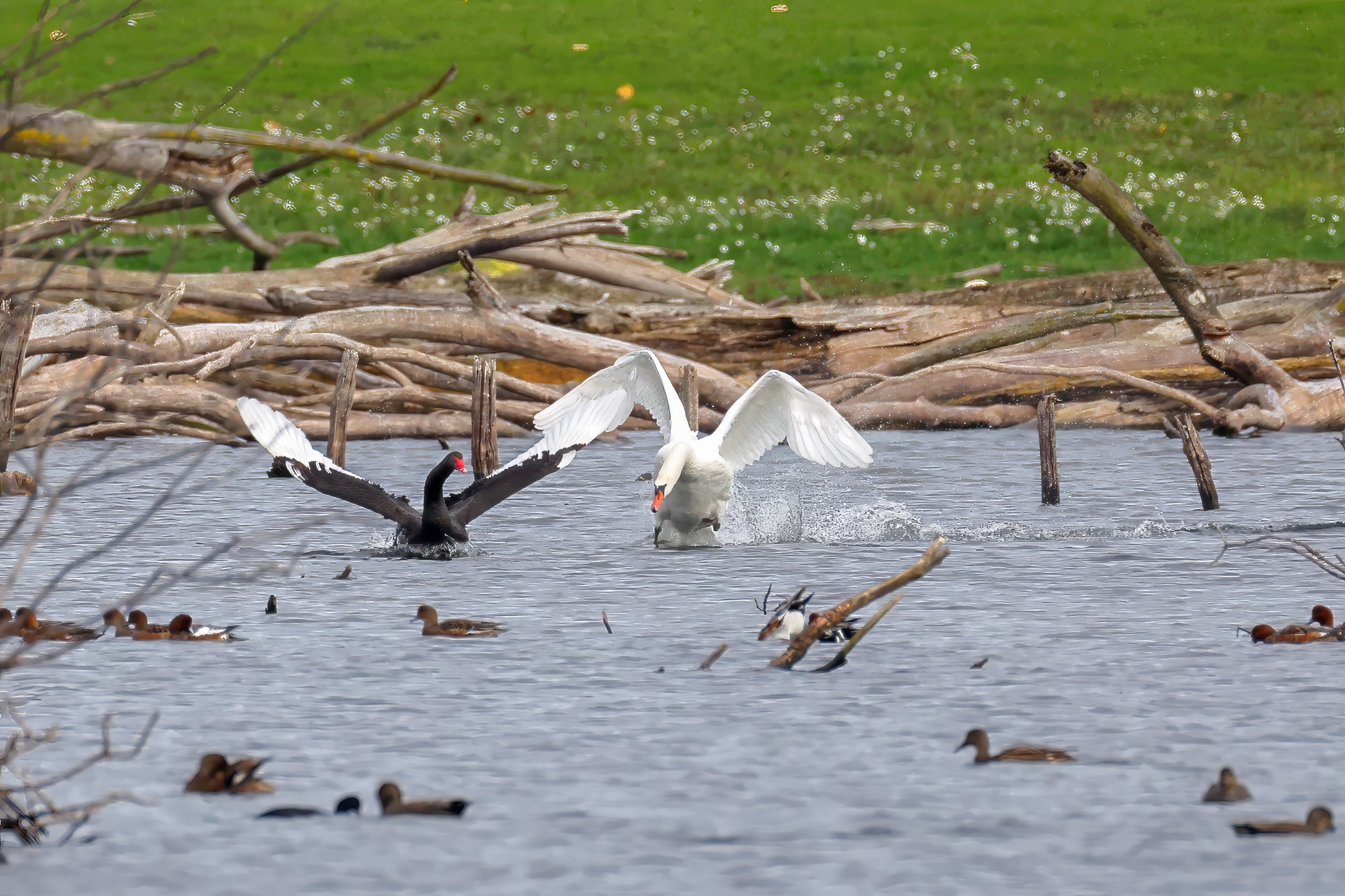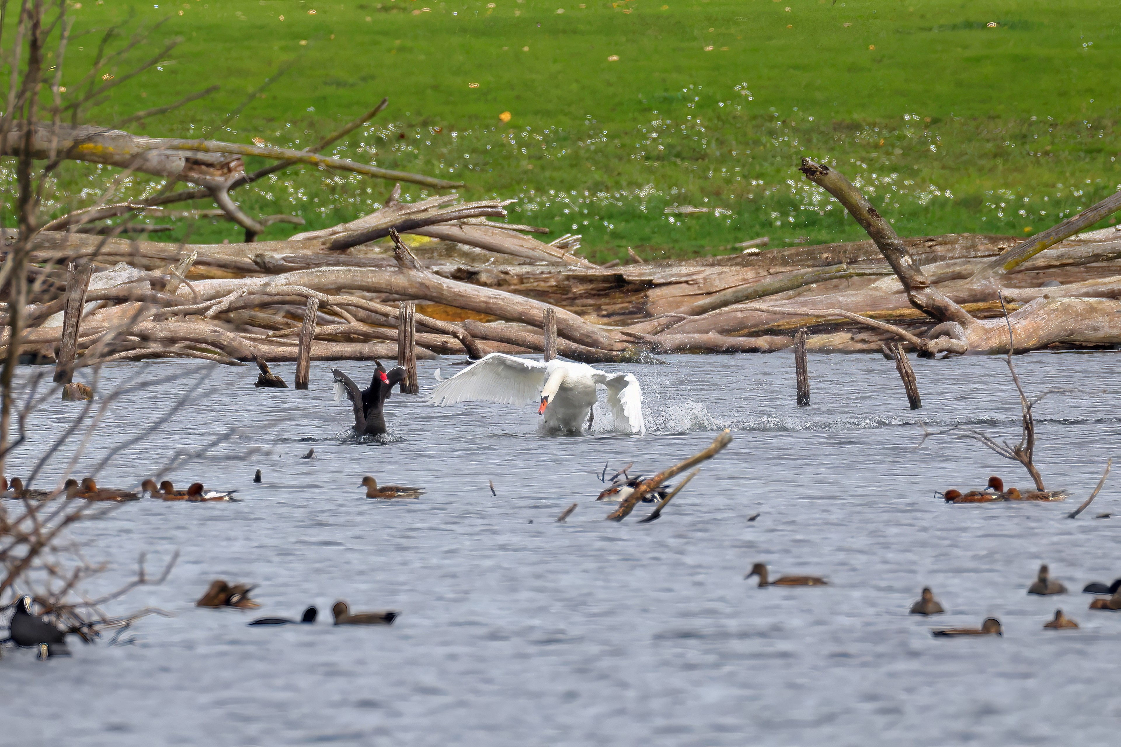 Höckerschwan vertreibt Trauerschwan - Rheingold Natur- und Tierfotografie