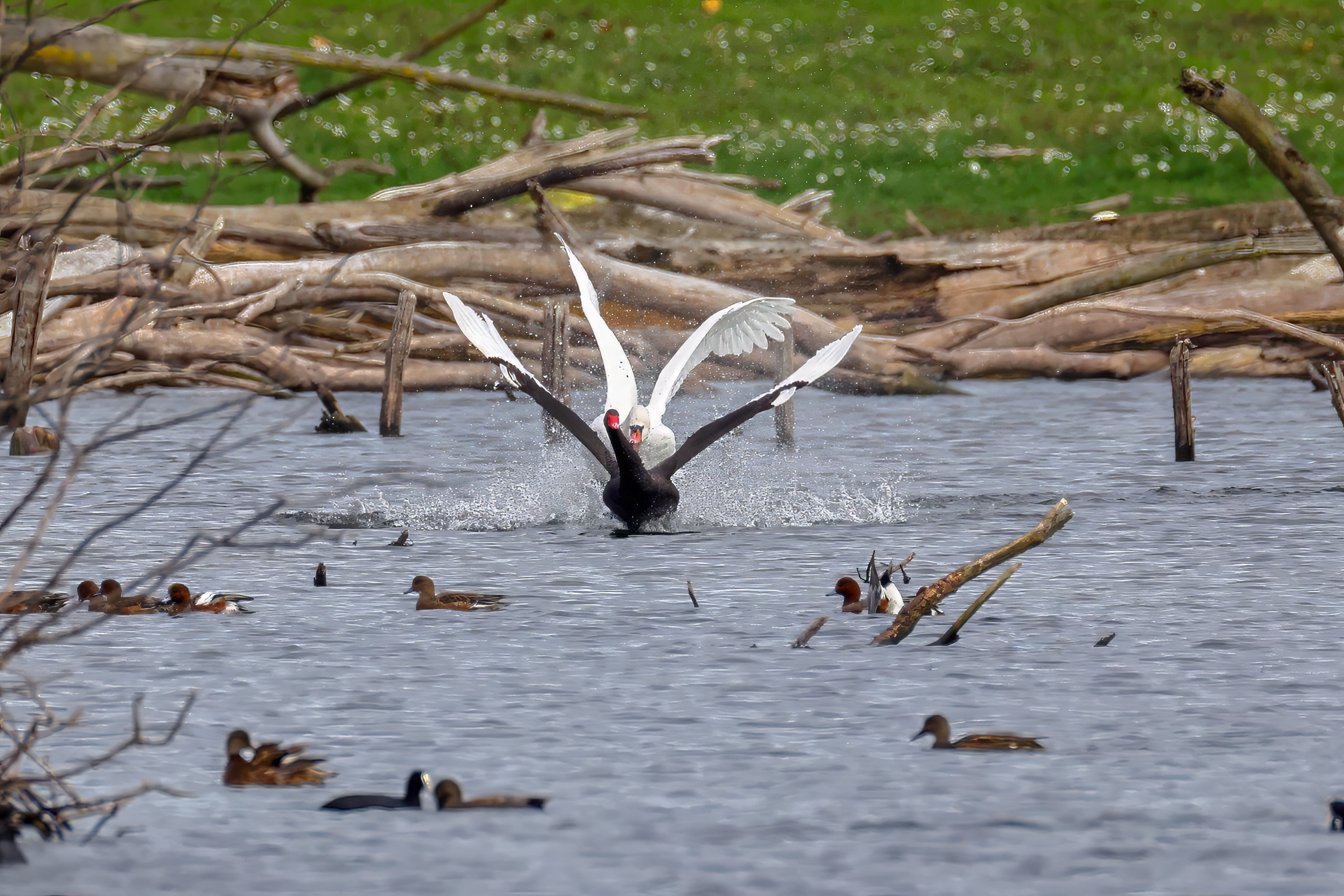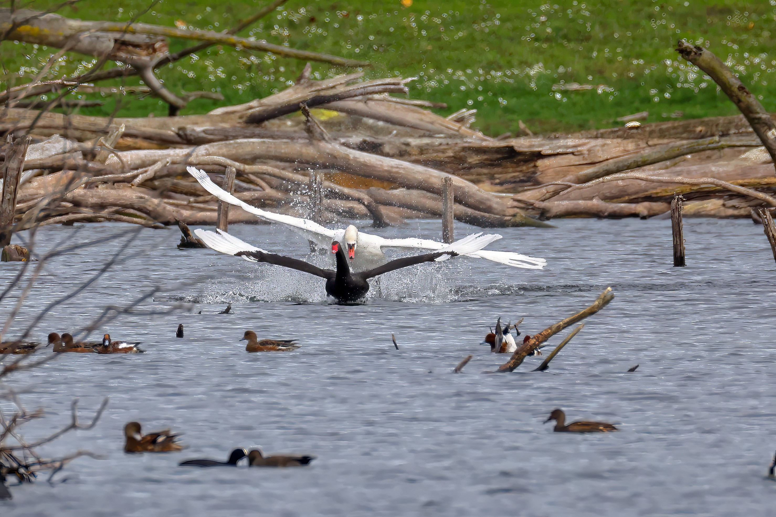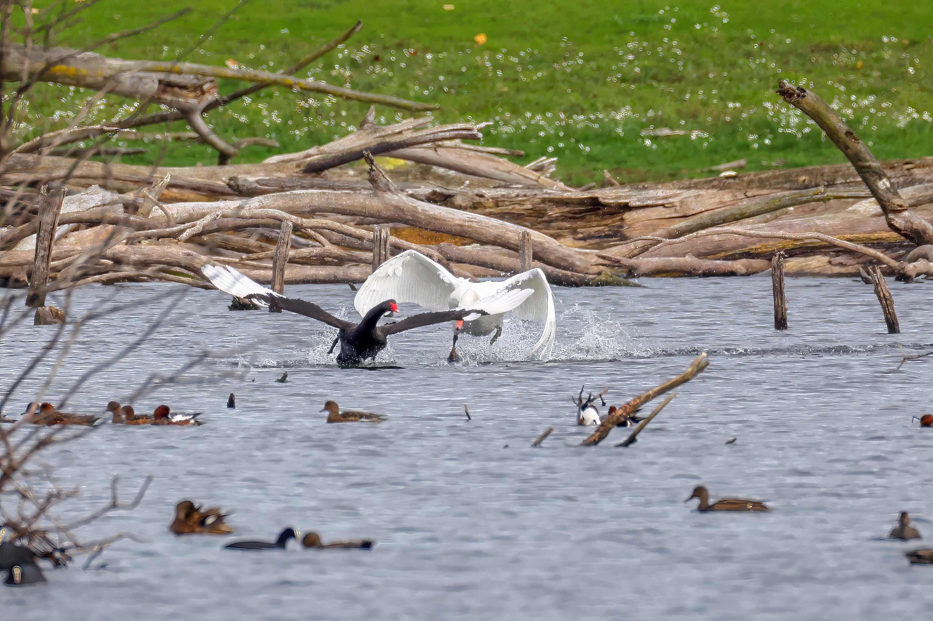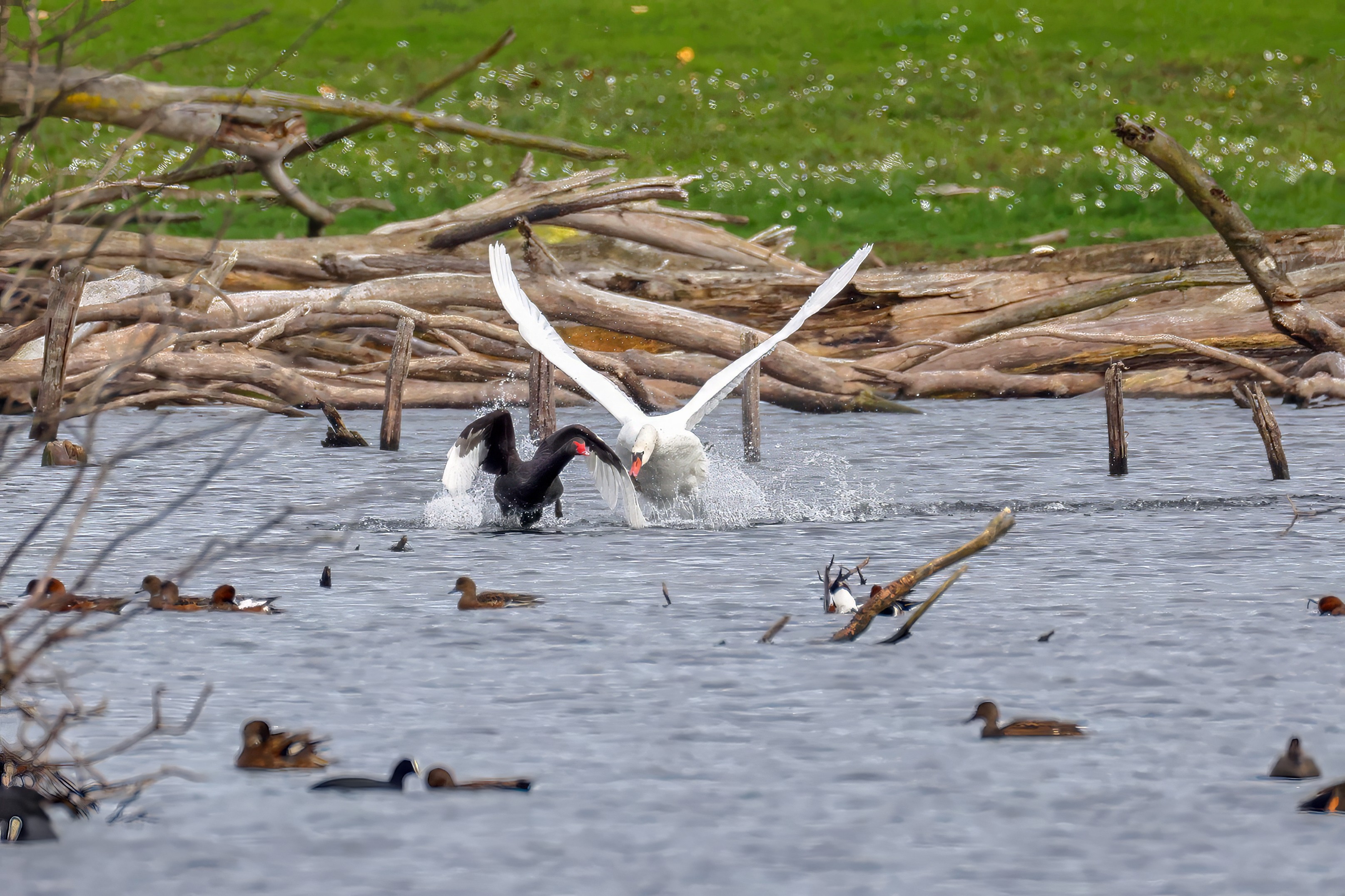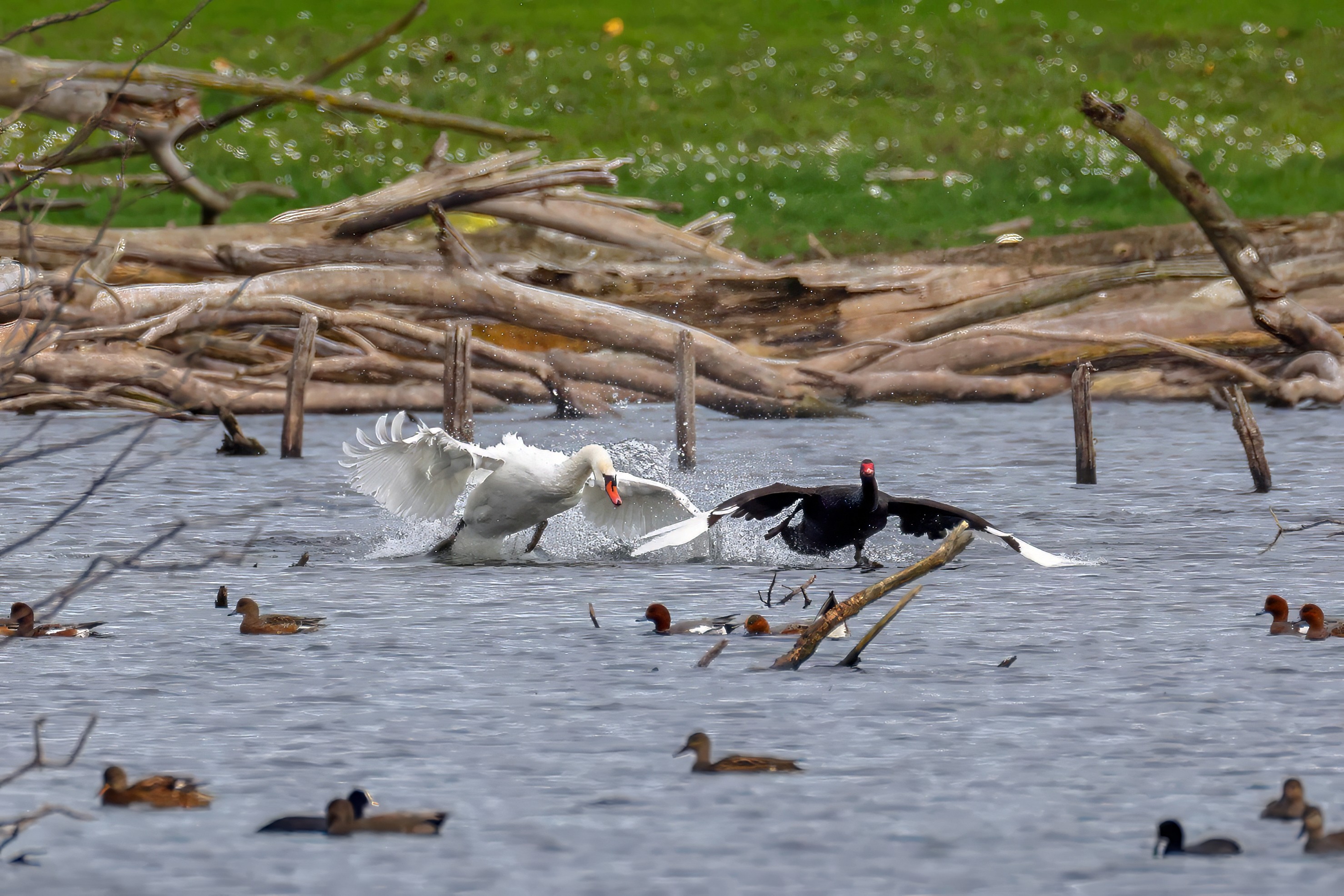 Höckerschwan vertreibt Trauerschwan - Rheingold Natur- und Tierfotografie