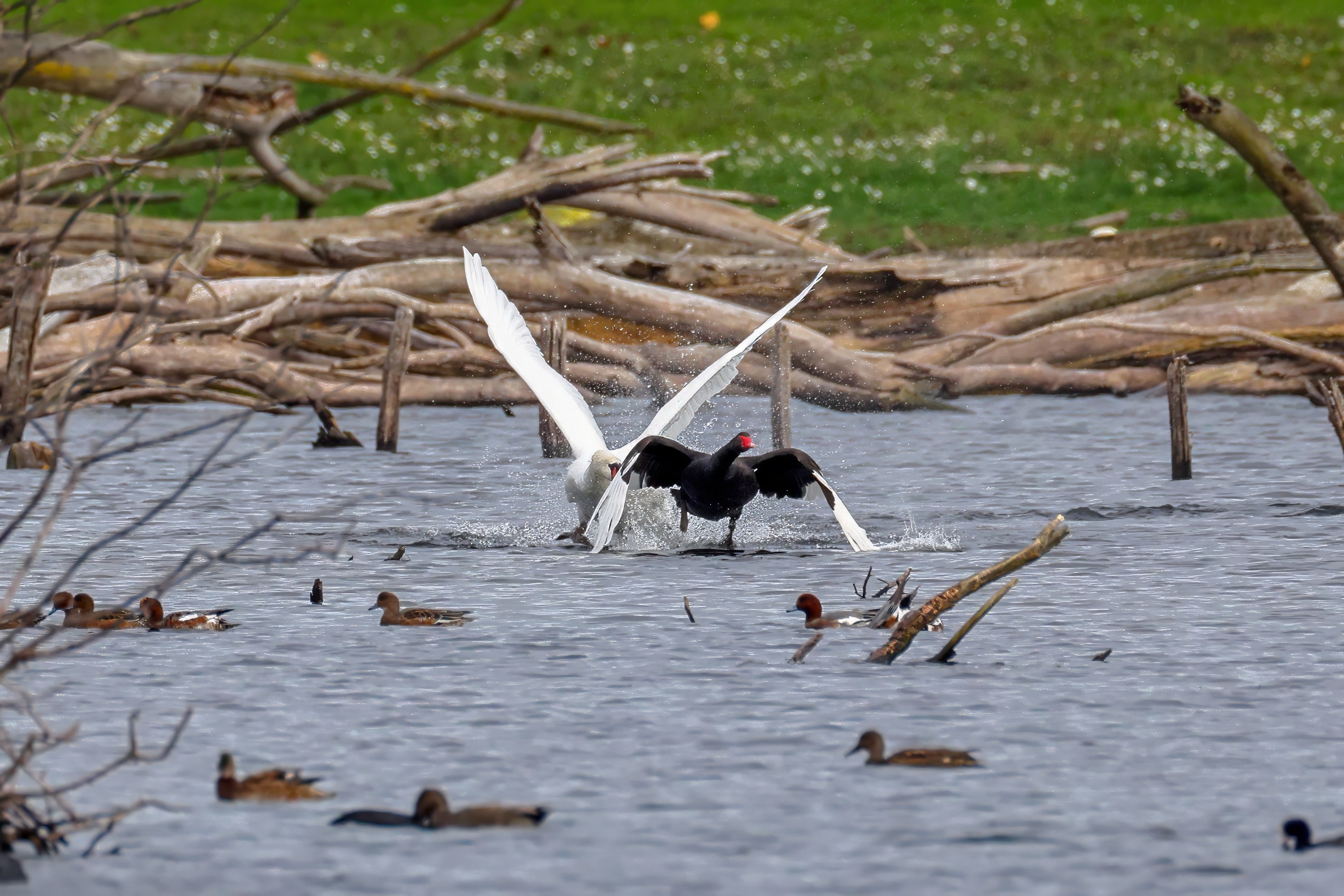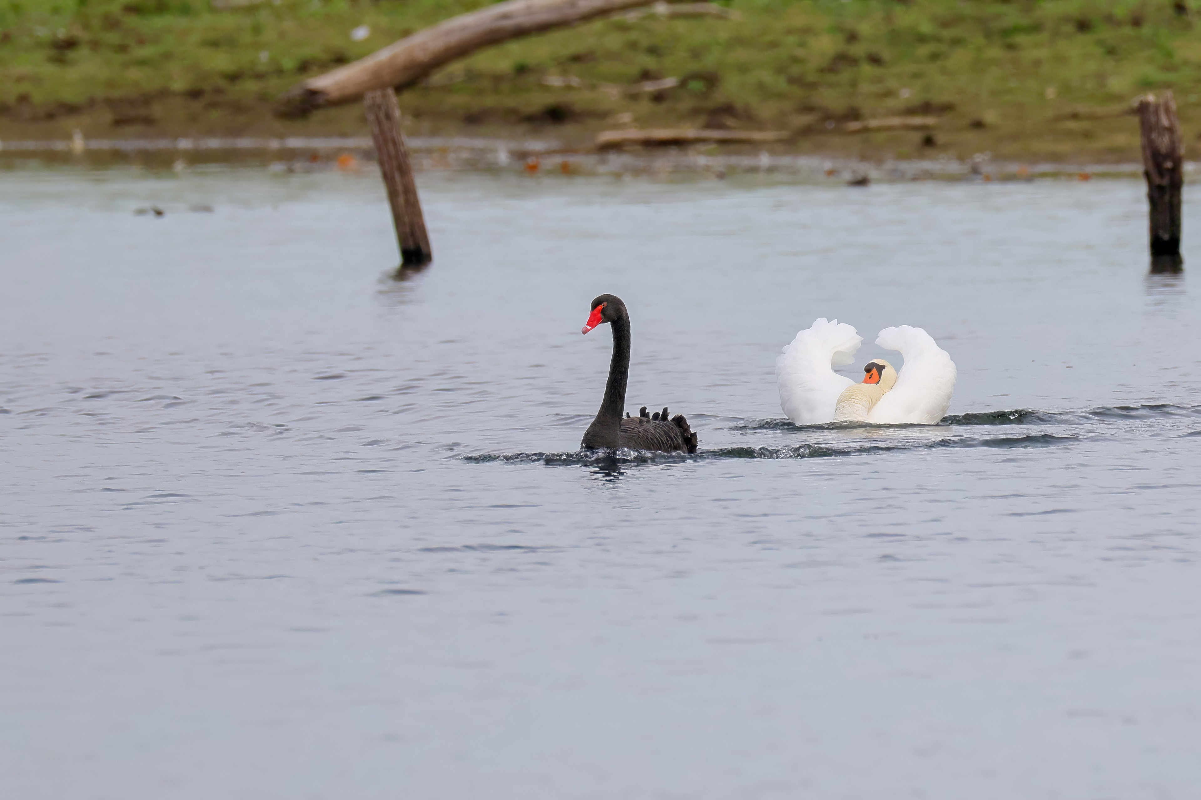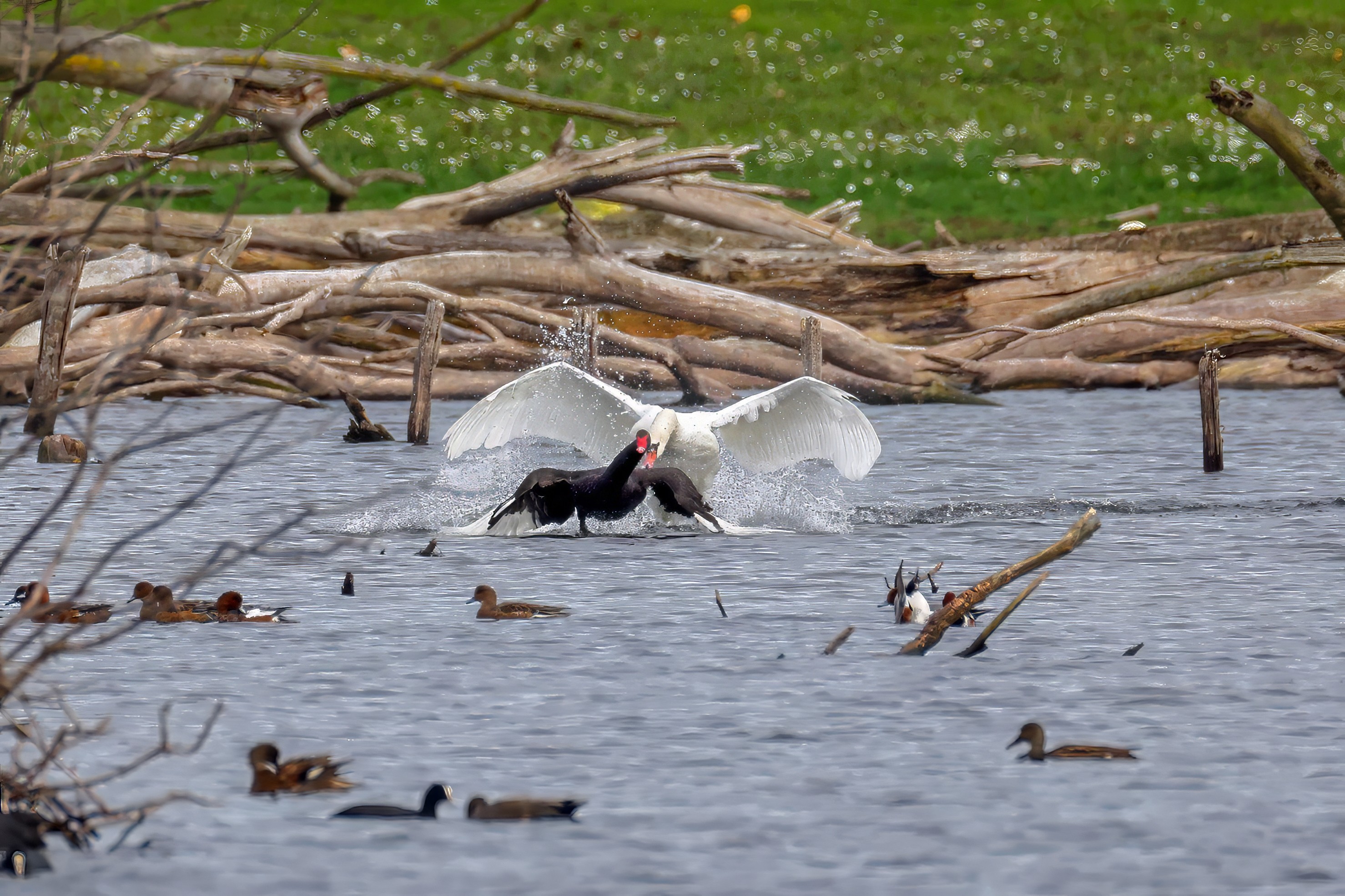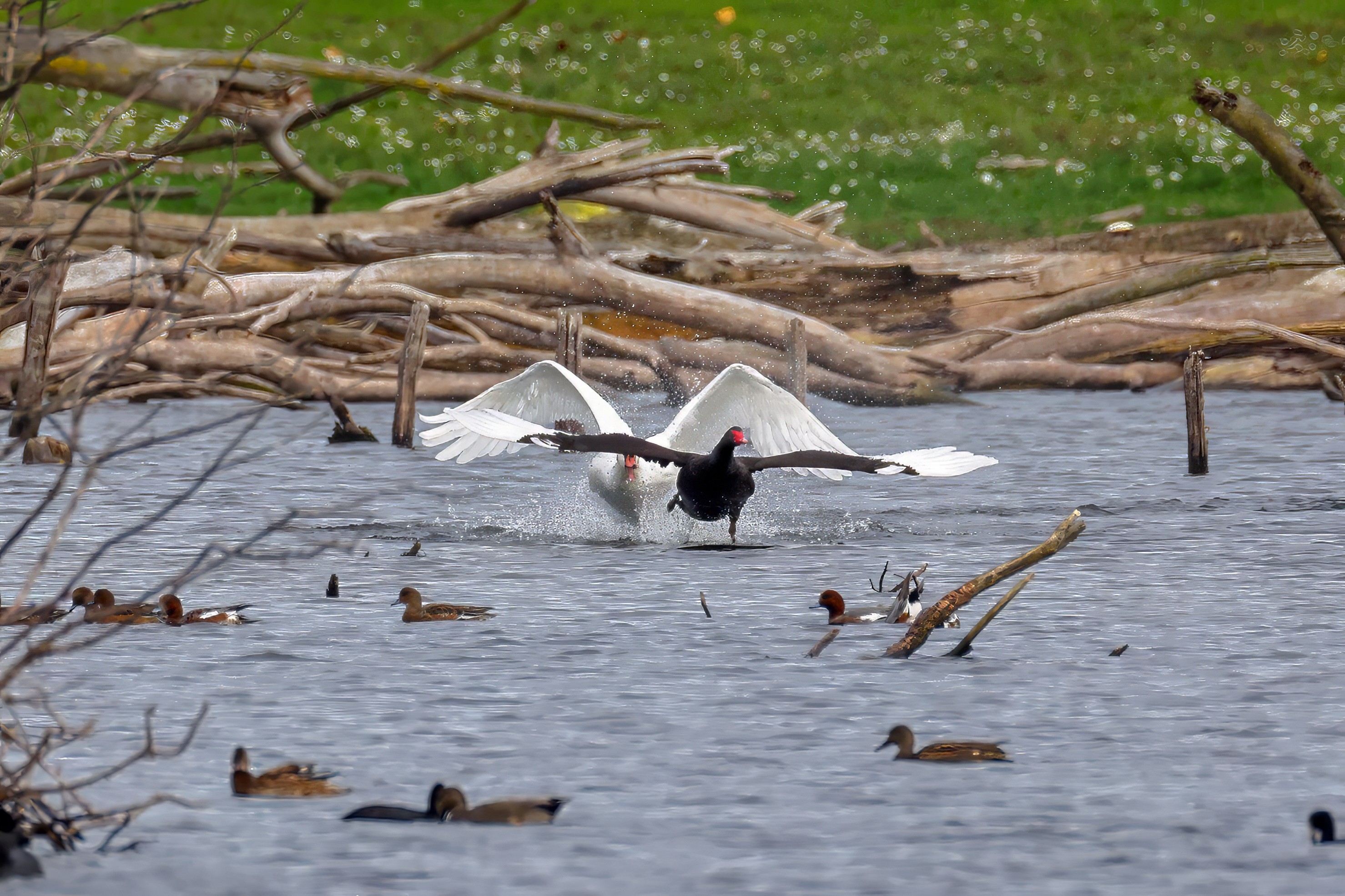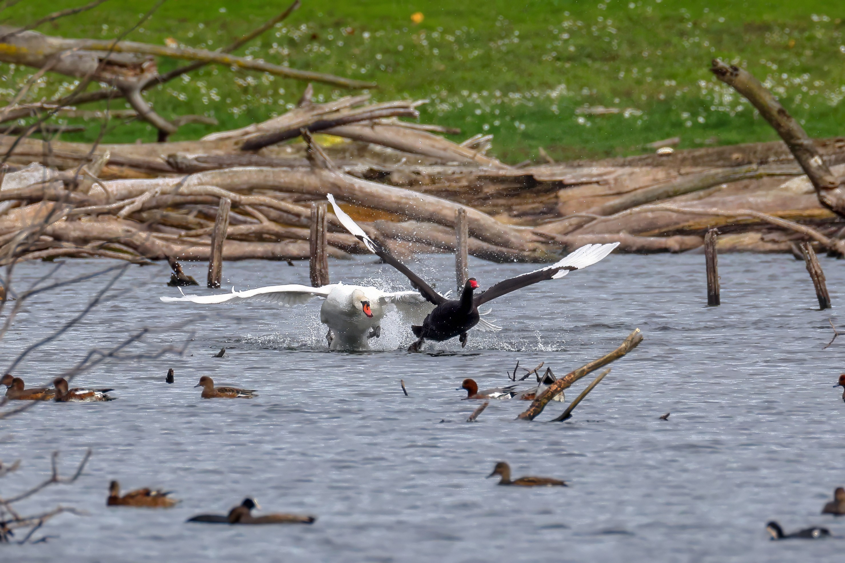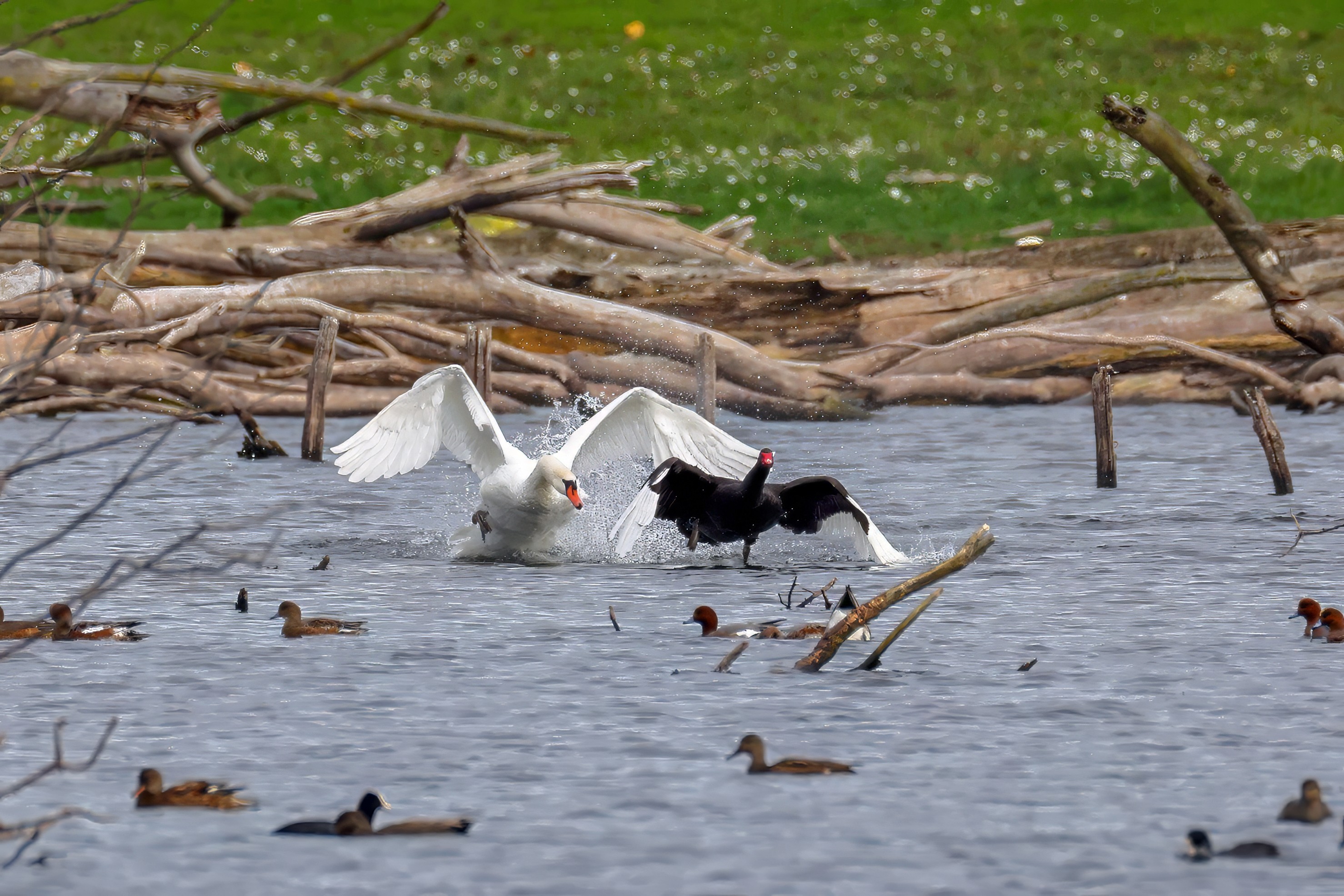 Höckerschwan vertreibt Trauerschwan - Rheingold Natur- und Tierfotografie