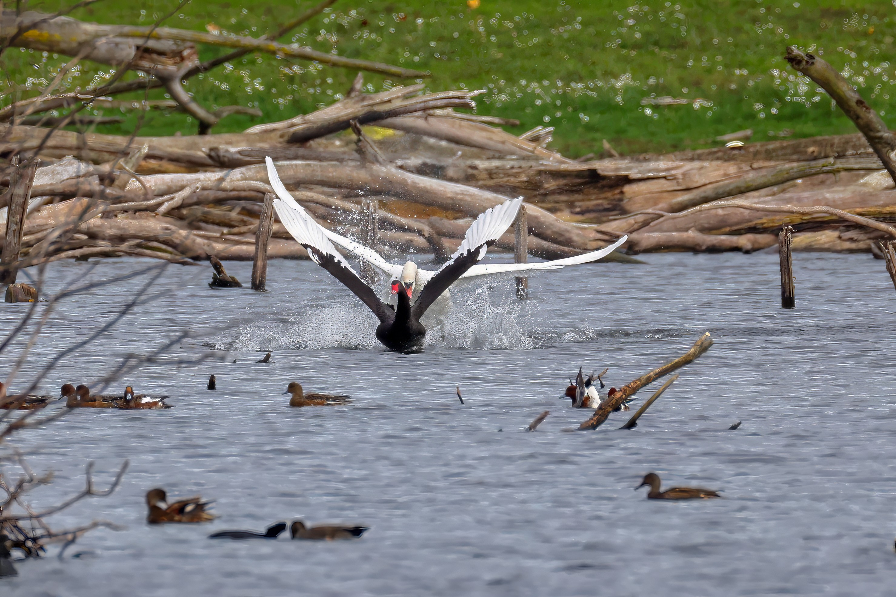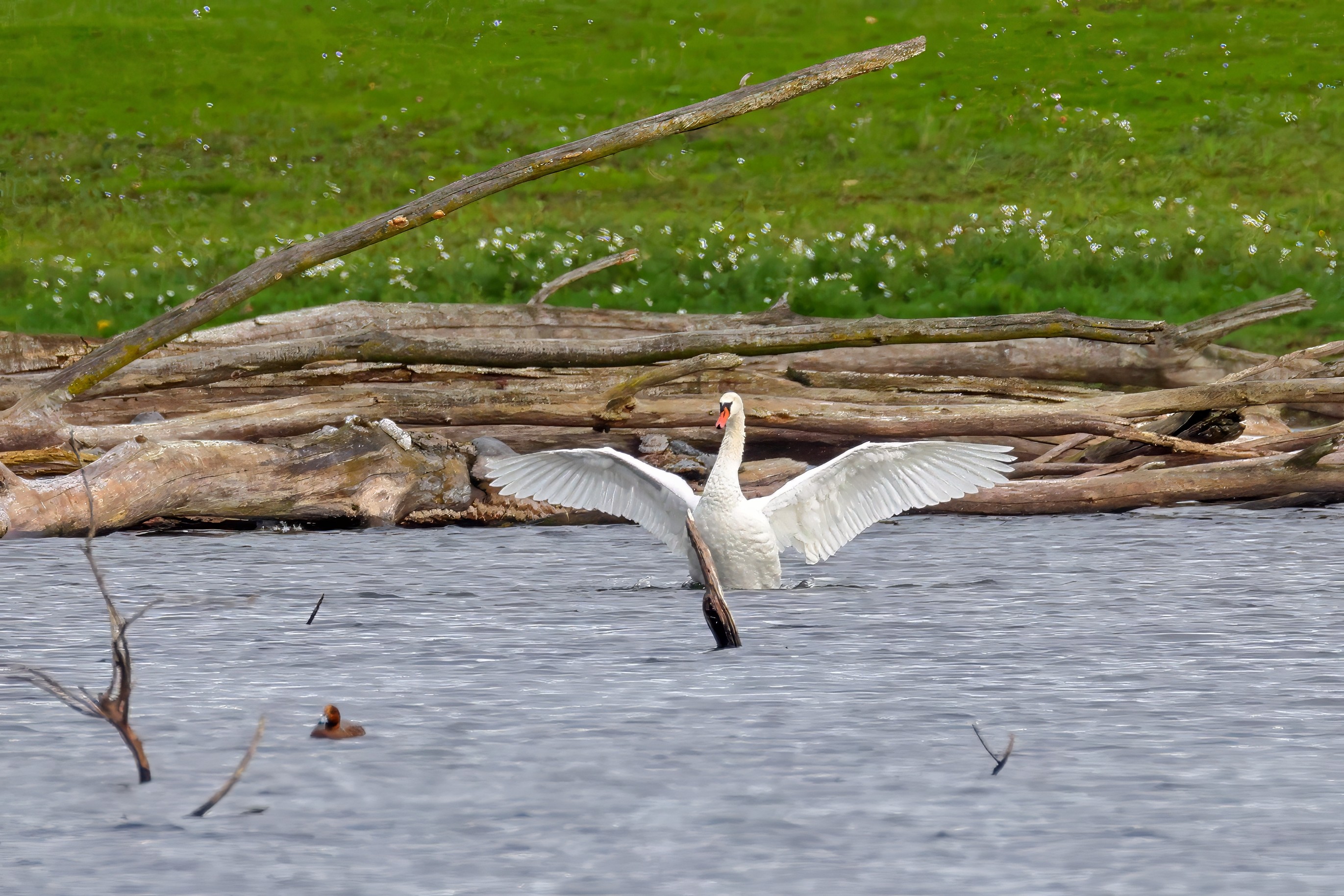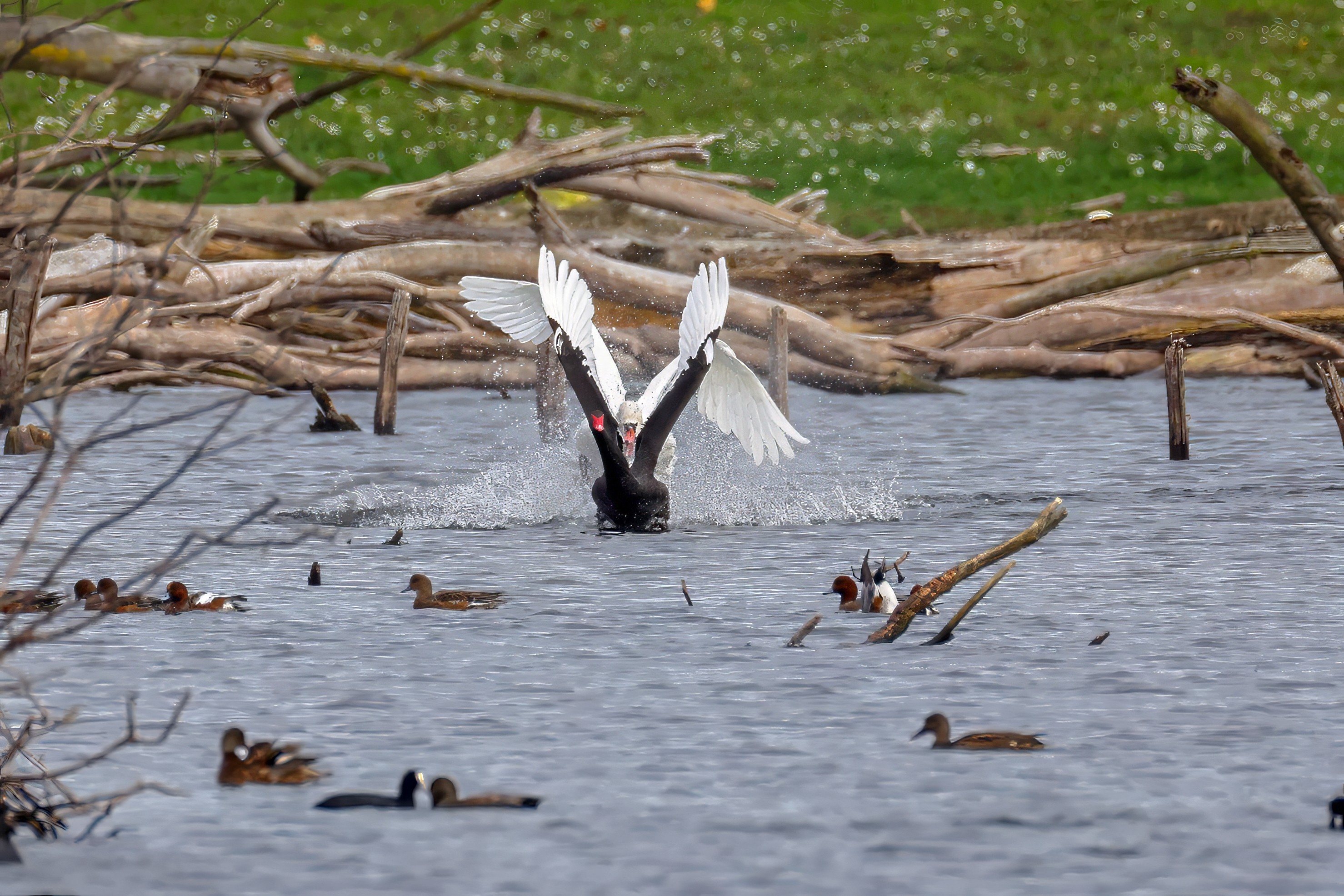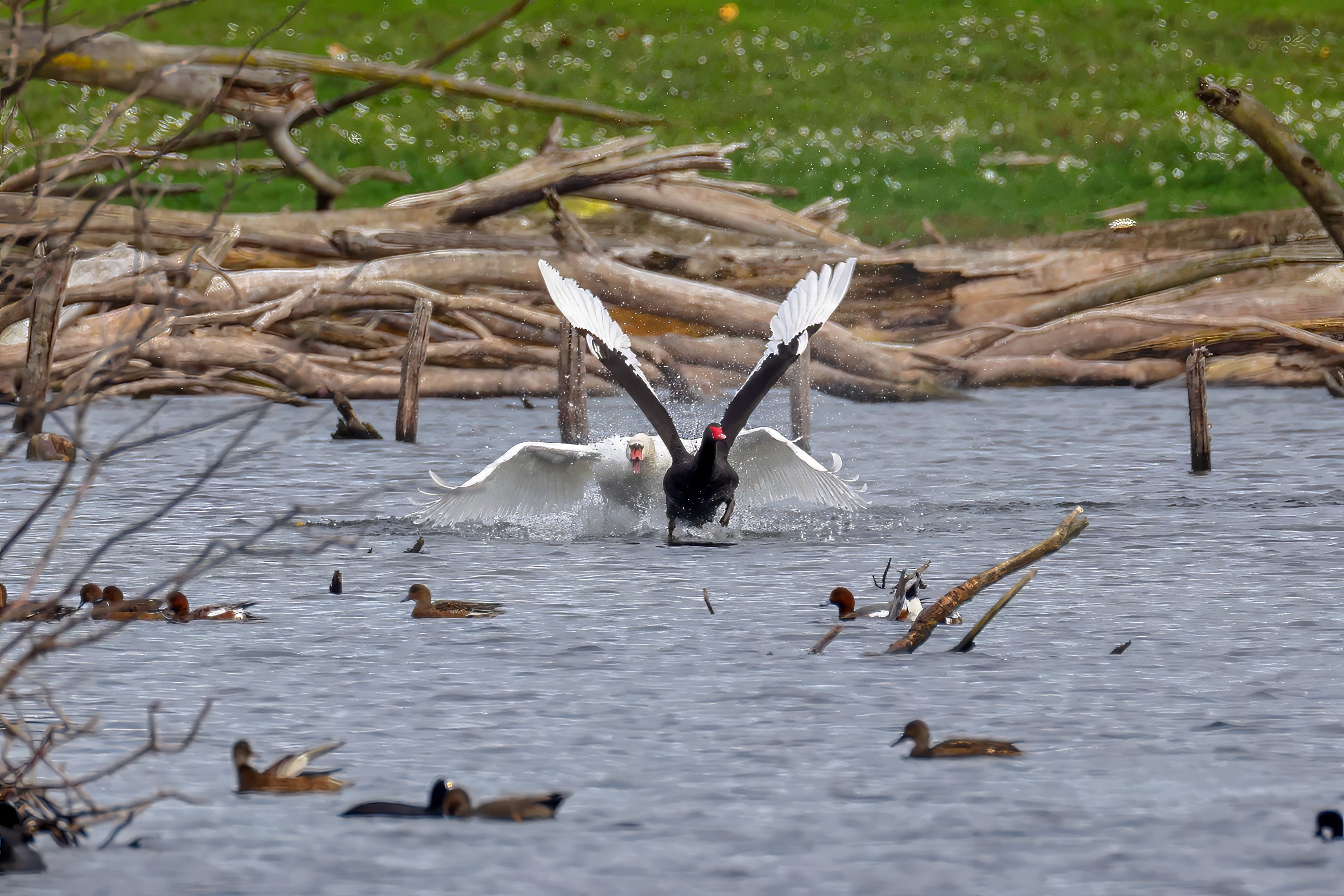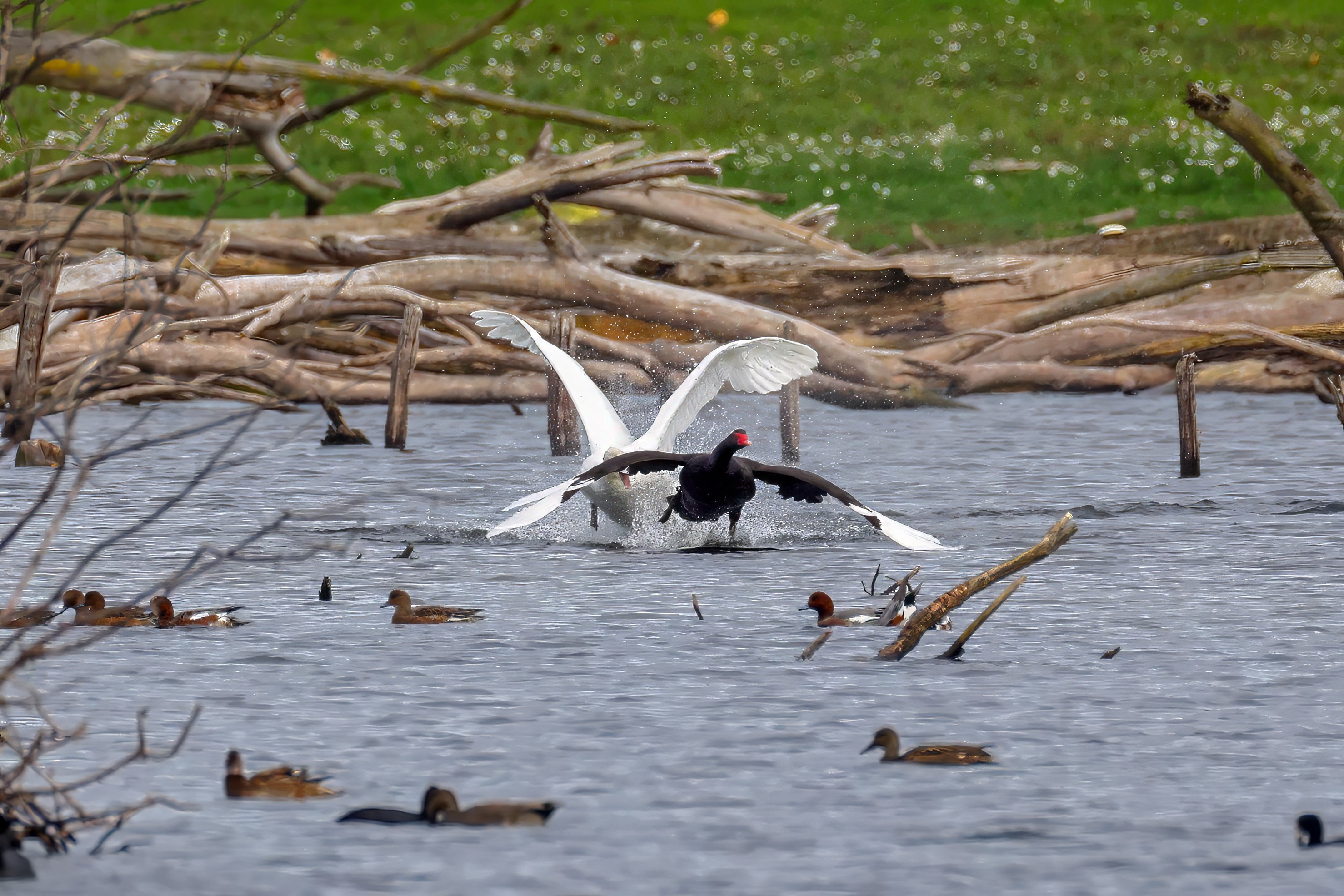 Höckerschwan vertreibt Trauerschwan - Rheingold Natur- und Tierfotografie