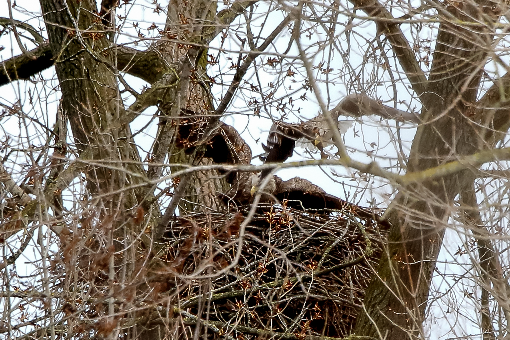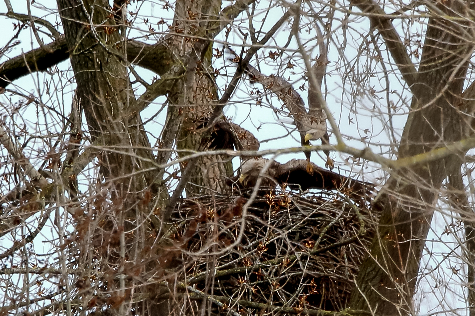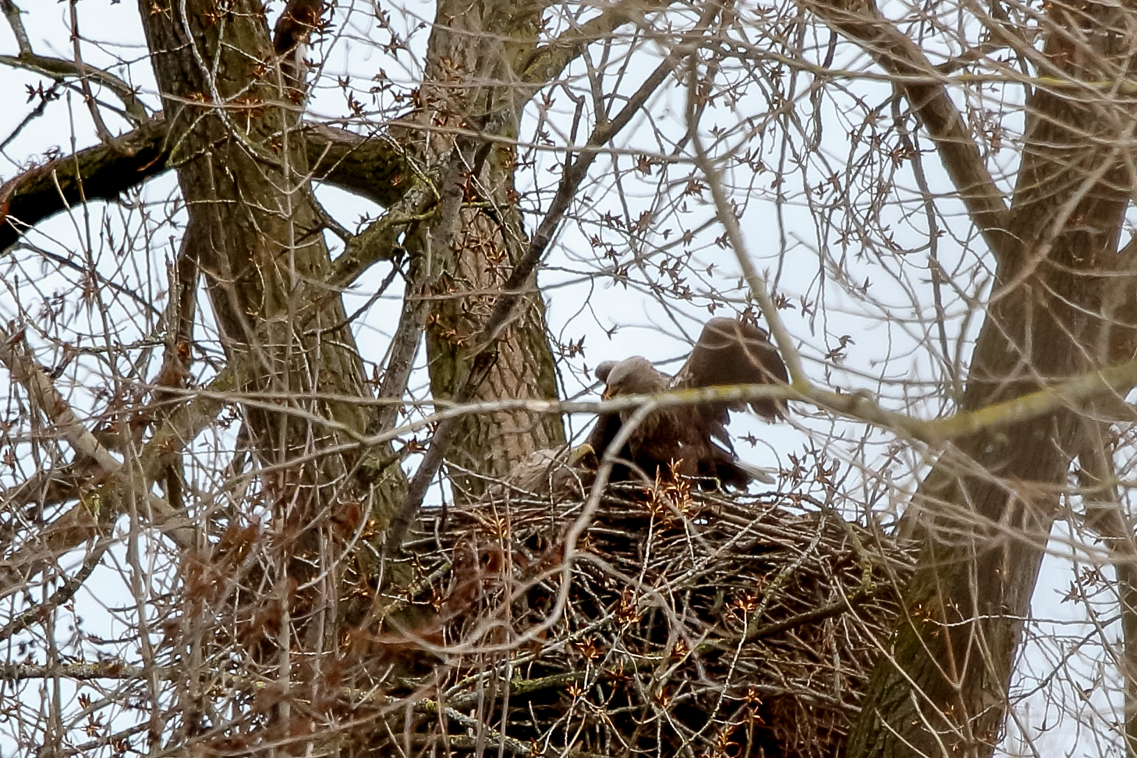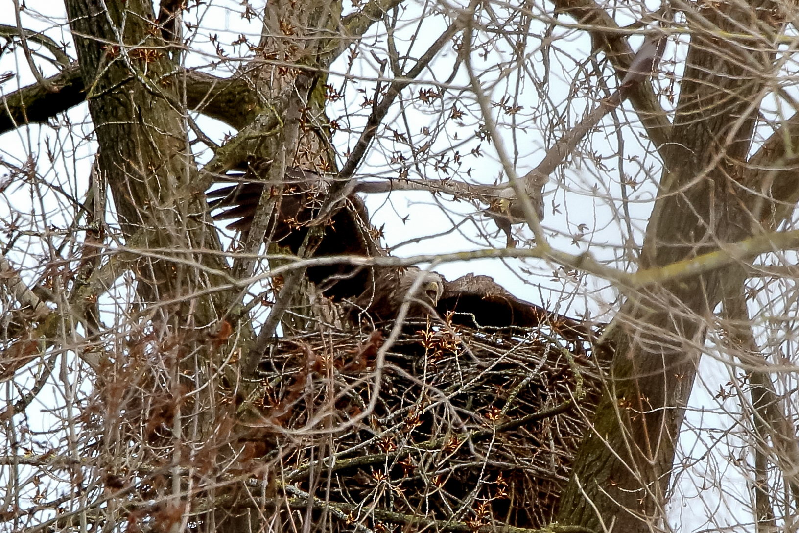 Anfang März wurde der Niederrhein durch ein Sturmtief mit heftigen Orkanböen heimgesucht. Der Horst sowie die Seeadler haben das Wetter gut überstanden.