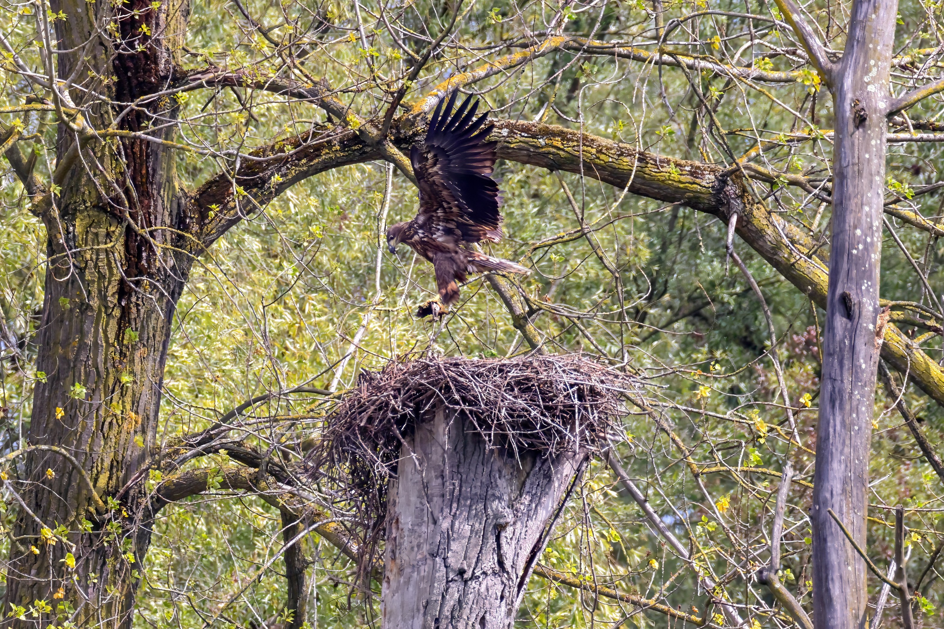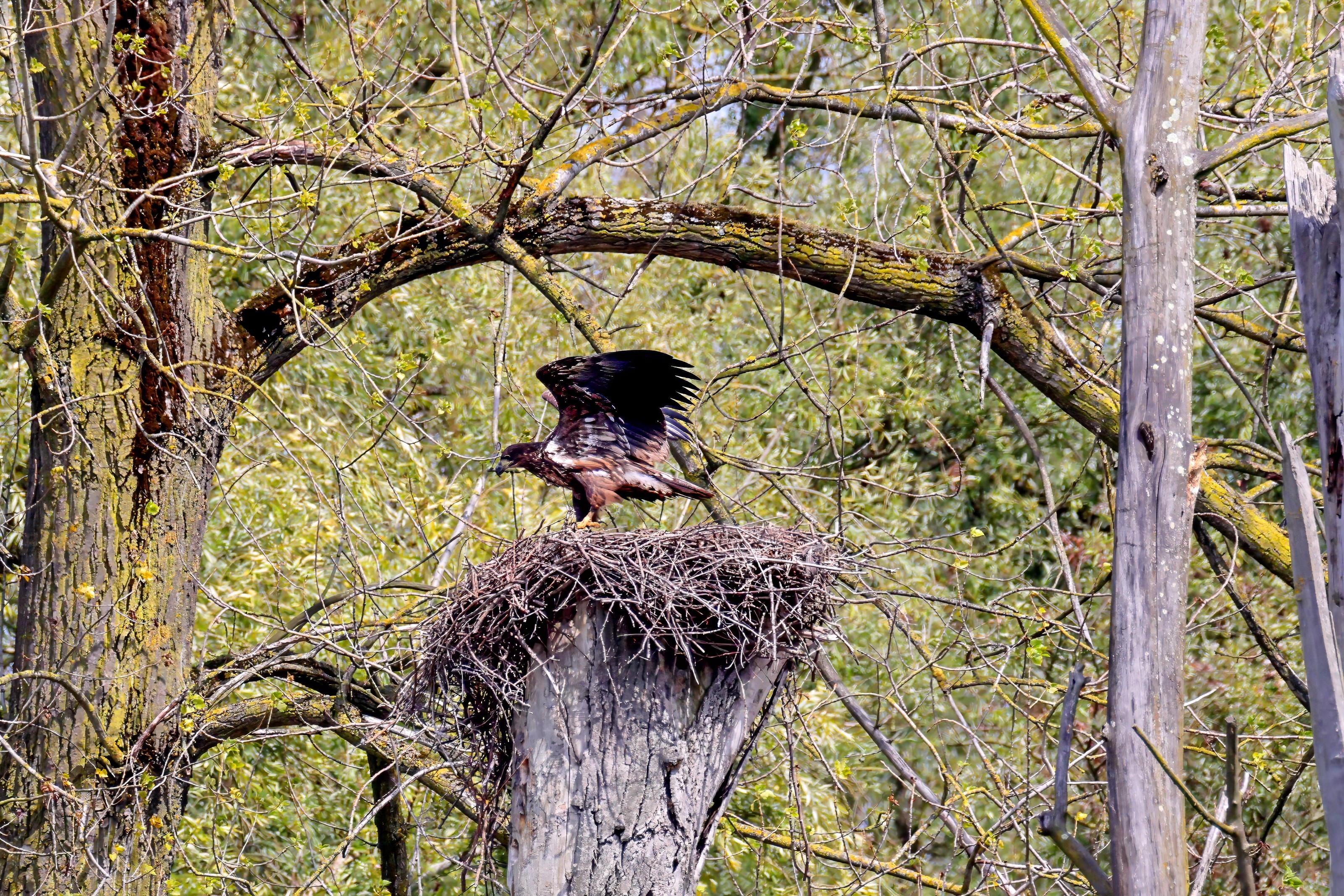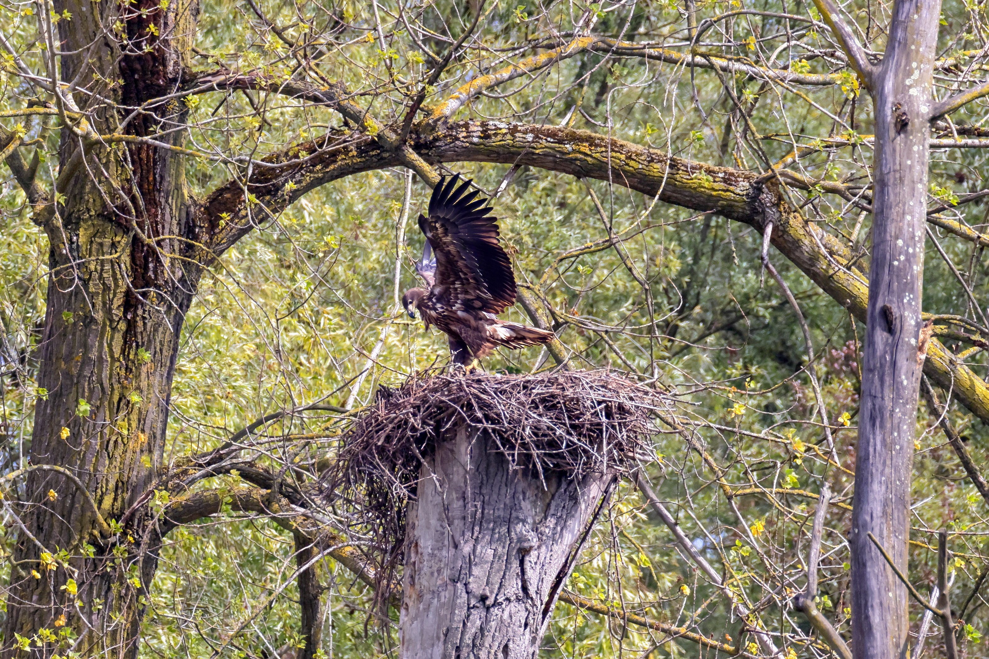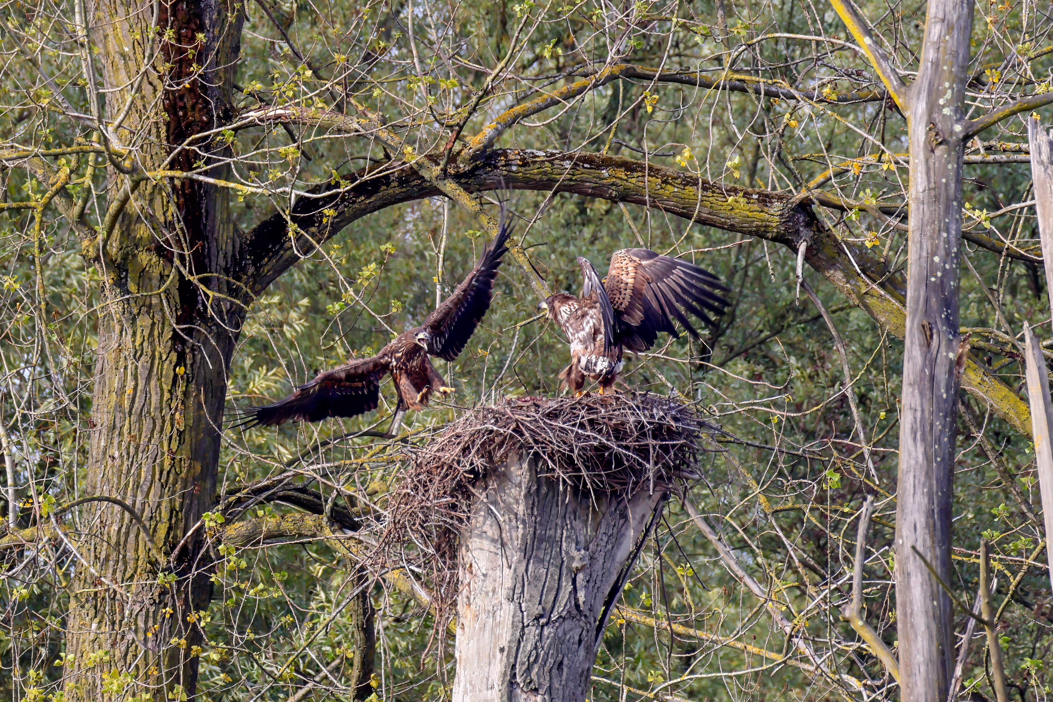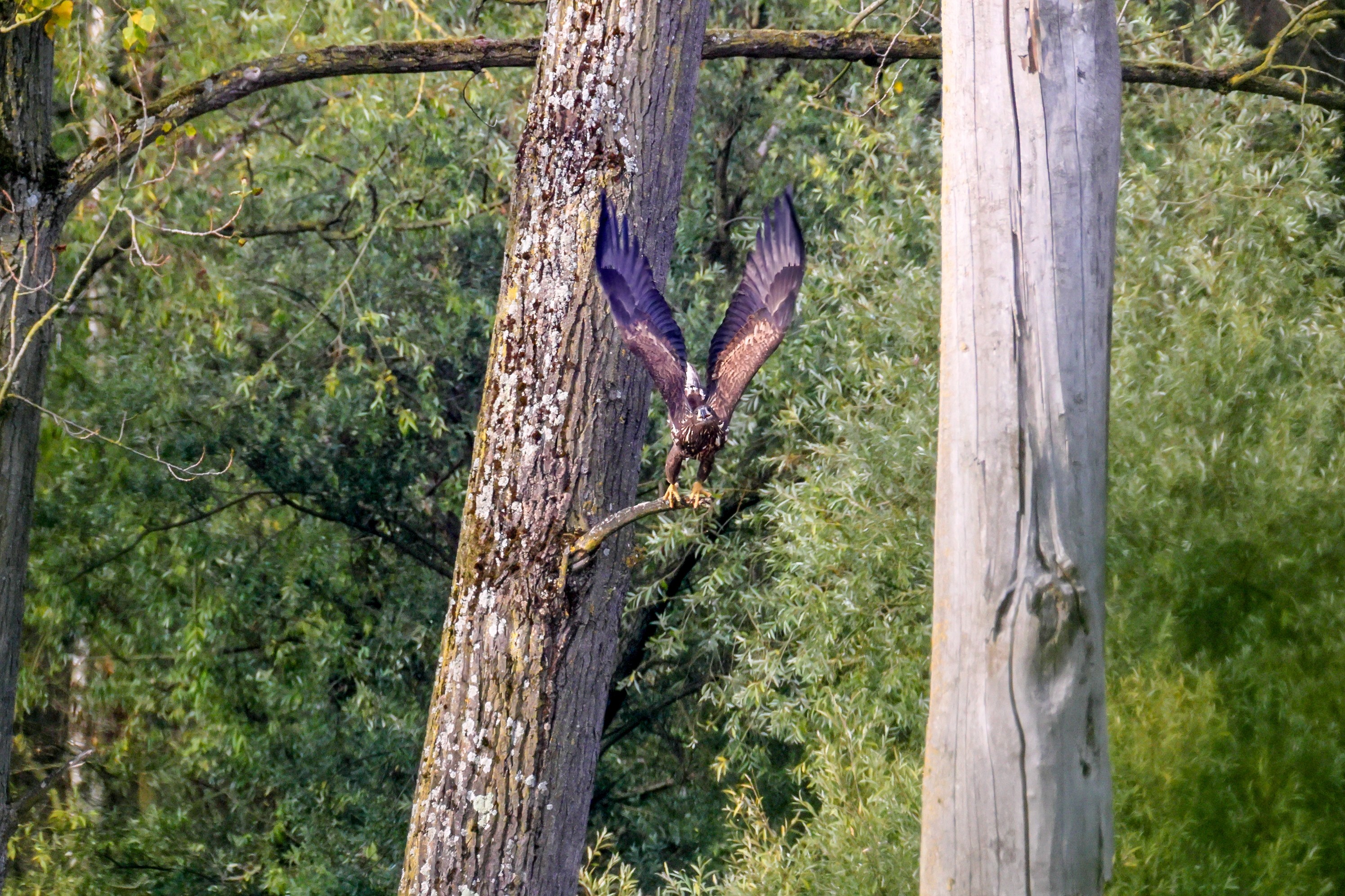 In der warmen Jahreszeit lohnt sich ein genauer Blick auf die Jungseeadler der Bislicher Insel. Sie haben sich prächtig entwickelt und zeigen inzwischen beeindruckende Flugkünste.