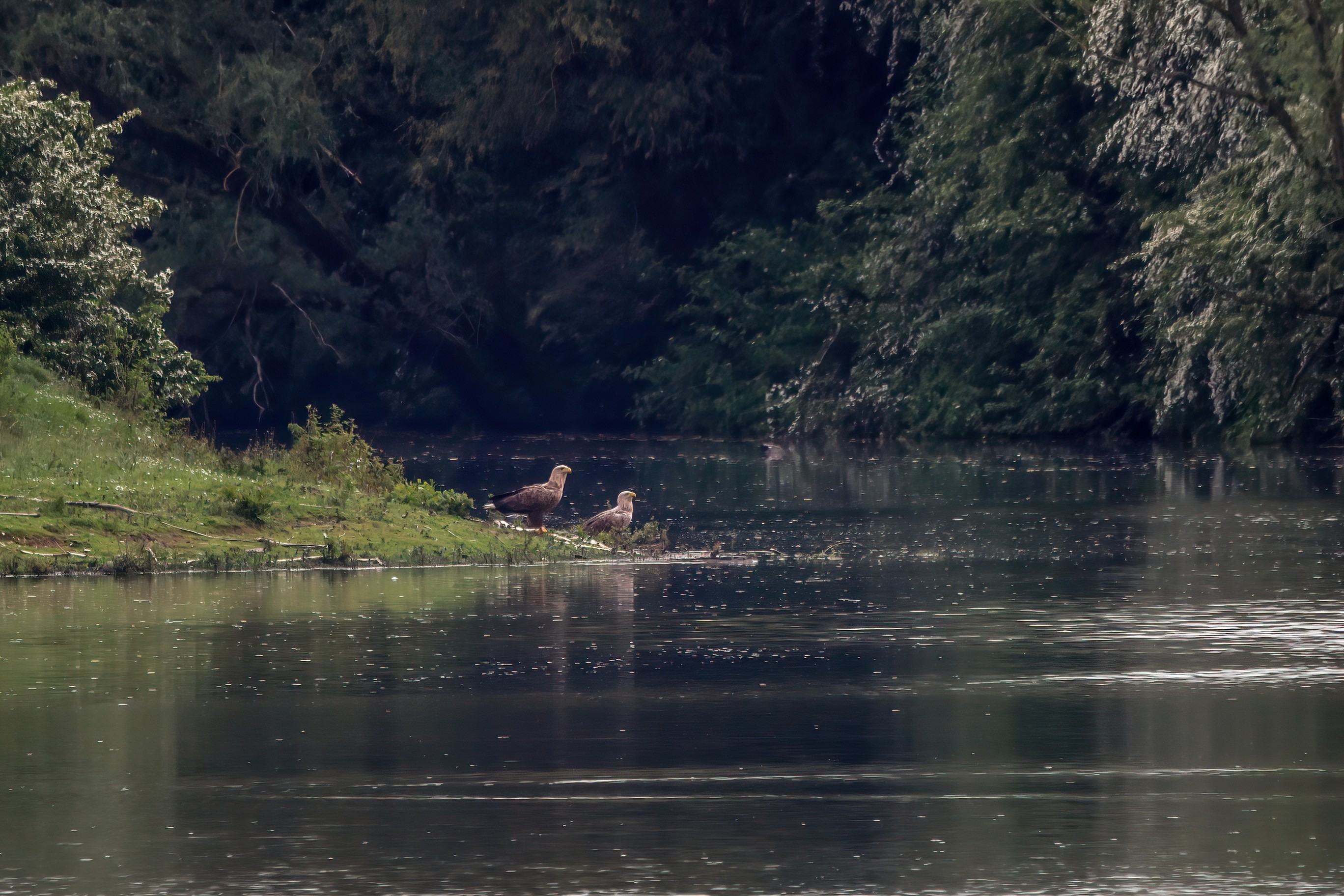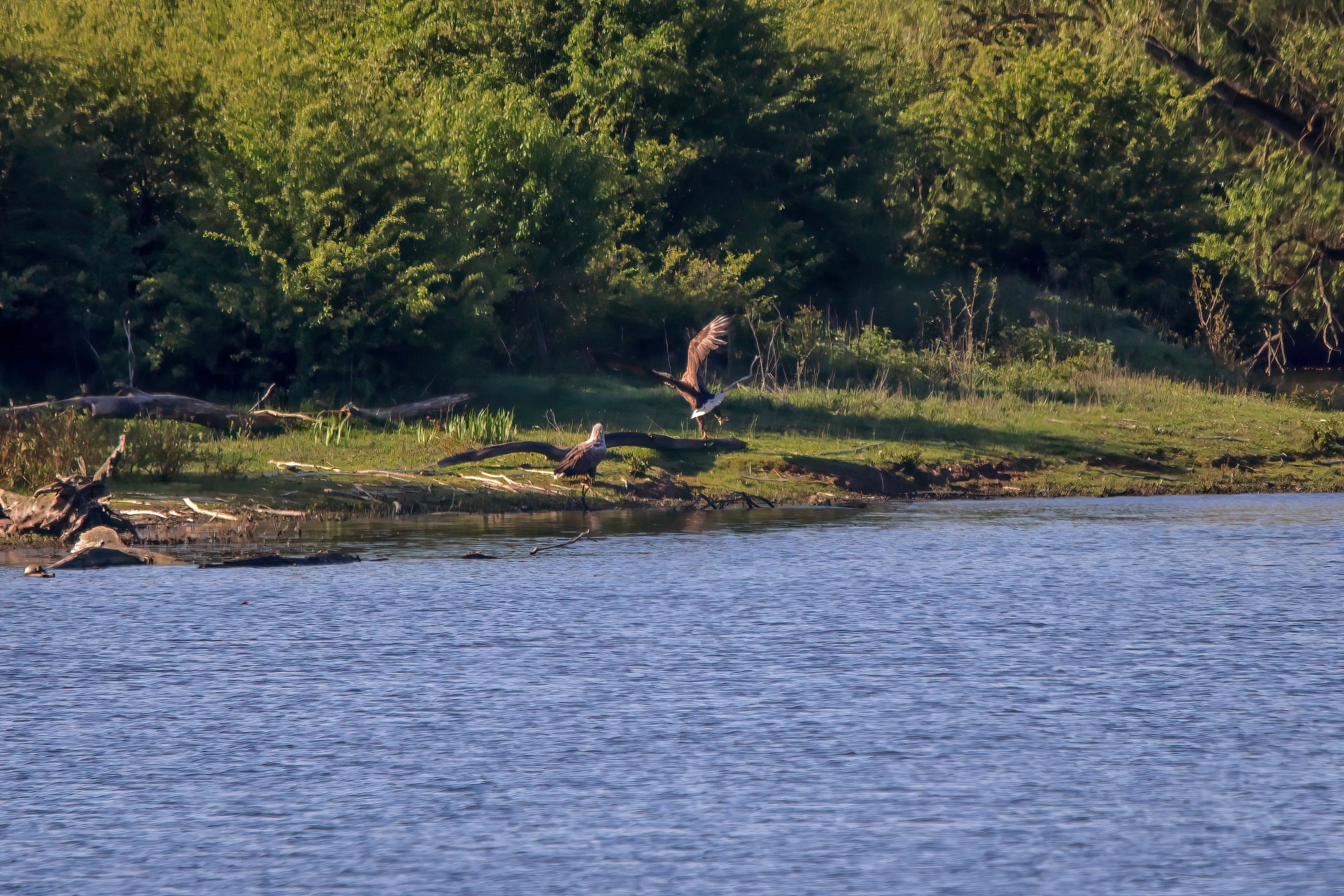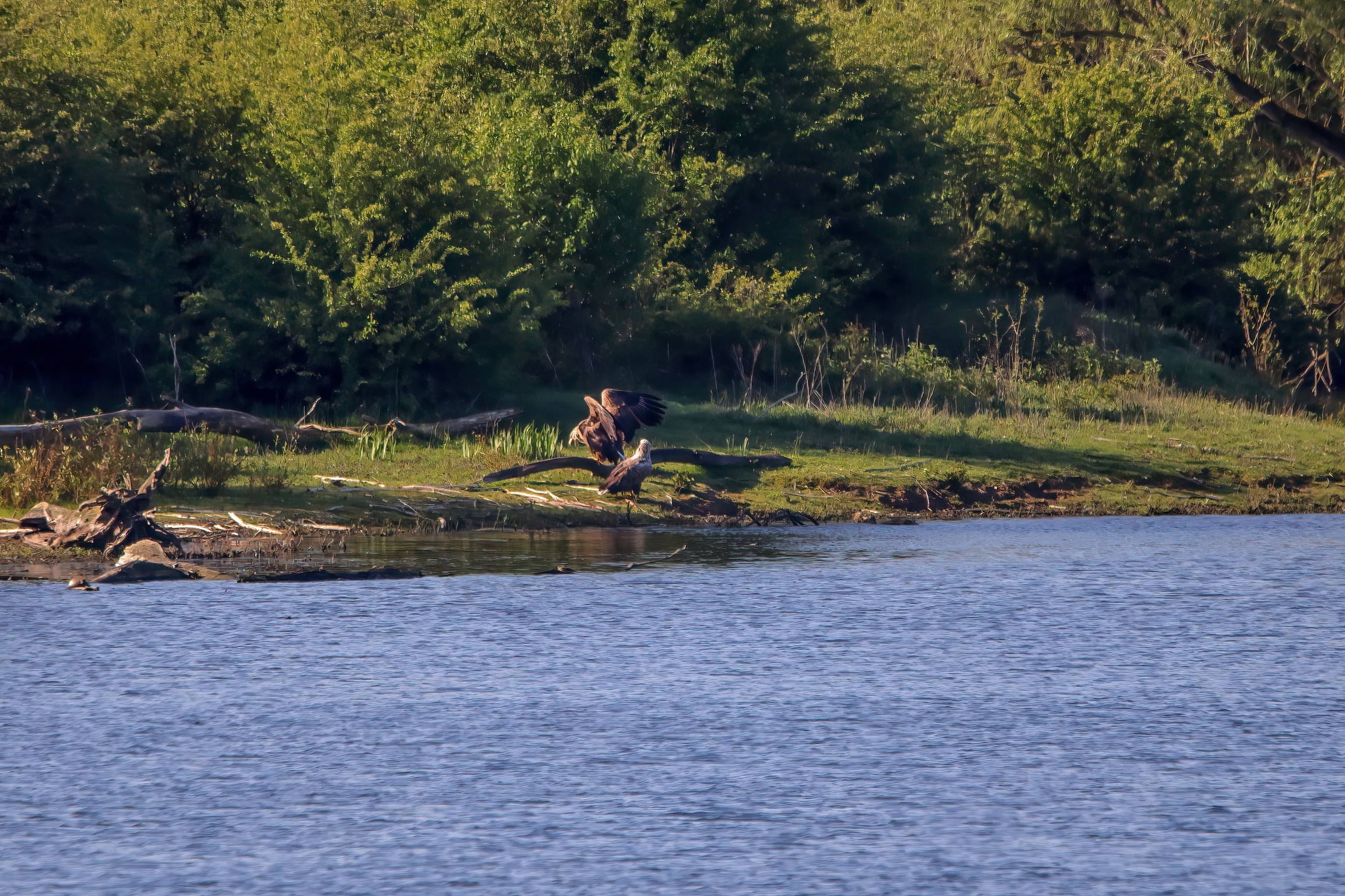 Einerseits bereitet es uns Freude die Jungseeadler voraussichtlich Anfang der vierten Juniwoche als Ästlinge begrüßen zu können, andererseits hatte das Seeadlerweibchen seit der ersten Juniwoche einen schweren Stand ihren Nachwuchs allein zu versorgen. Seit dieser Zeit konnte unser männlicher Seeadler im Habitat nicht mehr gesichtet werden. Weder in den frühen Morgenstunden bis zur Mittagszeit noch vom Nachmittag bis zum Sonnenuntergang zeigte sich der Habitatsgründer auf der Bislicher Insel. Das Seeadlerweibchen übernahm alleinig das Beutegreifen um die schon weitentwickelten Jungvögel ausreichend zu versorgen.