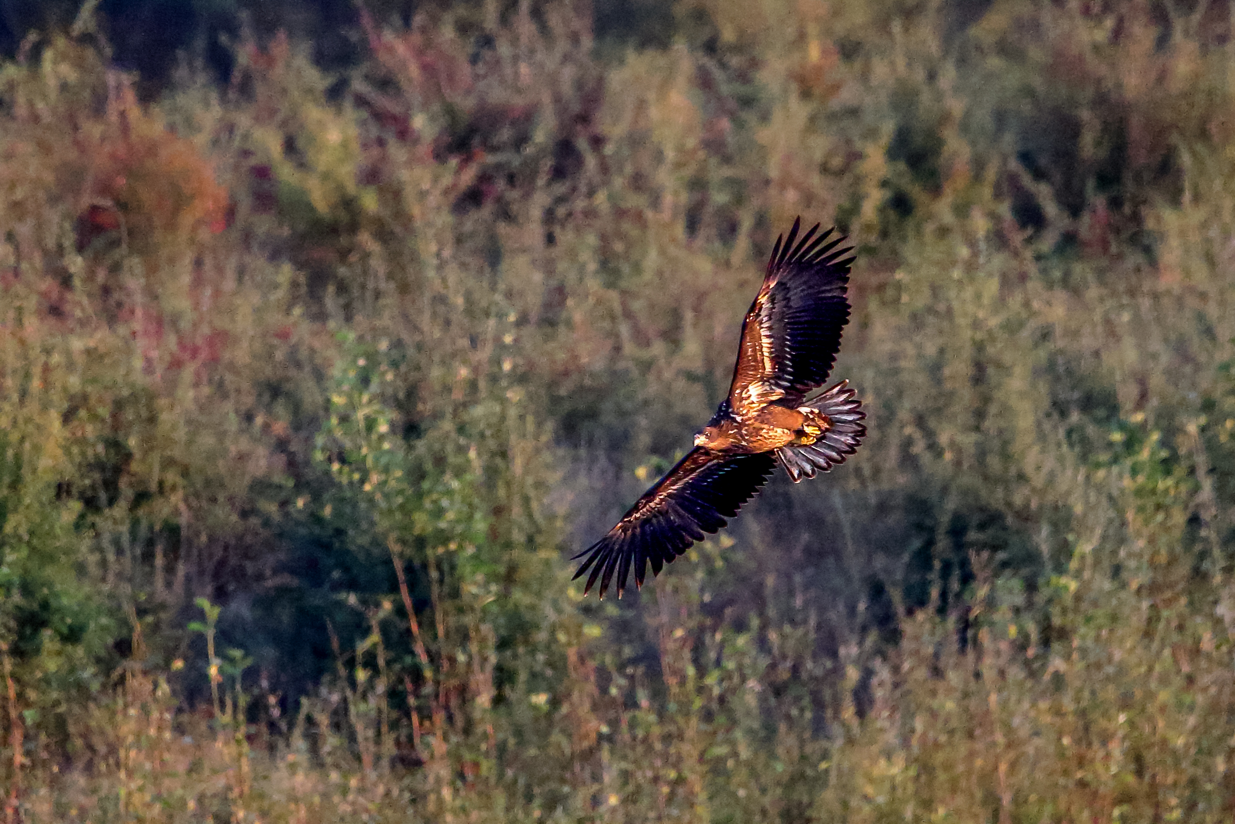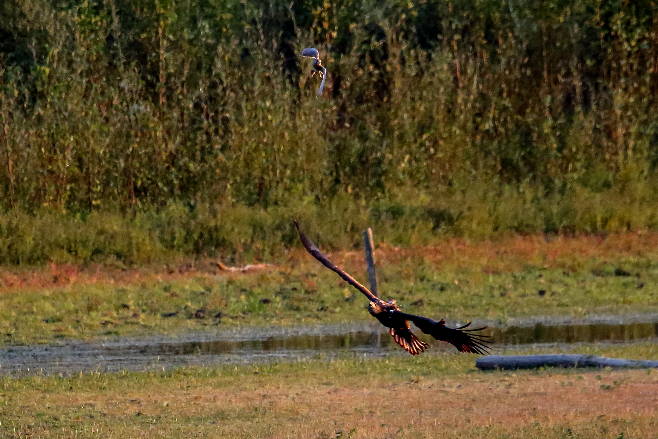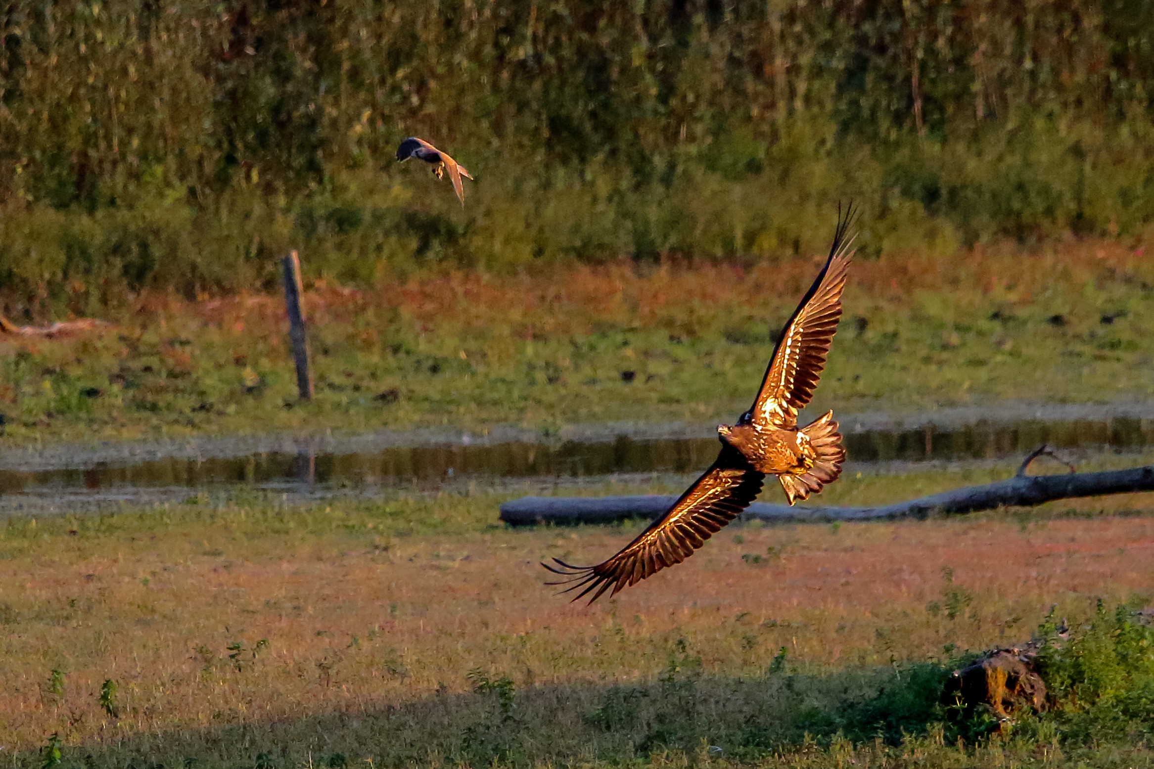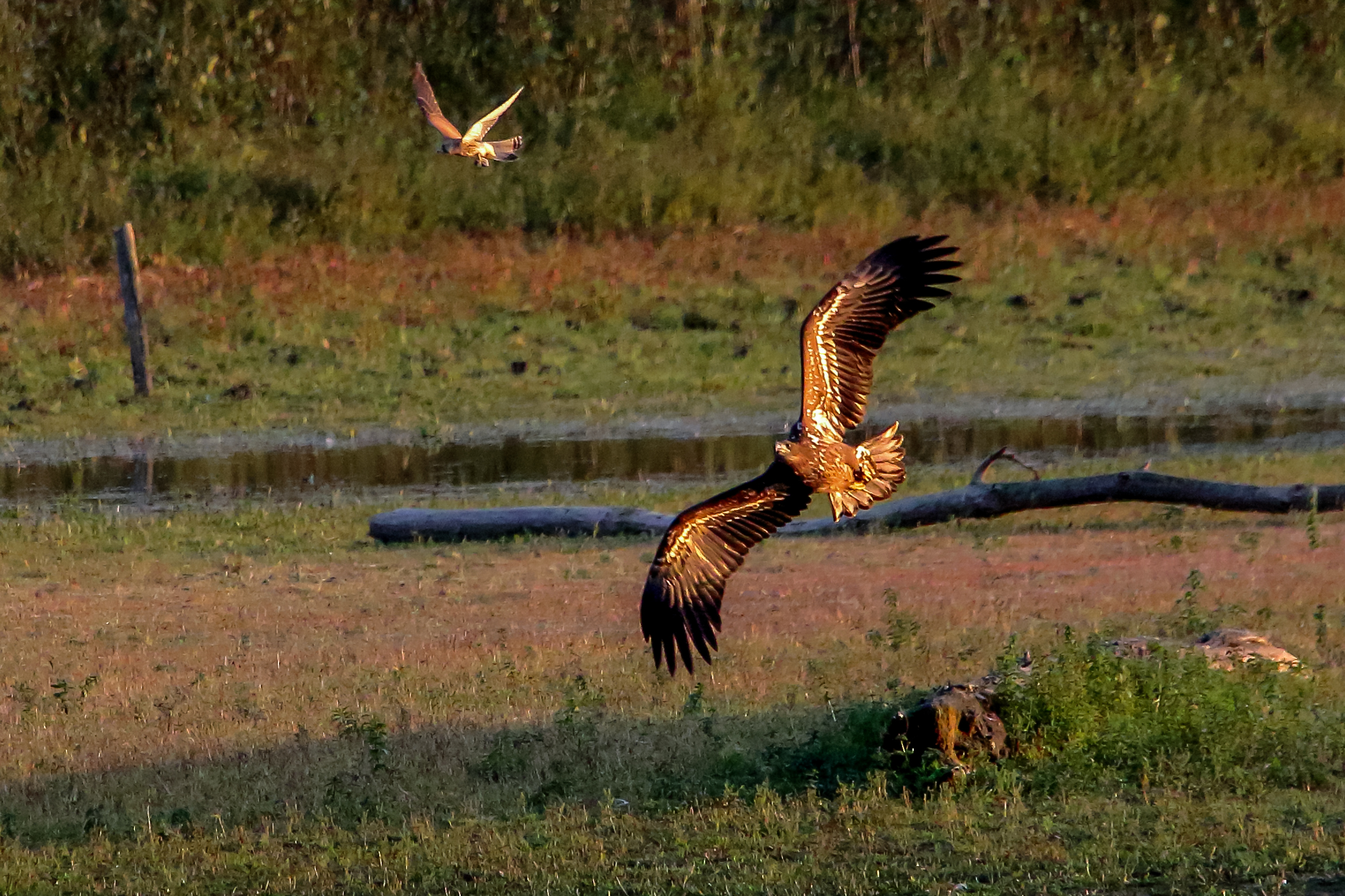 Jungseeadler und streßender Wanderfalke im Restlicht der Abendsonne