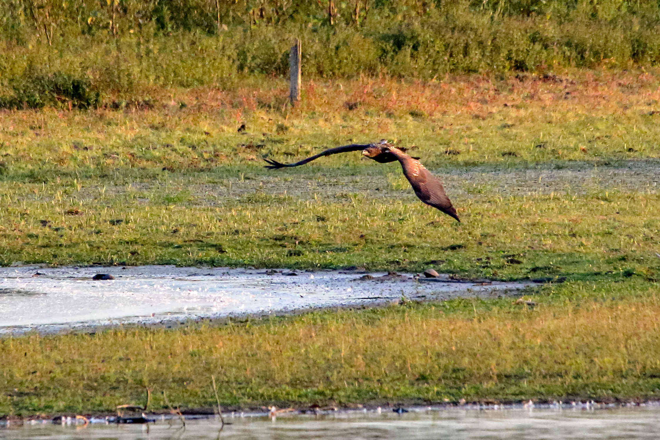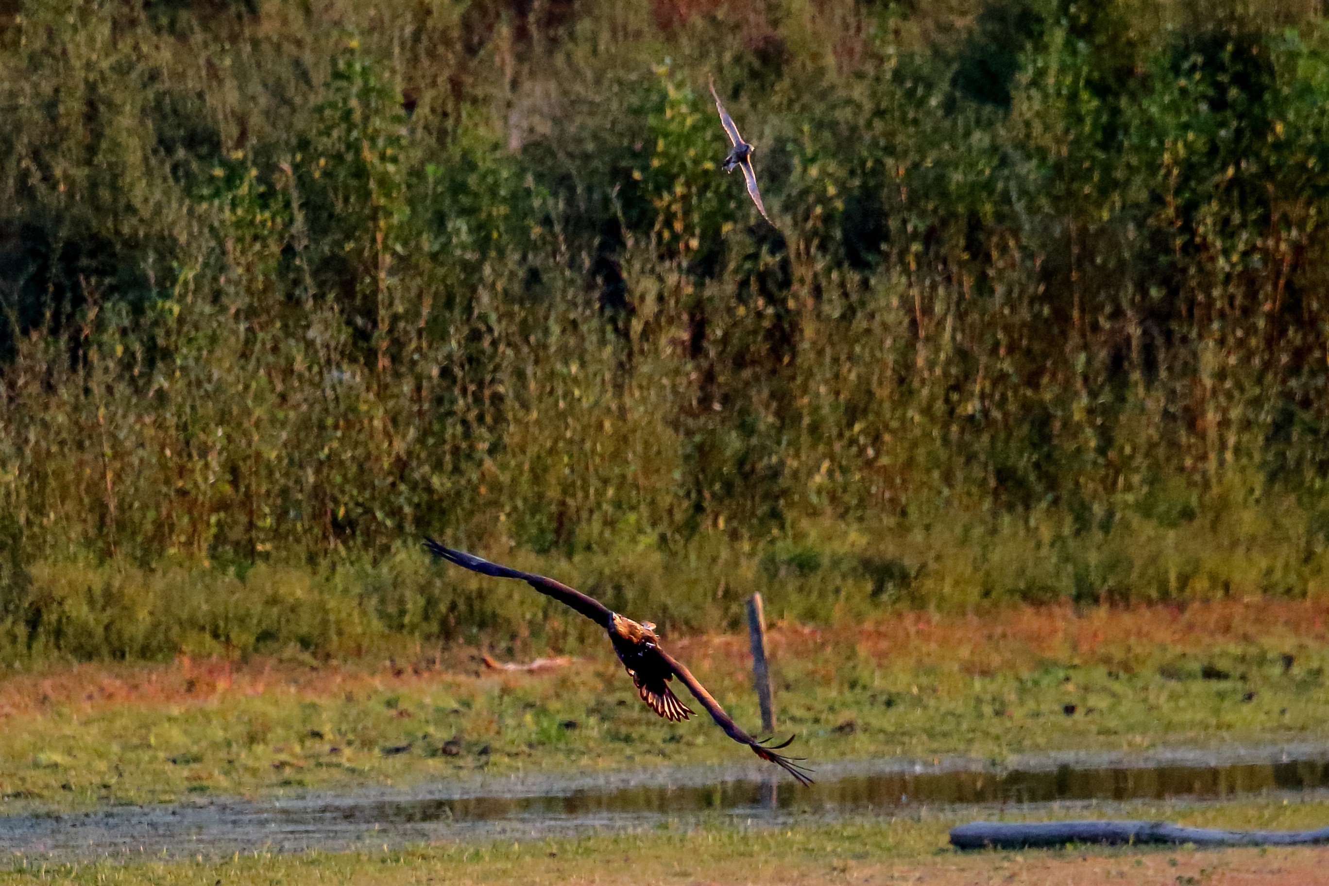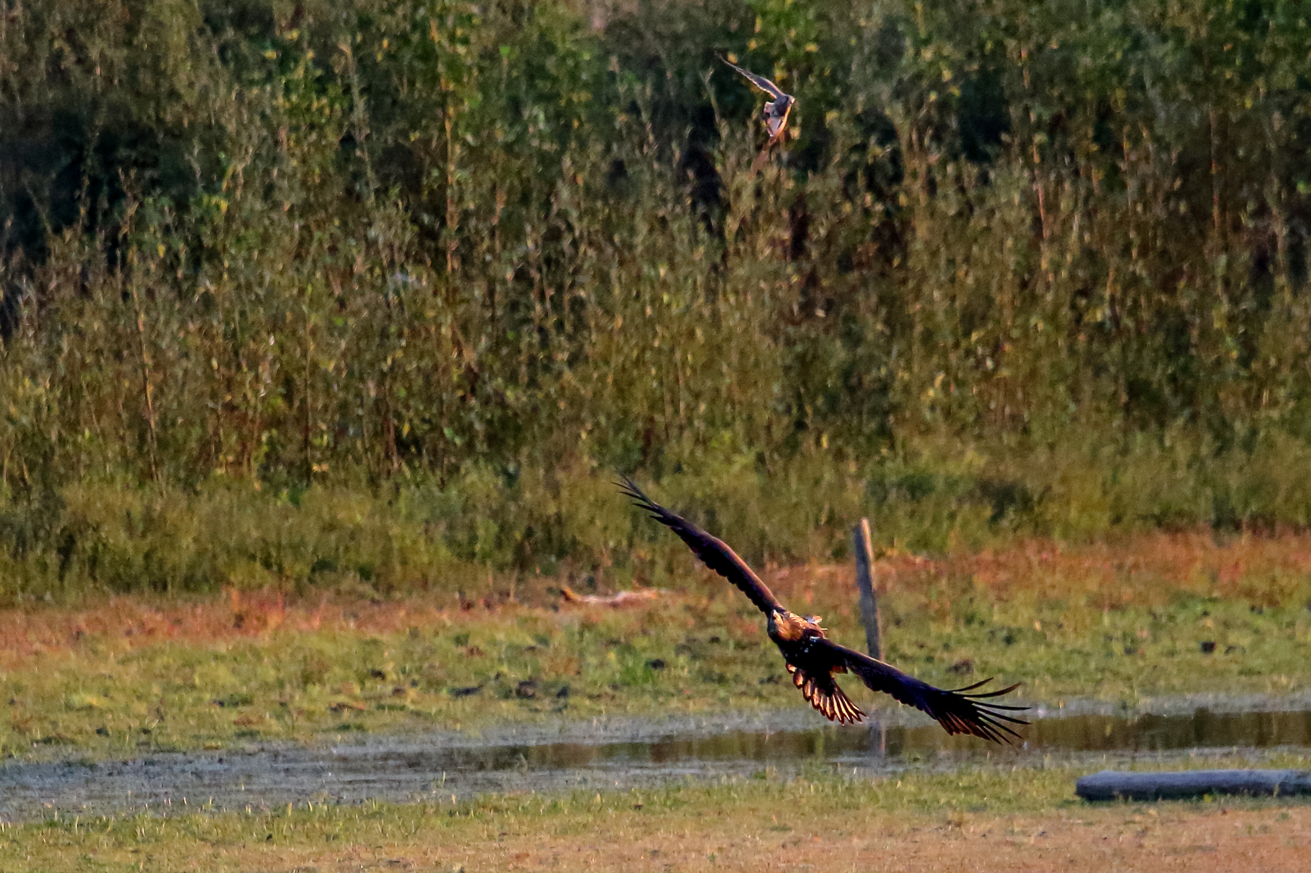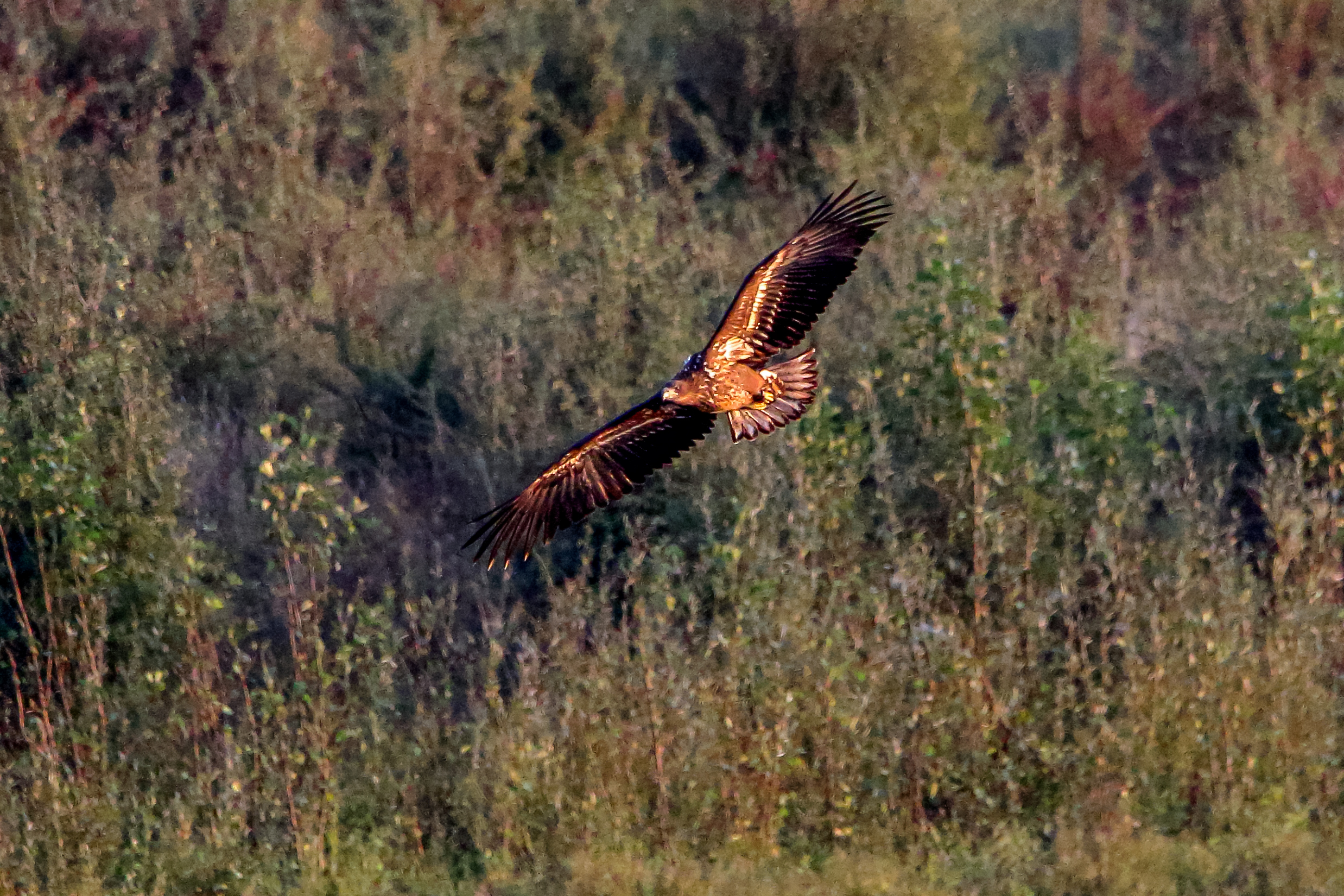Jungseeadler und streßender Wanderfalke im Restlicht der Abendsonne