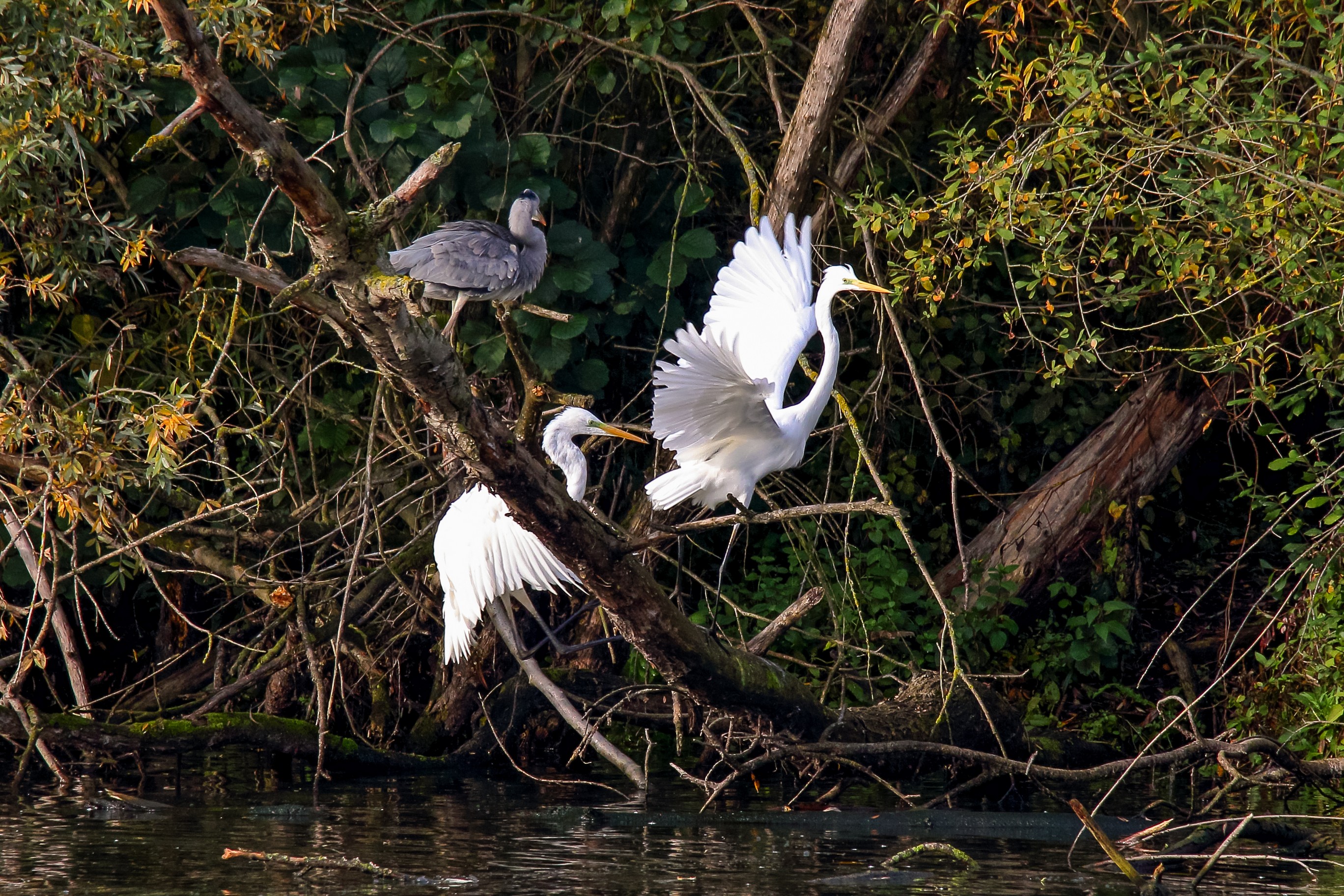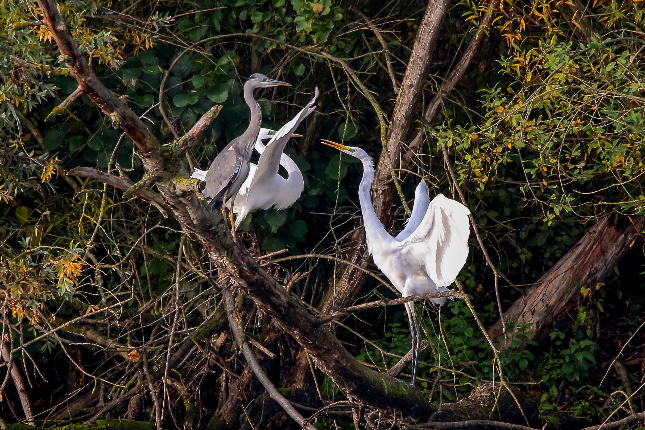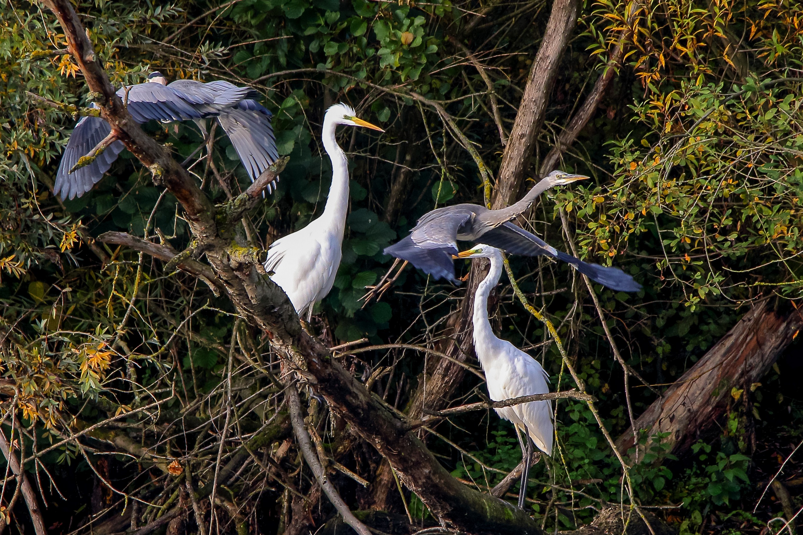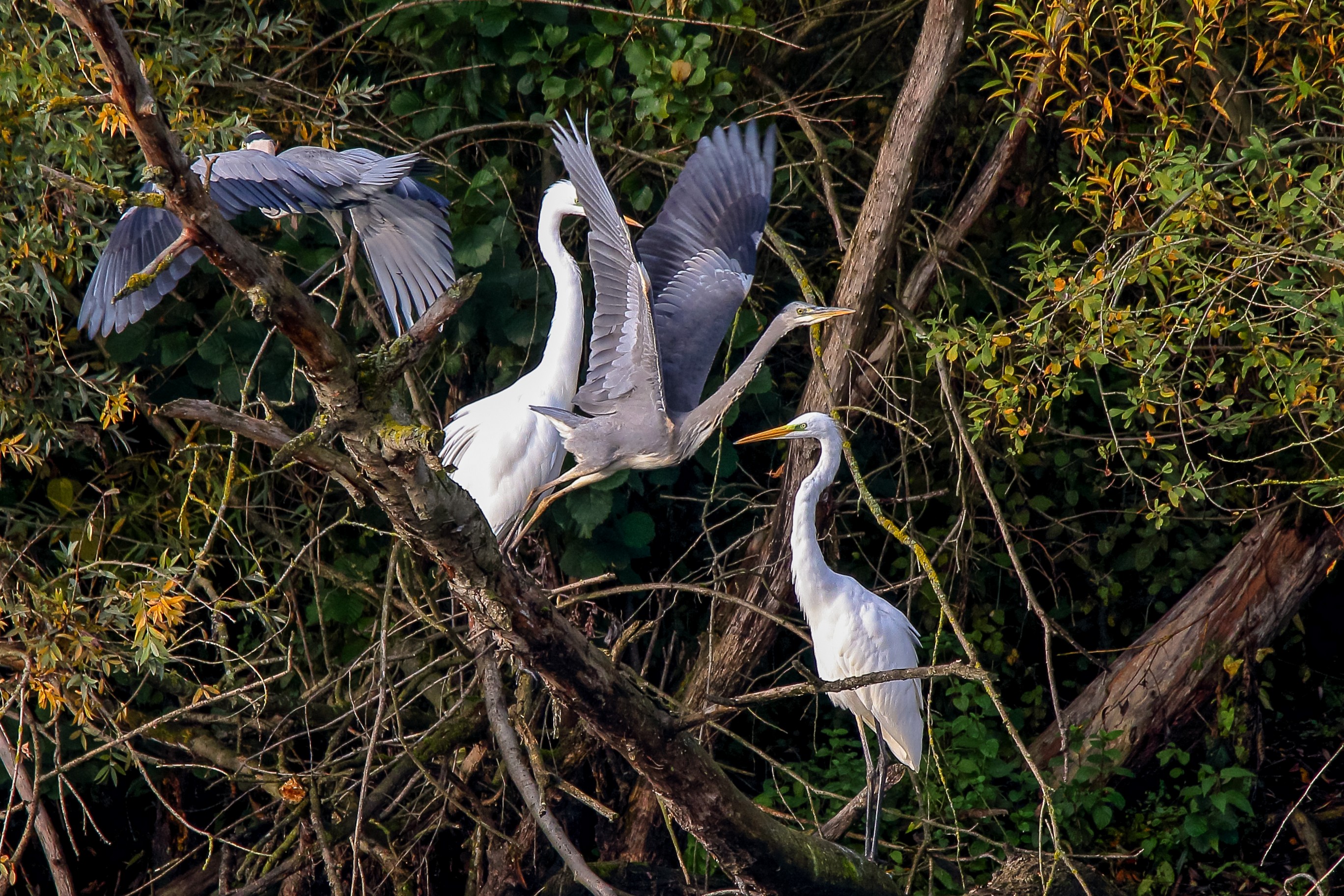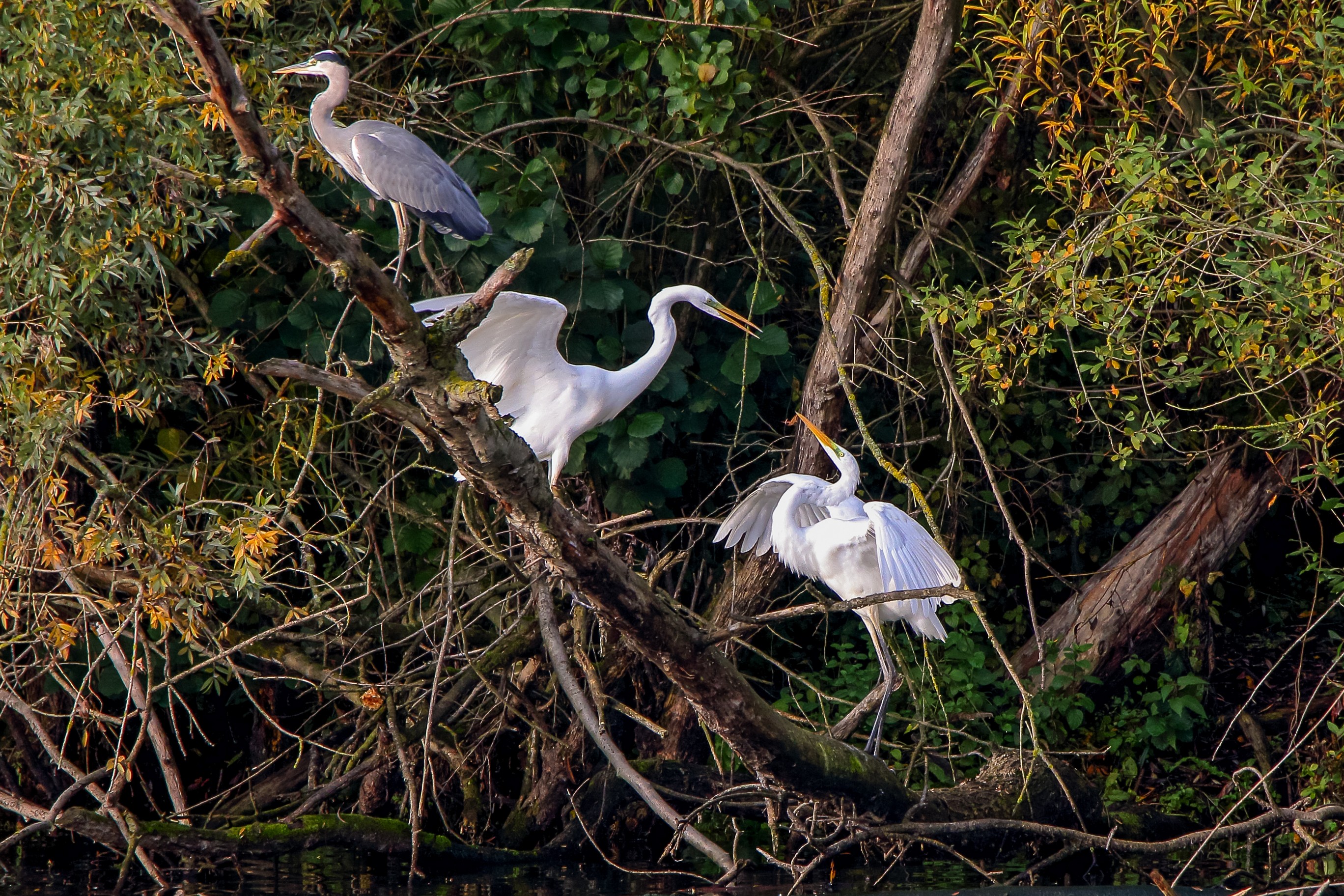 Silberreiher streiten sich um den besten Platz beim Kormoranfischen