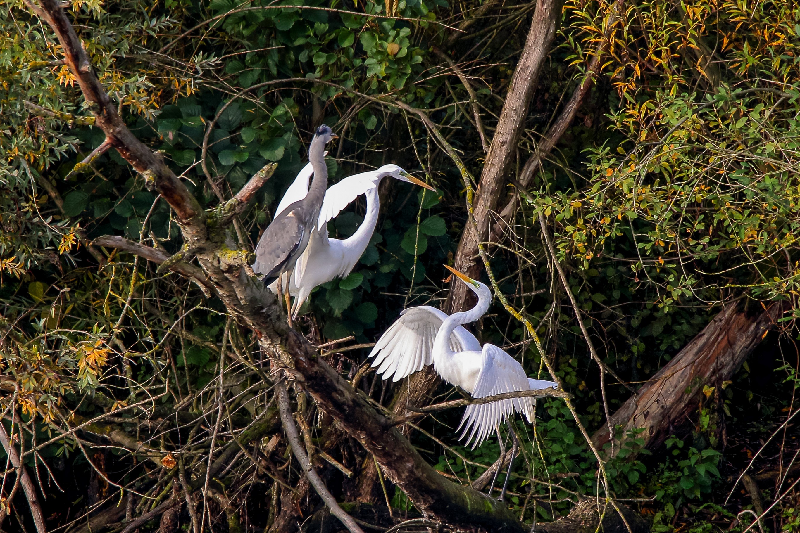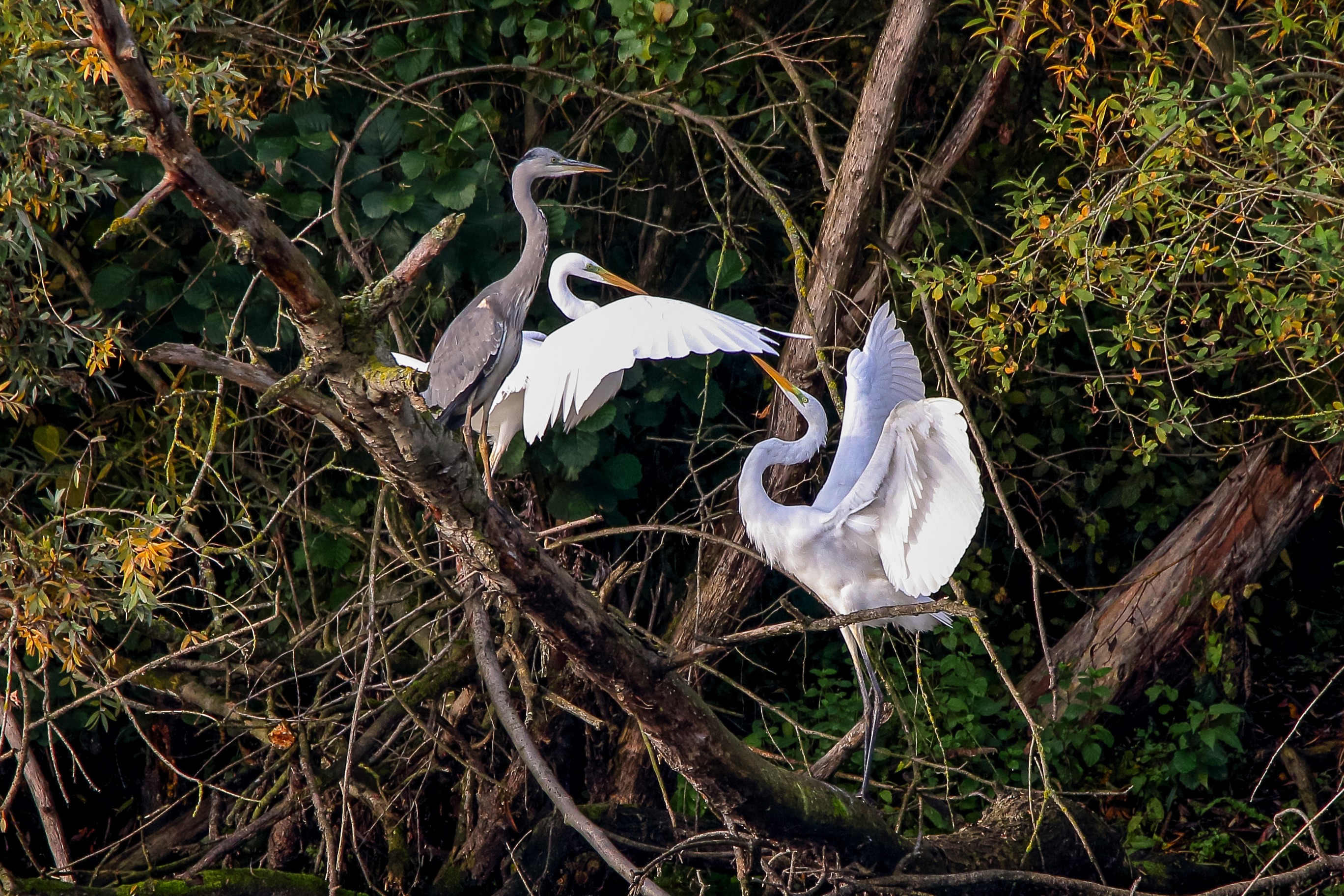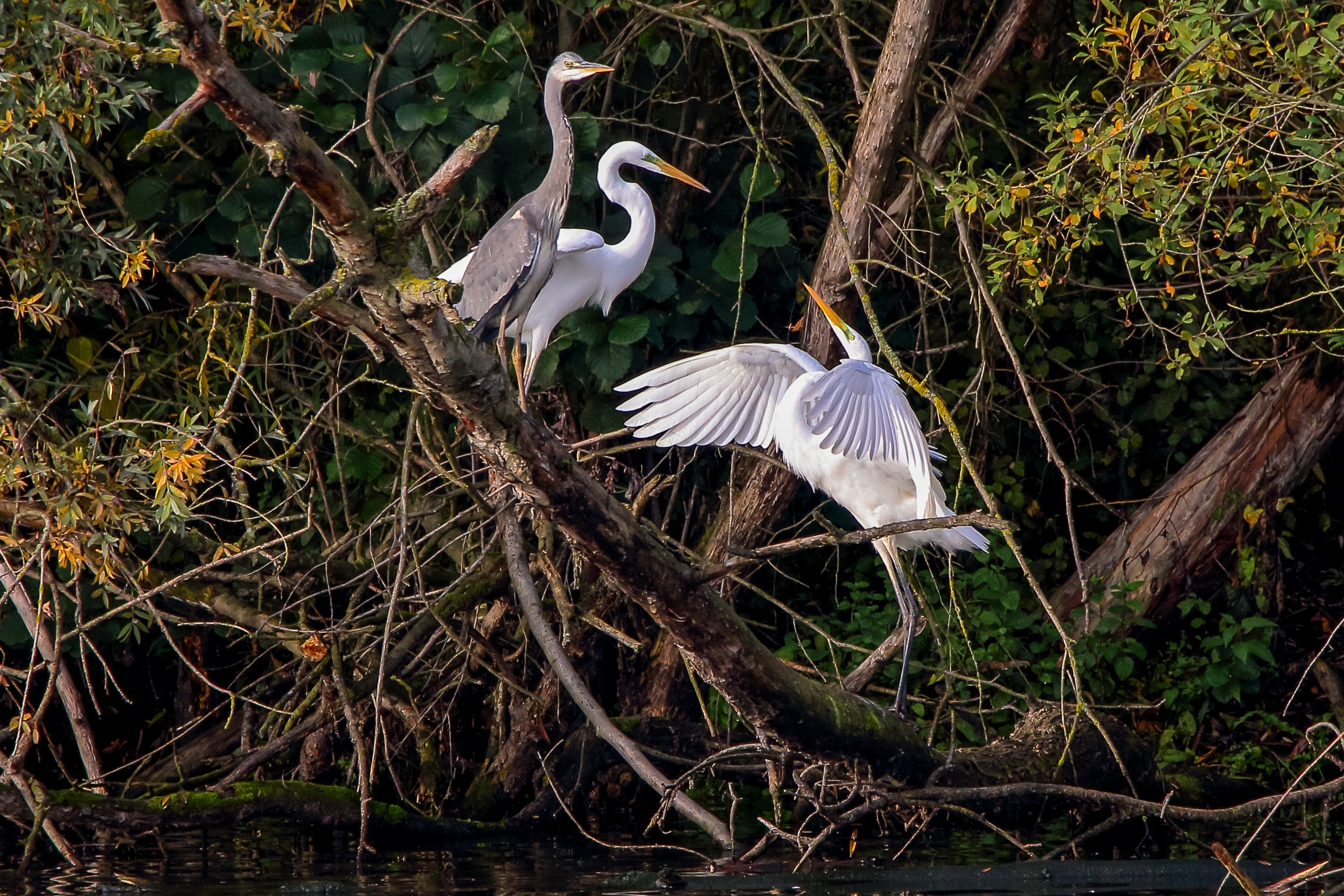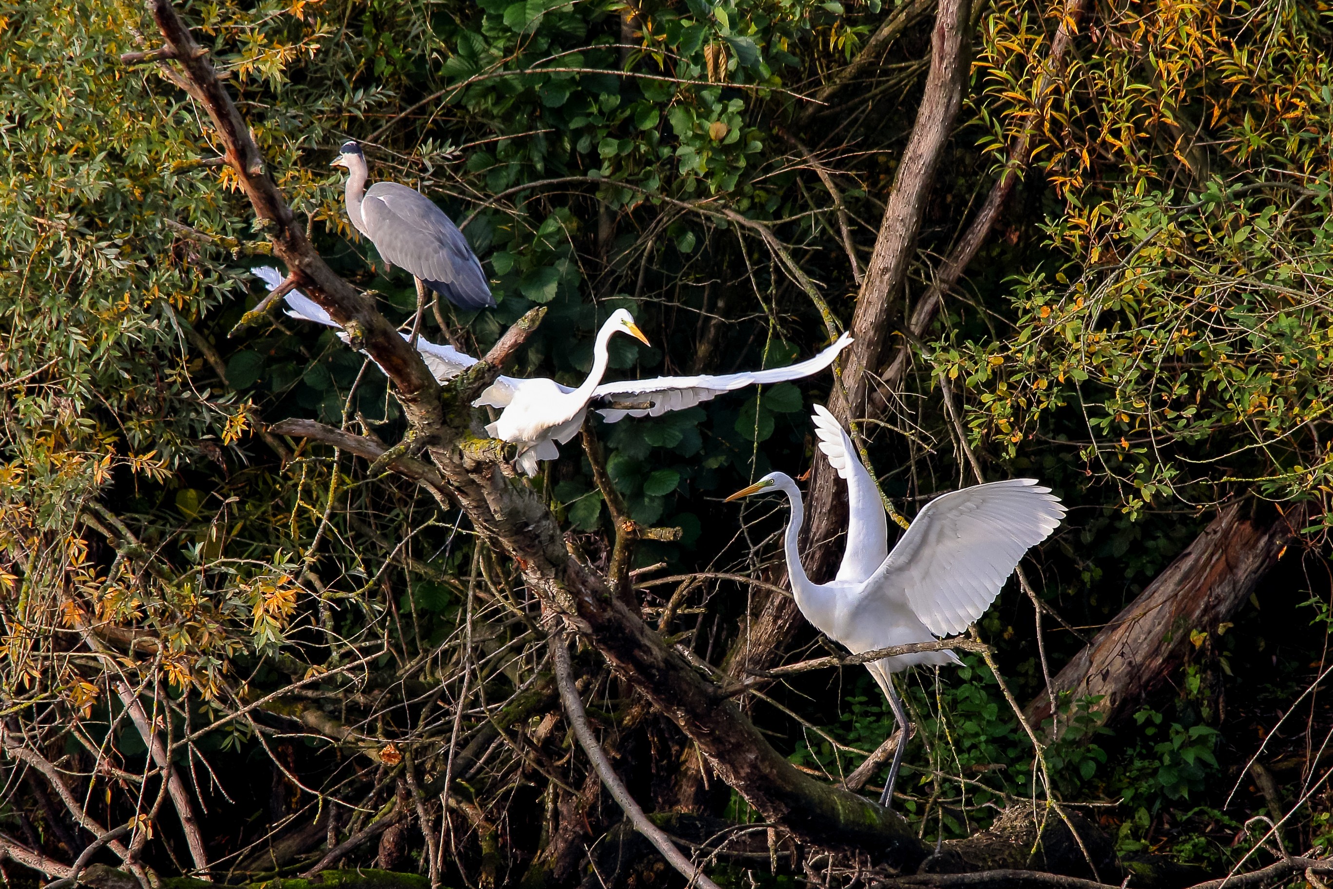 Silberreiher streiten sich um den besten Platz beim Kormoranfischen